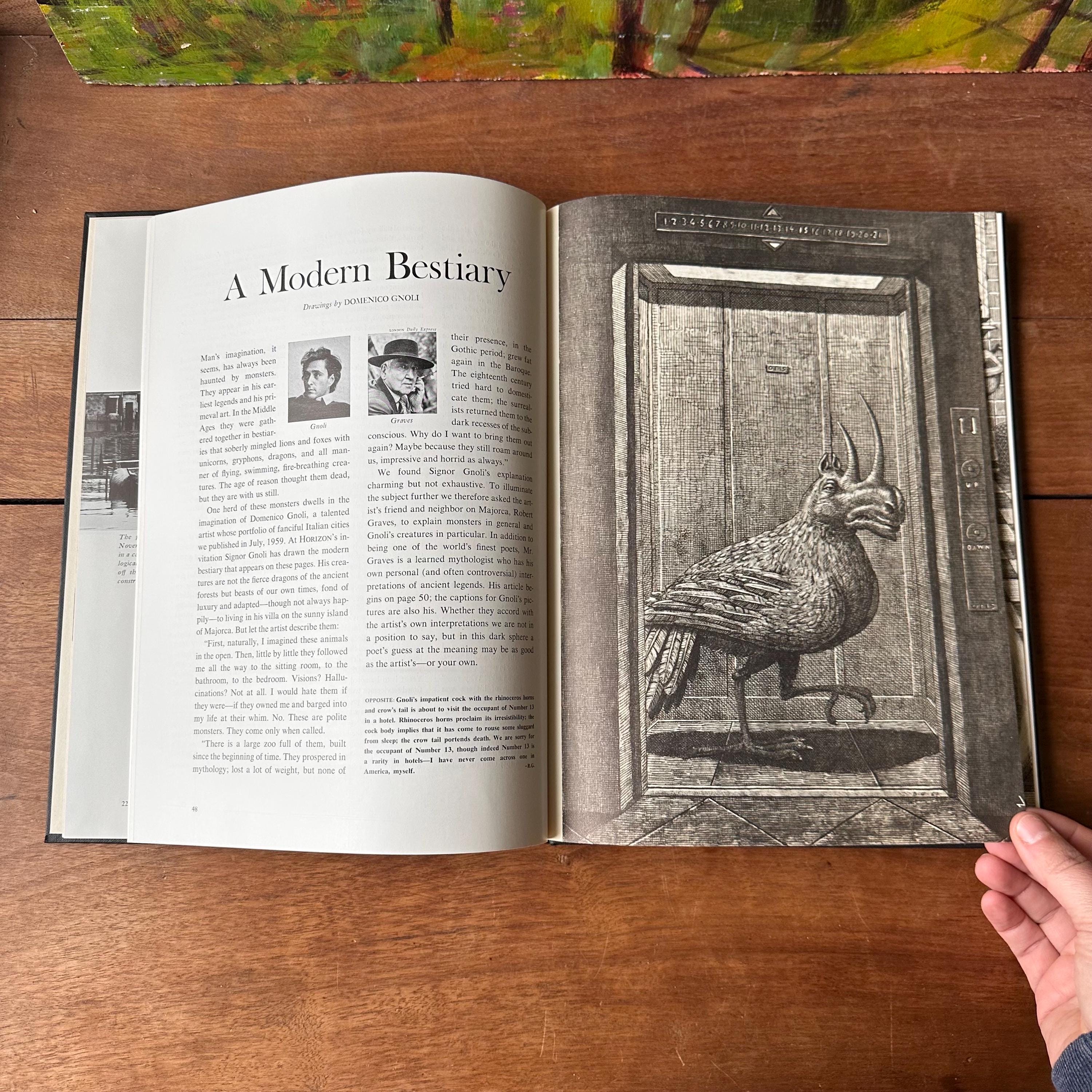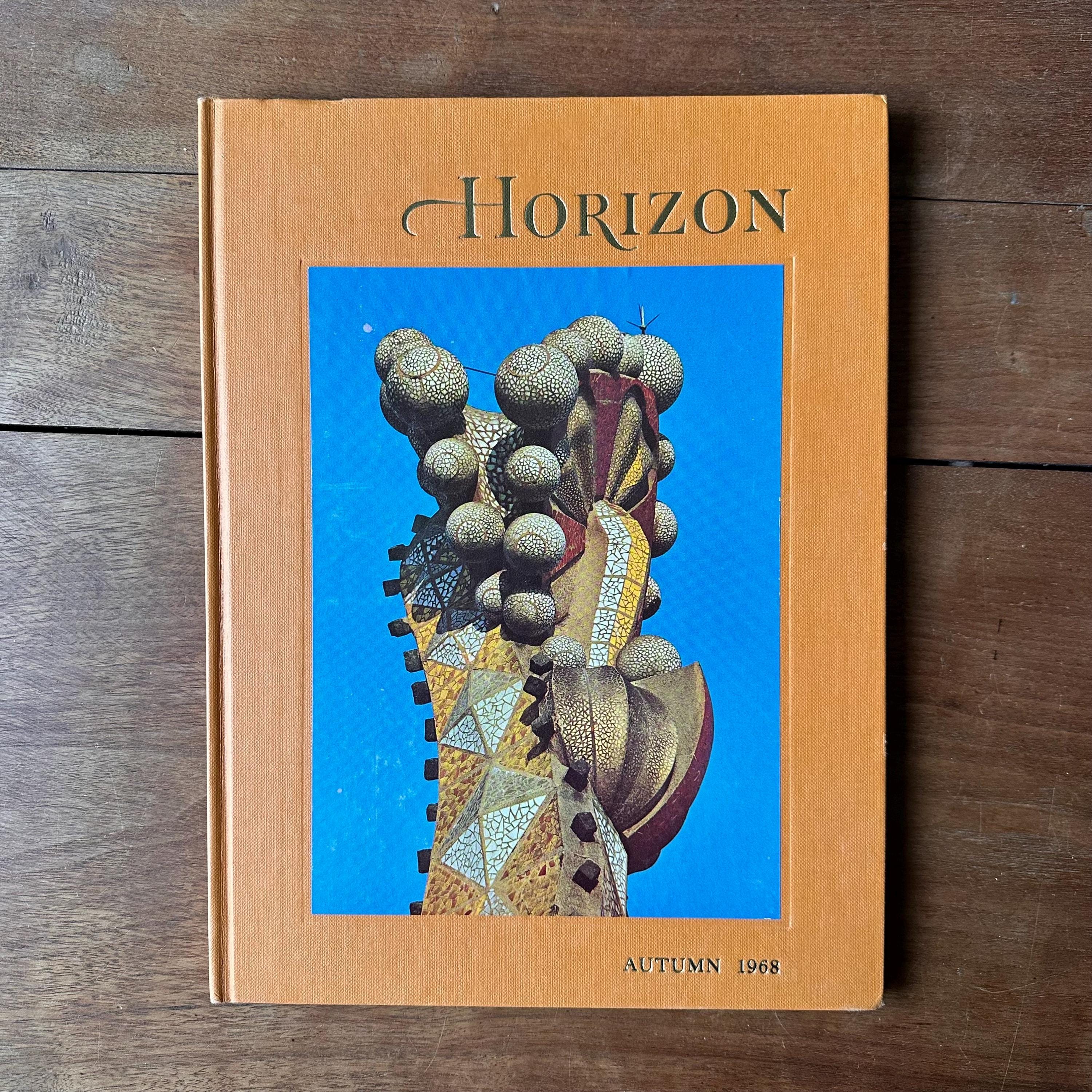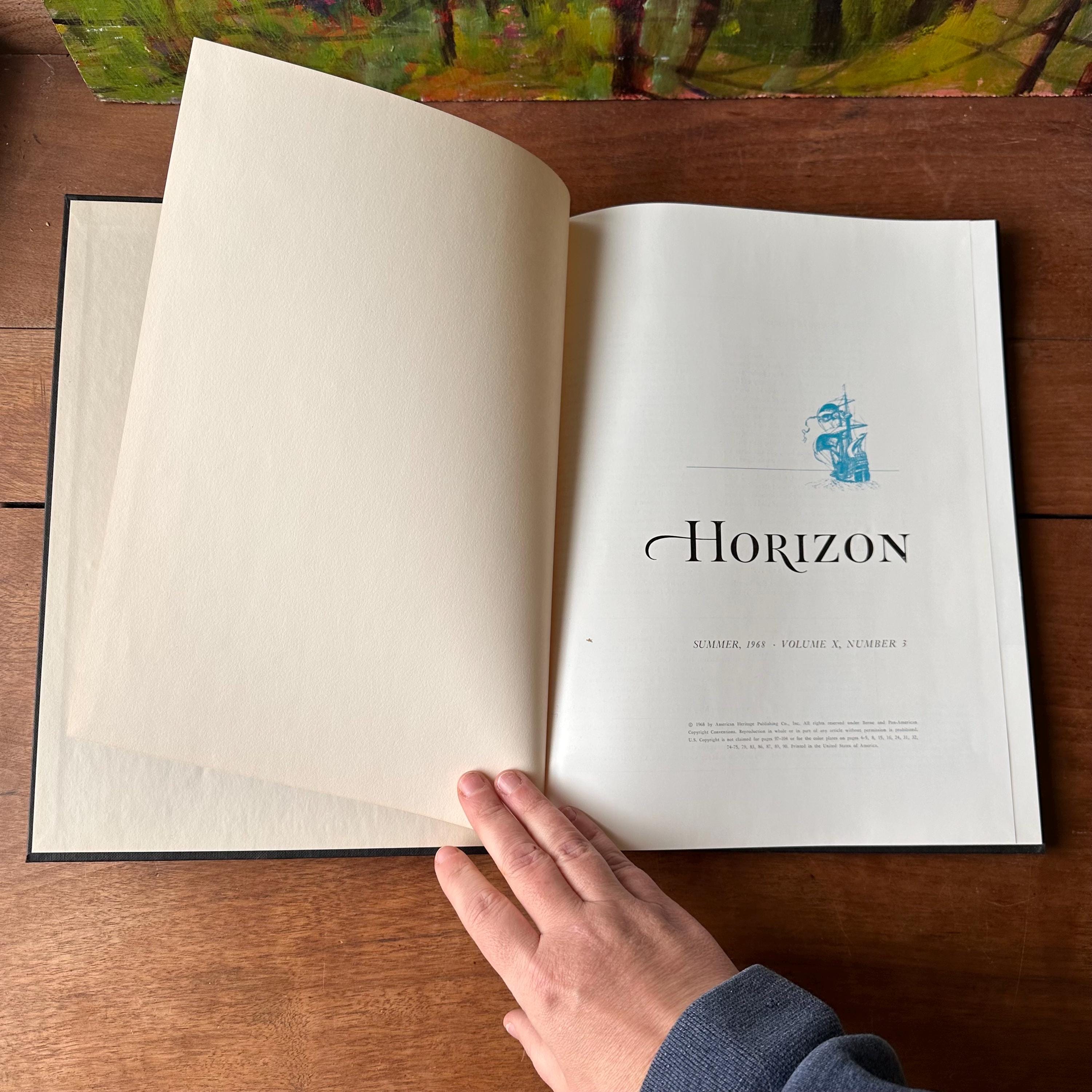 This is a set of 3 Horizon magazines from 1968-1969. There are three issues in the set: Summer 1968, Autumn 1968, and Spring 1969. All three have hardback covers in different colors: black, brown, and orange. All three have gold lettering on the cover and spine. All three have both color and black and white illustrations and photographs. Horizon was a magazine of the arts published by the American Heritage Publishing Co.