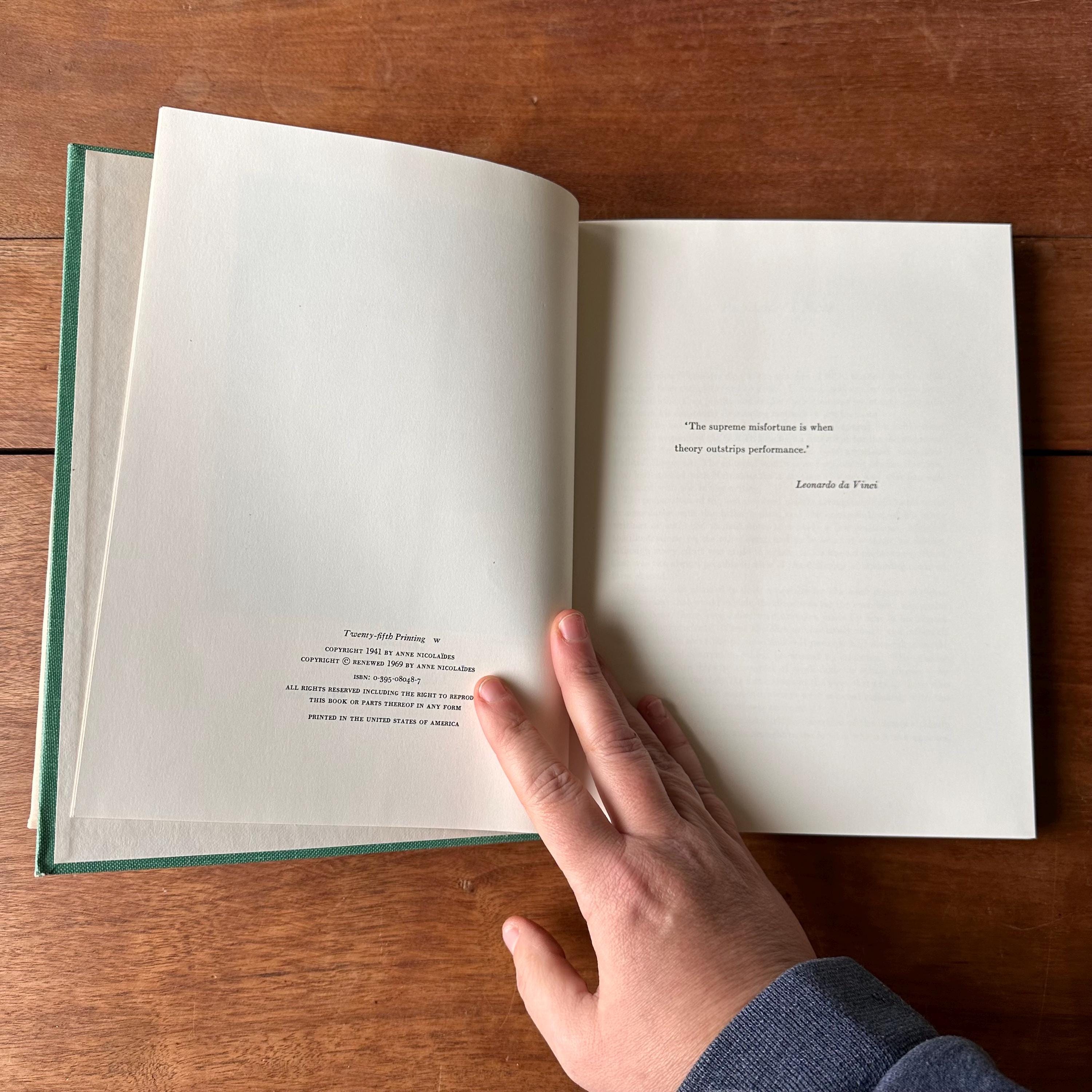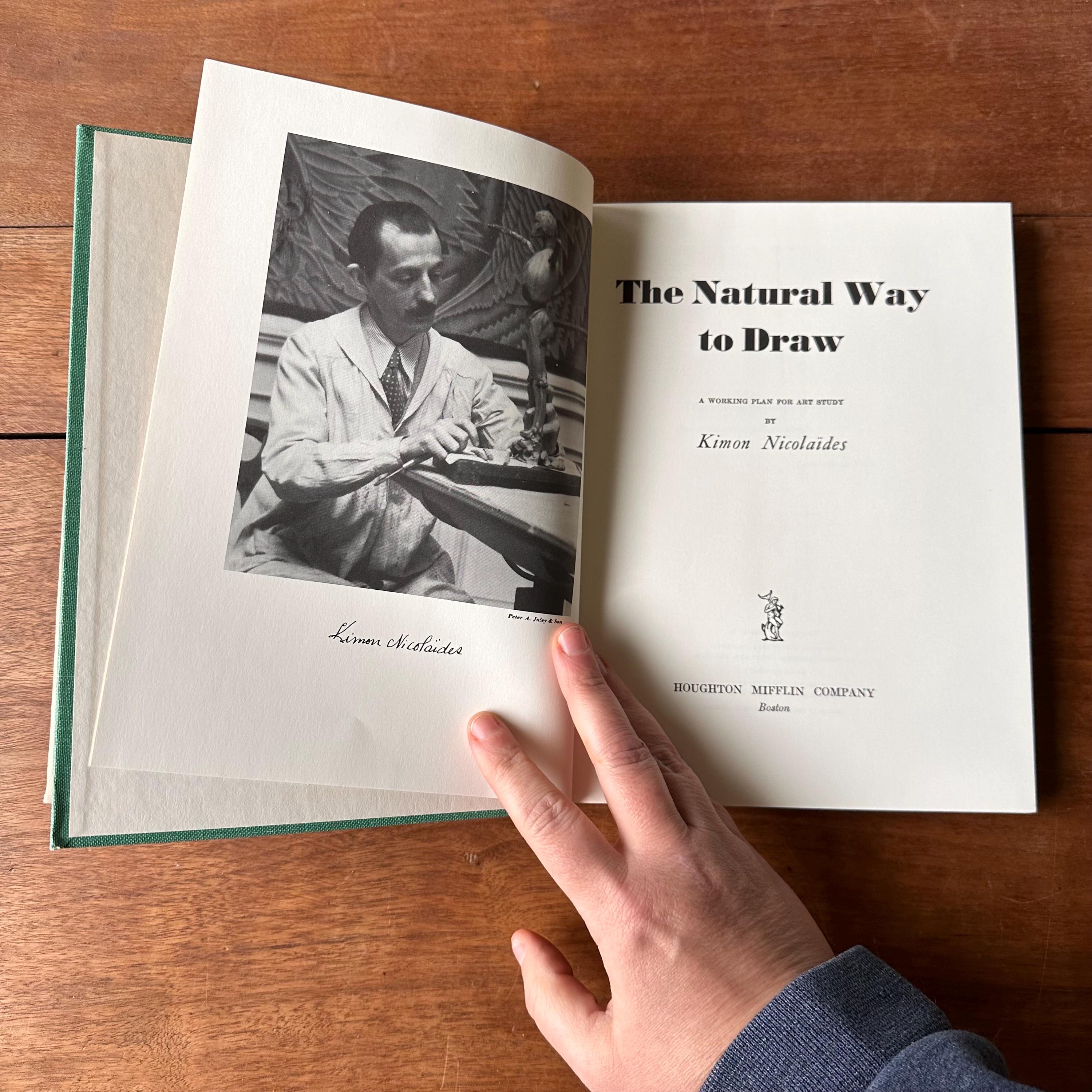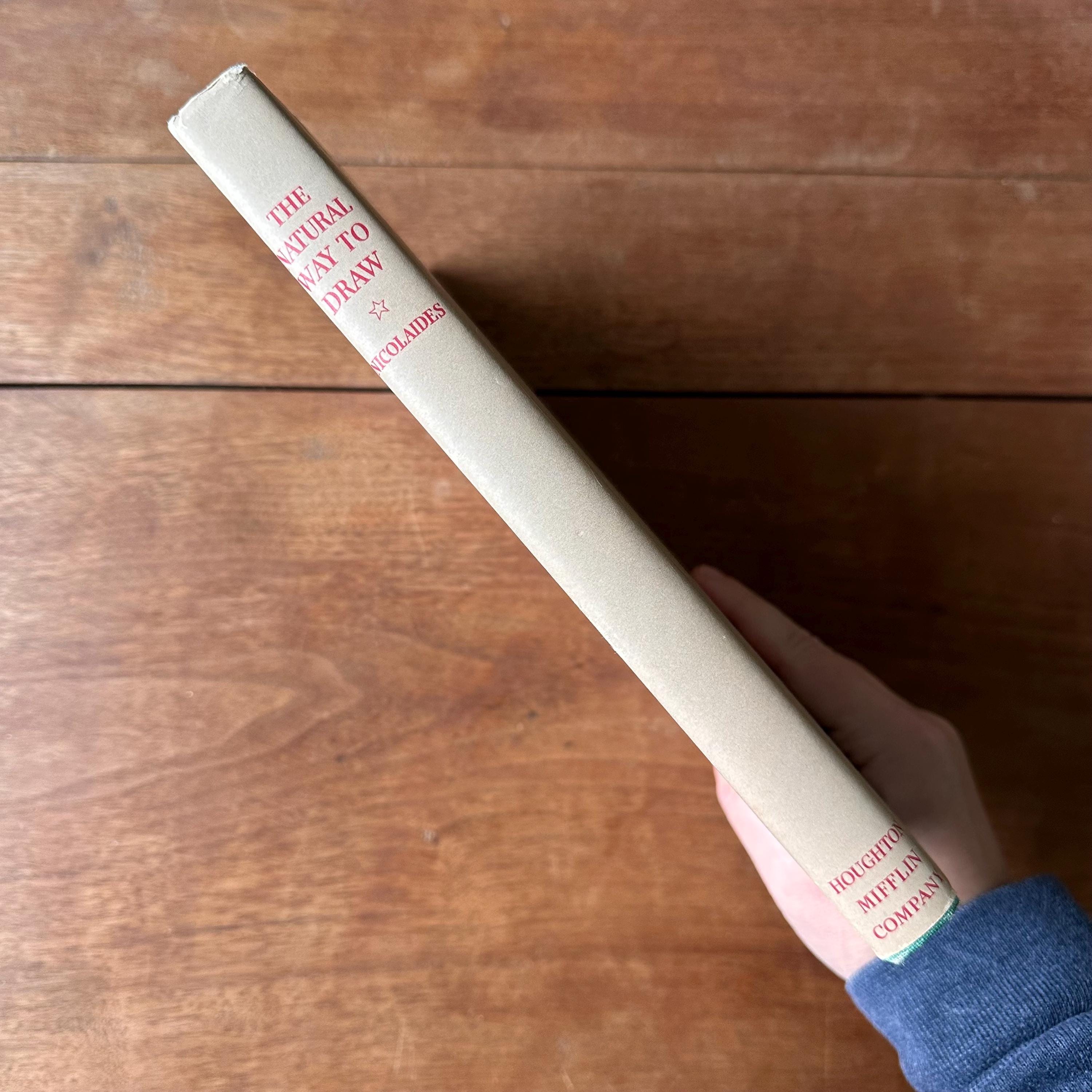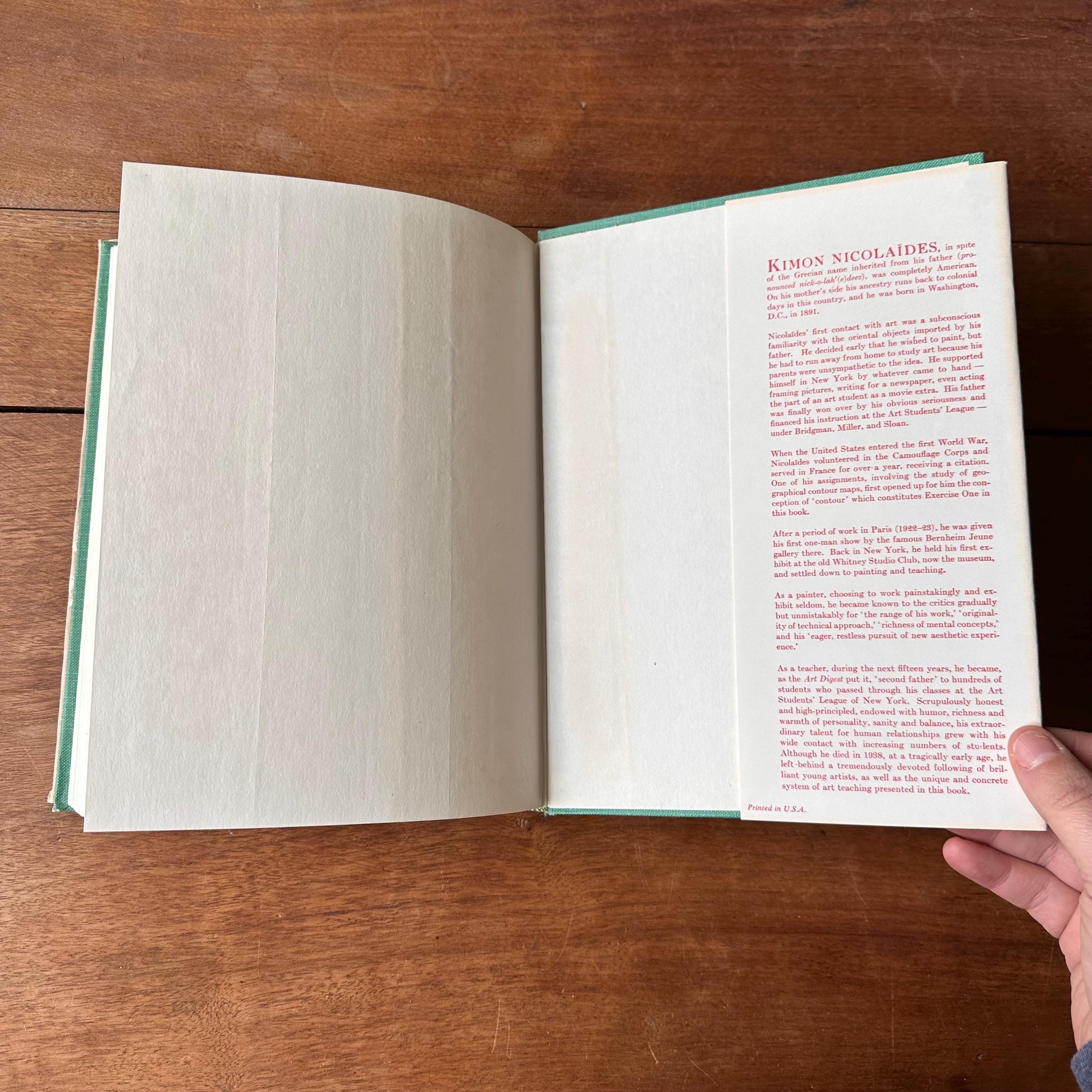 This is the 1969 twenty-fifth printing edition of The Natural Way to Draw: A Working Plan for Art Study by Kimon Nicolaides, published by Houghton Mifflin Company. It has the original beige dust jacket with white line figure drawings and lettering in red. Underneath the dust jacket, the covers are aqua linen with brown lettering. The book has black and white illustrations, drawings, and photographs. There are 221 pages.