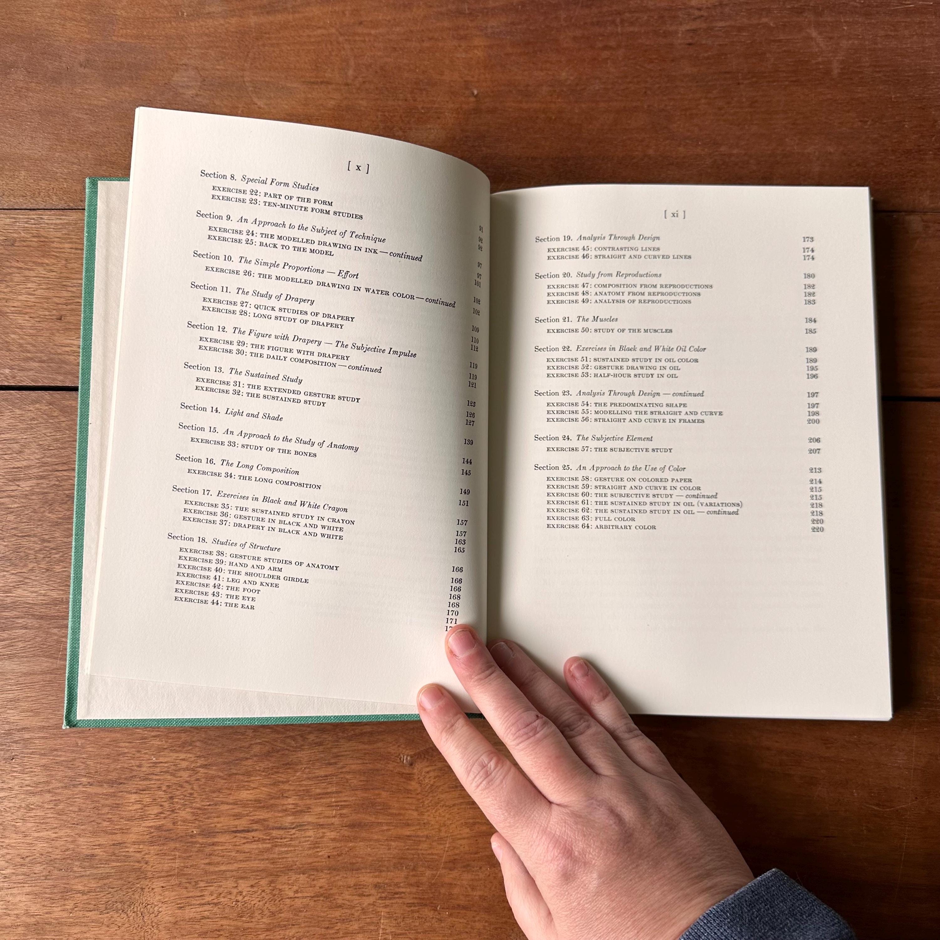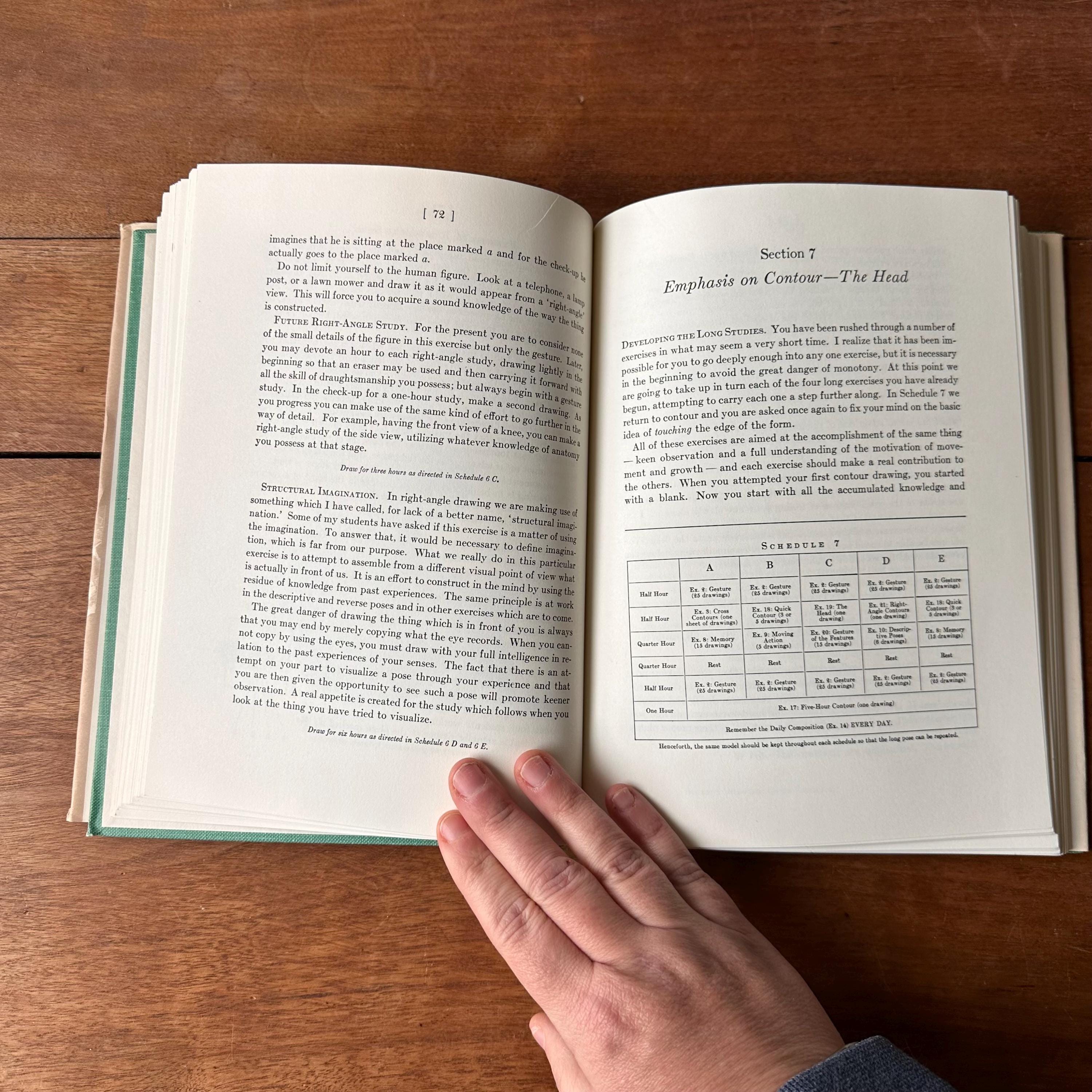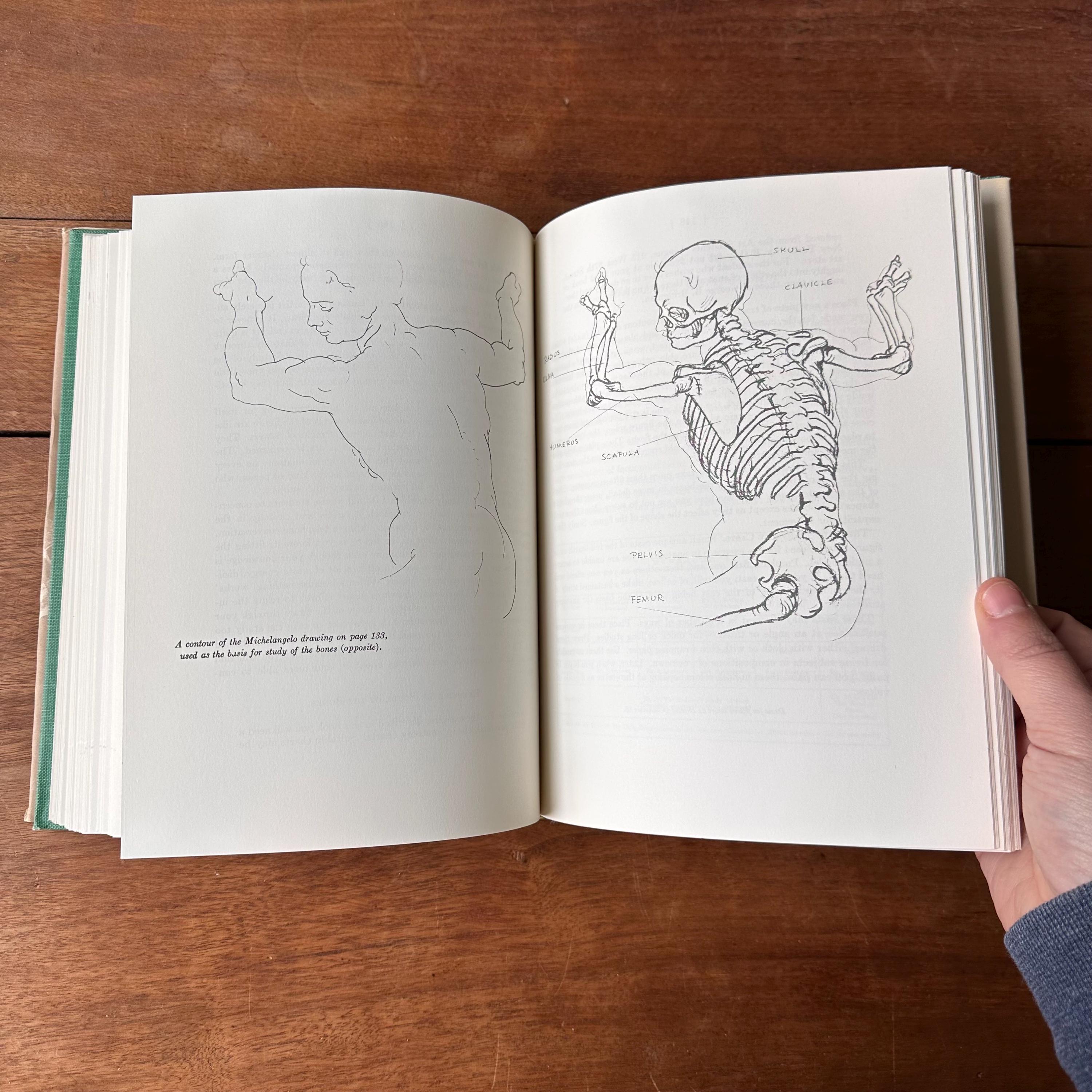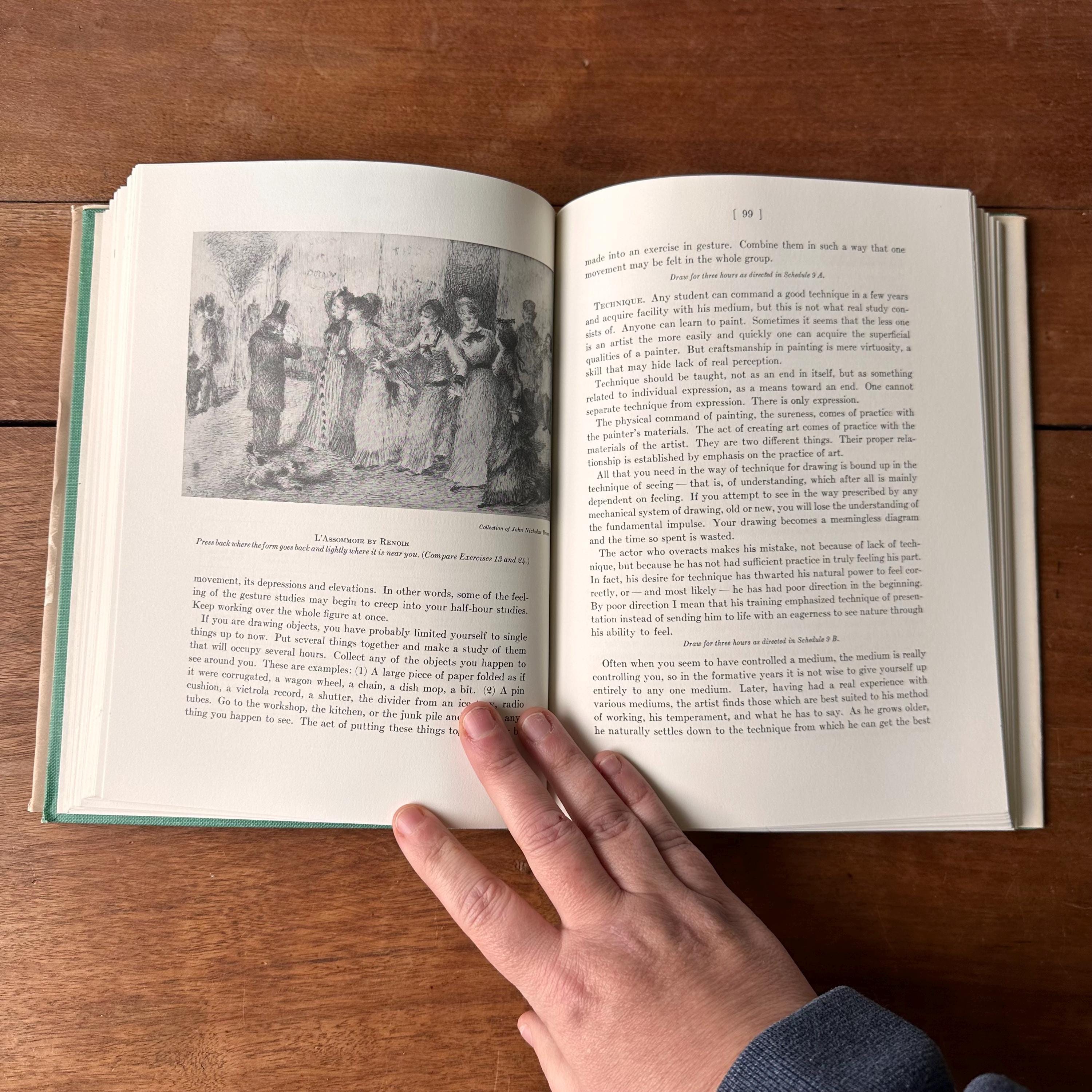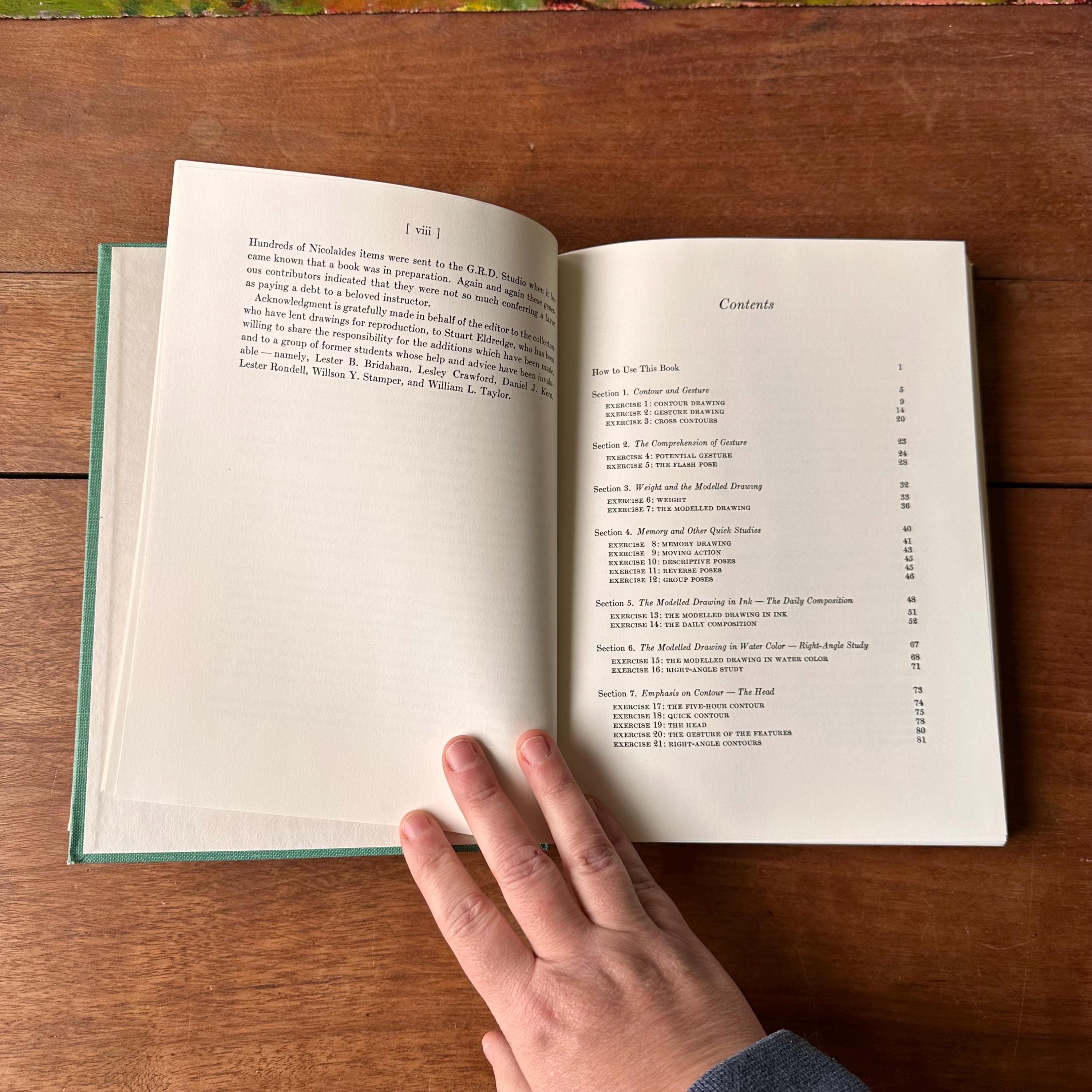 This is the 1969 twenty-fifth printing edition of The Natural Way to Draw: A Working Plan for Art Study by Kimon Nicolaides, published by Houghton Mifflin Company. It has the original beige dust jacket with white line figure drawings and lettering in red. Underneath the dust jacket, the covers are aqua linen with brown lettering. The book has black and white illustrations, drawings, and photographs. There are 221 pages.