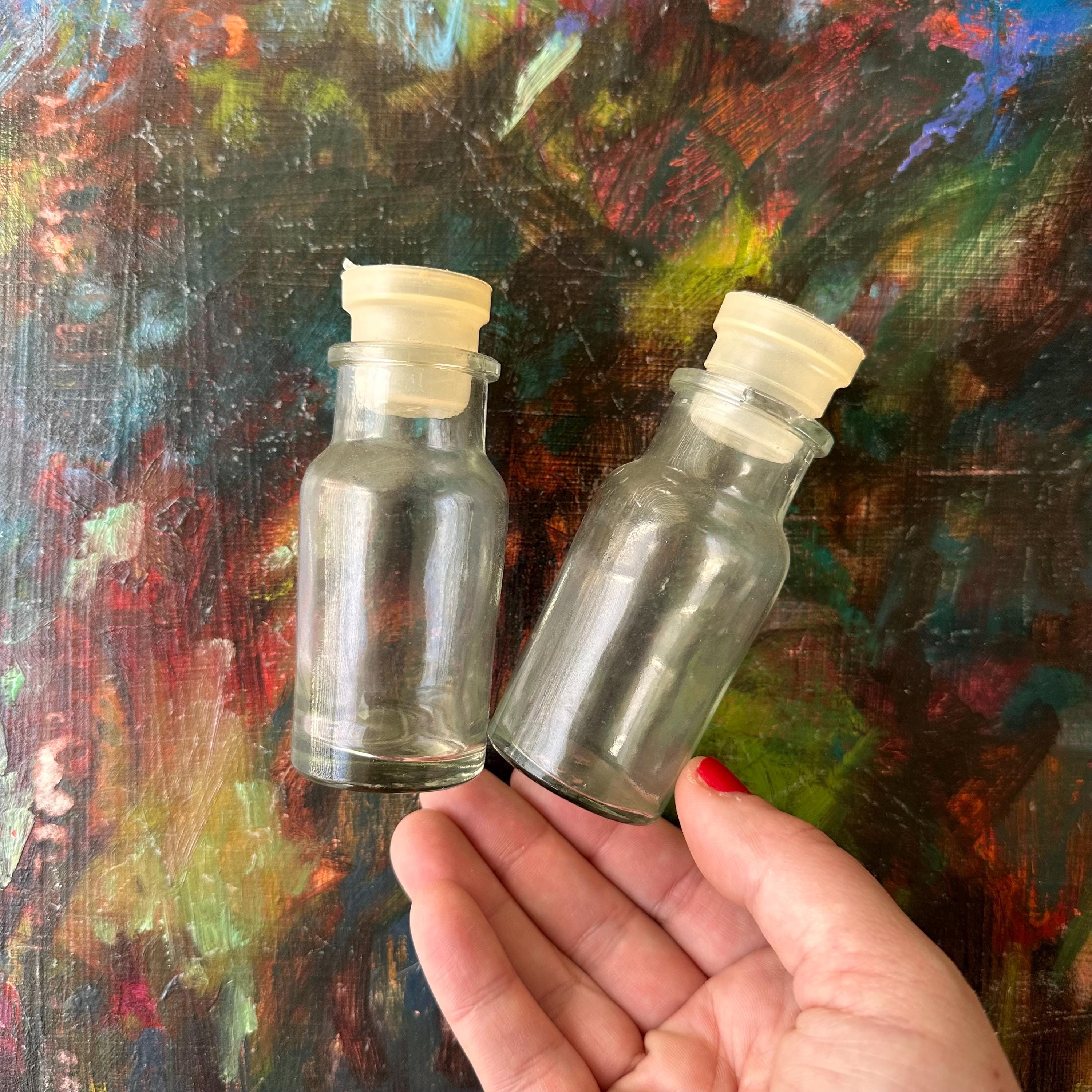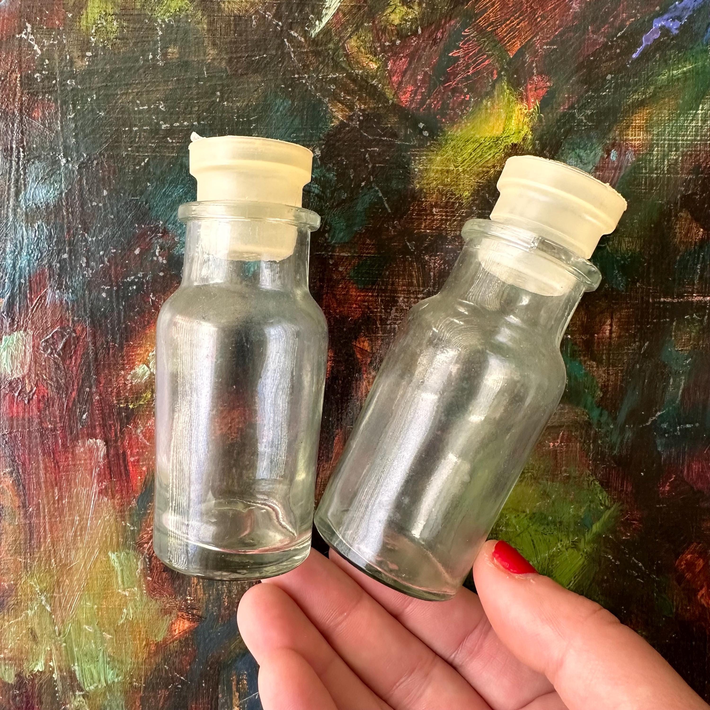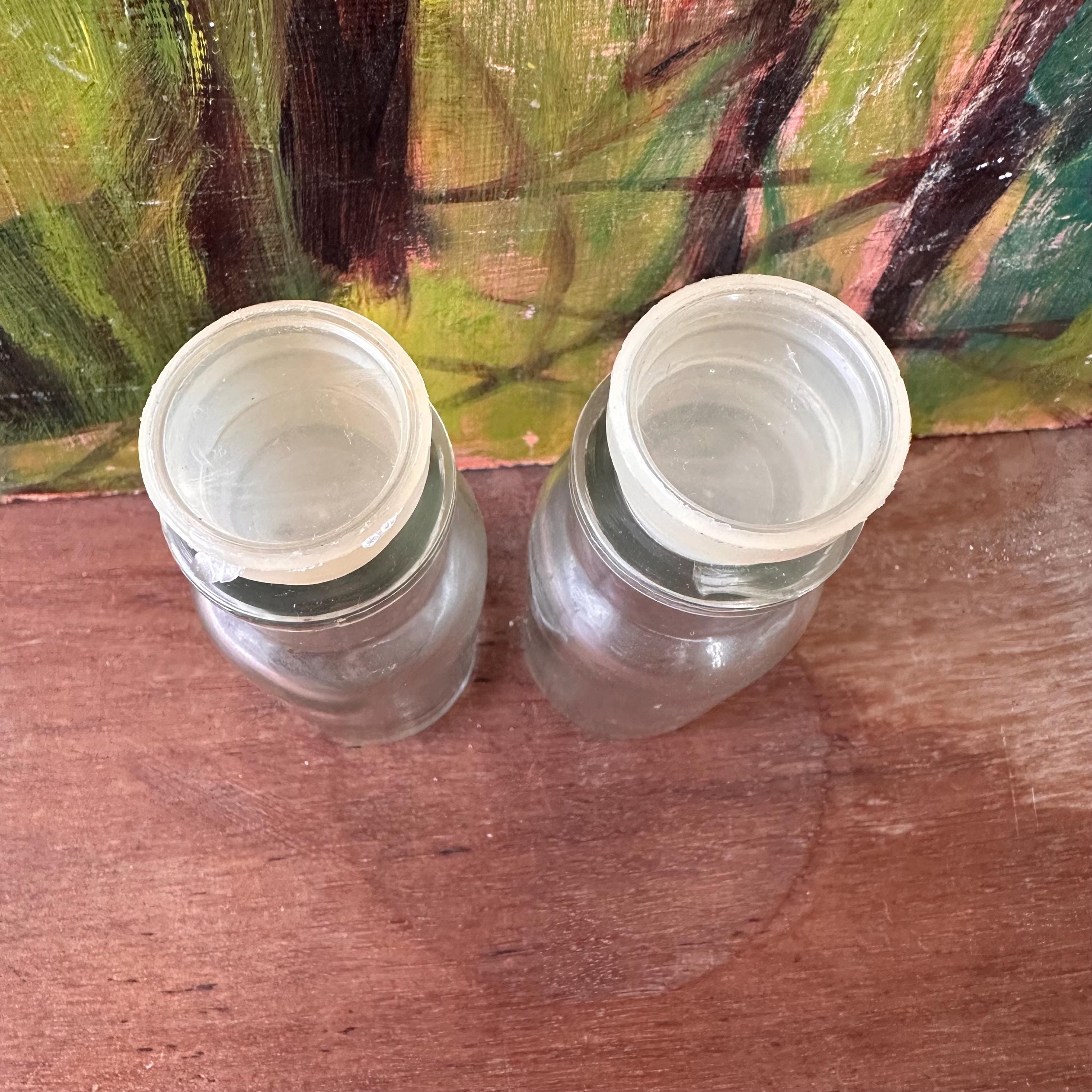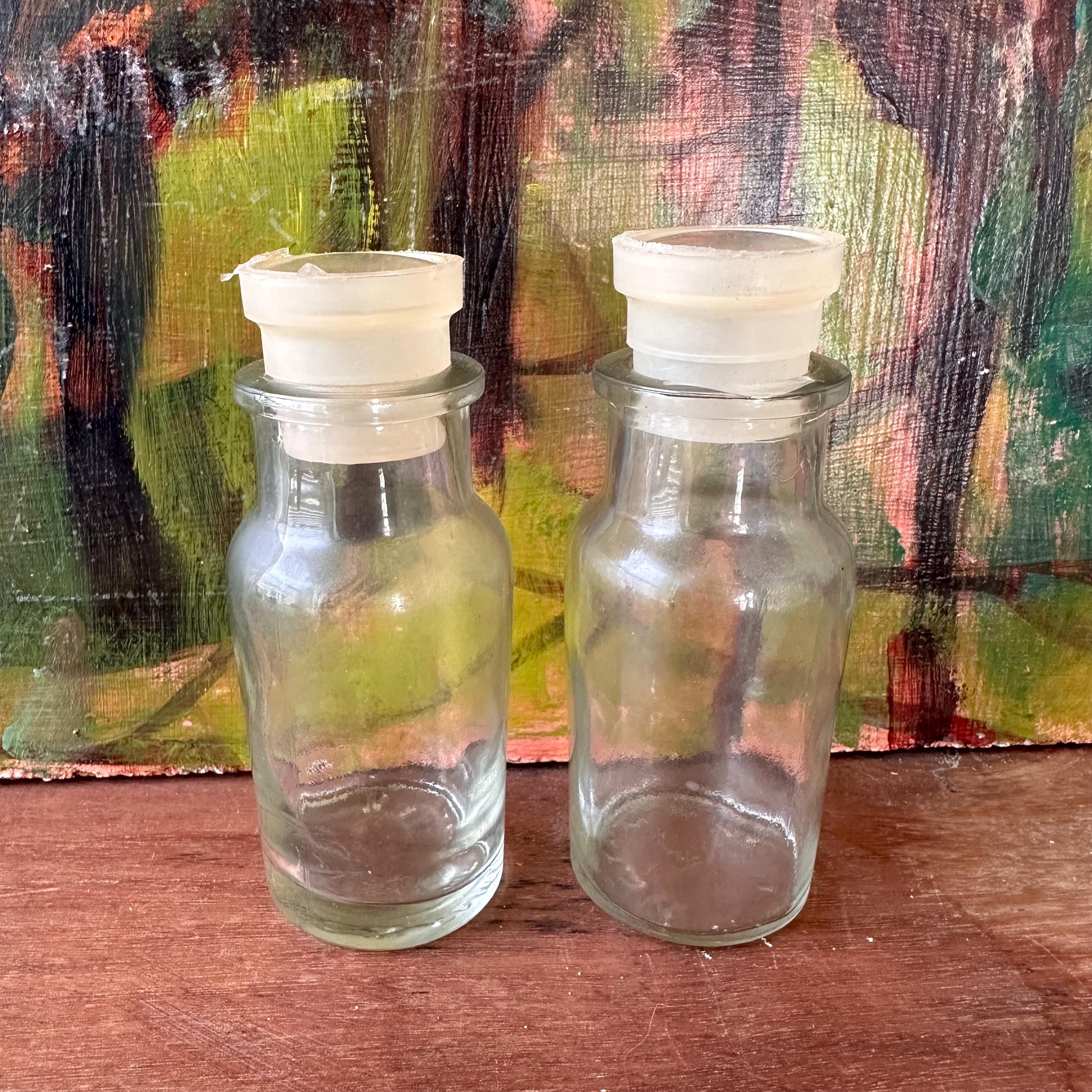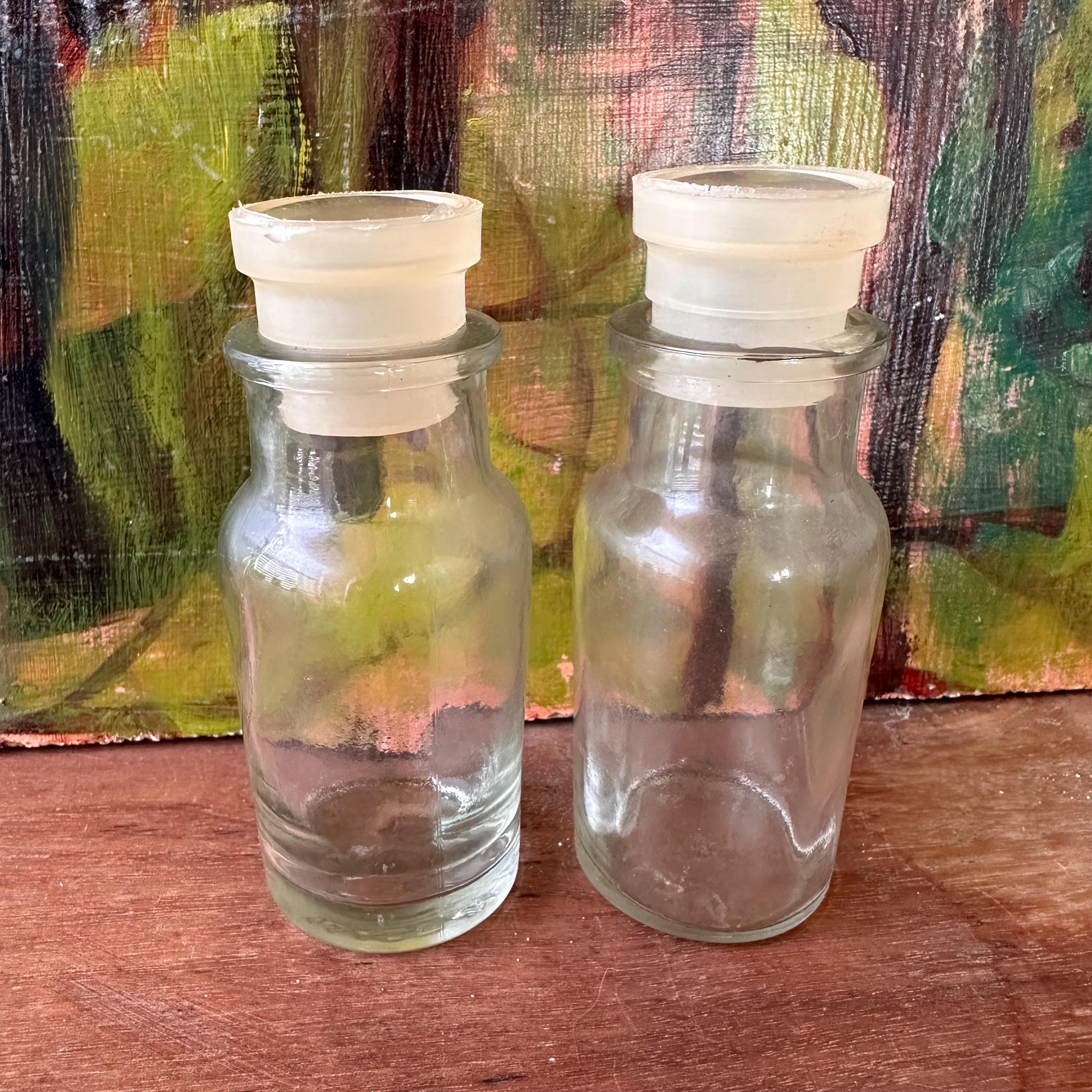 The jars are in good vintage condition for their age and use. The stoppers have yellowed. The glass is clear. One of the jars has a defect to the glass rim. It looks like it's chipped, but it is not.