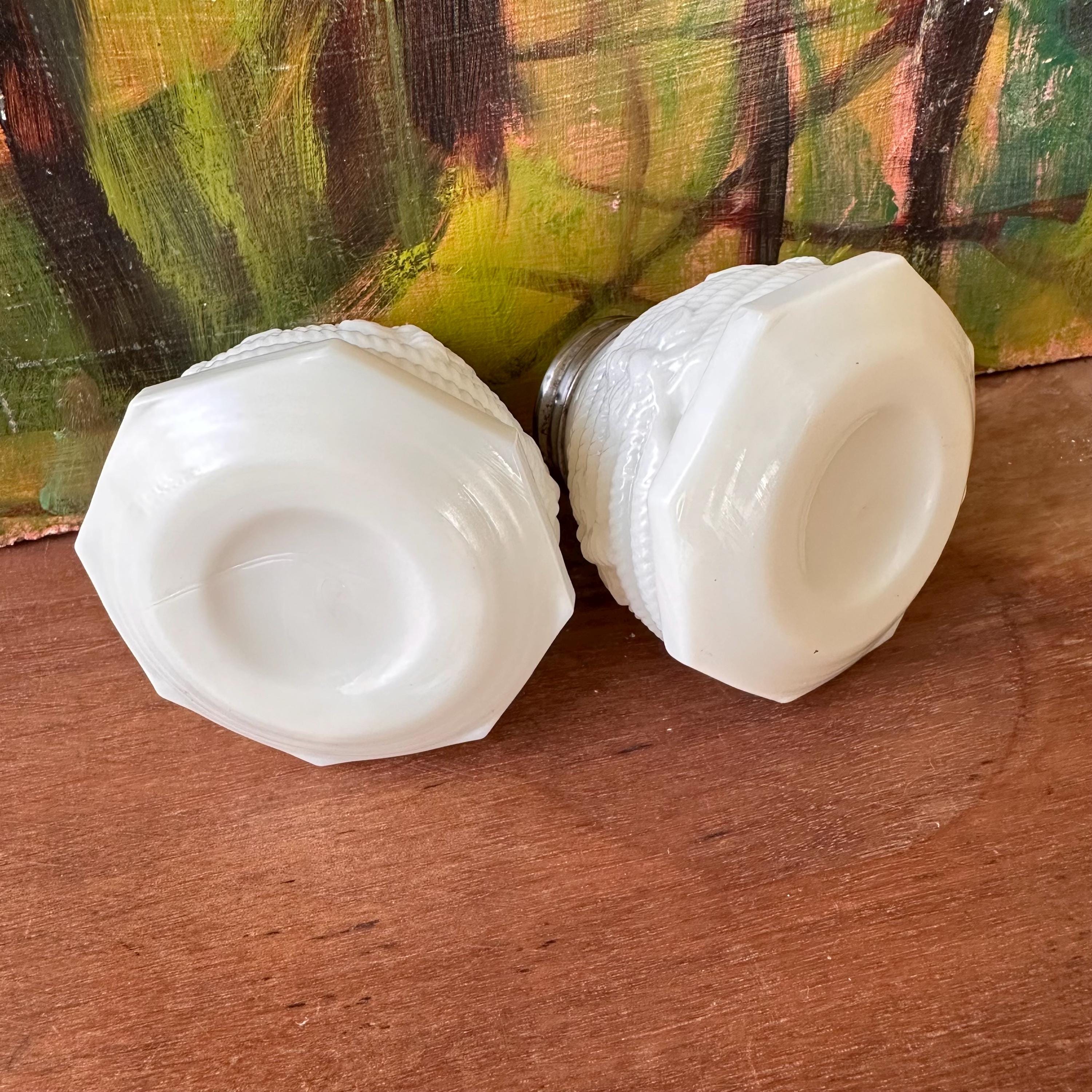 This is a set of two milk glass shakers in the shape of beehives. The shakers are an octagon shaped beehive with tiny embossed bees all around the sides of the shakers. They have silver metal screw on lids. The bottoms are unmarked.