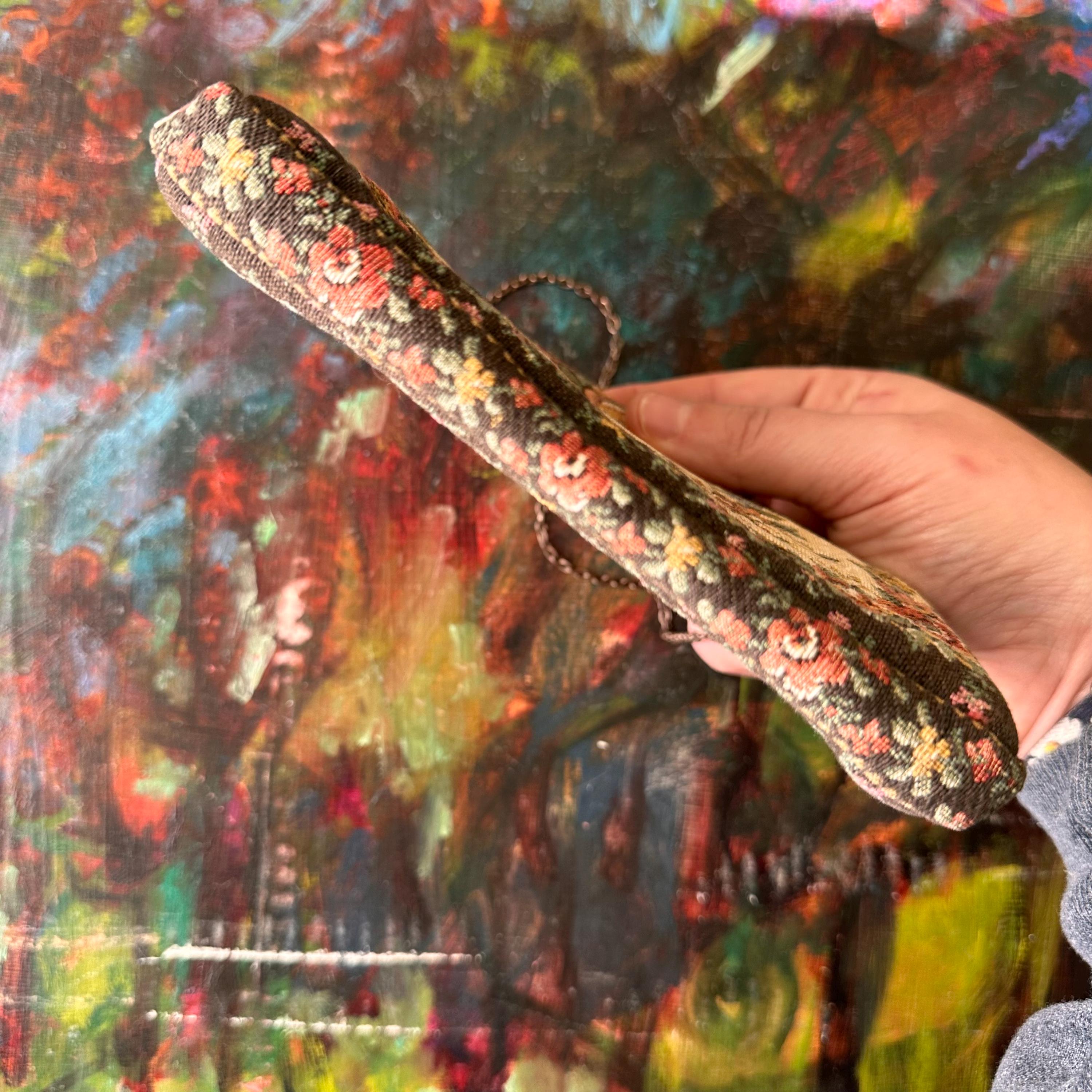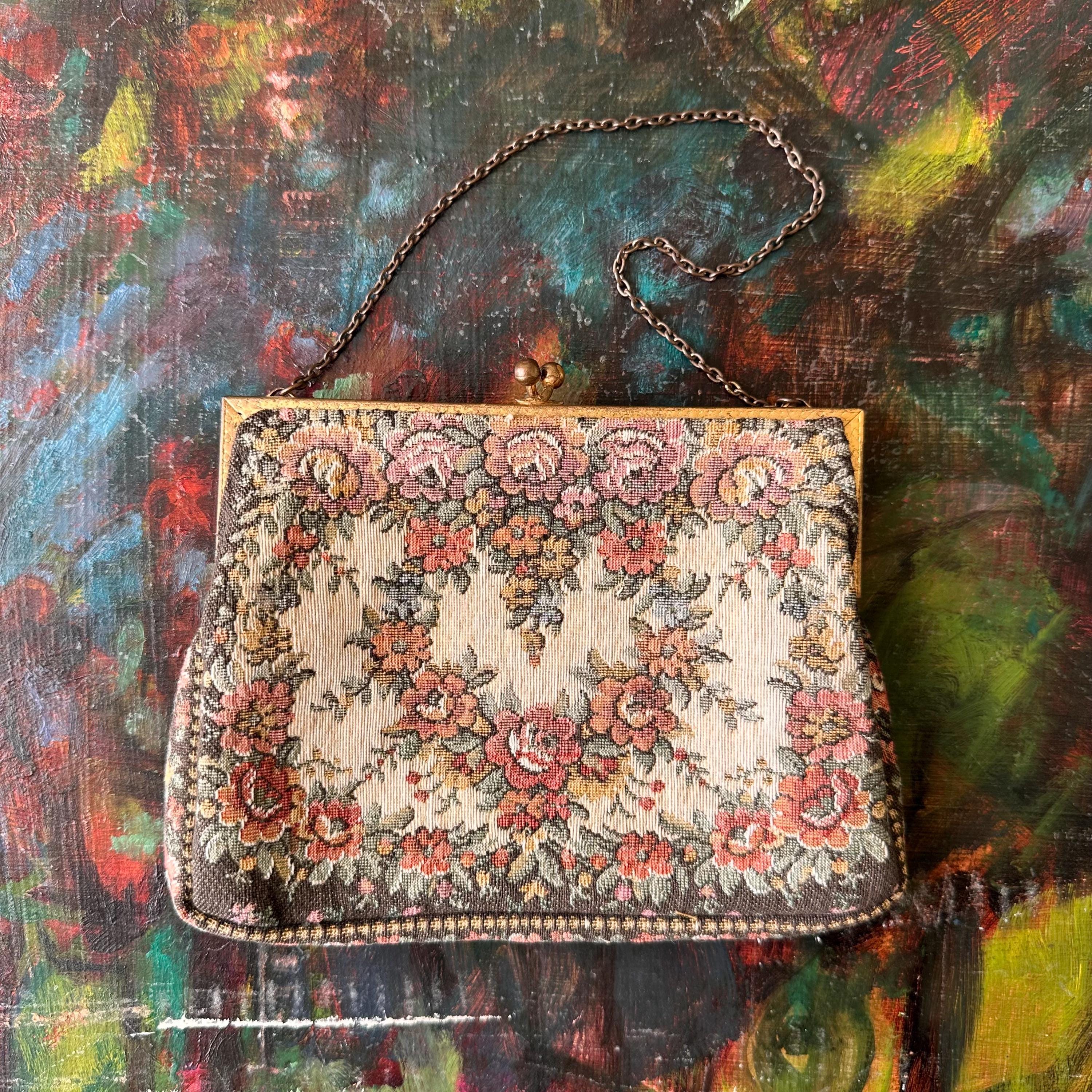 The bag is in great vintage condition for its age and use. The brocade and lining have general wear with only minimal discoloration, fading, or staining. The metal portions of the purse have begun to tarnish, especially the wrist chain and kisslock closure. The frame is still mostly shiny. The kisslock closure opens and closes easily.
