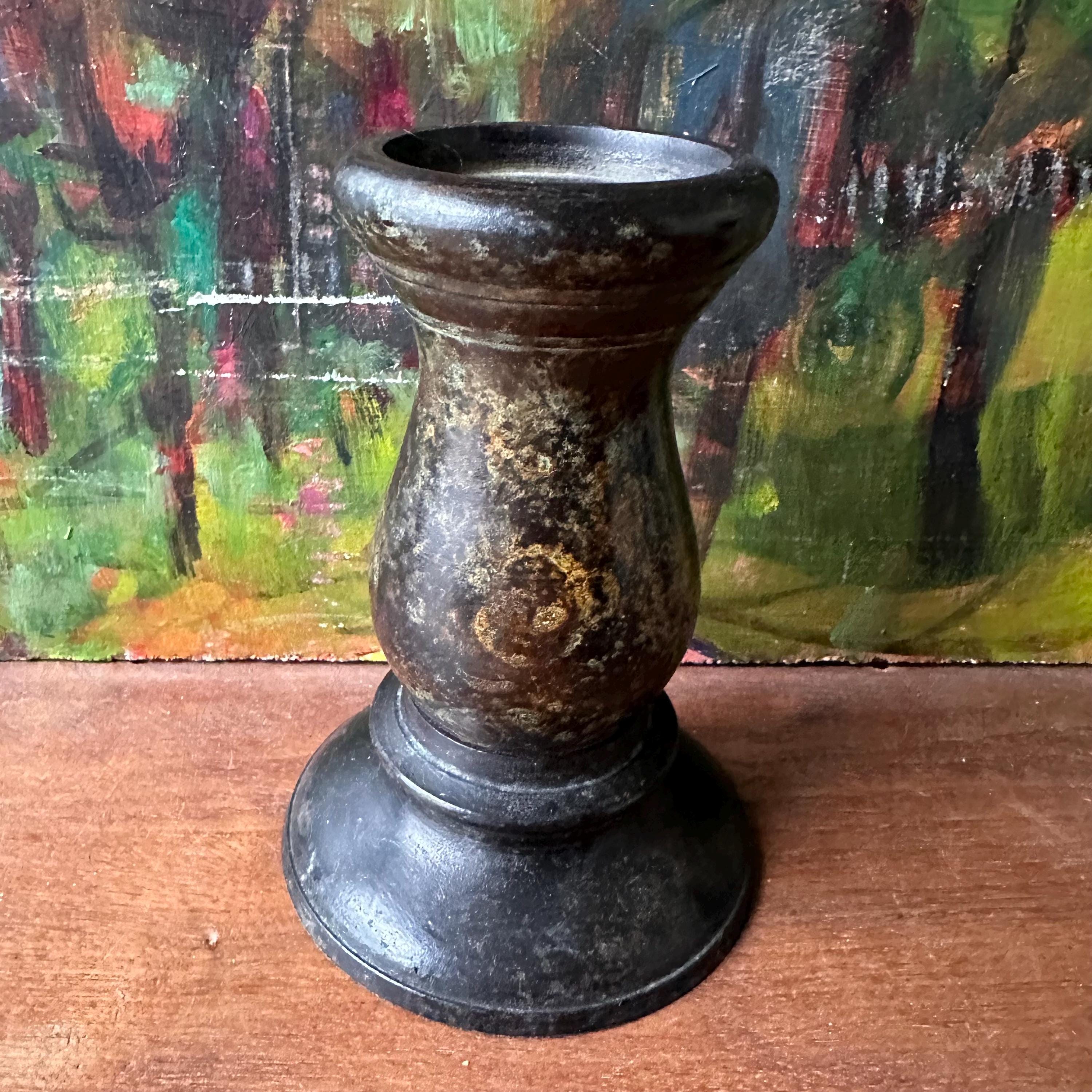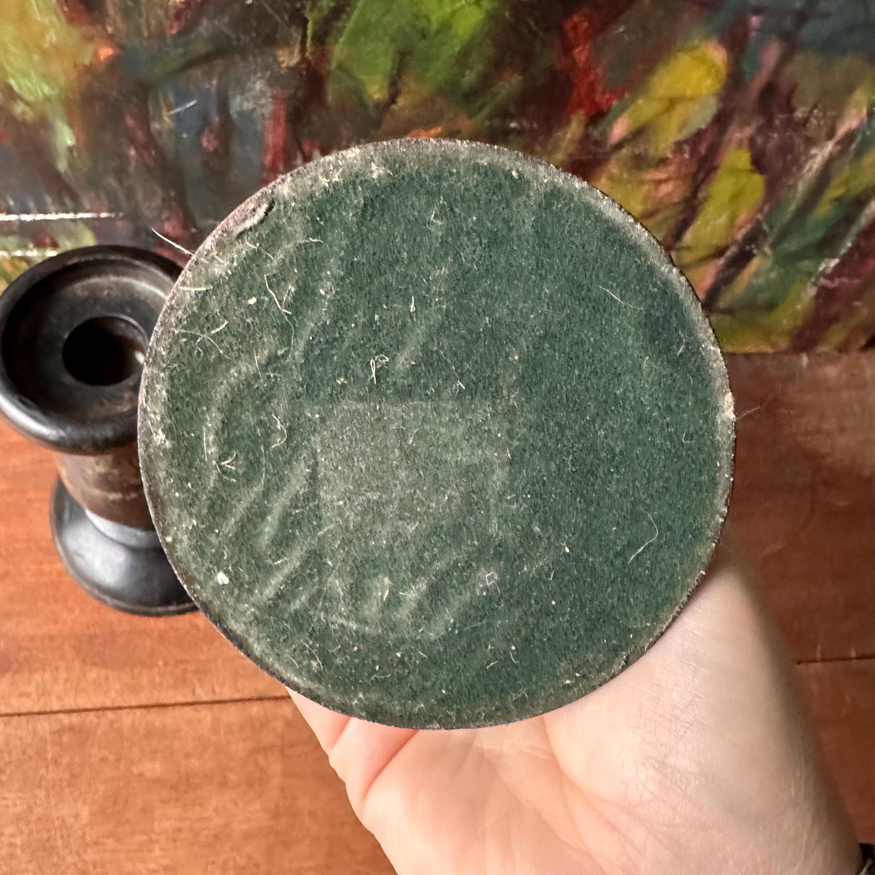 This is a set of 2 matching dark metal candlesticks. Both candlesticks have a round base with a potbelly style stem. The candlestick holders are made from metal with a dark marbled patina. The bottoms of the candle bases are covered in green felt.