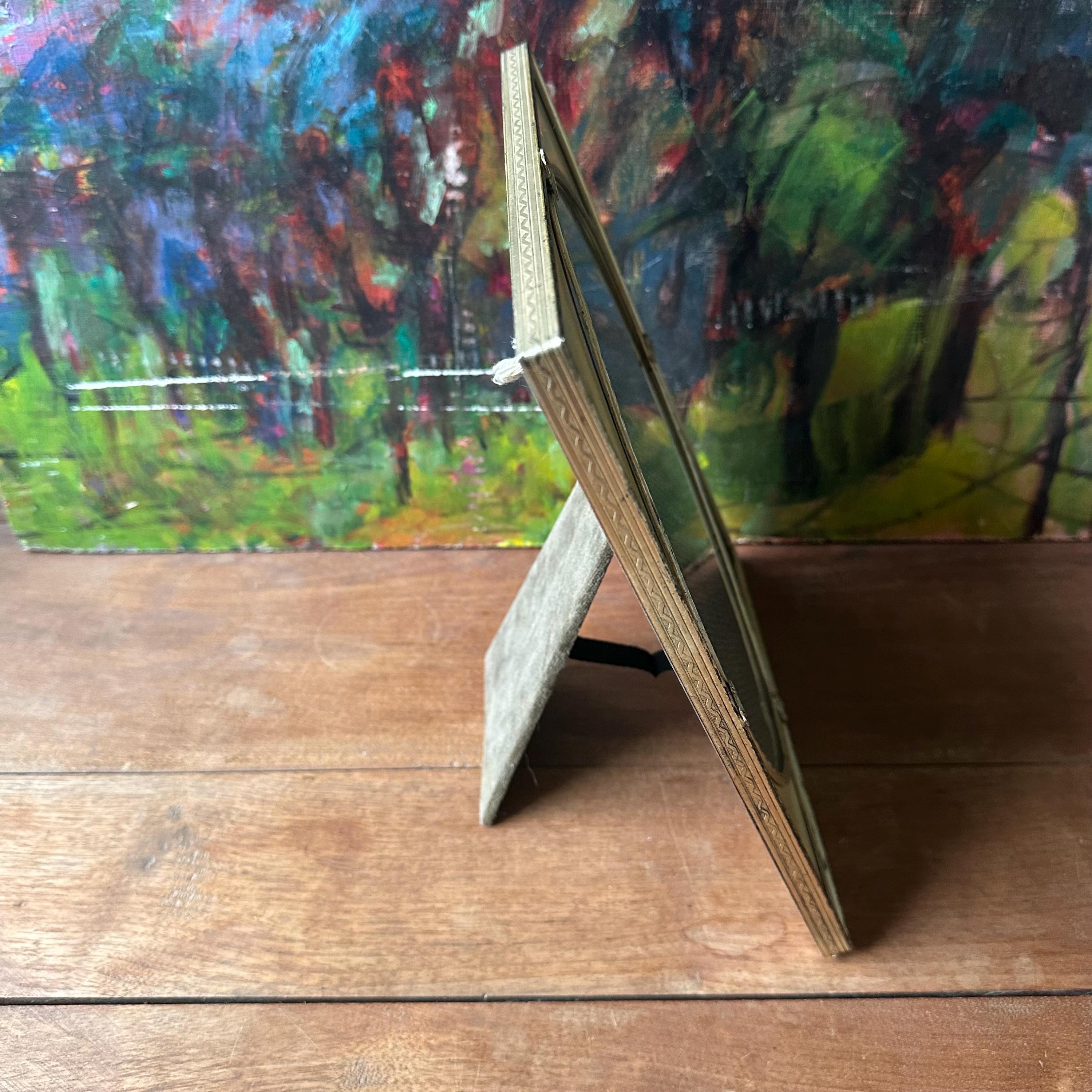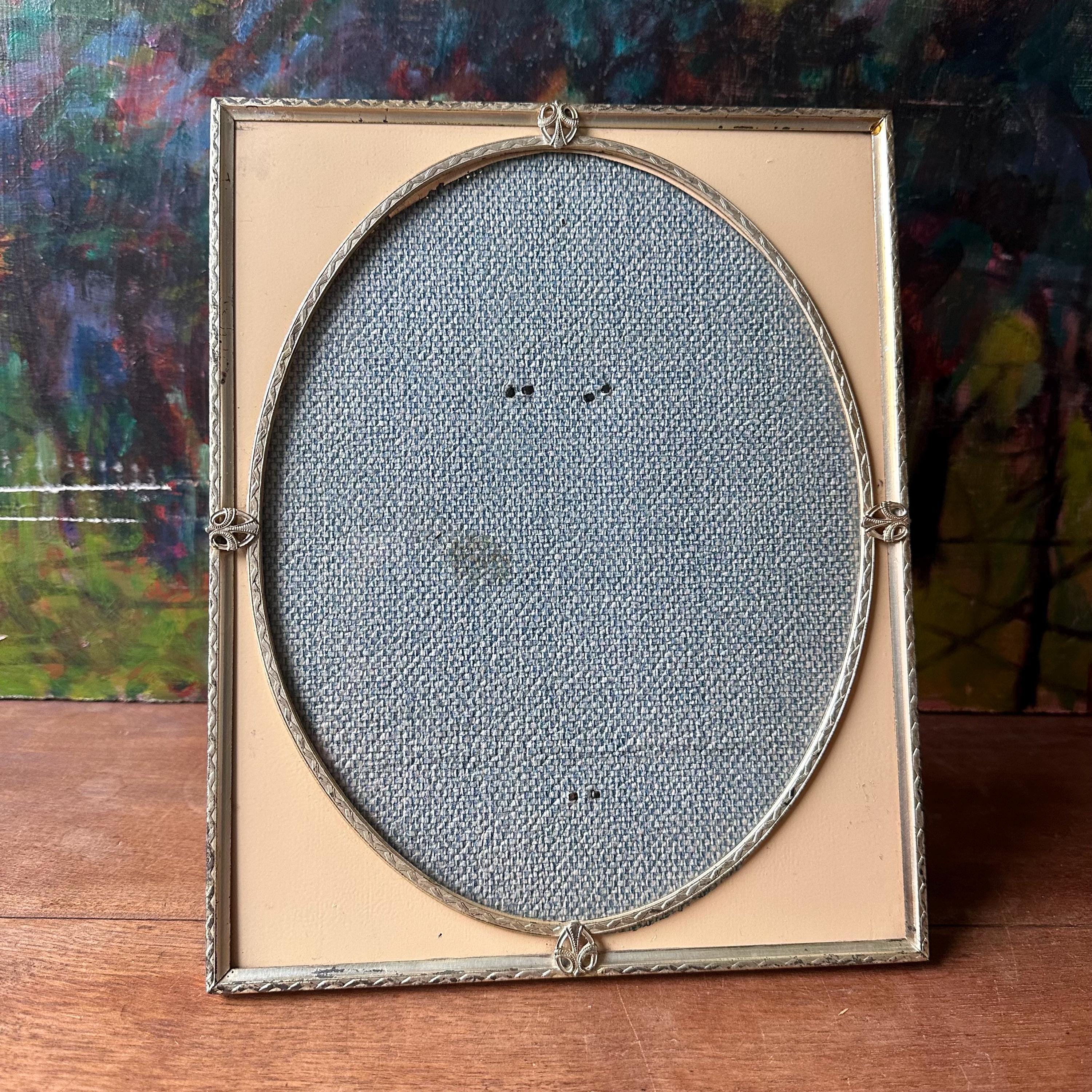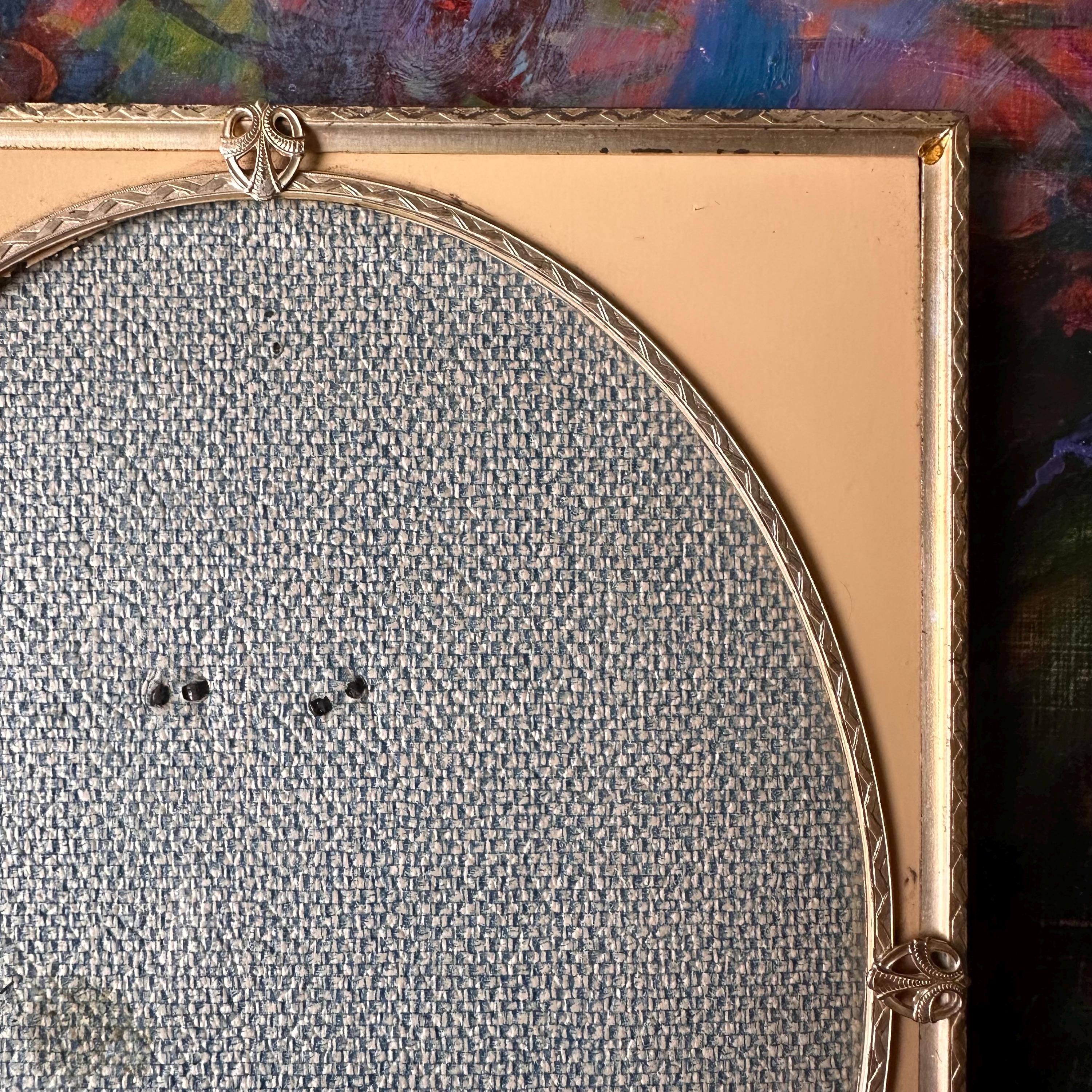 The frame is in good vintage condition for its age and use. There are areas of discoloration with some tarnish spots. The glass is mostly clear. The velvet backing has some small scratches and fading, mostly along the bottom of the frame. Someone added a small stripe of white paint on which is written a code - 76-27-37. The paint on the front is intact with one small area of discoloration to the top left corner. There is also discoloration and chipping to the paint where the paint meets the silver borders.