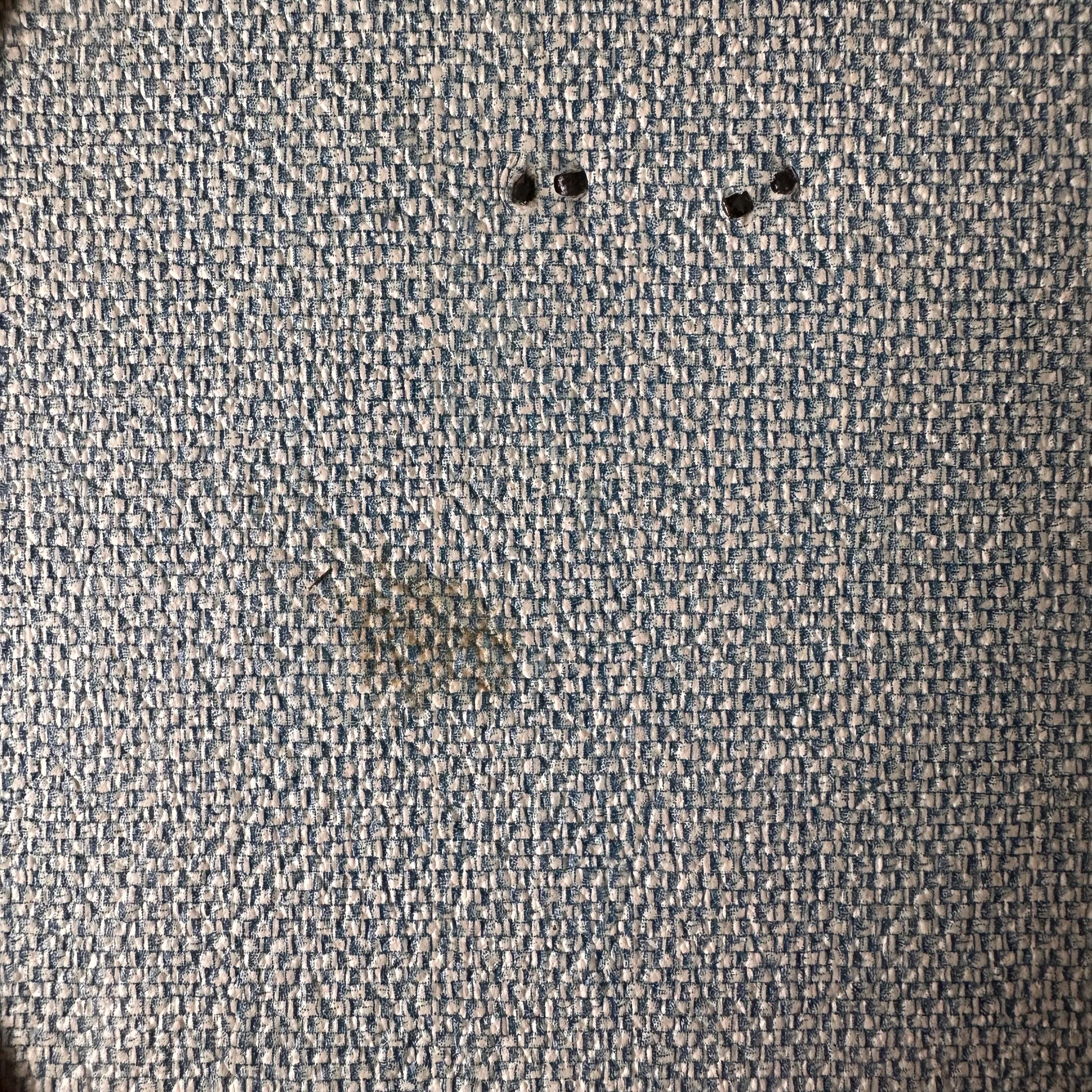 This is a silver metal picture with an oval opening. The frame is silver metal with an all over embossed wave pattern. The sides are also embossed with the same pattern and the back has an embossed herringbone. The four sides of the front have an attached silver metal motif in an abstract heart shape. The picture opening is clear glass in an oval shape, showing the blue and white burlap print on the back of the frame backing. The rest of the class is painted a pinkish cream color. The back of the frame is covered by an olive green velvet. There is a brass loop to hang it on the wall as well as an attached stand to set it upright on the tabletop.