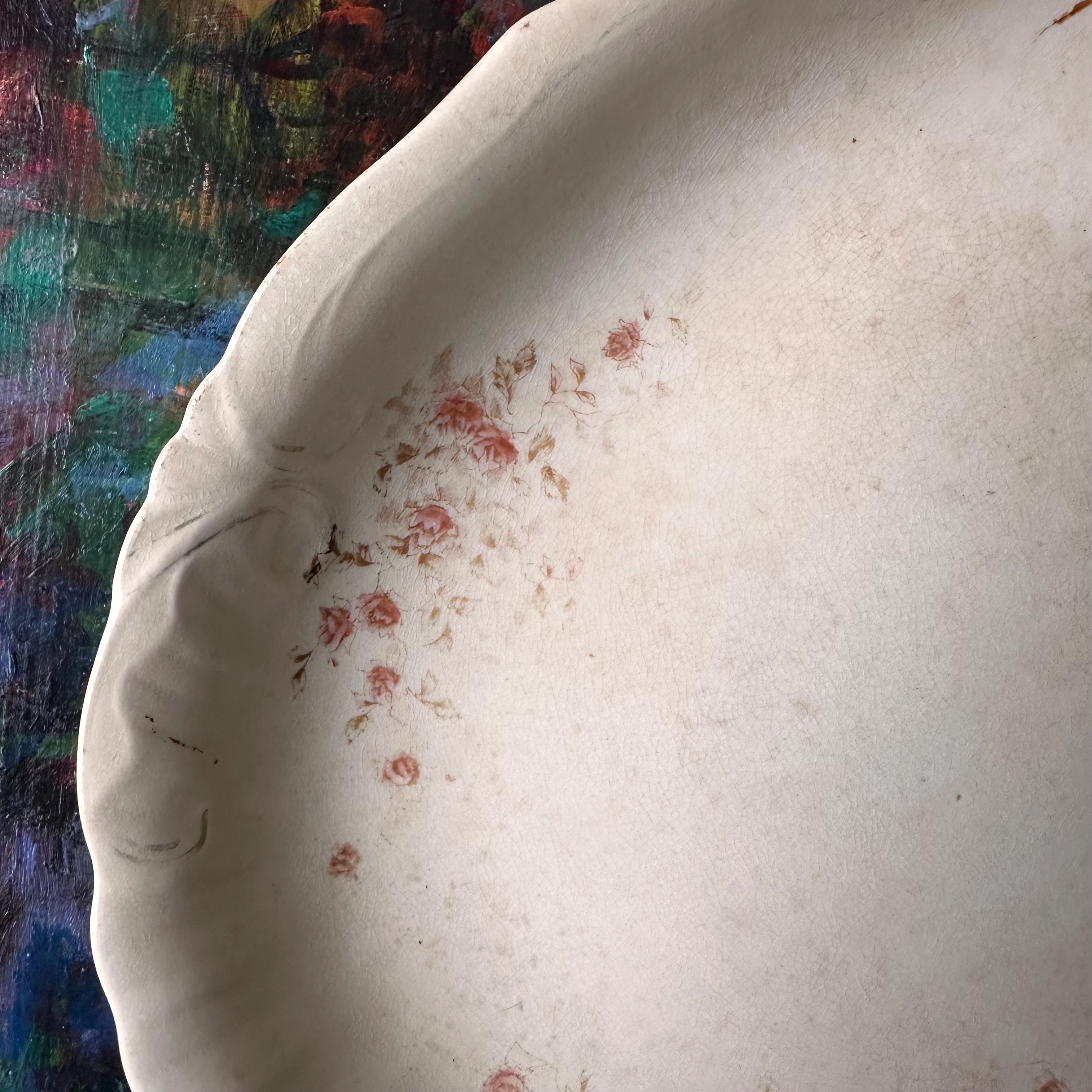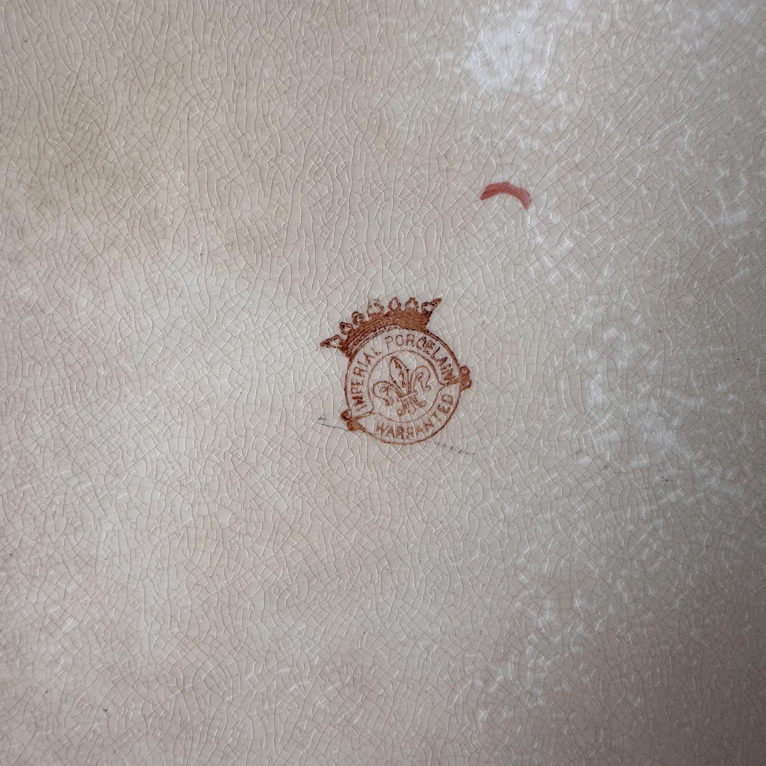This is an Imperial Porcelain platter. This platter has a lovely transferware floral design in the four corners of the platter, as well as a flourish embossed rim. The edges of the platter are scalloped. The underside is stamped Imperial Porcelain Warrented. A must-have addition to any farmhouse or cottage décor!