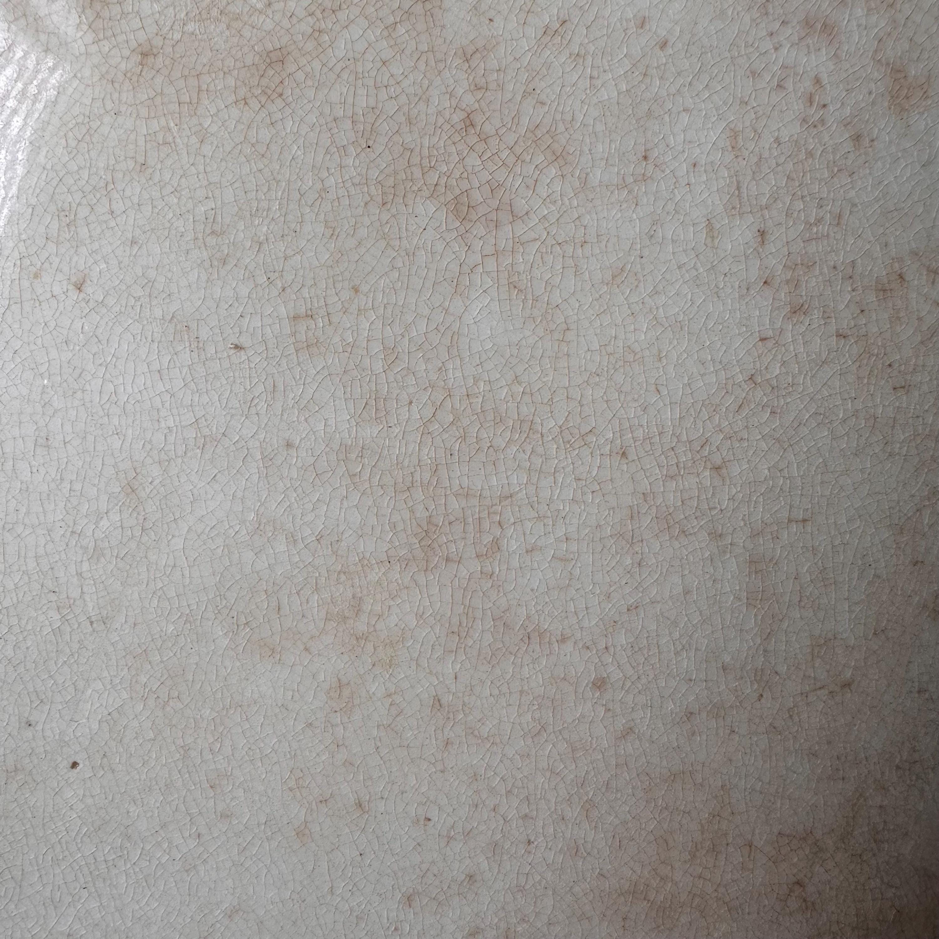 This platter is in good condition for its age and use. The glazing is crackled with an overall staining. The transferware pattern has some fading, especially to the left side of the platter. The gold shading on the transferware pattern has worn off in most places. There is one stained glazing divot to the underside of the rim of the platter. There are no other chips or cracks.