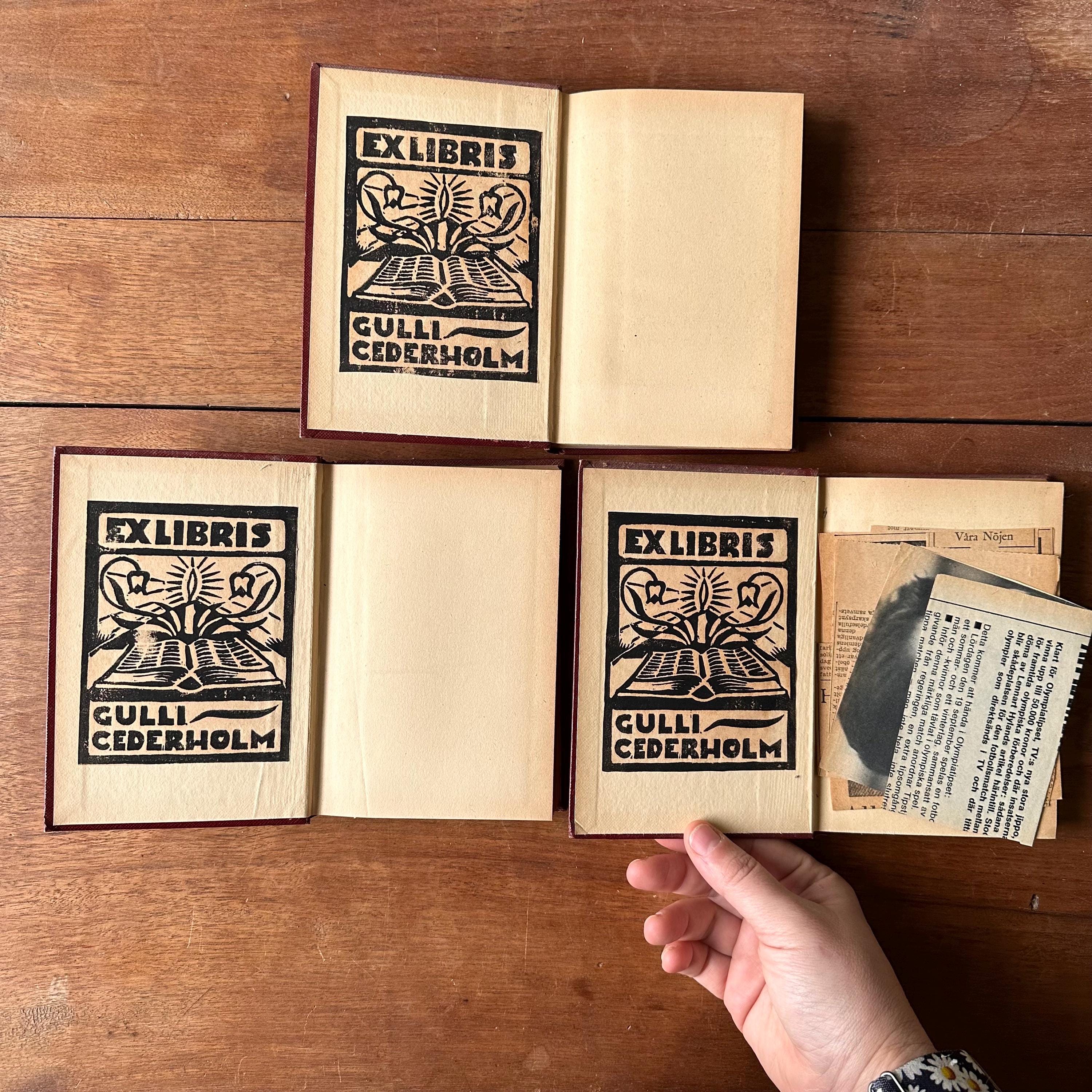 The books are in good vintage condition for their age and use. The covers have general wear with fading to the spines of La Peste and Quesney. The gold lettering has also begun to fade. The covers are all attached at the spine. The pages are very yellowed. There is a bookplate inside the front cover and La Peste also has some Swedish newspaper clippings.