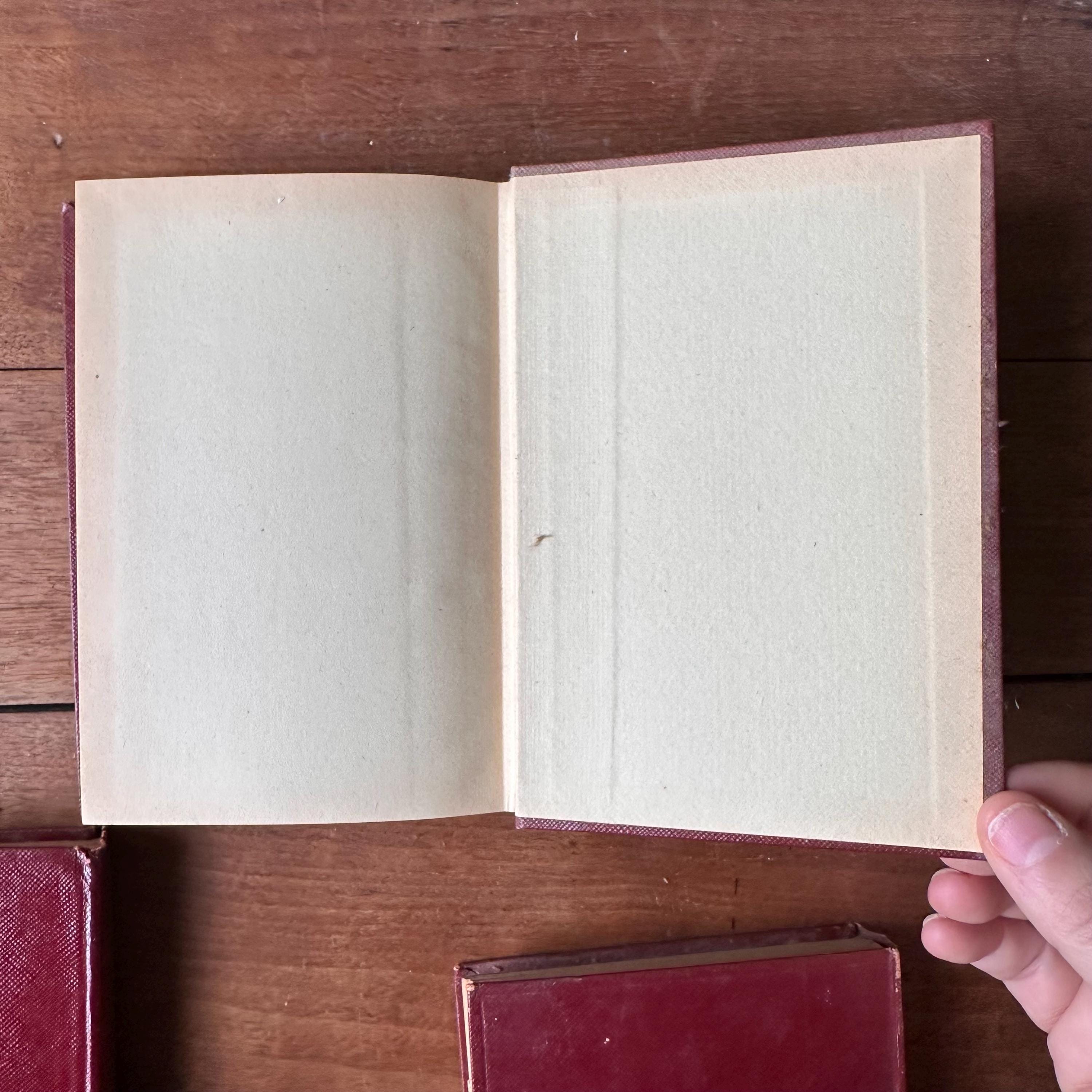This is a set of 3 1950s era red leather Gallimard French novels. The set includes Les Copains by Jules Romains, Bernard Quesnay by Andre Maurois, and La Peste by Alfred Camus. Each book is bound in dark red leather with the spine lettered in gold. All three have an illustrated title page and an illustrated first chapter heading. All three have around 250 or so pages.