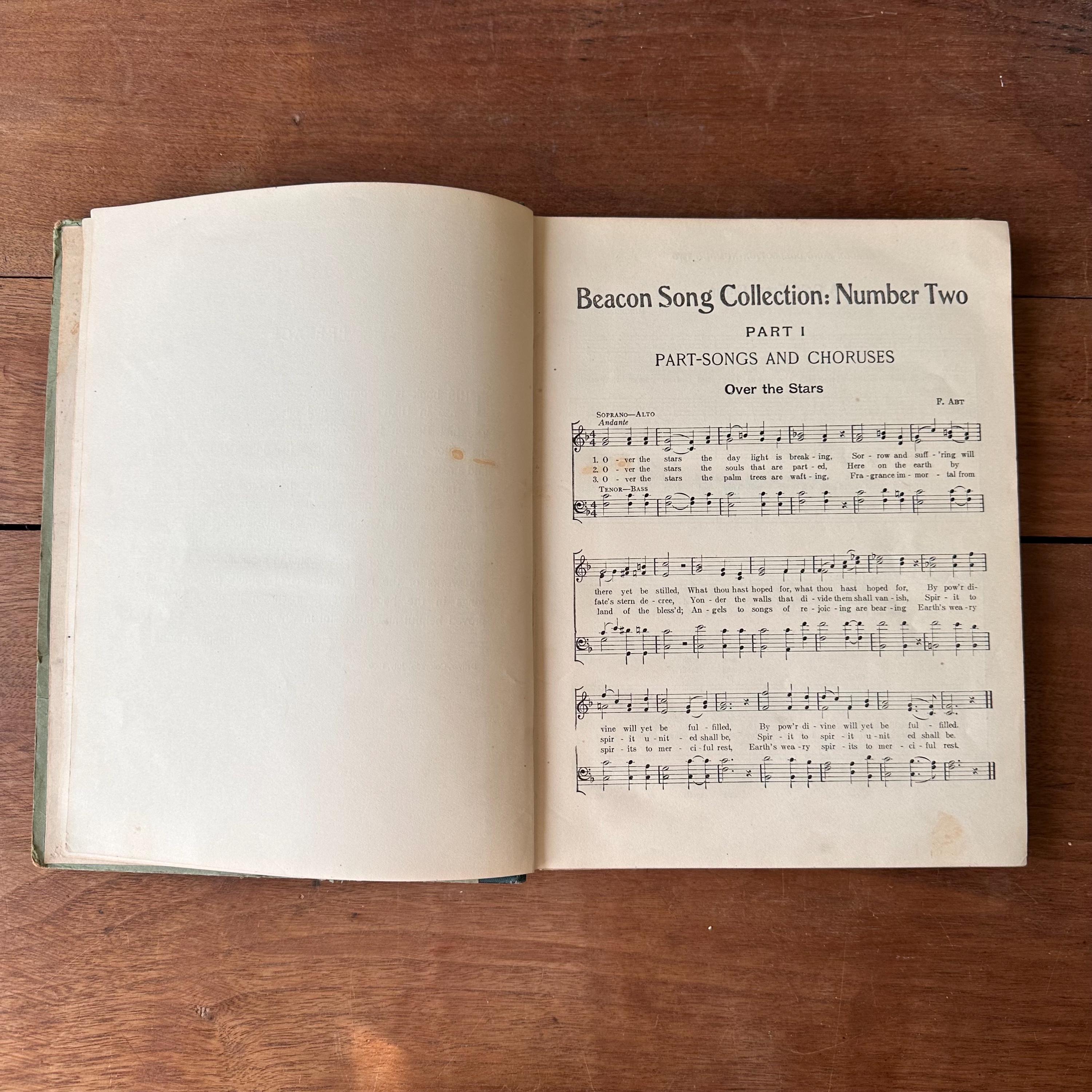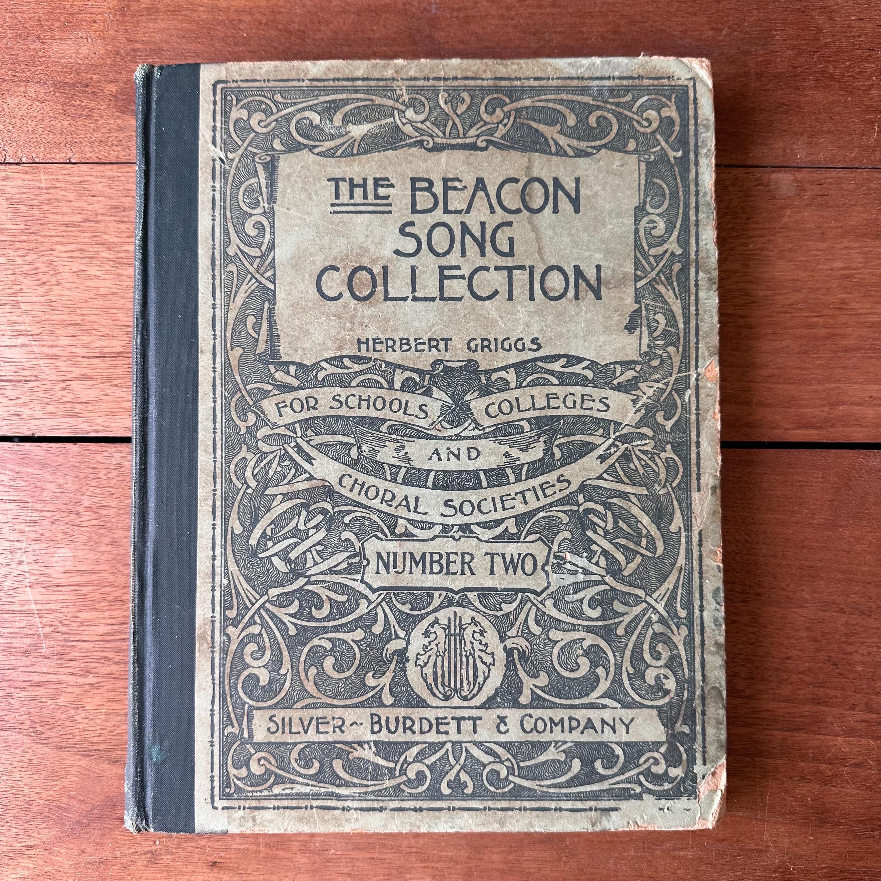 This is the antique 1900 edition of The Beacon Song Collection: For Schools, Colleges, and Choral Societies Number Two, compiled and arranged by Herbert Griggs and published by Silver-Burdett & Company. It has a green illustrated cover with a dark green spine. The back cover lists the Silver-Burdett catalog of musical publications. The songbook is divided into 5 sections: Part-Songs and Choruses, Songs for Social Occasions, Songs for Arbor Day, National and Patriotic, and Sacred Selections. There are 252 pages.