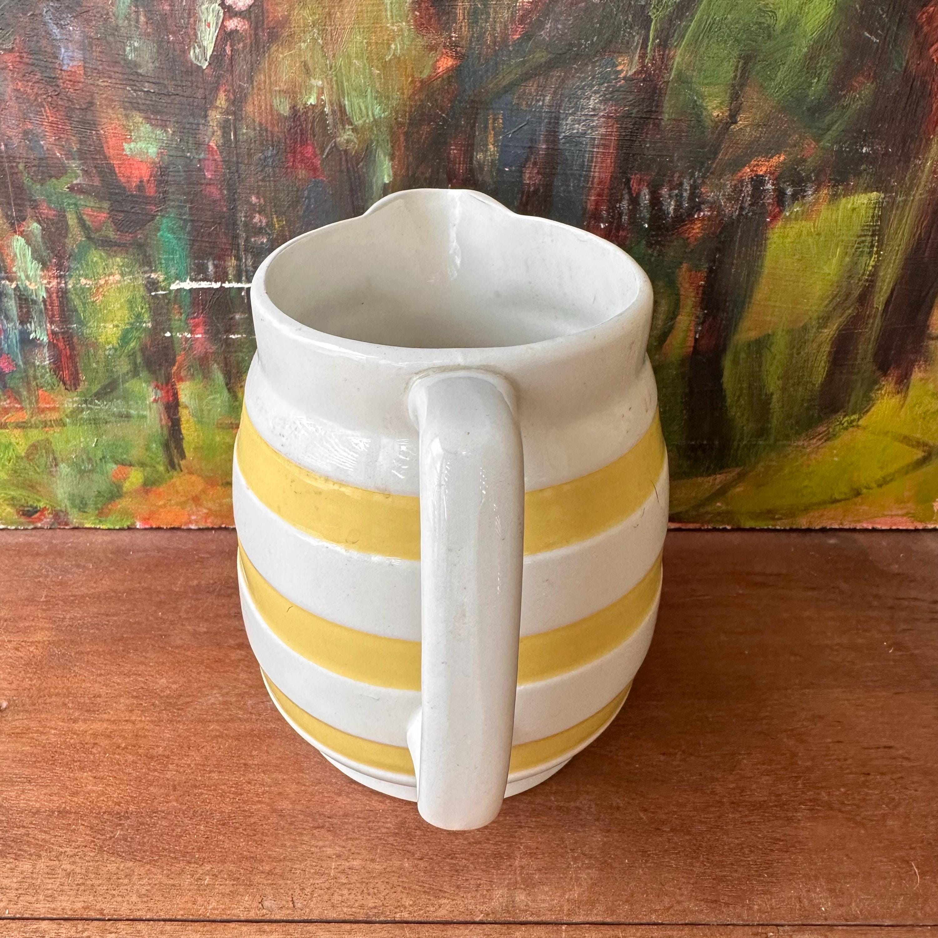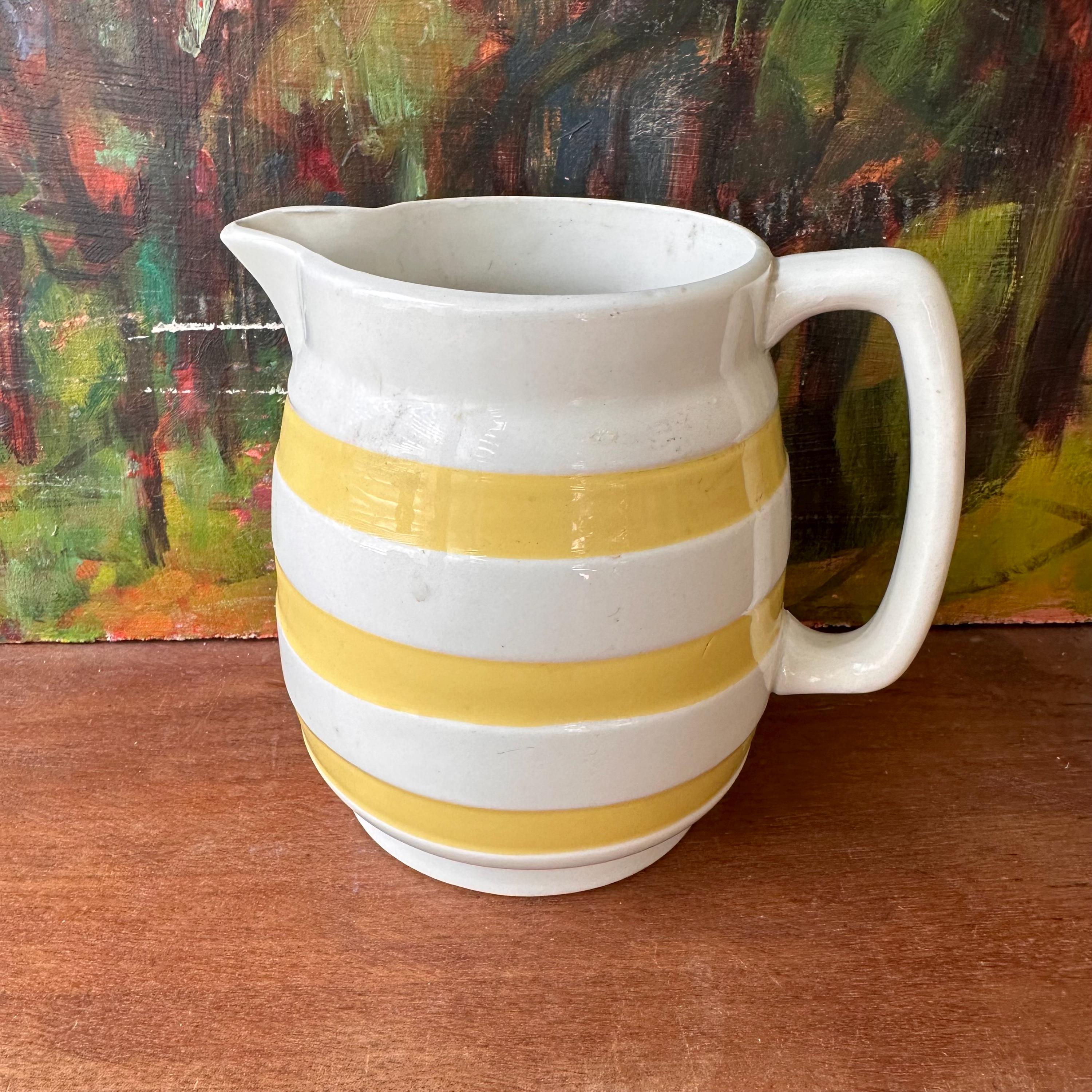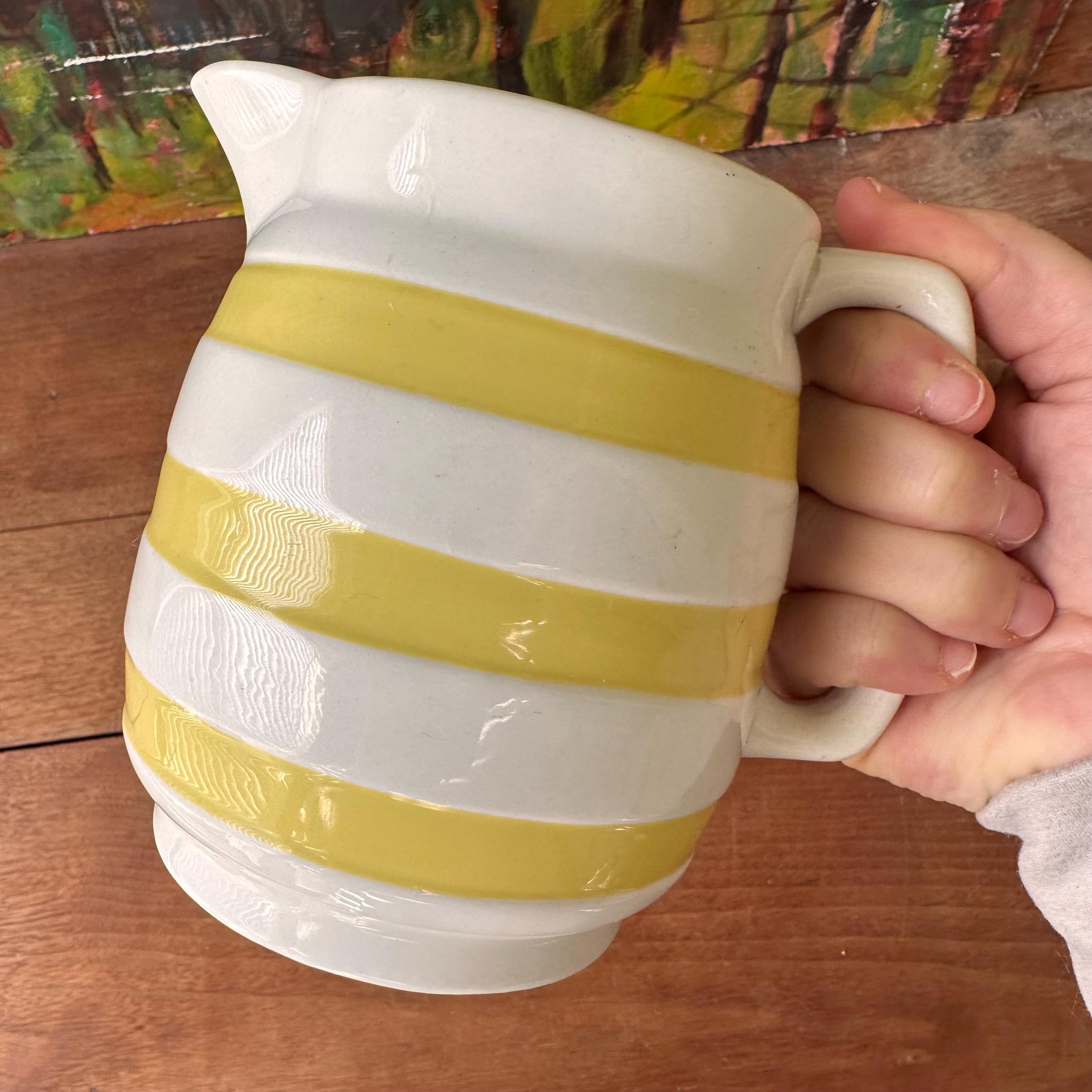This is a white ceramic Carrigaline Pottery pitcher with yellow stripes. The pitcher is bright white with a wide mouth and slightly footed bottom. The pitcher is decorated with inset stripes that have been painted yellow. The pitcher has a squared off handle. The bottom is stamped with the Carrigaline Pottery stamp as well as Carrigaline Ireland embossed.