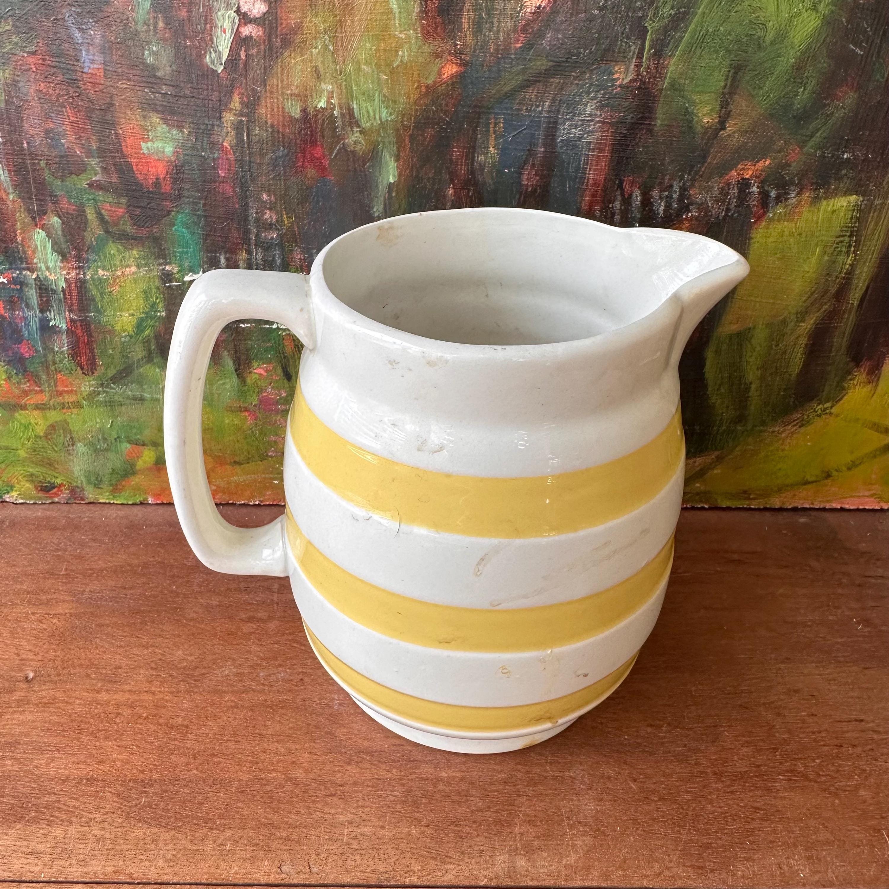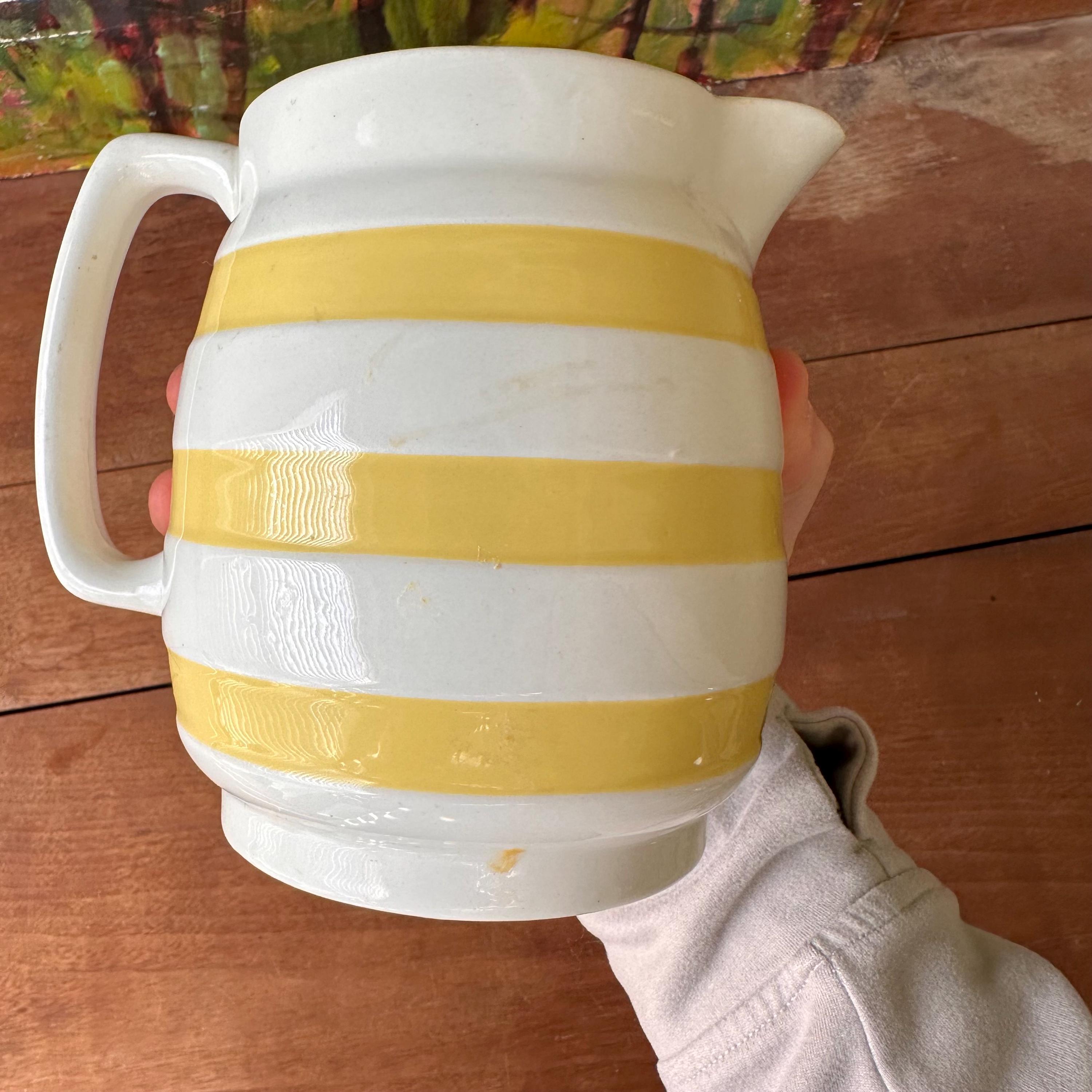 The pitcher is in good vintage condition for its age and use. It has general wear to the glazing inside and out. There are a couple of small glaze defects that look like little lines or divots. One side of the pitcher has some yellowish staining and discoloration.