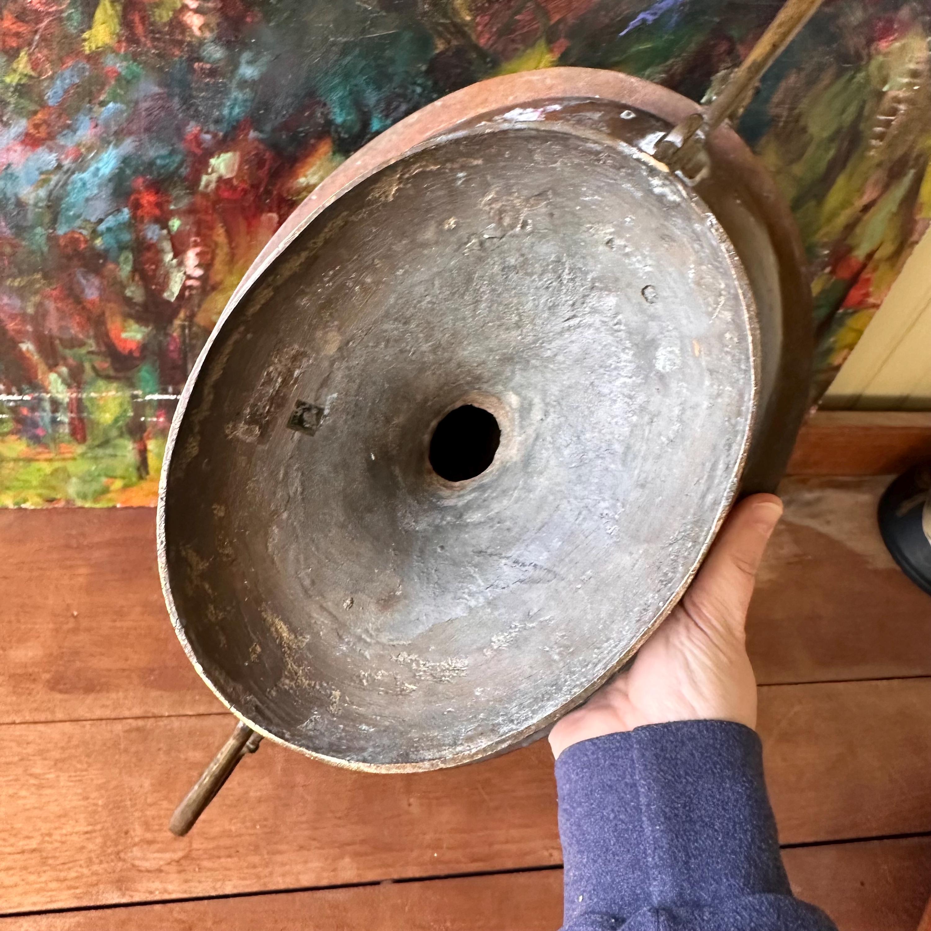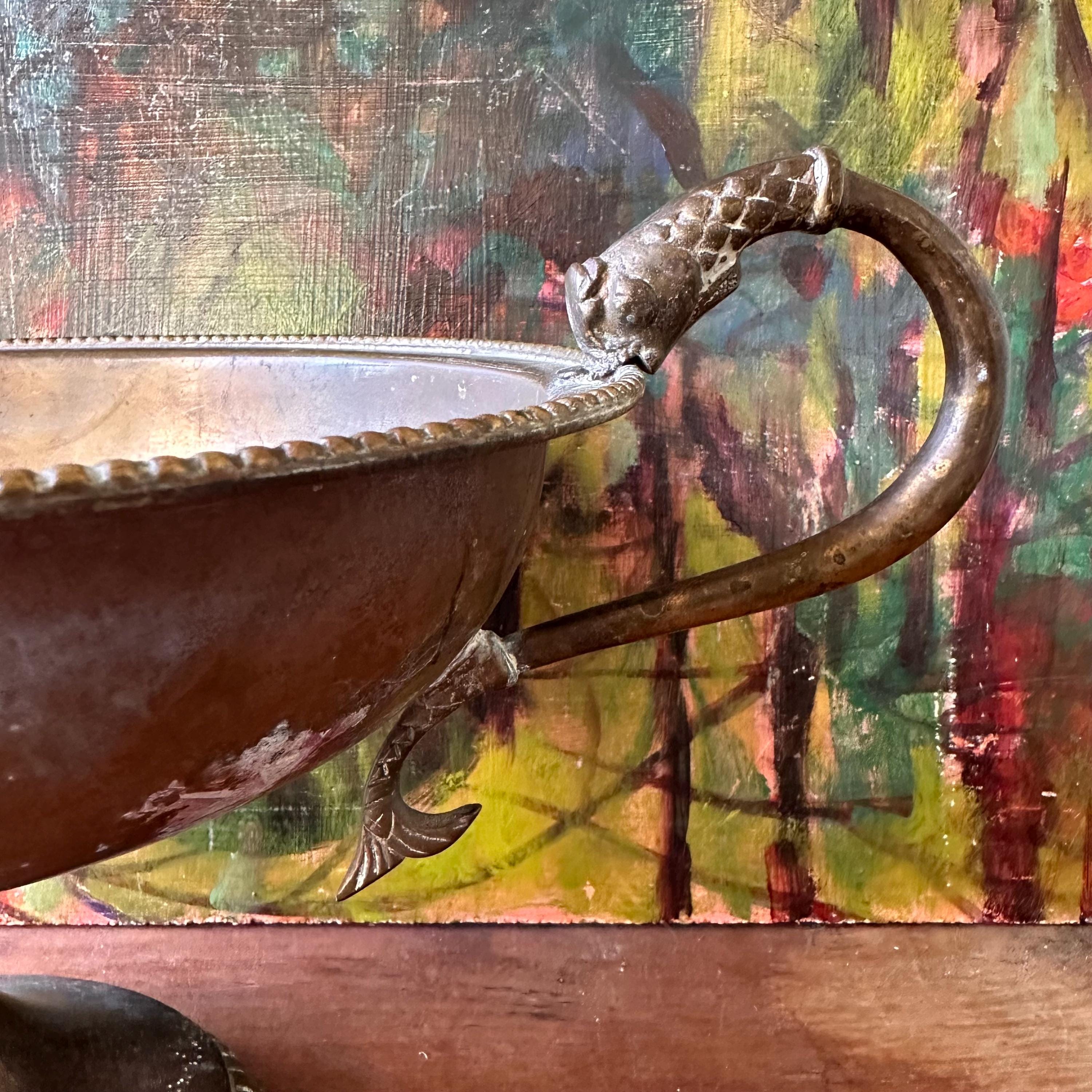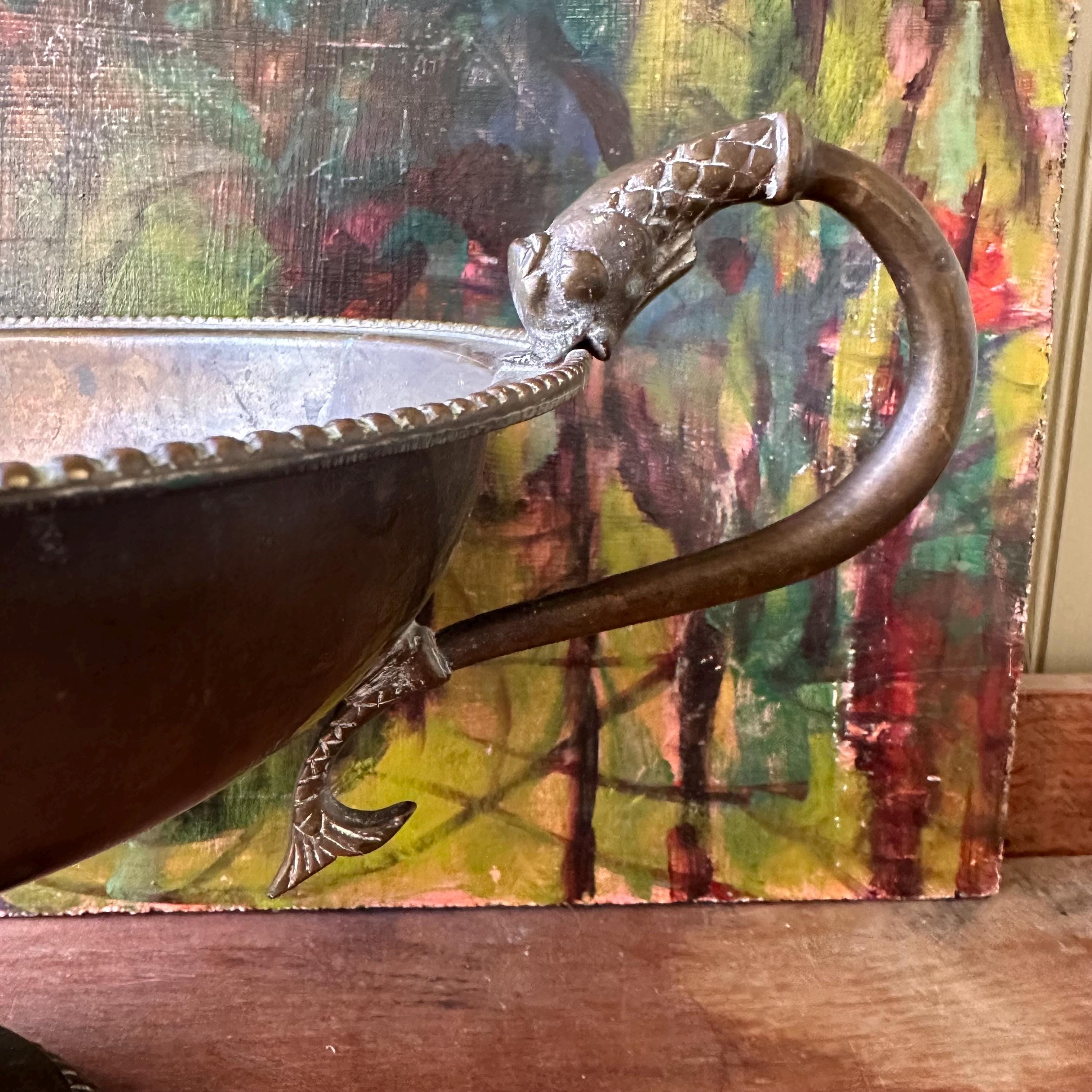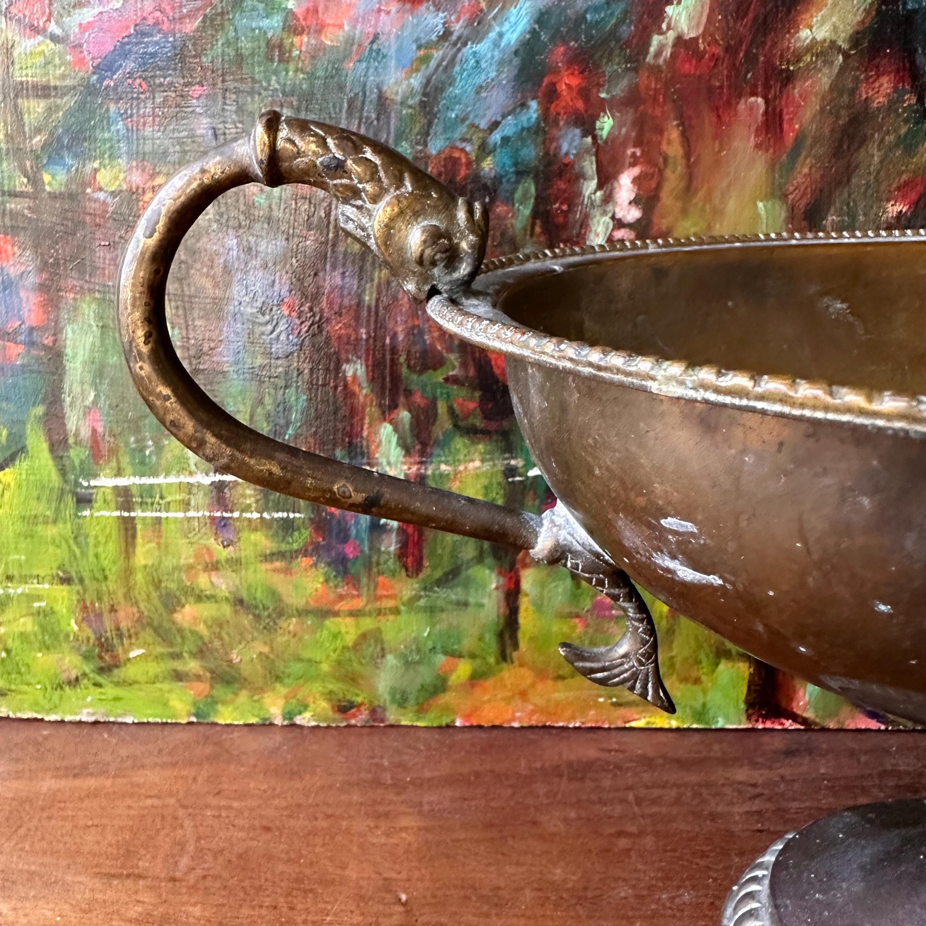 The bowl is in good vintage condition for its age and use. The brass has aged, giving it a lovely patina. There are areas of discoloration and tarnishing all over, especially to the bottom inside of the bowl. The handles are well attached.