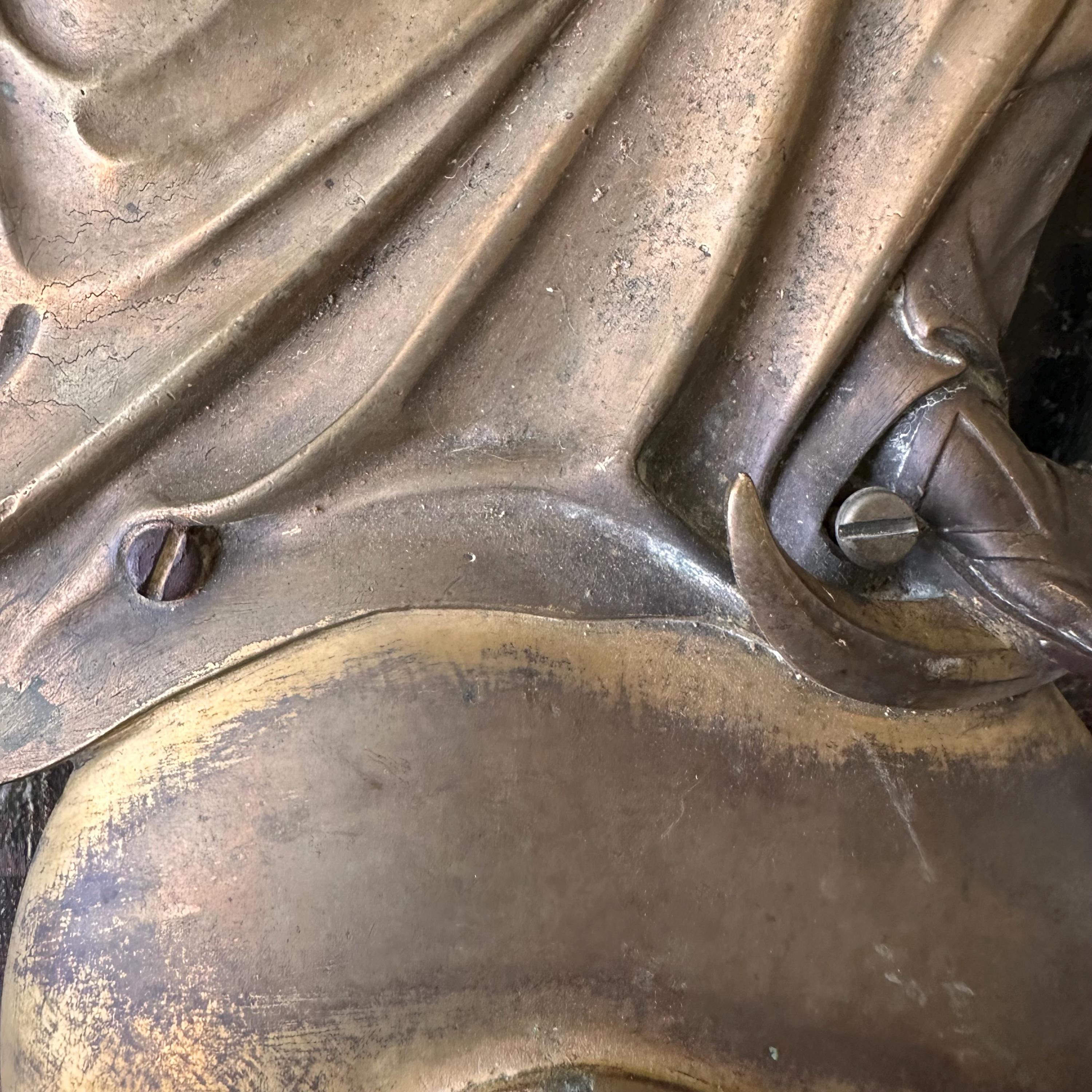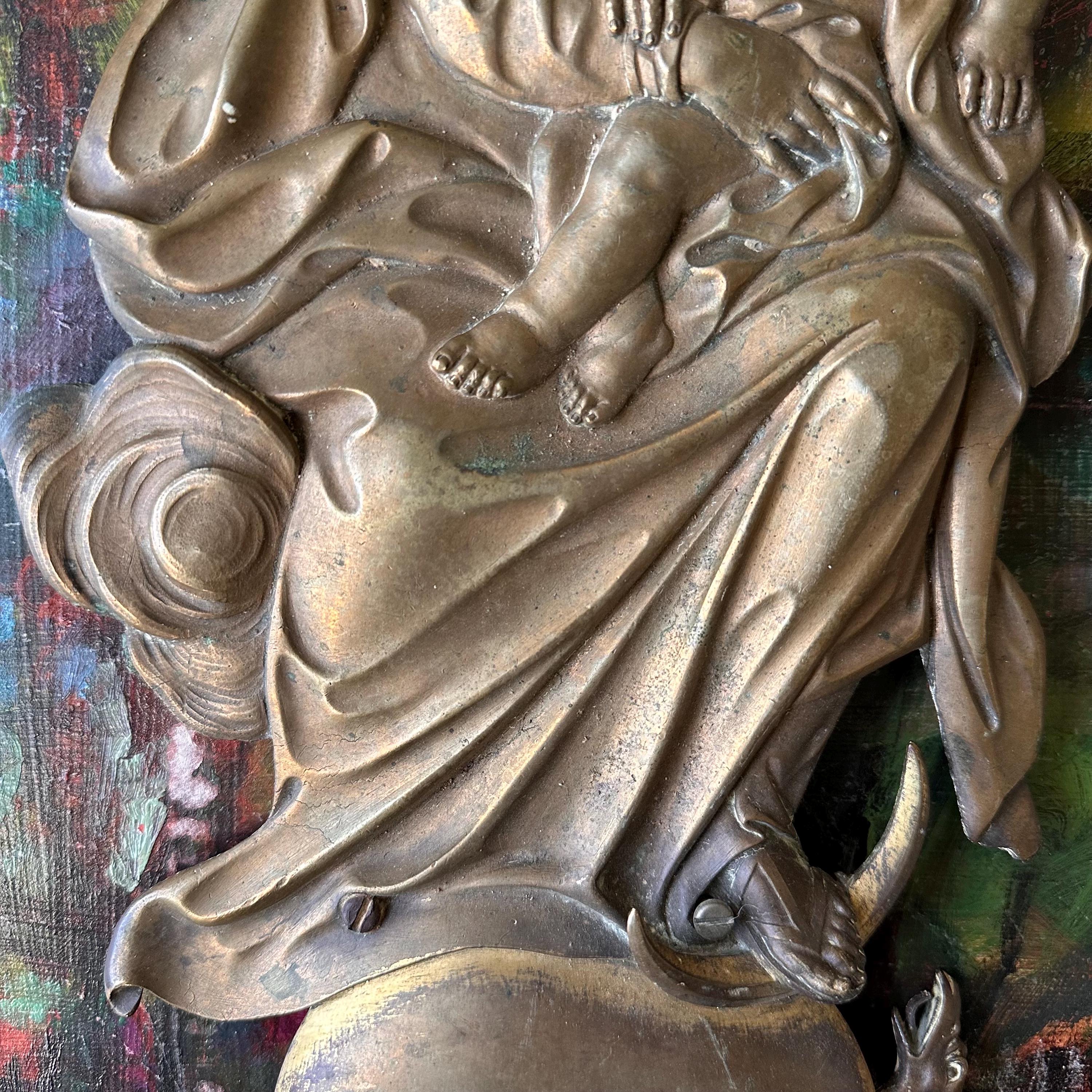 This is a bronze Madonna & Child relief sculpture. The sculpture is three-dimensional featuring the Madonna or Virgin Mary holding the Christ Child. The Madonna is standing on a crescent moon on top of a globe with a serpent coiled around it. The piece is cast in bronze and is classical or Baroque in design with Mary's flowing robes, providing drama to the piece. There is no artist's mark, but there are three screws in the piece, so it was potentially part of something larger.