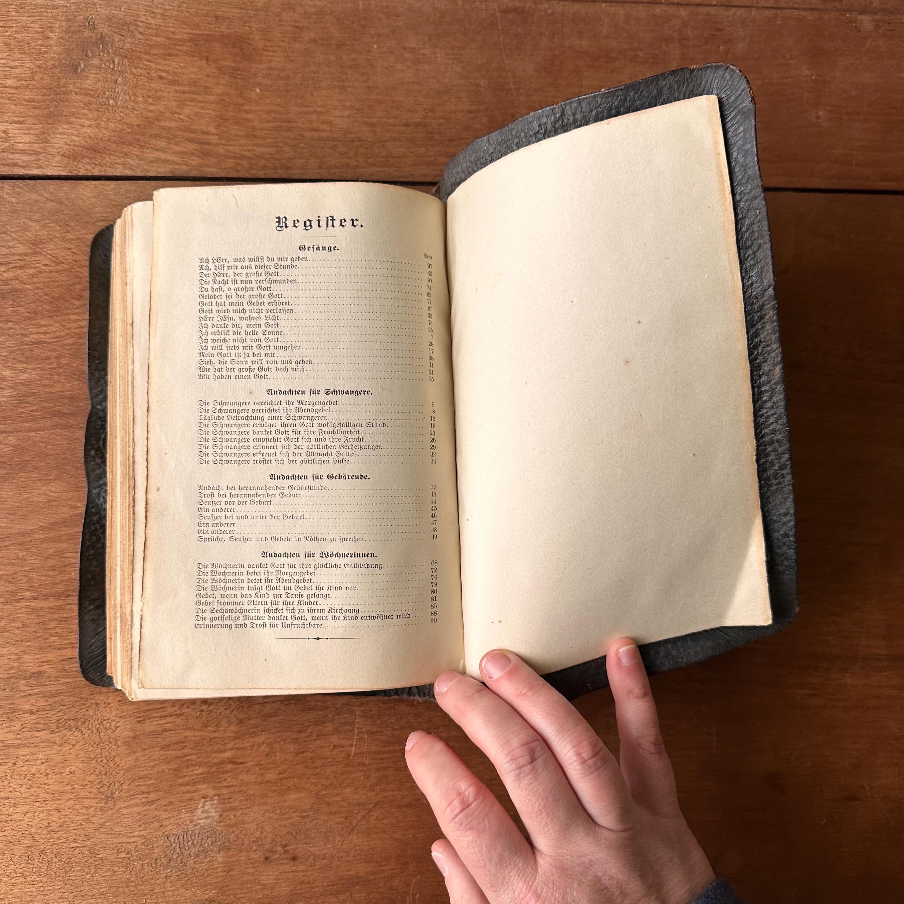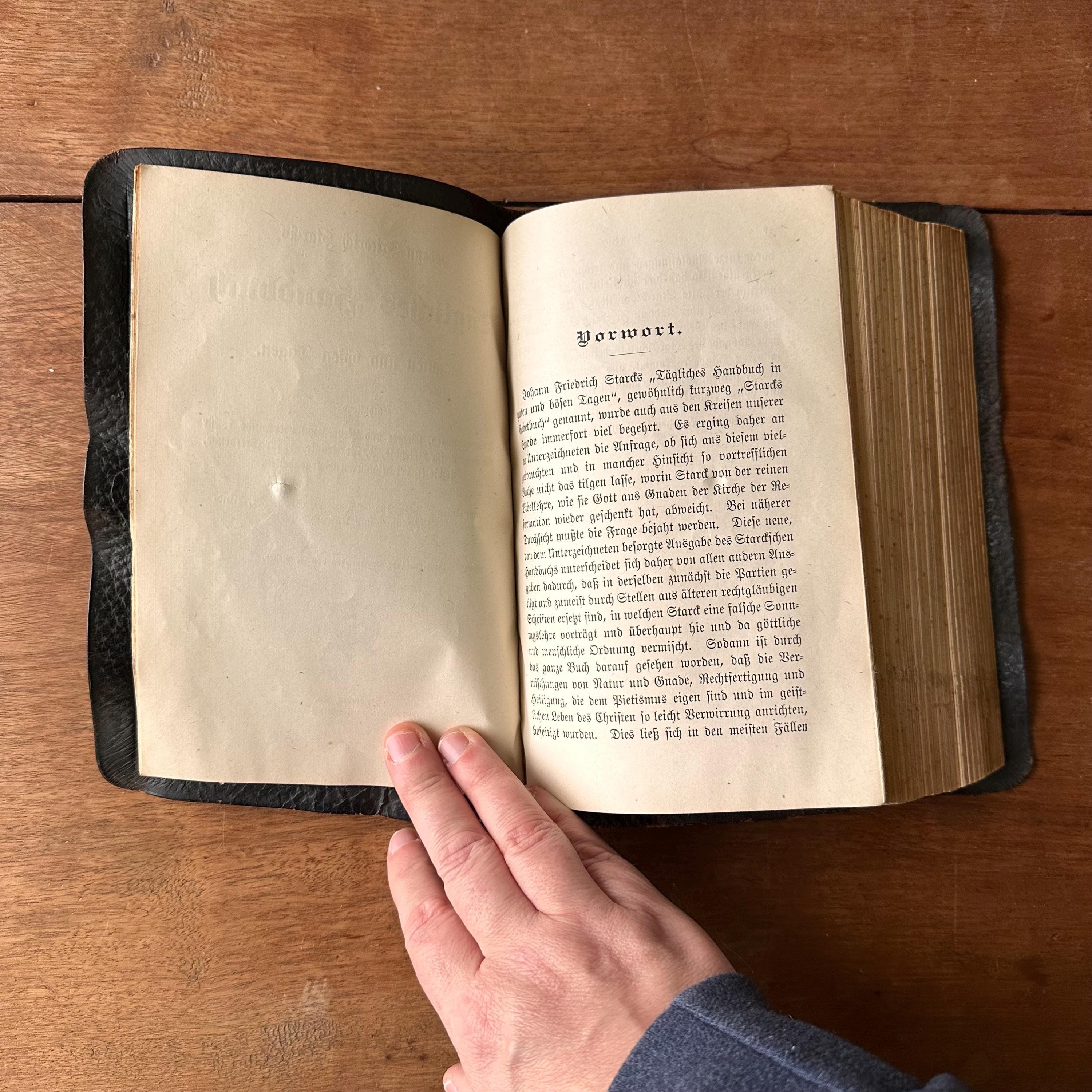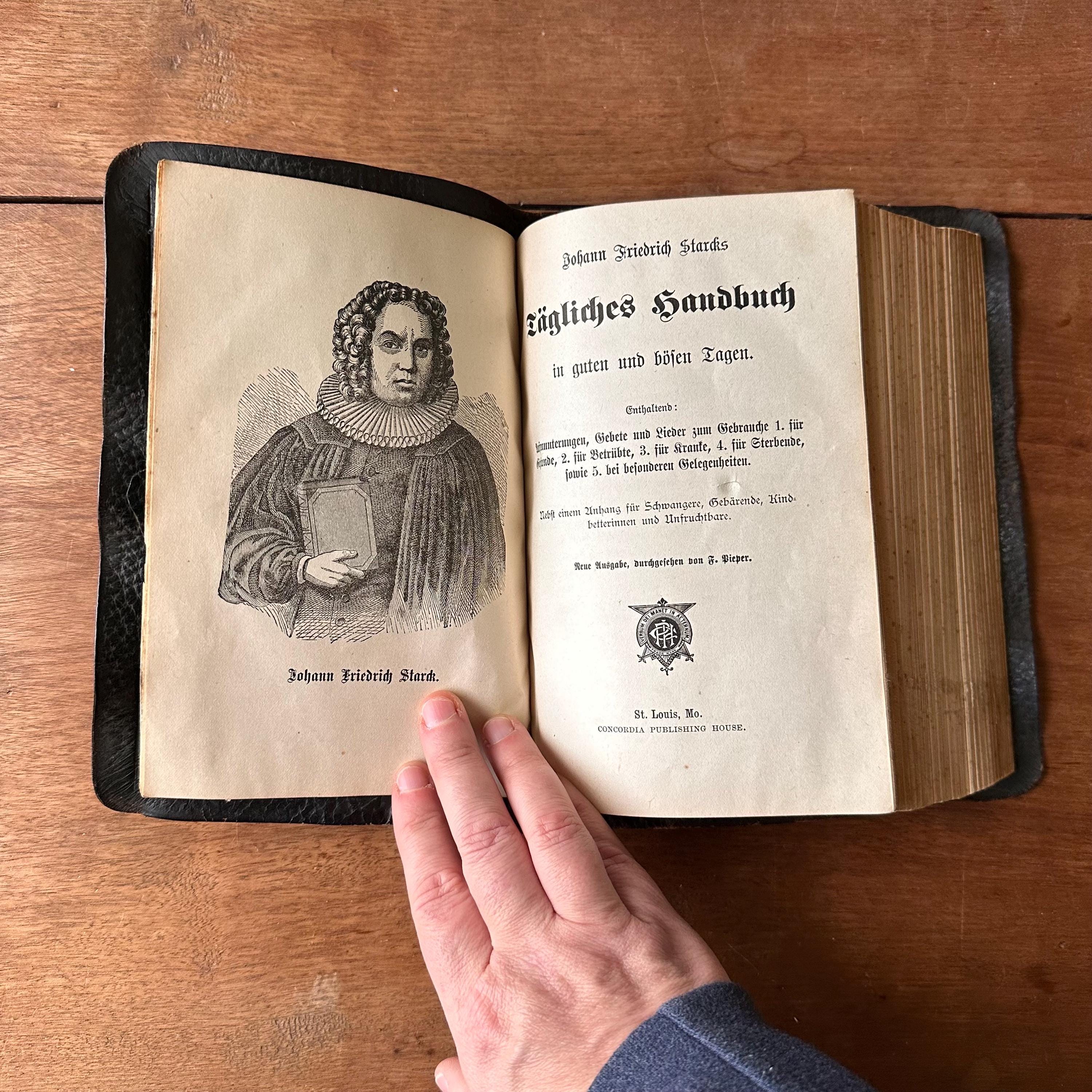 This is an antique 1900 edition of Tagliches Handbuch, which translates to Daily Handbook for Good Times and Bad by Johann Friedrich Starck and published by Concordia Publishing House. It includes encouragements, prayers, and songs for the healthy, the afflicted, the sick, the dying, and special occasions. It also includes an appendix for pregnant women, women in labor, mothers, and the infertile. This is the Repentance Edition, revised by F. Pieper. It has black pebbled leather bound softcovers with a gold cross on the cover and gold lettering on the spine. The endpapers are black and the page ends are gilded. There is a section of note pages at the front to input family information like births, marriages, deaths, etc. There is one black and white portrait of Starck at the title page. There are 666 pages as well as the 99 page appendix.