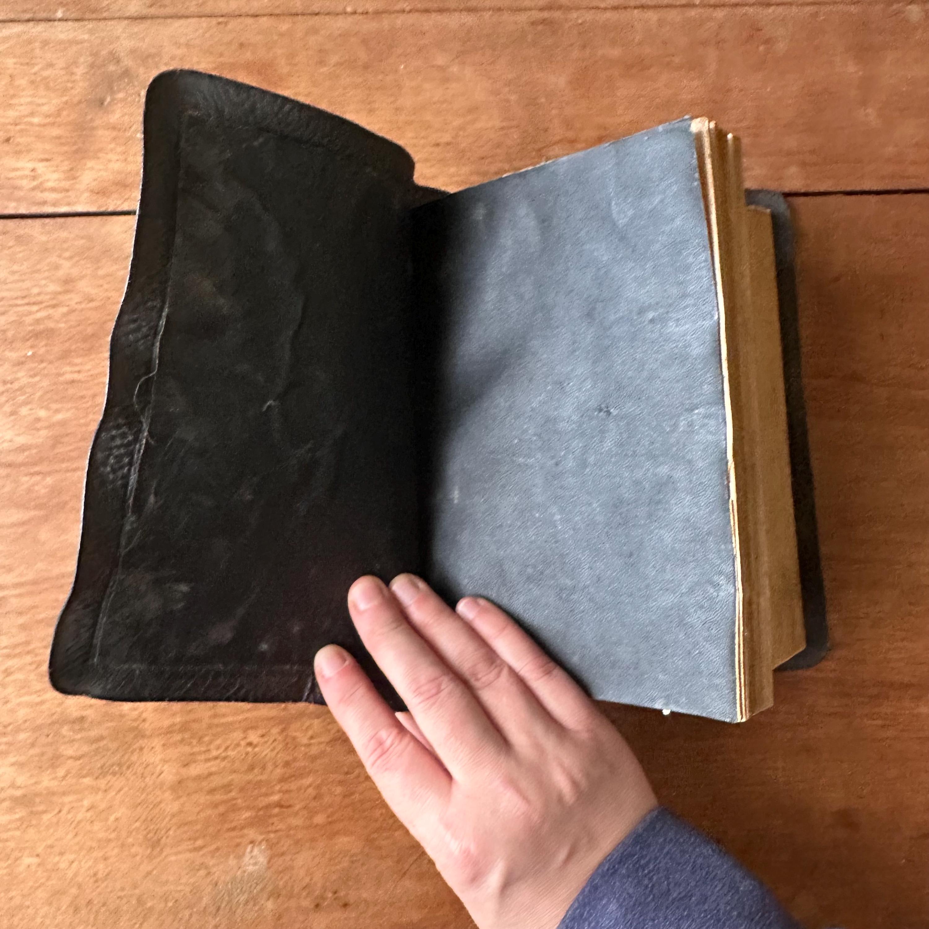 The handbook is in good antique condition for its age and use. The covers have general wear, mostly to the edges. The gold cross on the cover has faded. The gilt page ends are still bright. The covers are still attached at the spines and the spine is tight. The pages have yellowed with some minor areas of staining.