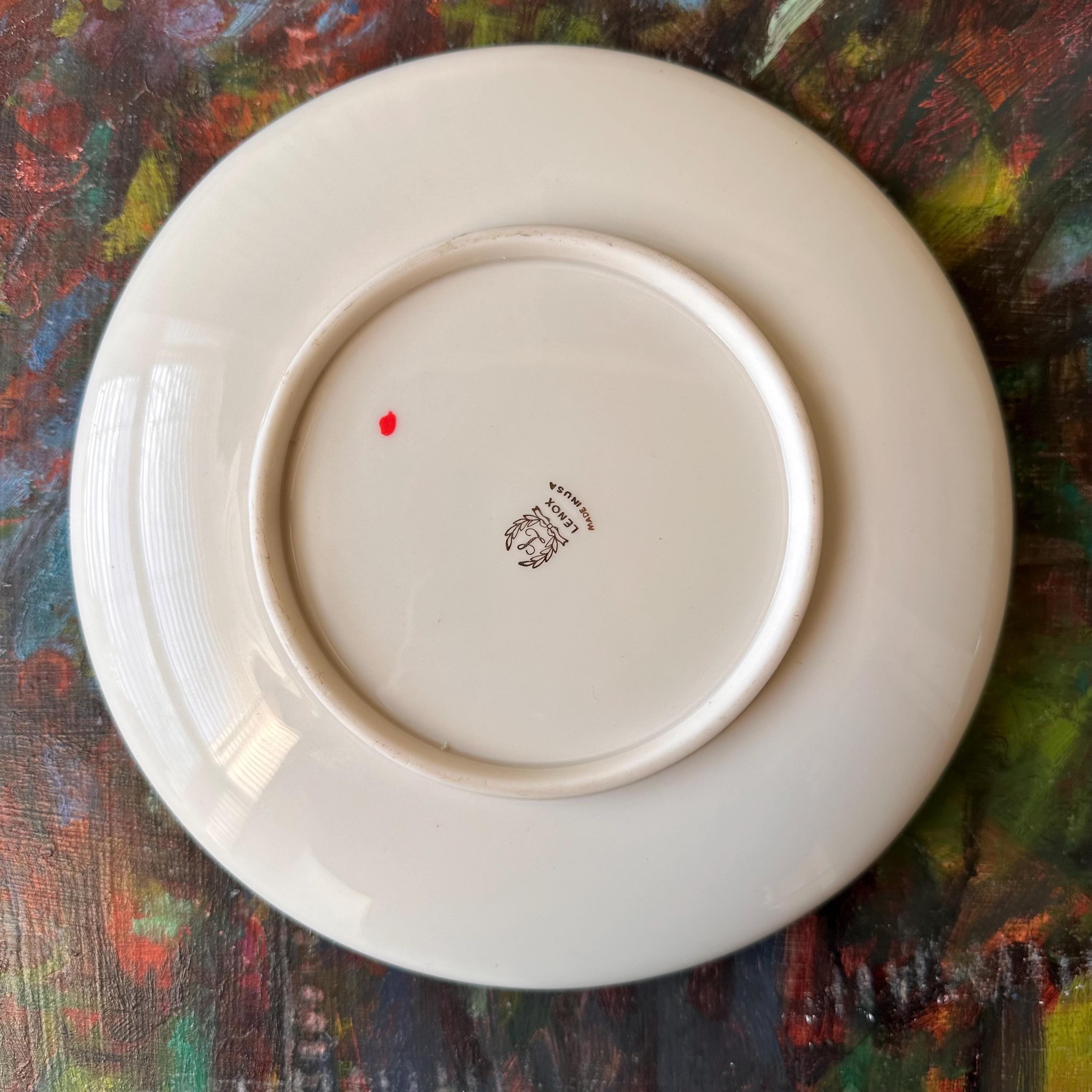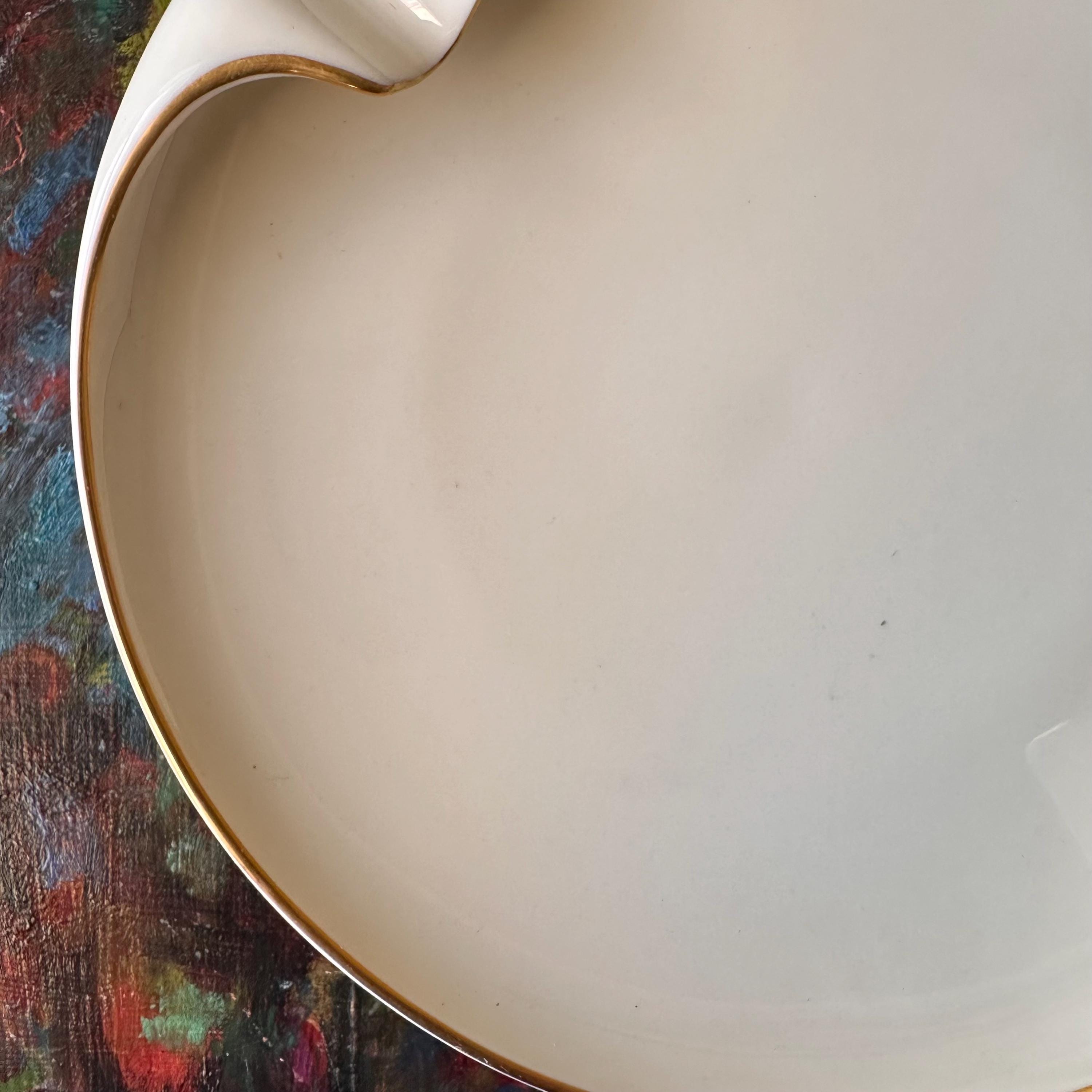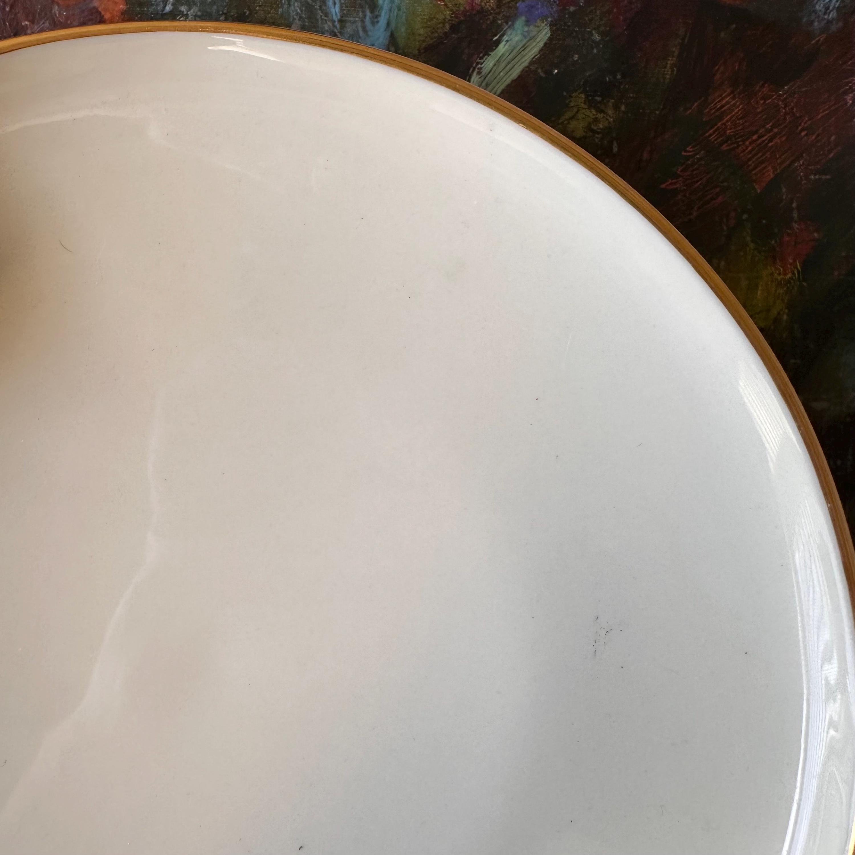 The ashtray is in excellent vintage condition for its age and use. The white ceramic has yellowed very slightly. The gold rim is intact with minimal wear. There are no chips or cracks. There is one red paint dot on the bottom of the ashtray.