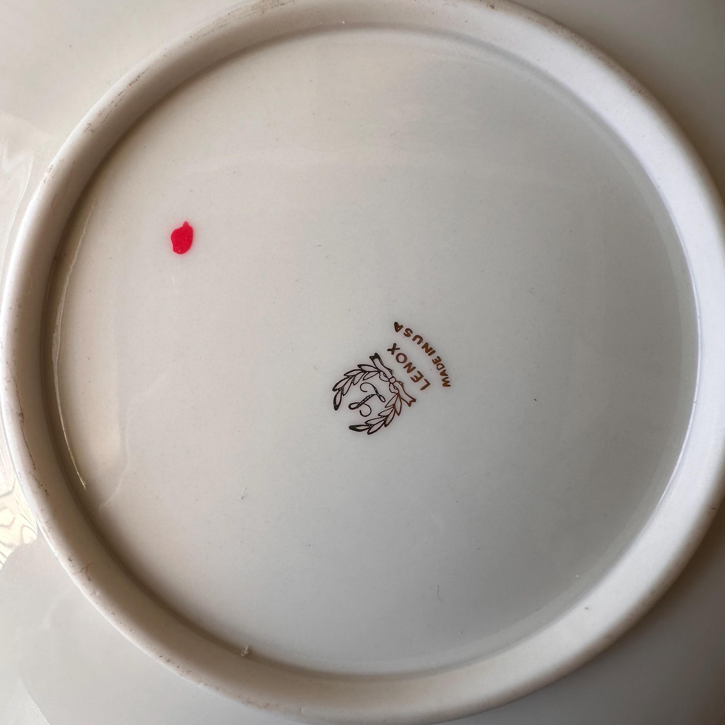This is a midcentury Lenox Mansfield ashtray. The ashtray is a round, minimalist style with two sides folded in to create trays for the cigarettes. The ashtray is made from white bone china and has a 24 karat gold rim. The bottom is marked with the Lenox logo in gold.