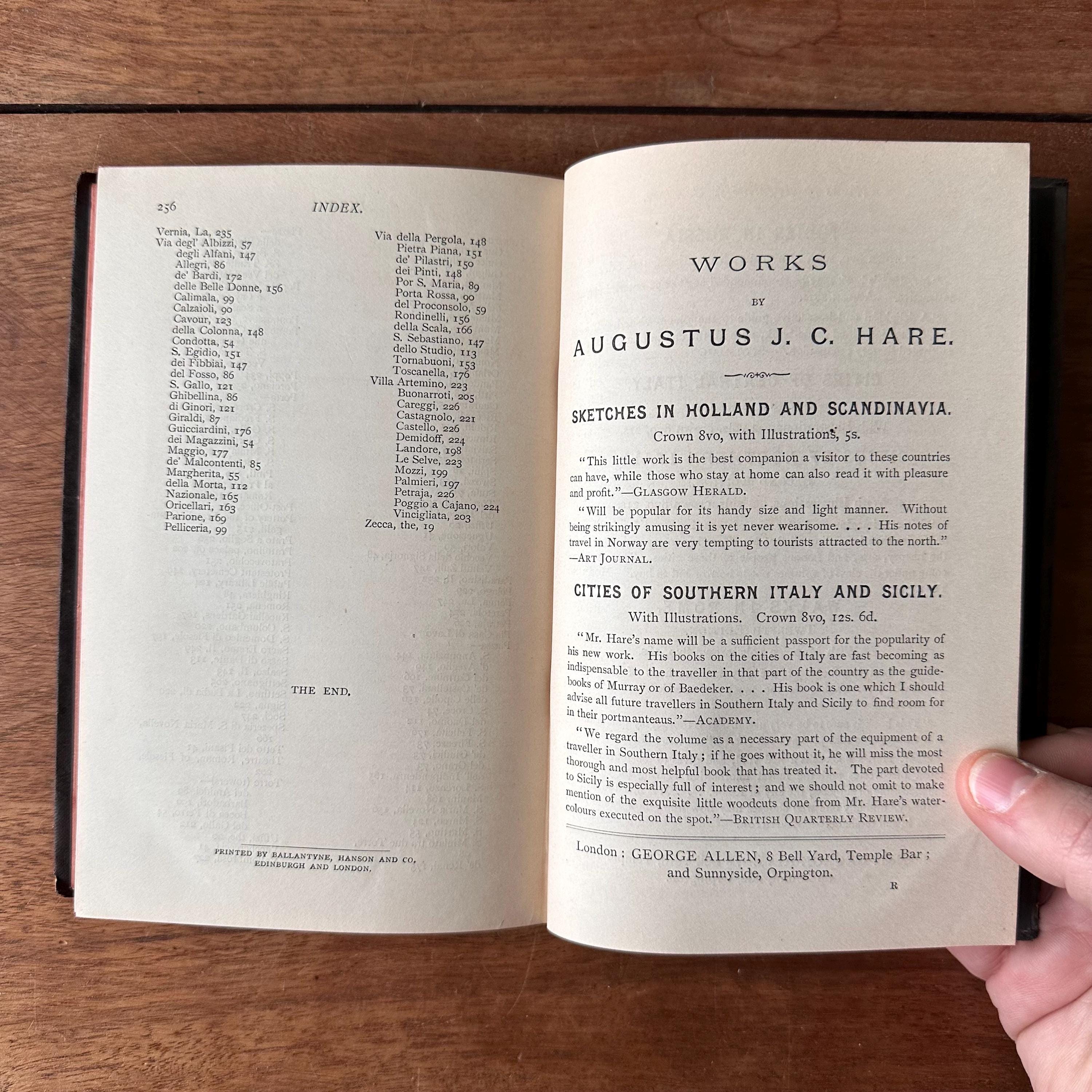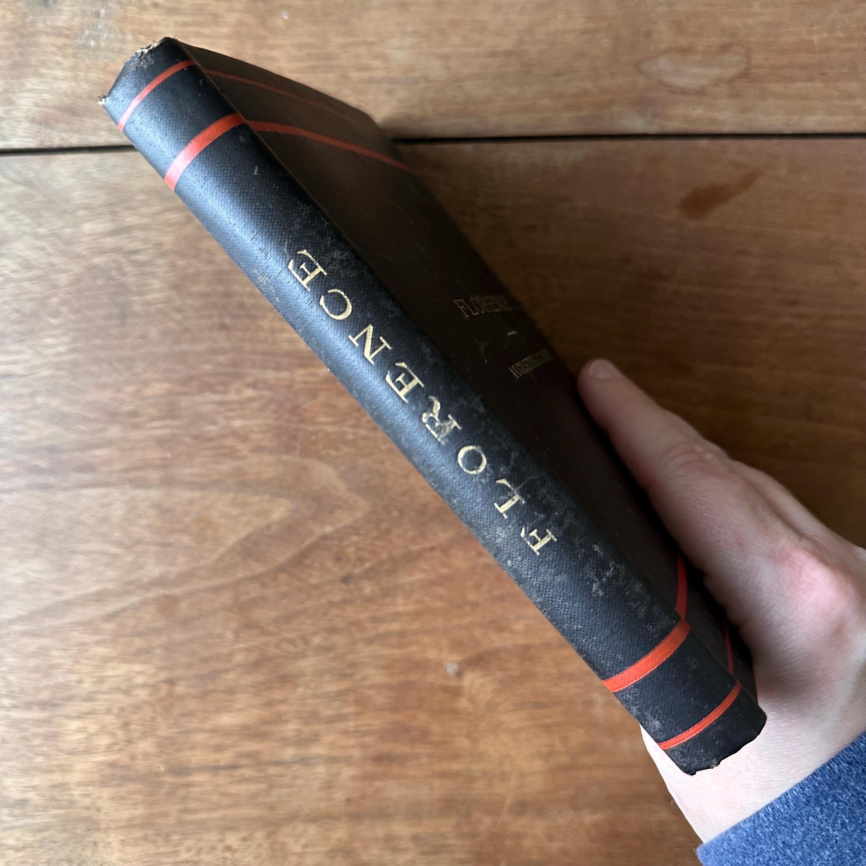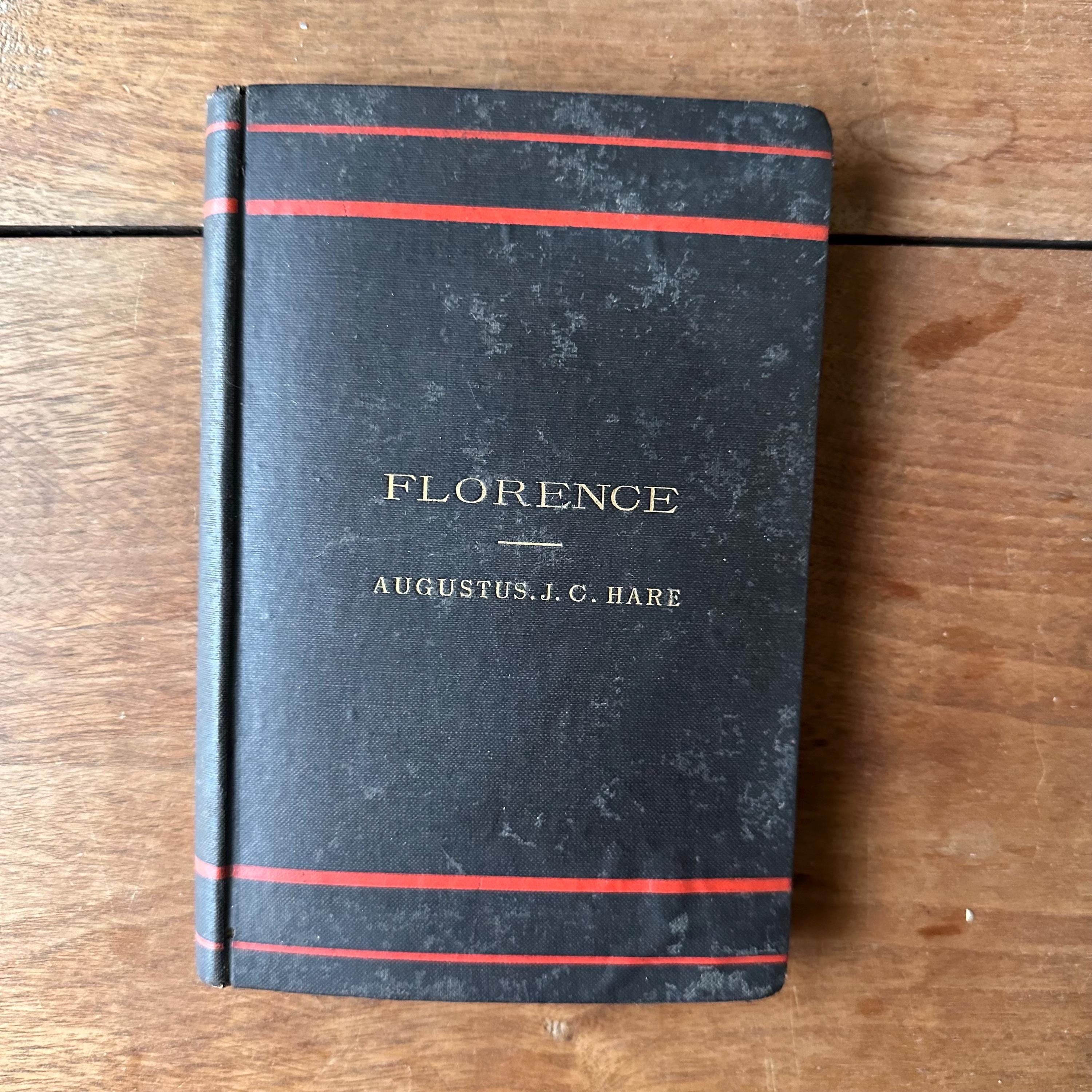 This is the antique 1890 edition of Florence by Augustus J.C. Hare, published by George Allen and sold at an original price of three shillings, according to the title page. This antique travel guide has black covers with horizontal red stripes along top and bottom. The cover and spine are lettered in gold. The endpapers are black and the page ends are red. The book is illustrated with black and white illustrations and there is one orange-tone map of the city. There are 236 pages as well as 6 advertisement pages at the end.