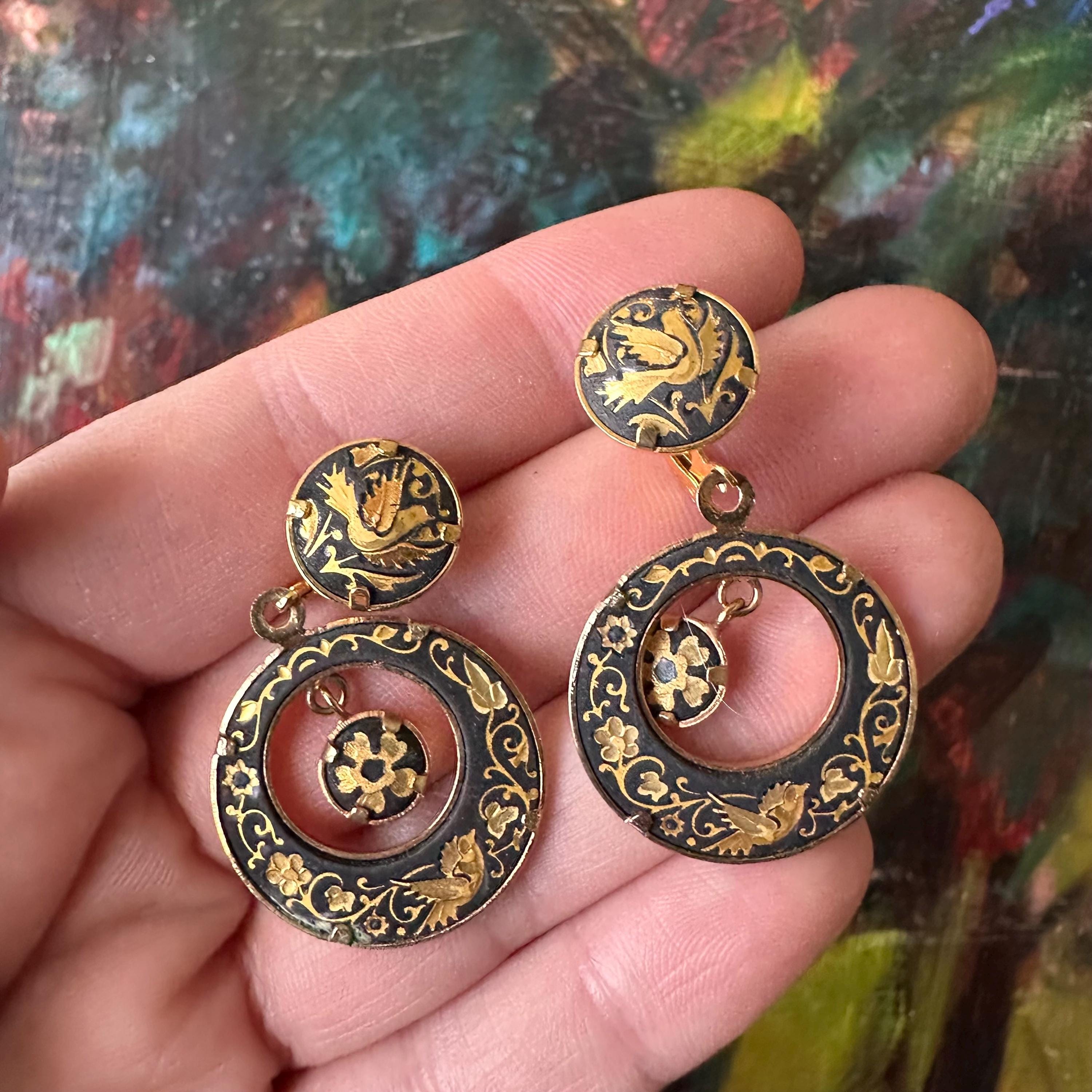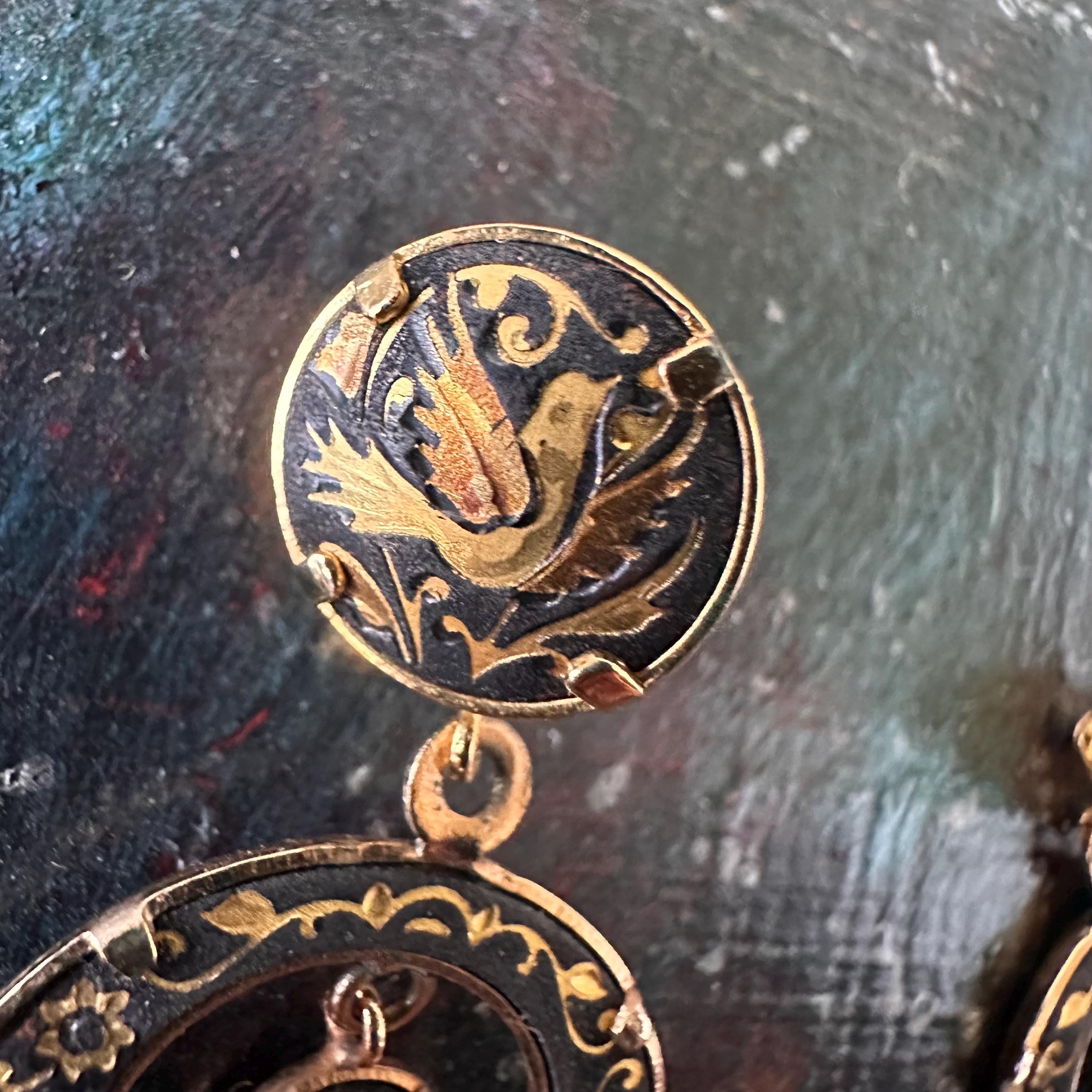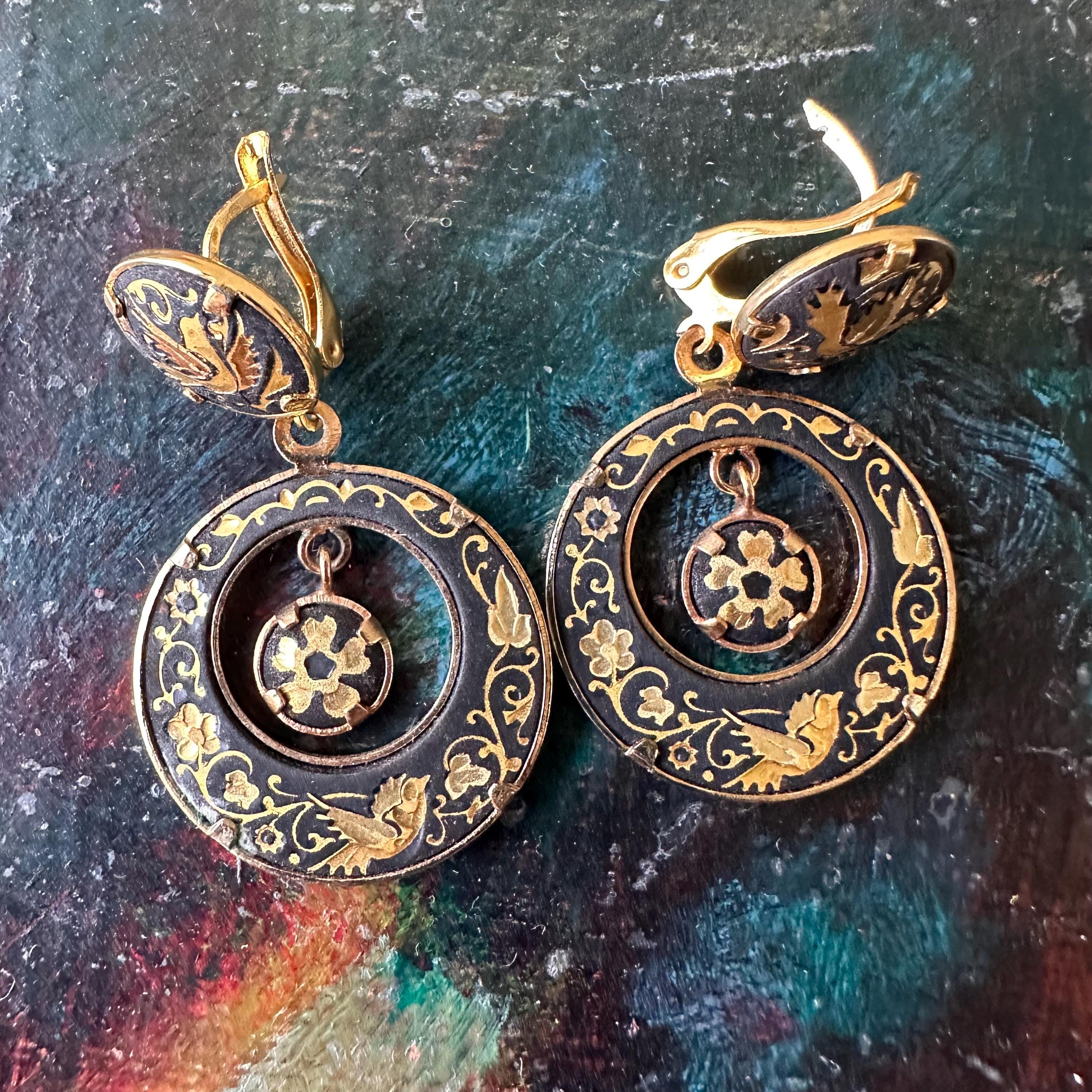This is a pair of vintage Damascene dangle earrings. Damascene jewelry is a way of making jewelry, usually in Toledo, Spain, where gold foil or gold wire is hammered into a dark steel background. These earrings have gold birds and gold flowers. They are made of a larger circle from which hangs a large hoop inside of which is a small circle. They have latch backs, and the backs of the earrings are plain gold metal.