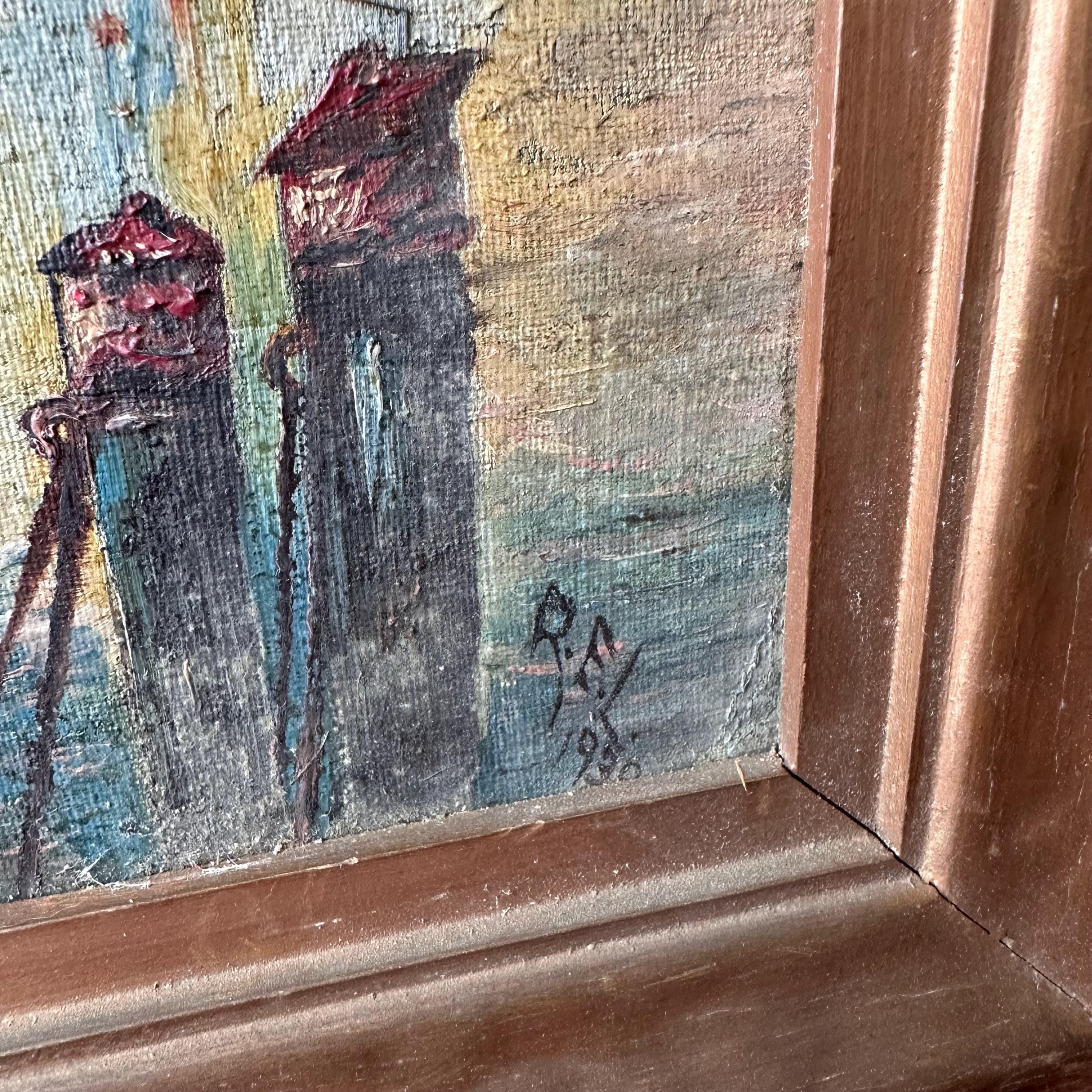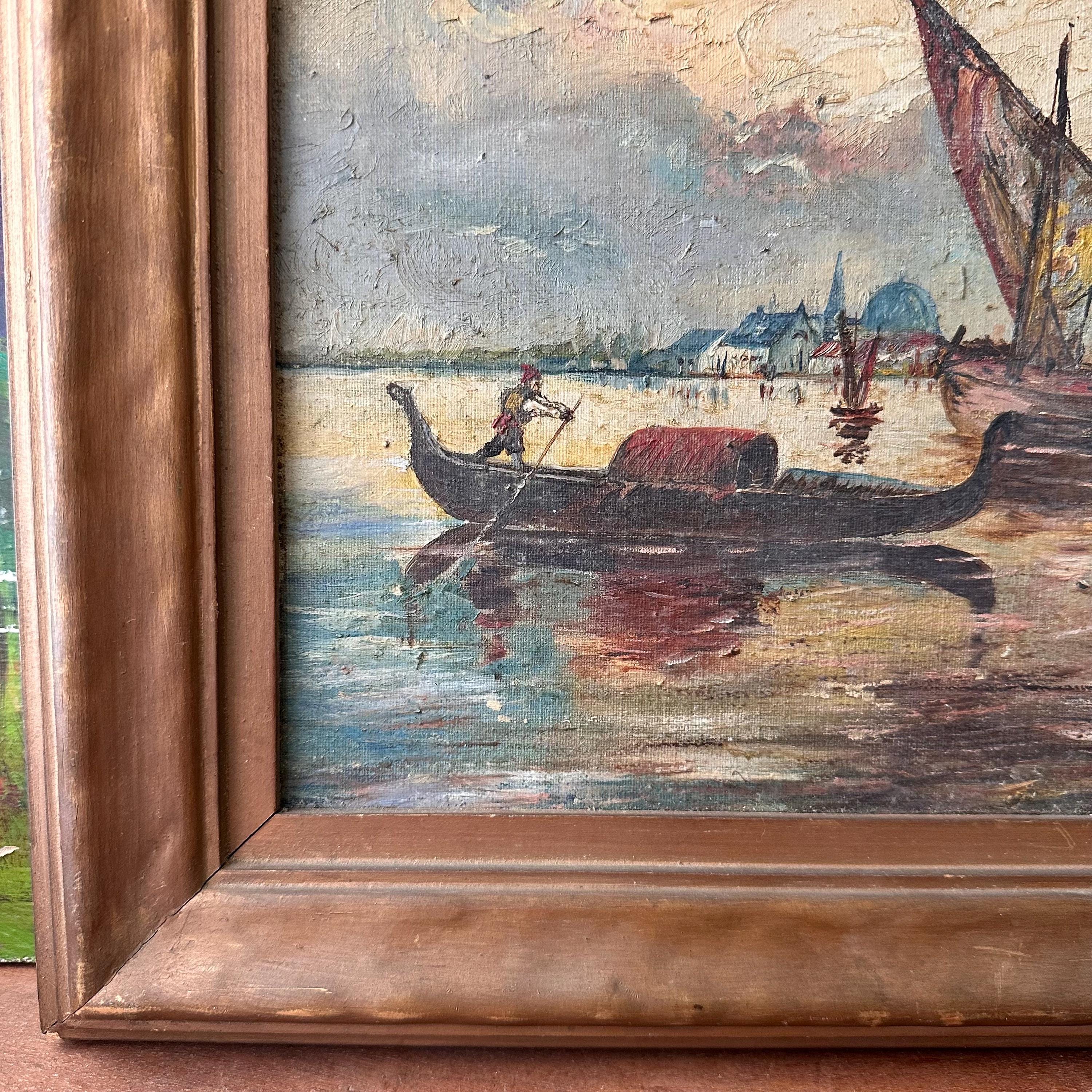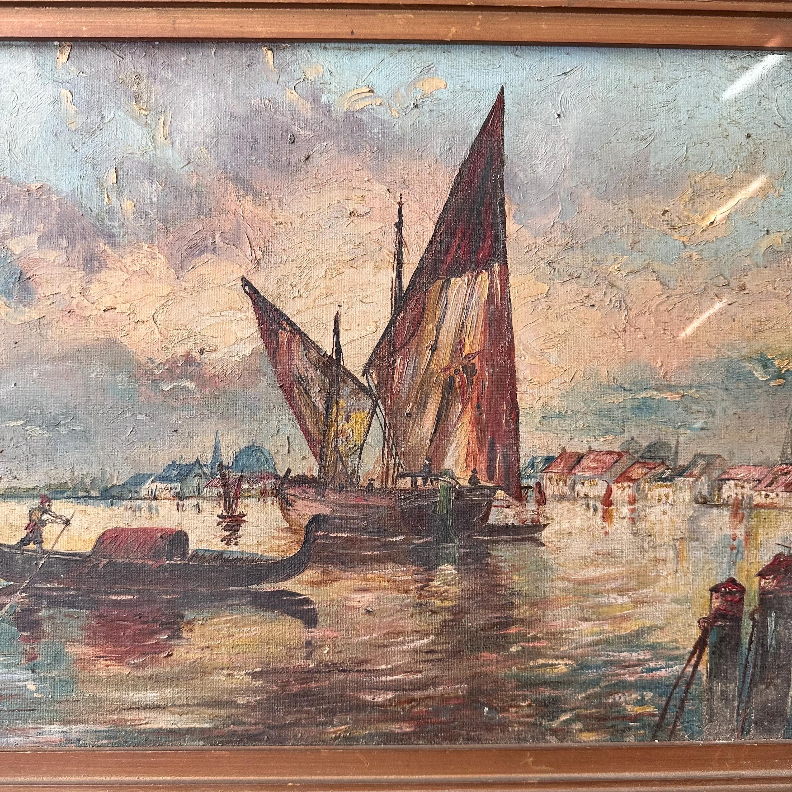 This is a signed and framed vintage oil seascape painting on board. The painting features a dramatic sailboat in the center with buoys and a gondola in the foreground. The background of the painting shows small houses and harbor with the blue sky above. The sky has large puffy clouds. The painting is done is shades of blue, pink, red, purple, white, and brown. It is framed in a wood frame that has been painted gold. The painting has been signed R.E.L. and dated 1930 in the lower right corner. The back of the frame has picture wire to hang the painting.