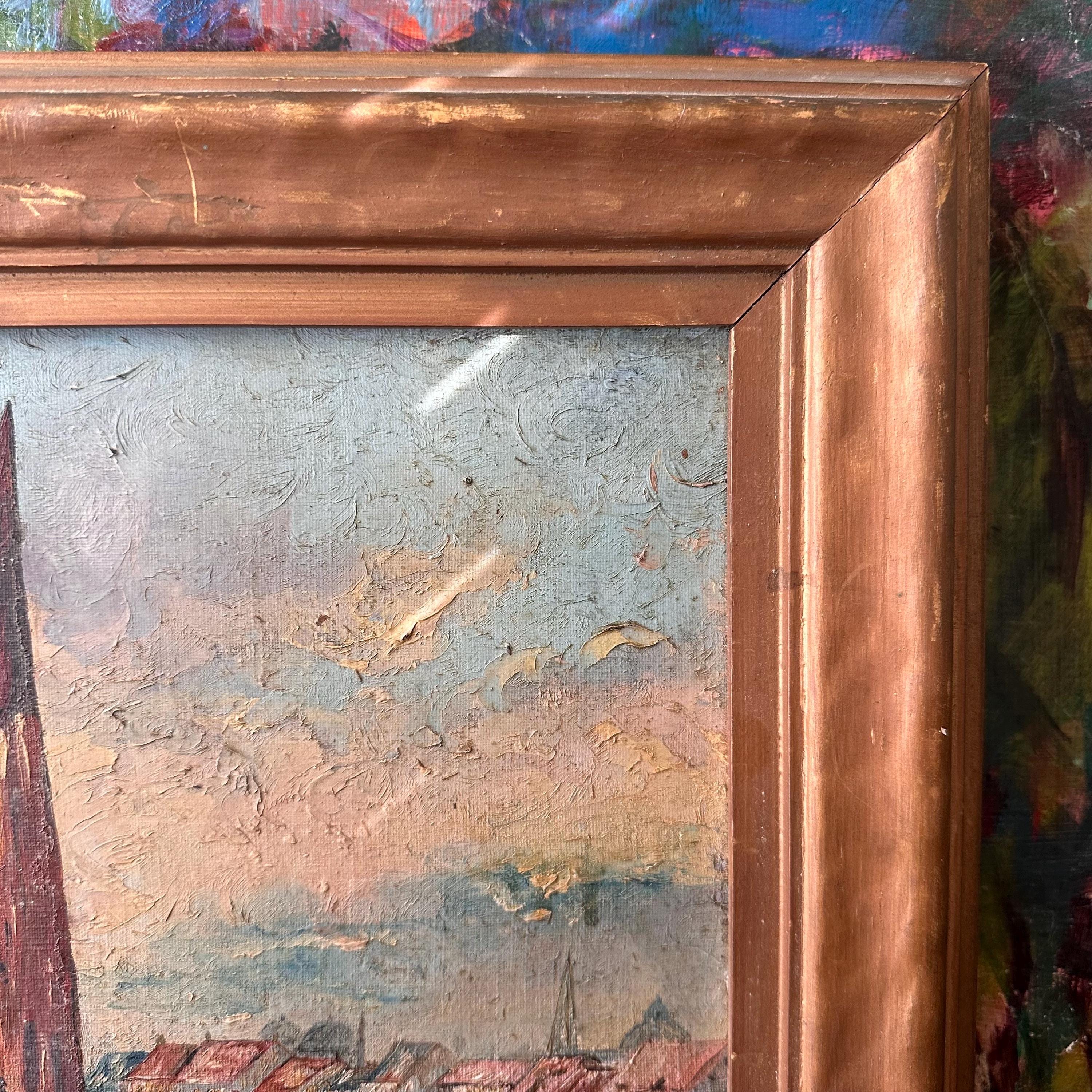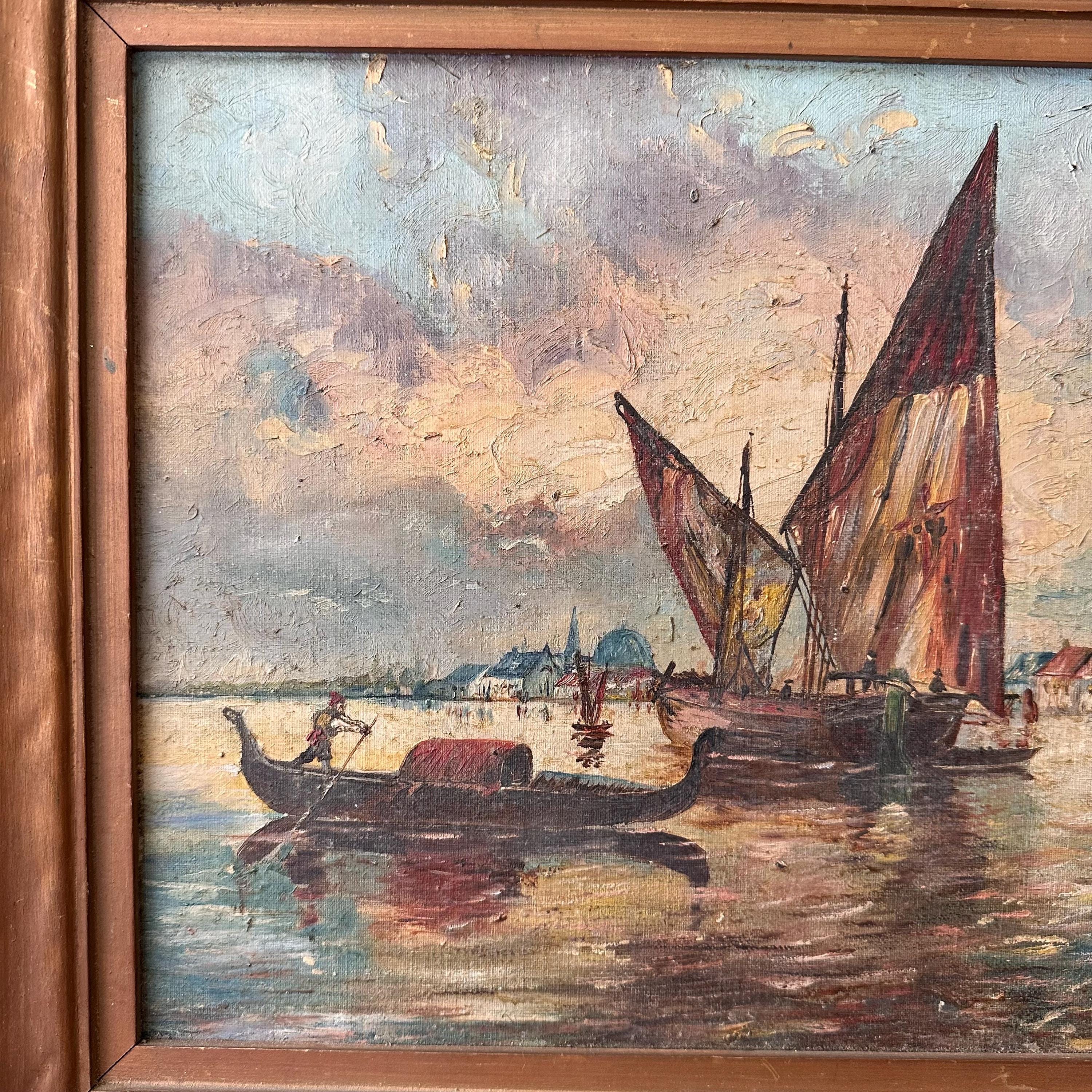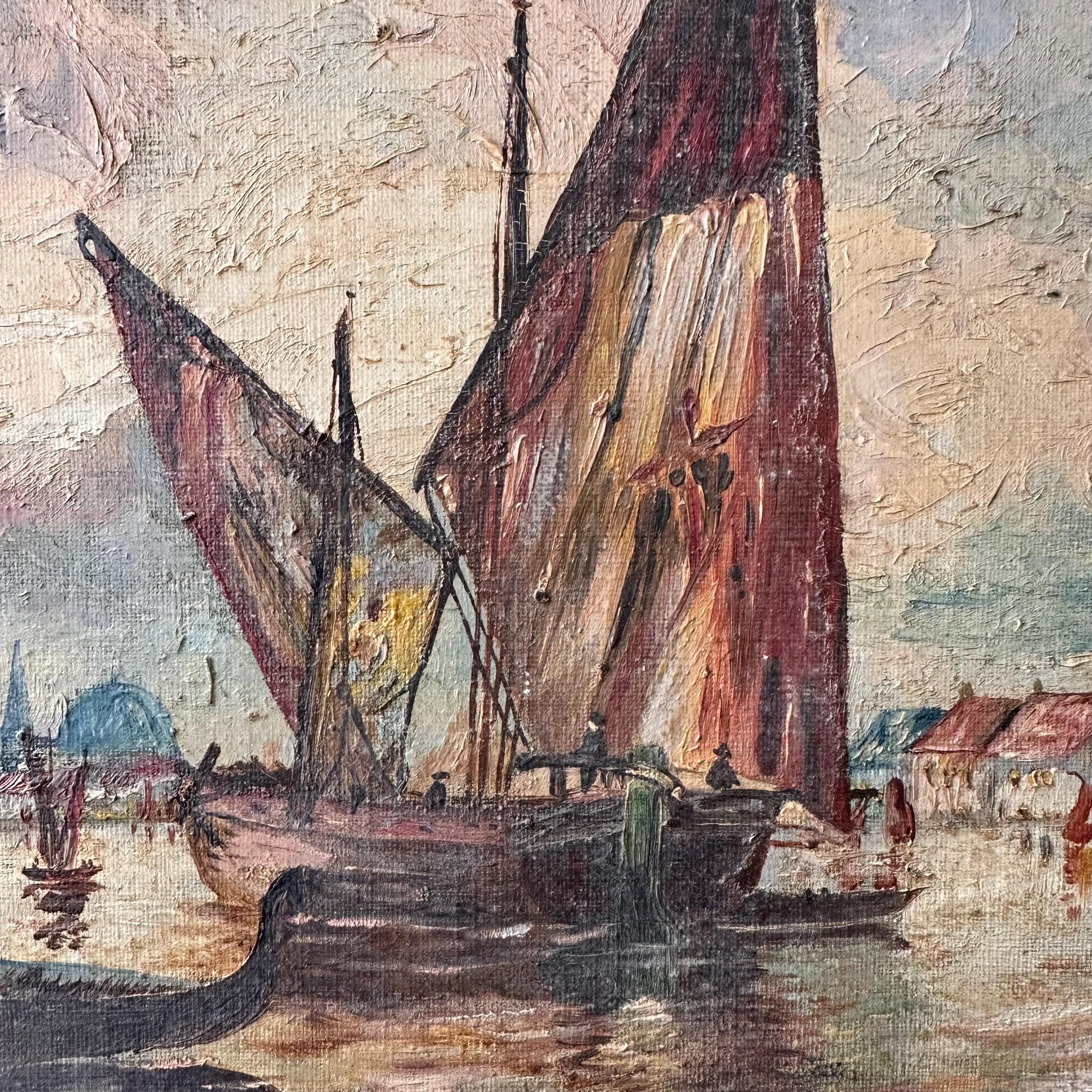 This is a signed and framed vintage oil seascape painting on board. The painting features a dramatic sailboat in the center with buoys and a gondola in the foreground. The background of the painting shows small houses and harbor with the blue sky above. The sky has large puffy clouds. The painting is done is shades of blue, pink, red, purple, white, and brown. It is framed in a wood frame that has been painted gold. The painting has been signed R.E.L. and dated 1930 in the lower right corner. The back of the frame has picture wire to hang the painting.