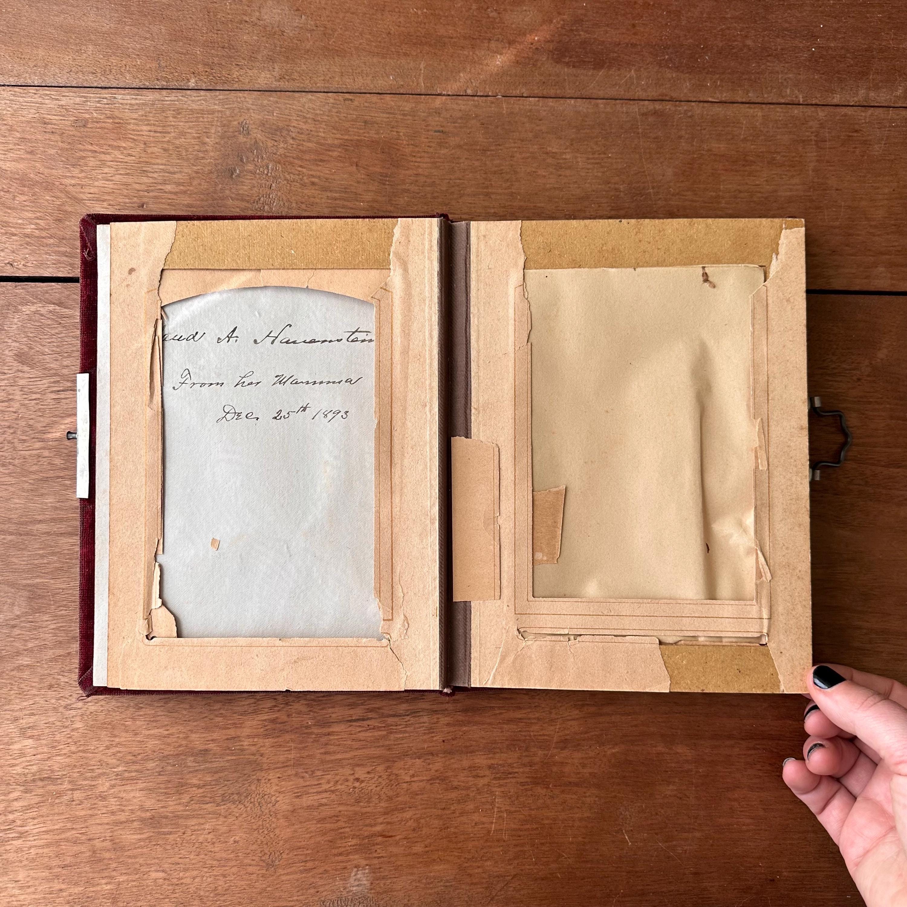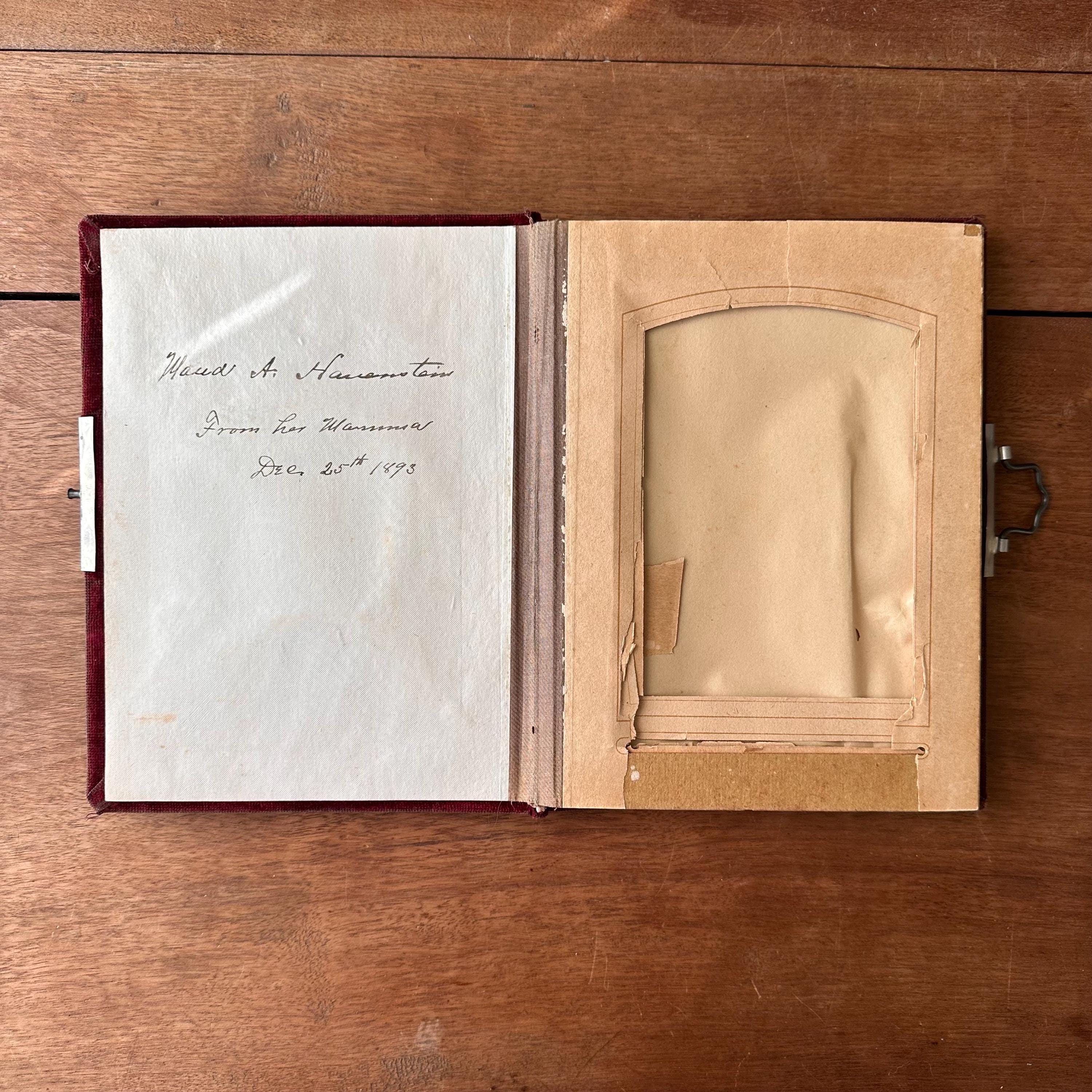 The album is in fair antique condition for its age and use. The velvet has faded and has discoloration with some staining. The corners are frayed exposing the wood underneath, and there is a small vertical tear along the bottom portion of the spine. The silver tin badge is still shiny. The gilt ends have large tarnish spots and discoloration. The pages inside have fading and foxing with tears to the edges of the openings and slits with some portions missing or torn away. There is an ink inscription inside the front cover, "Maud A. Hammenstein (?) from her Mamma Dec. 25th 1893". Please see photos!