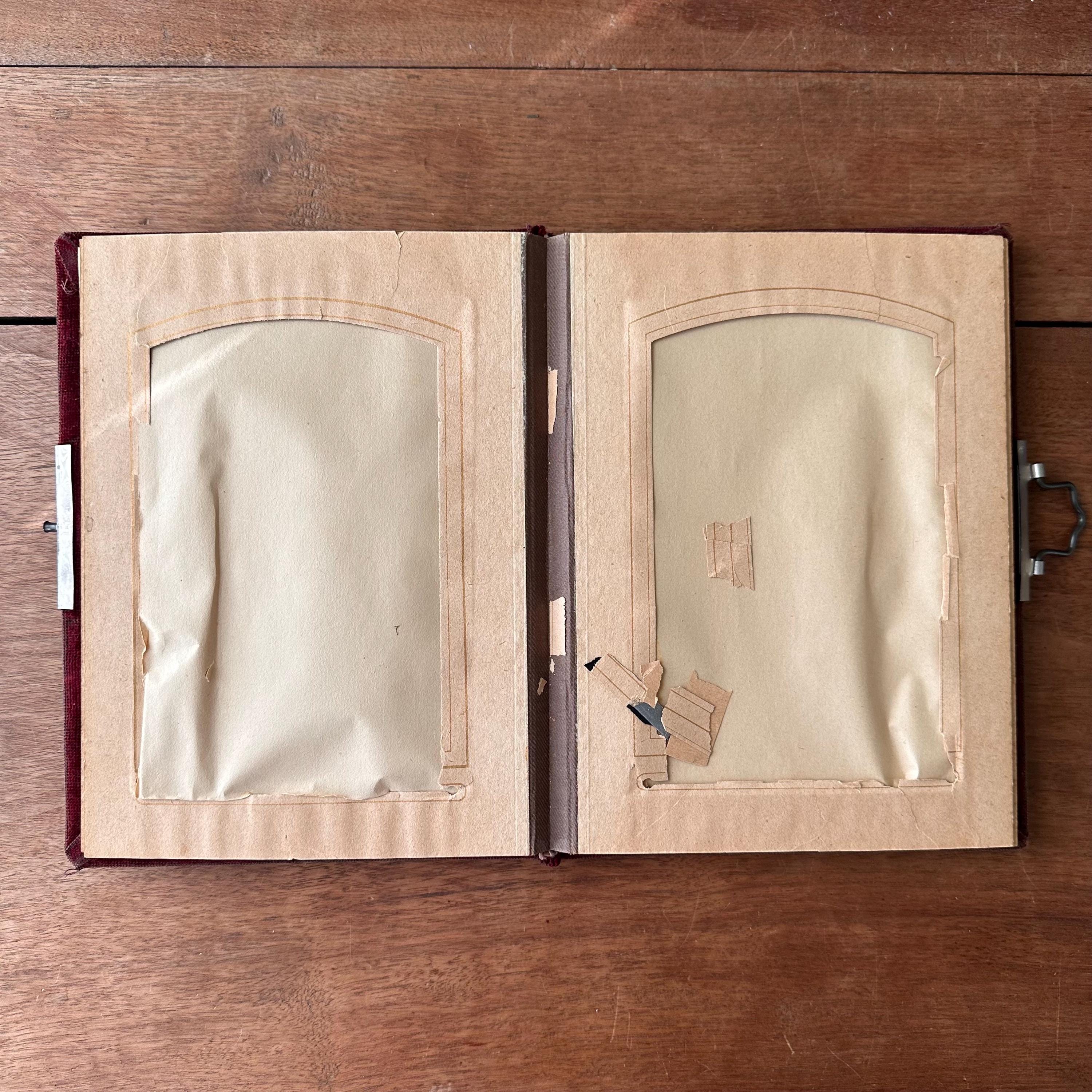 This is a Victorian style velvet cover photo album. The album has wood covers front and back that are covered in red velvet. The pages have gilt edges. The album has silver metal for the closure mechanism and a silver tin badge on the front. The inside pages are thick to accommodate large cabinet cards with one opening per page. The last 2 pages are divided into 2 small photograph openings. Each of the openings - big or small - have curved top edges and gold borders.