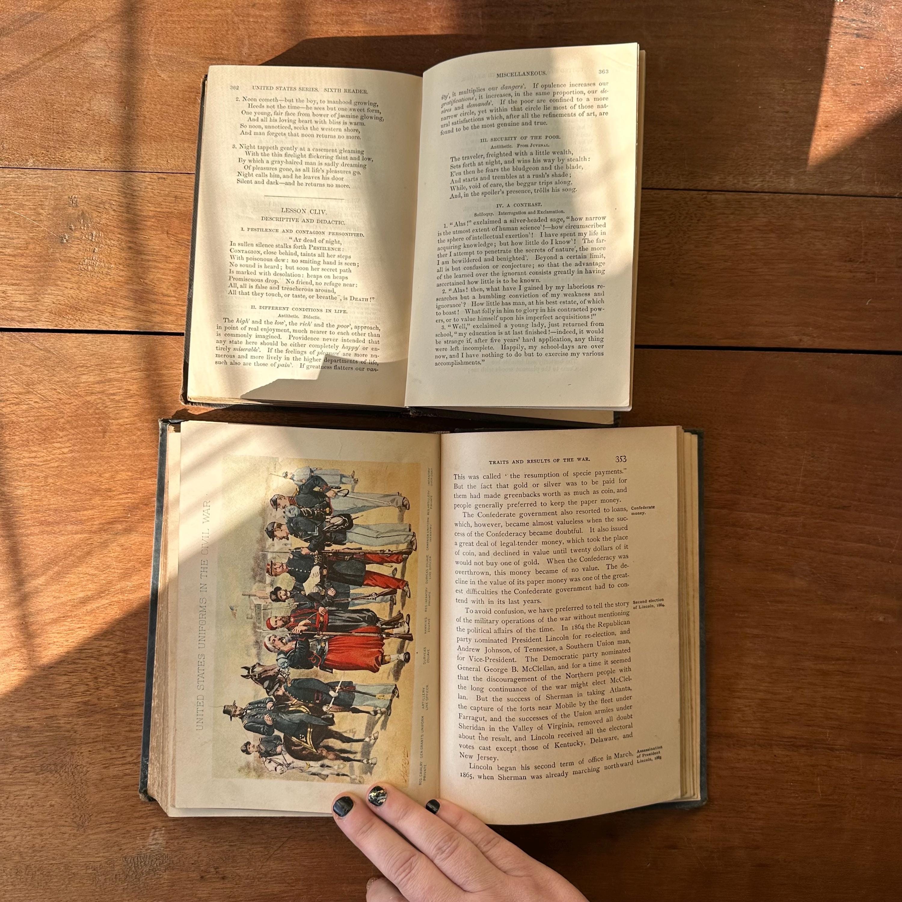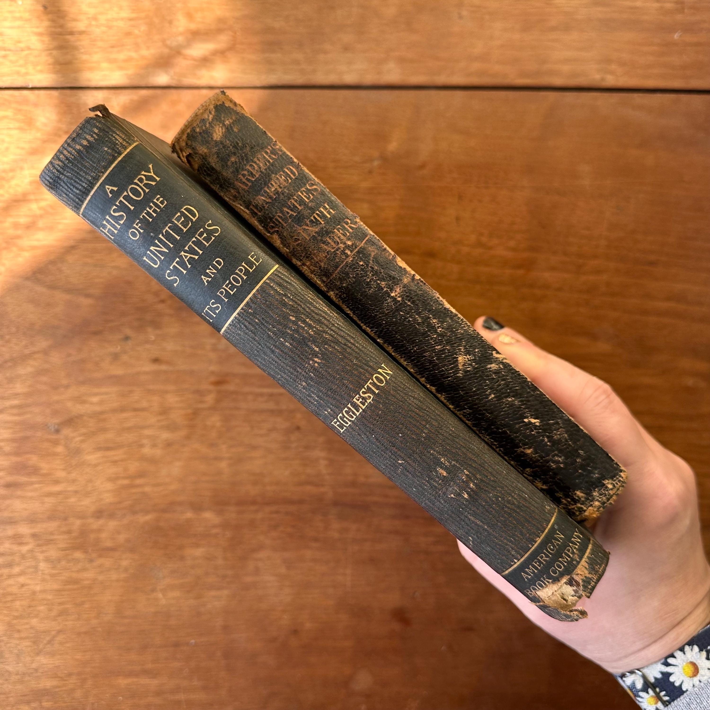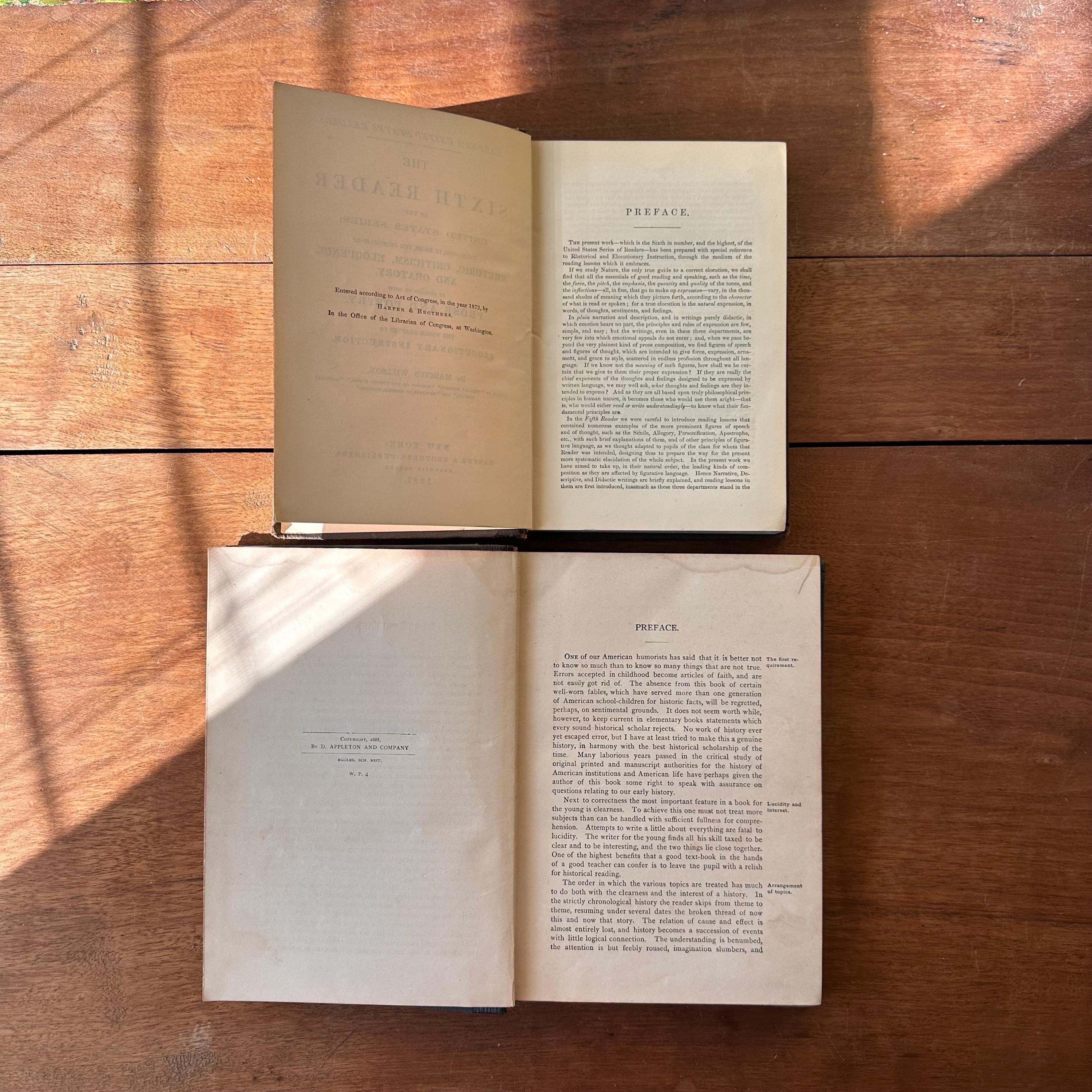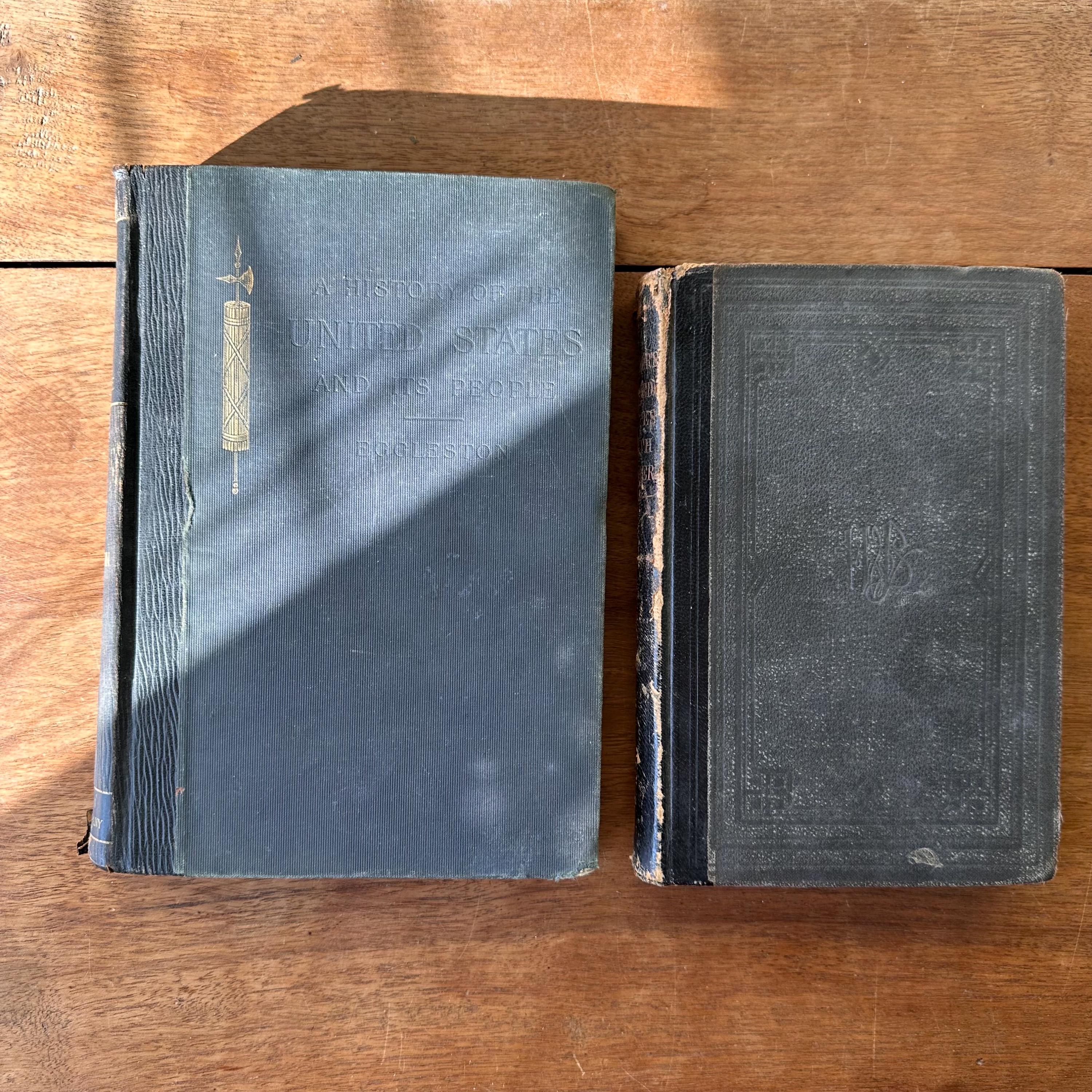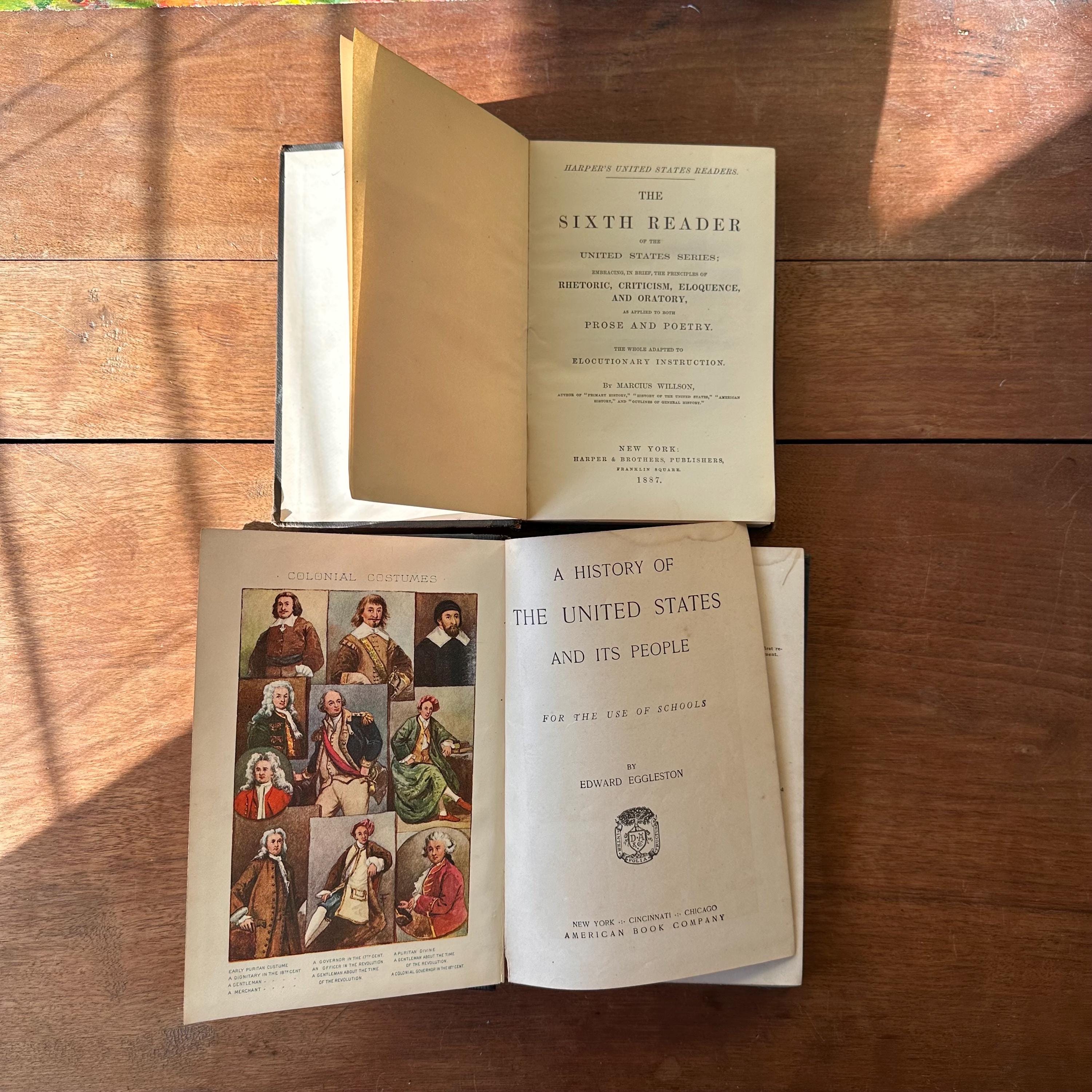 This is a set of two antique schoolbooks with black covers and gold lettering. The set includes the 1887 edition of Harper's United States Sixth Reader published by Harper & Brothers. It also includes the 1888 edition of A History of the United States and Its People by Edward Eggleston, published by D. Appleton and Company. Both books leather spines and embossed covers. A History also has a gold illustration on the cover. Harper's has marbled end pages and A History has full color maps for its endpapers. Both are illustrated.