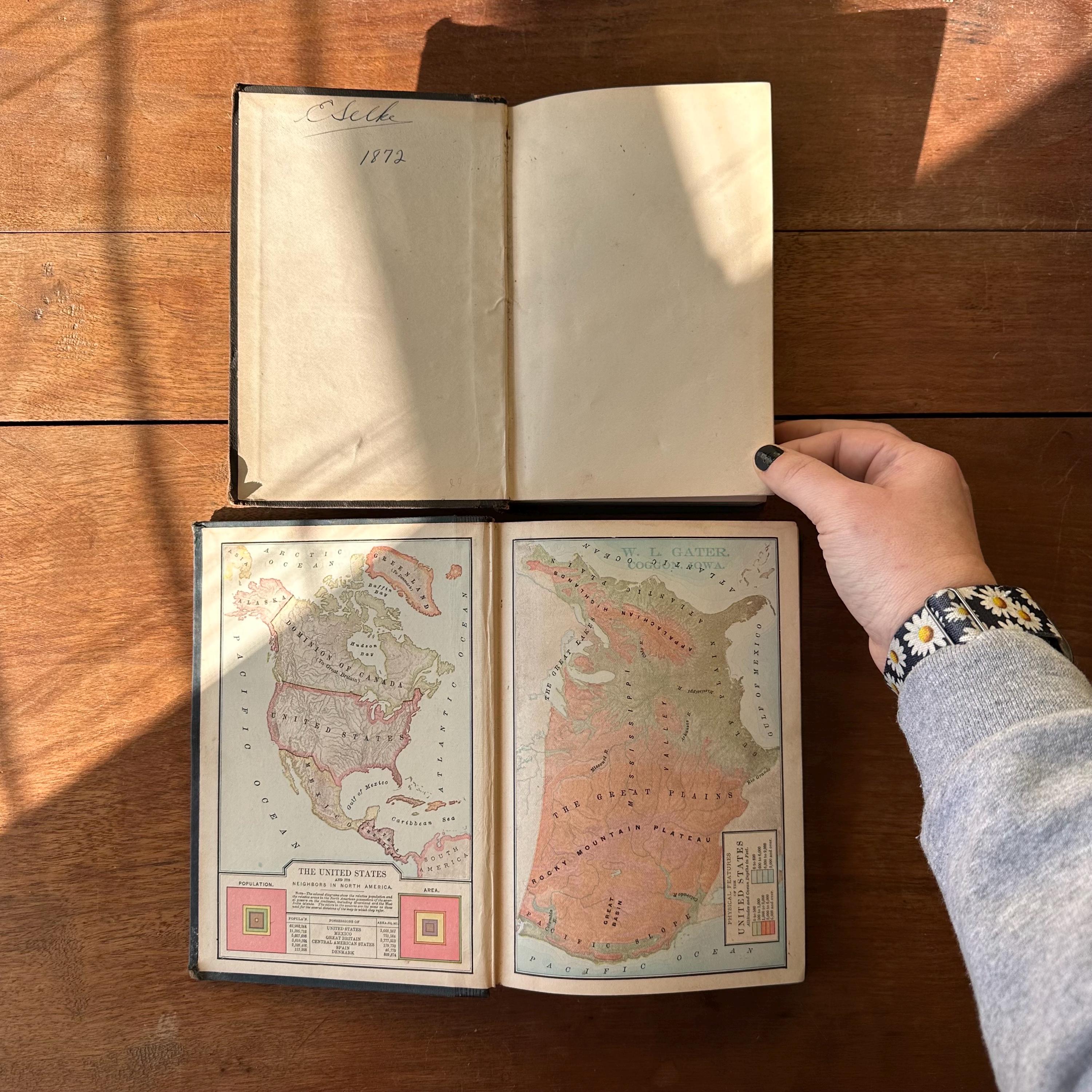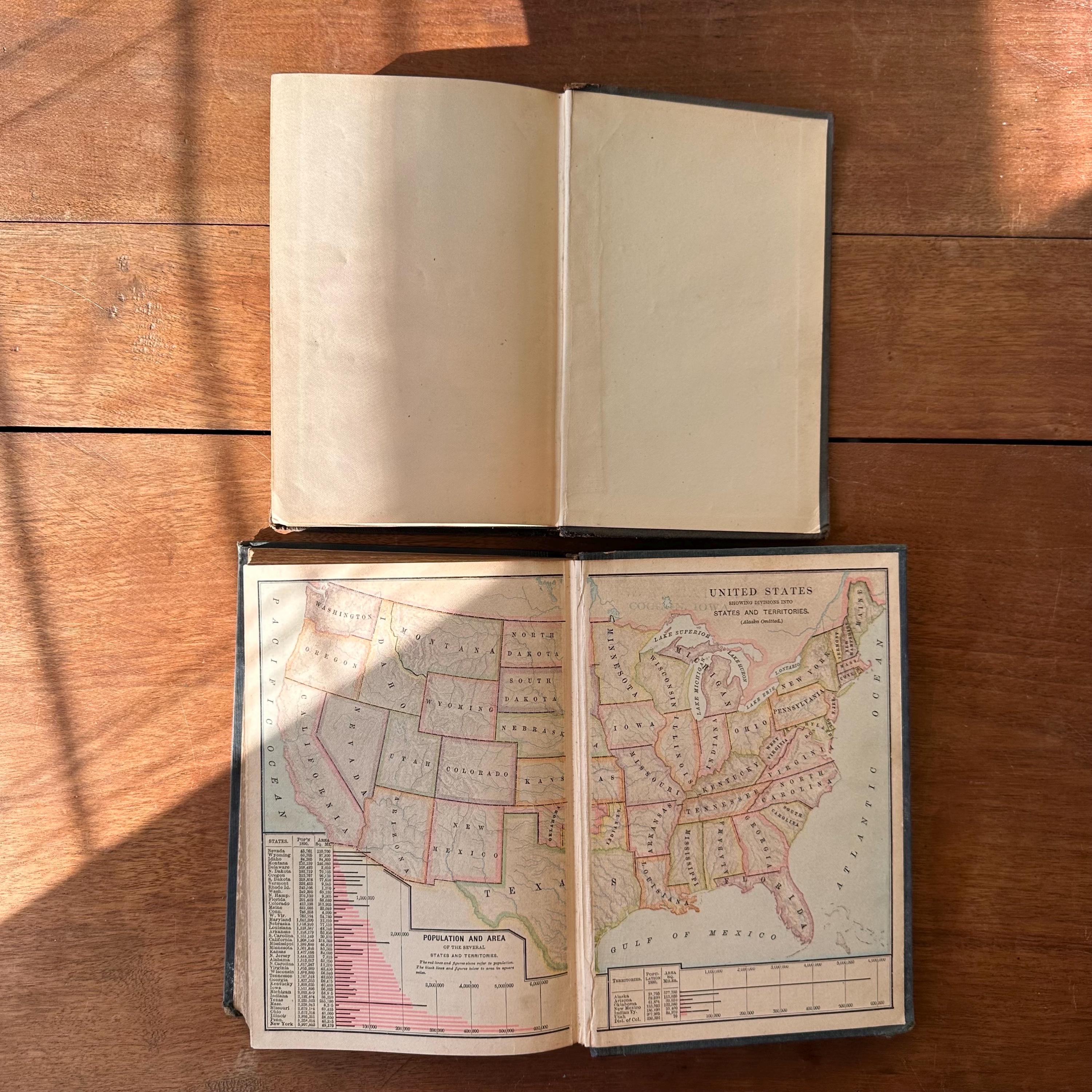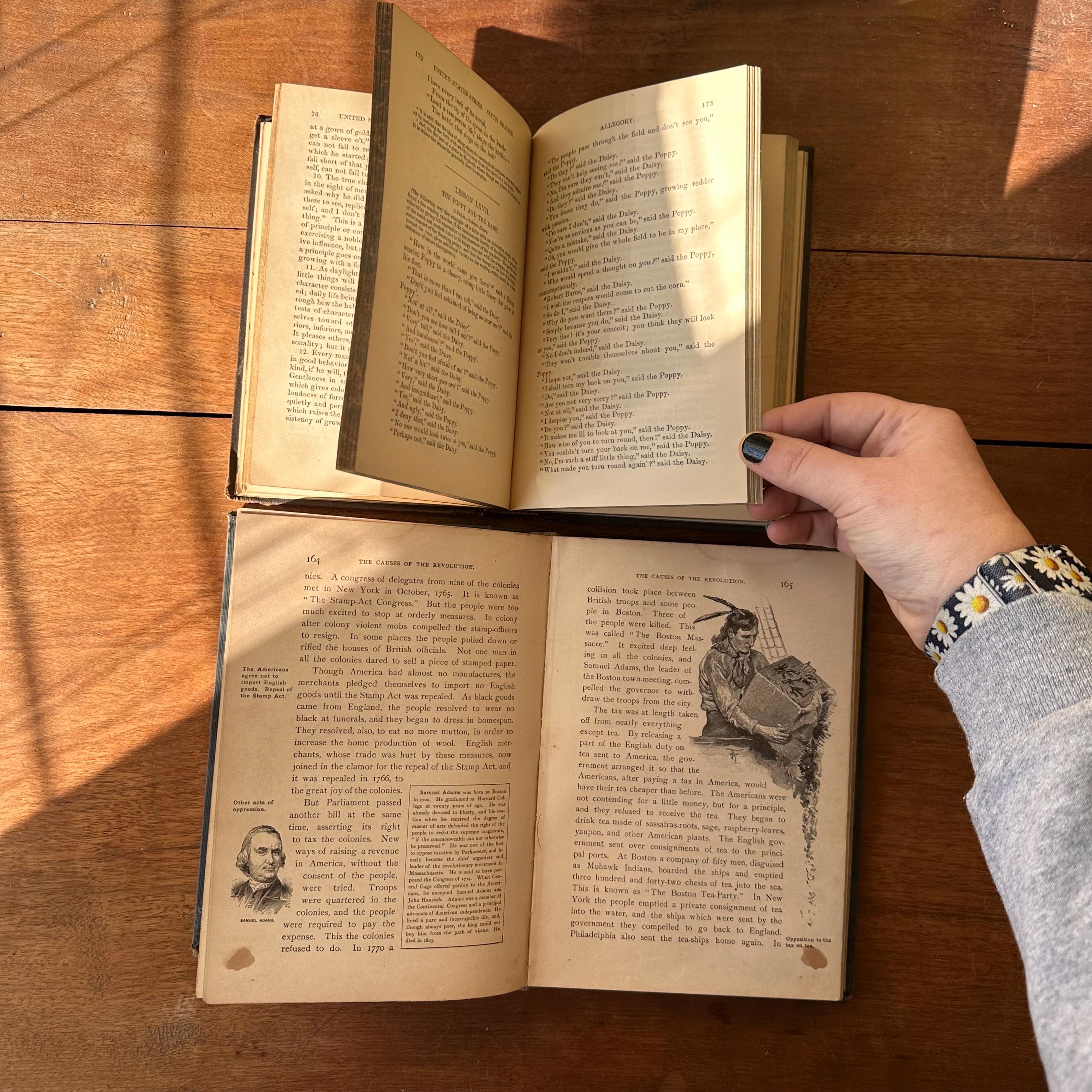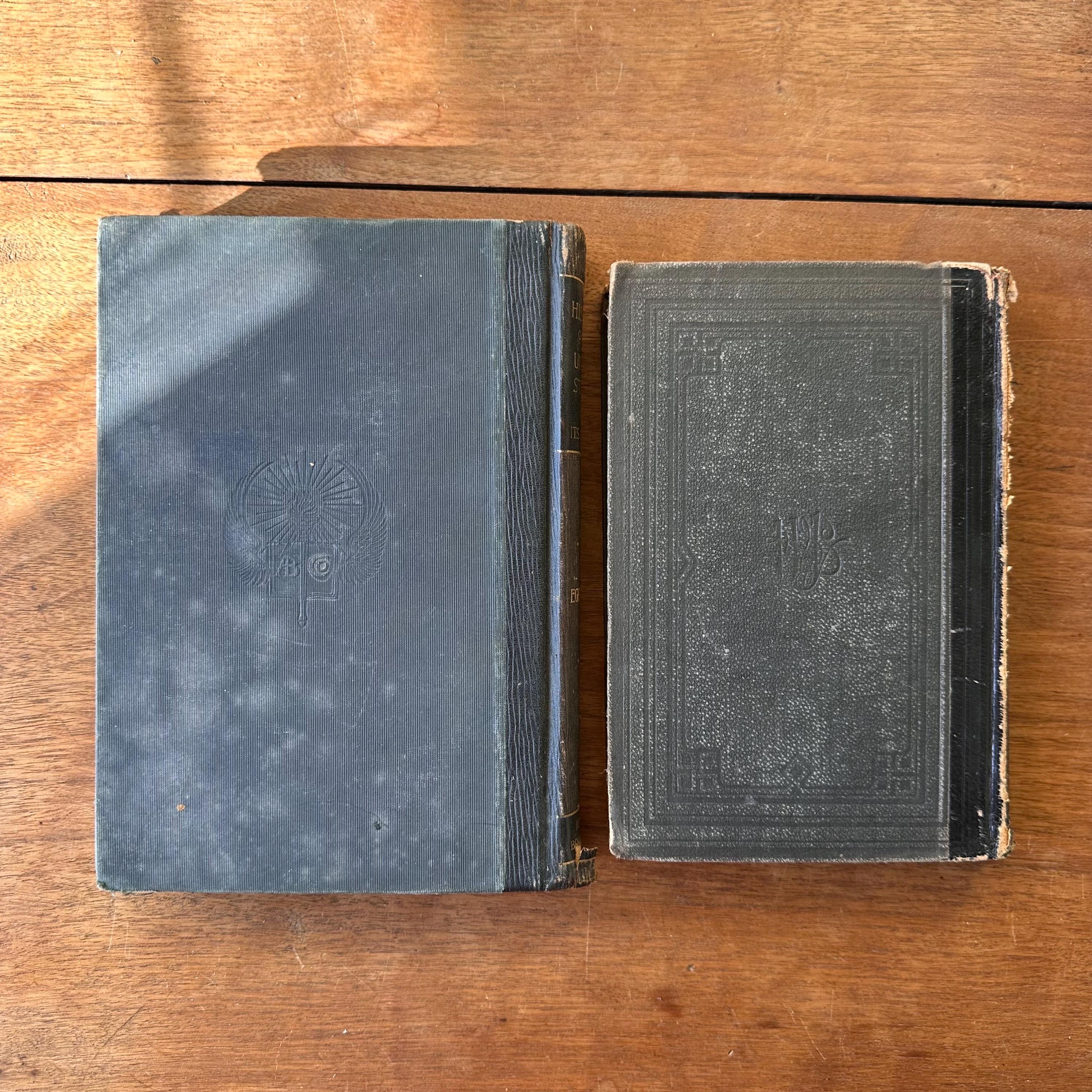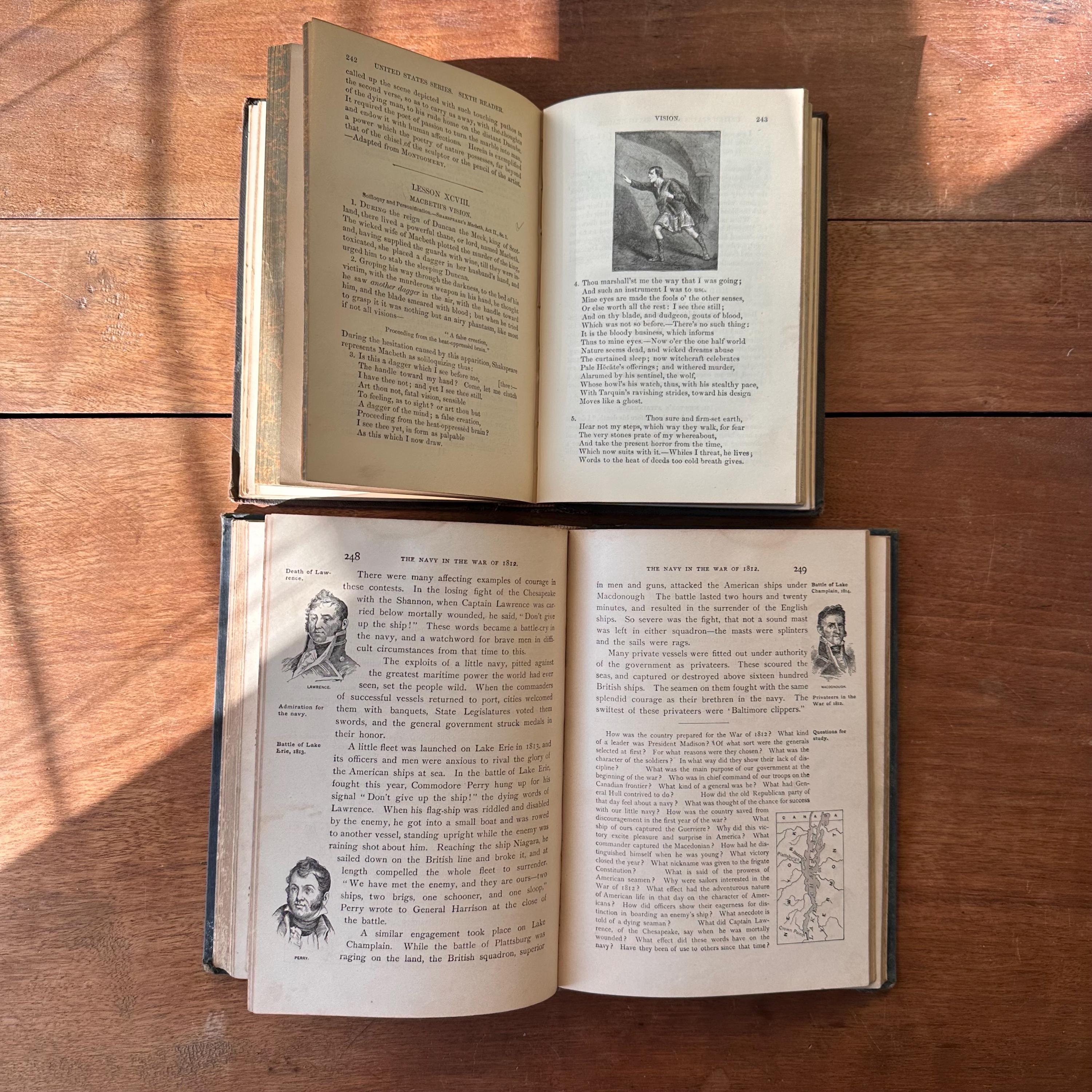 This is a set of two antique schoolbooks with black covers and gold lettering. The set includes the 1887 edition of Harper's United States Sixth Reader published by Harper & Brothers. It also includes the 1888 edition of A History of the United States and Its People by Edward Eggleston, published by D. Appleton and Company. Both books leather spines and embossed covers. A History also has a gold illustration on the cover. Harper's has marbled end pages and A History has full color maps for its endpapers. Both are illustrated.