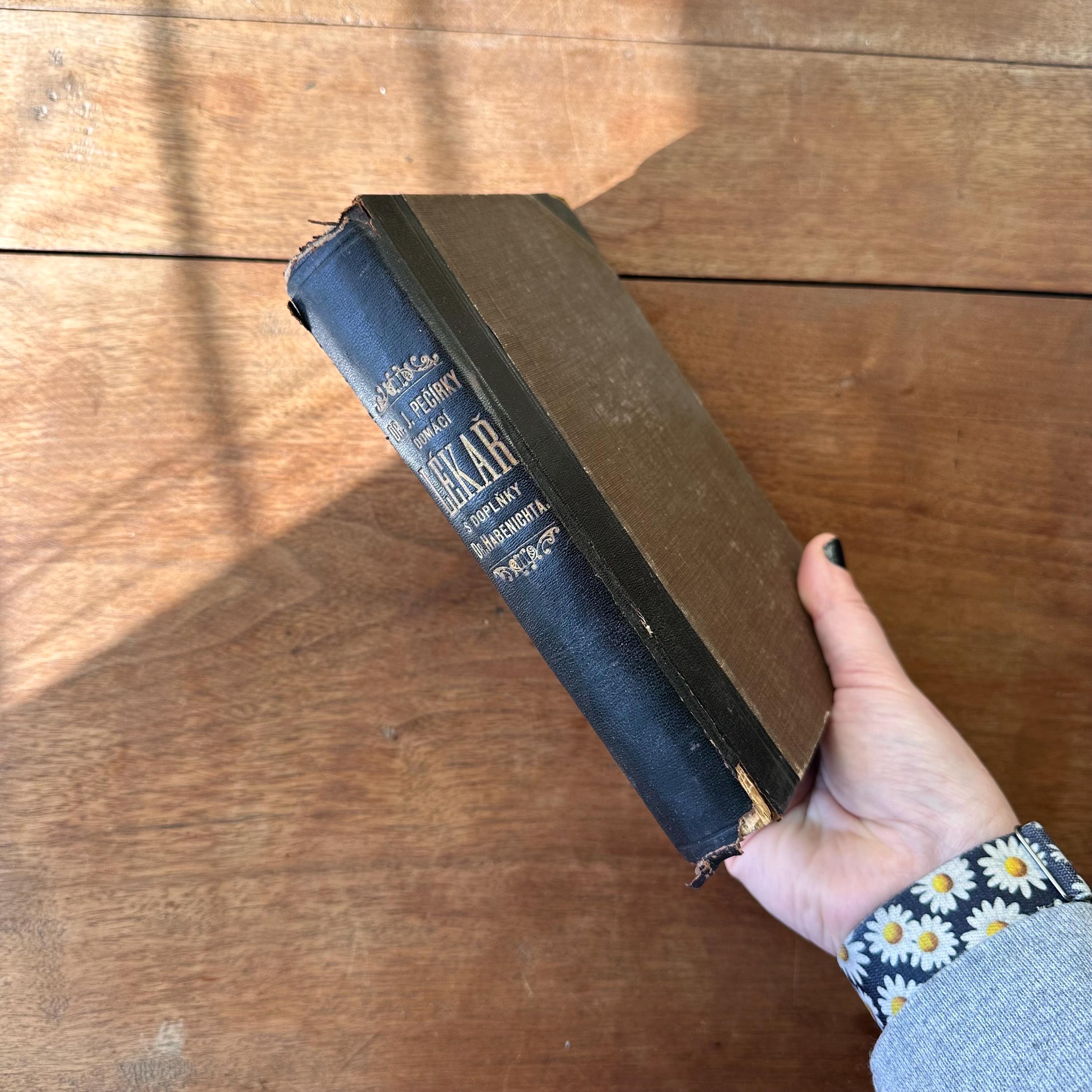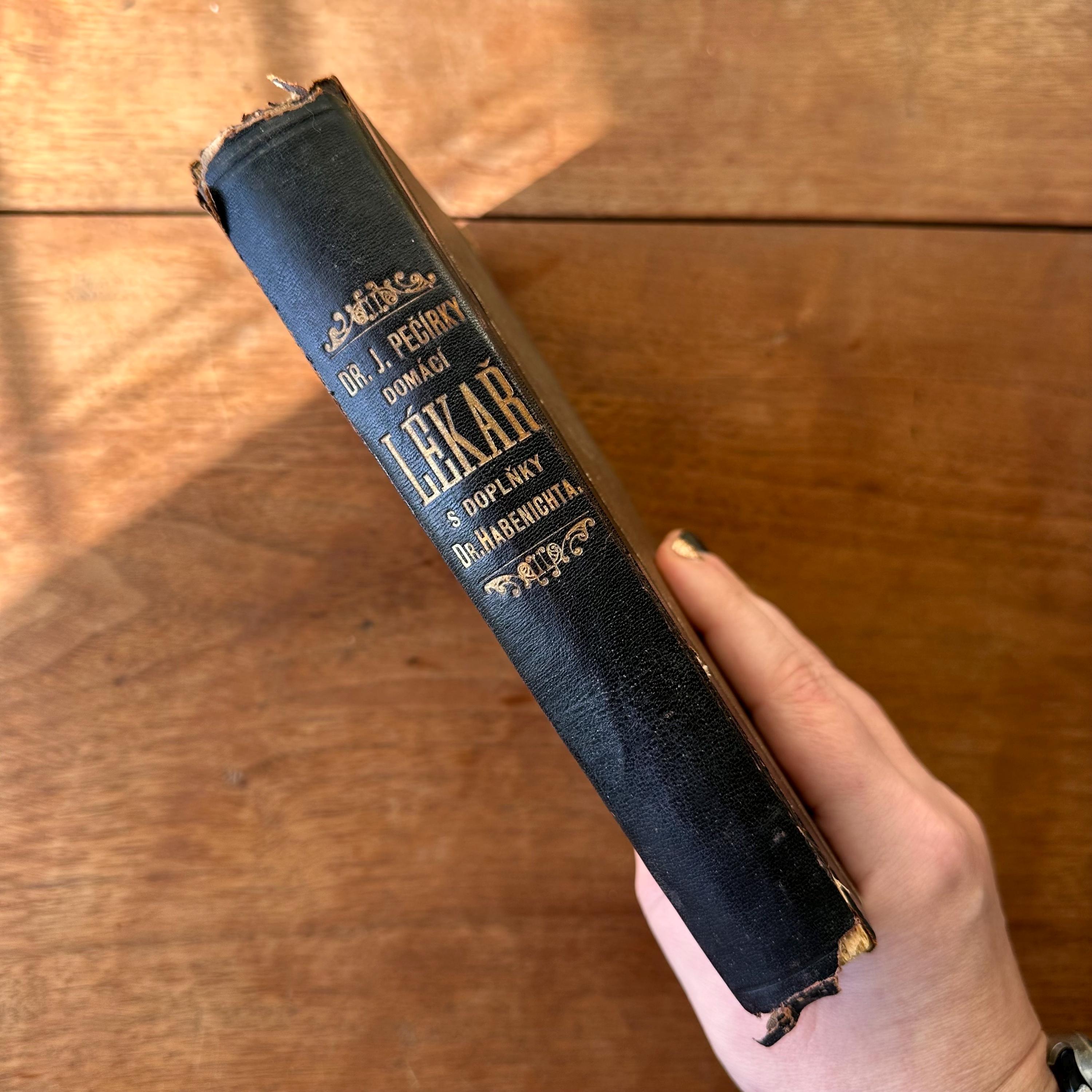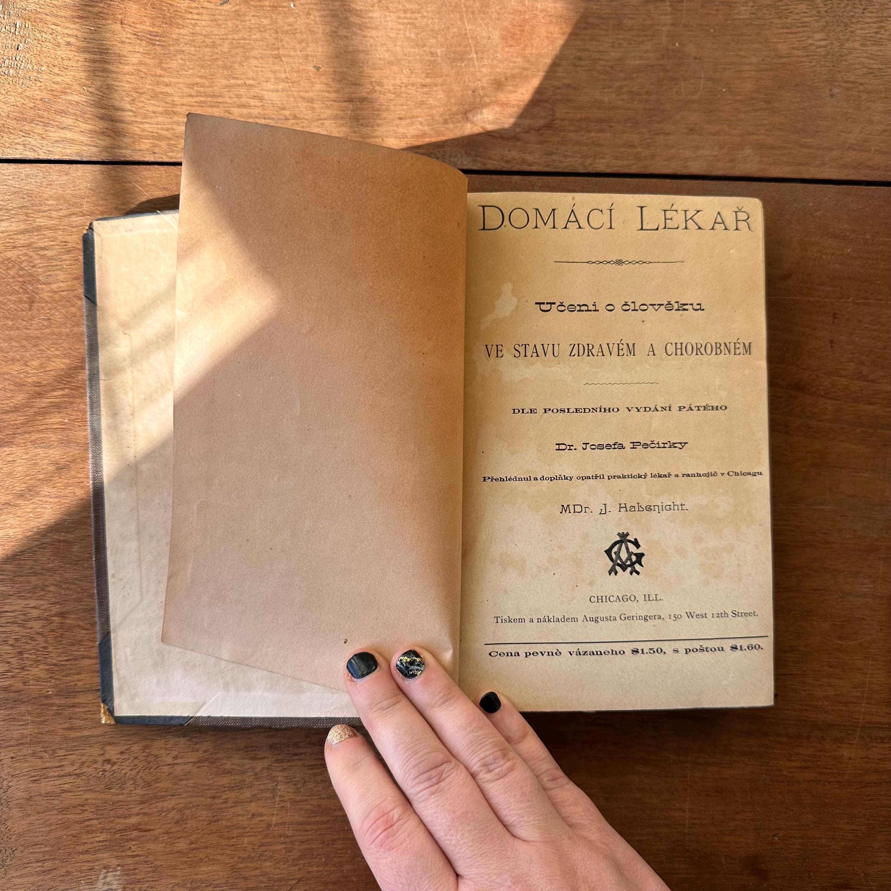 This is an antique 1890 edition of the Czech language Home Physician book by Dr. J. Pecirky titled Domaci Lekar and published by Augusta Geringera in Chicago, Illinois. It has brown linen covers with black leather corners and spine. The spine is lettered in gold. The page ends are marbled. The book is essentially a medical encyclopedia of symptoms and remedies written in Czech. There are 402 pages.