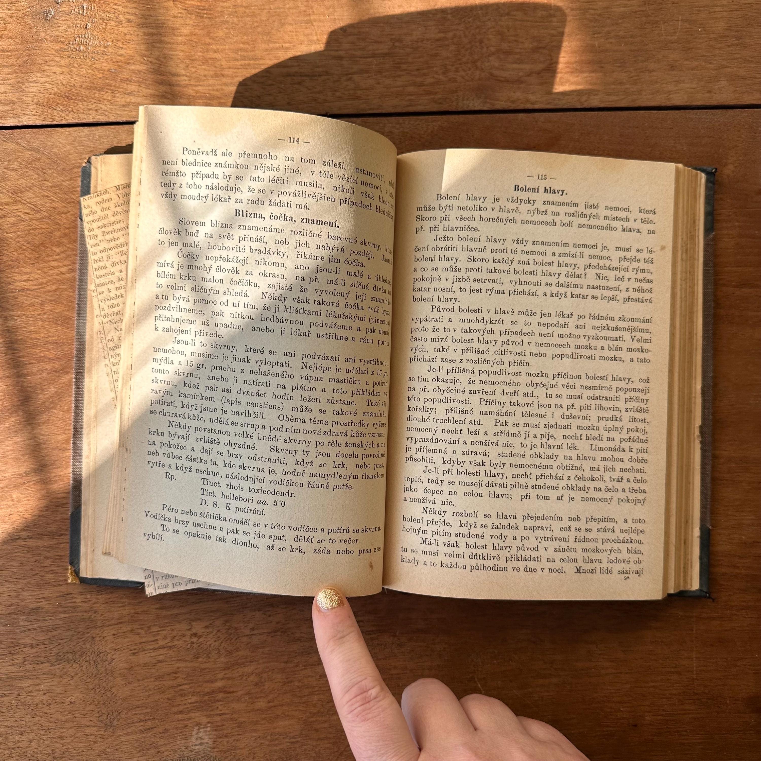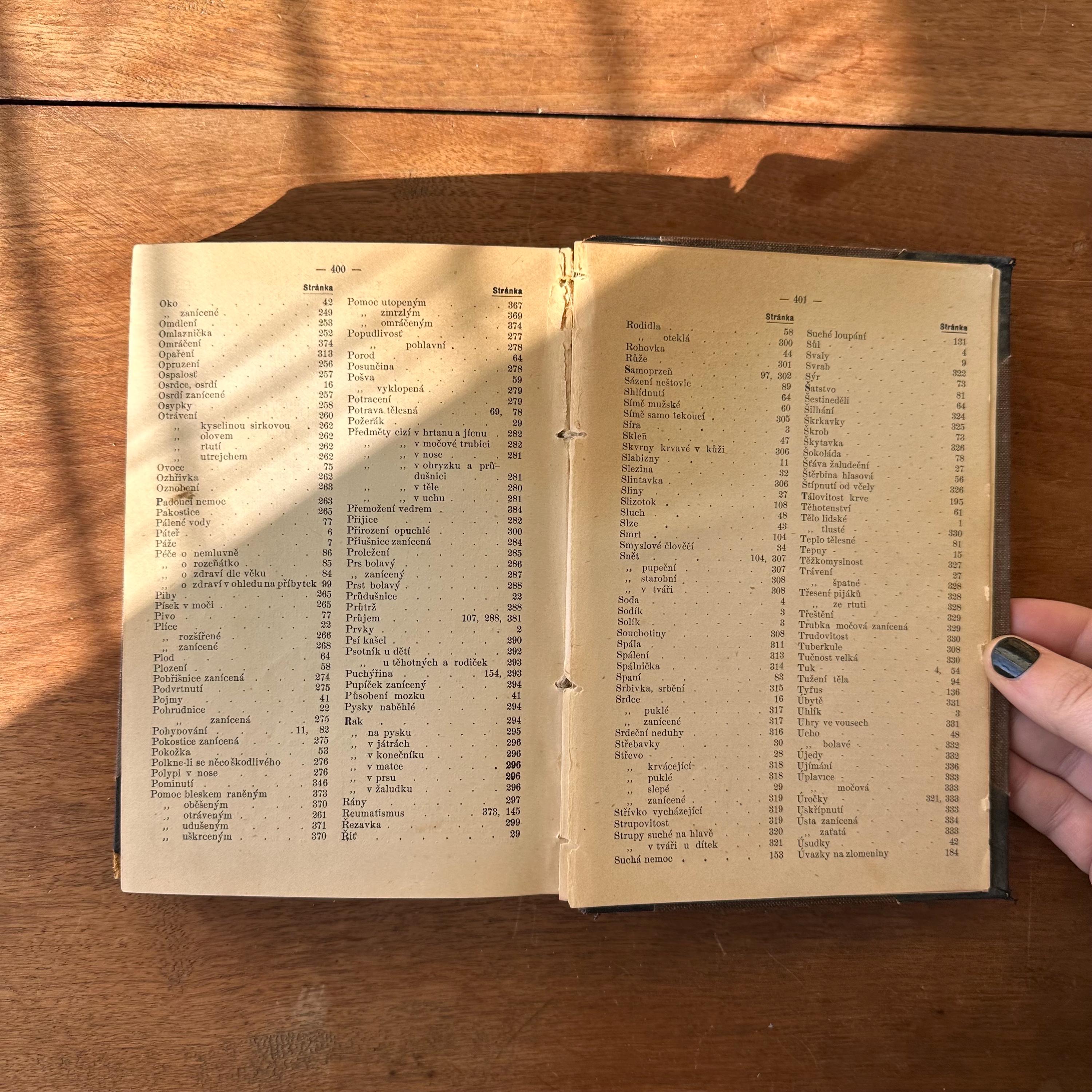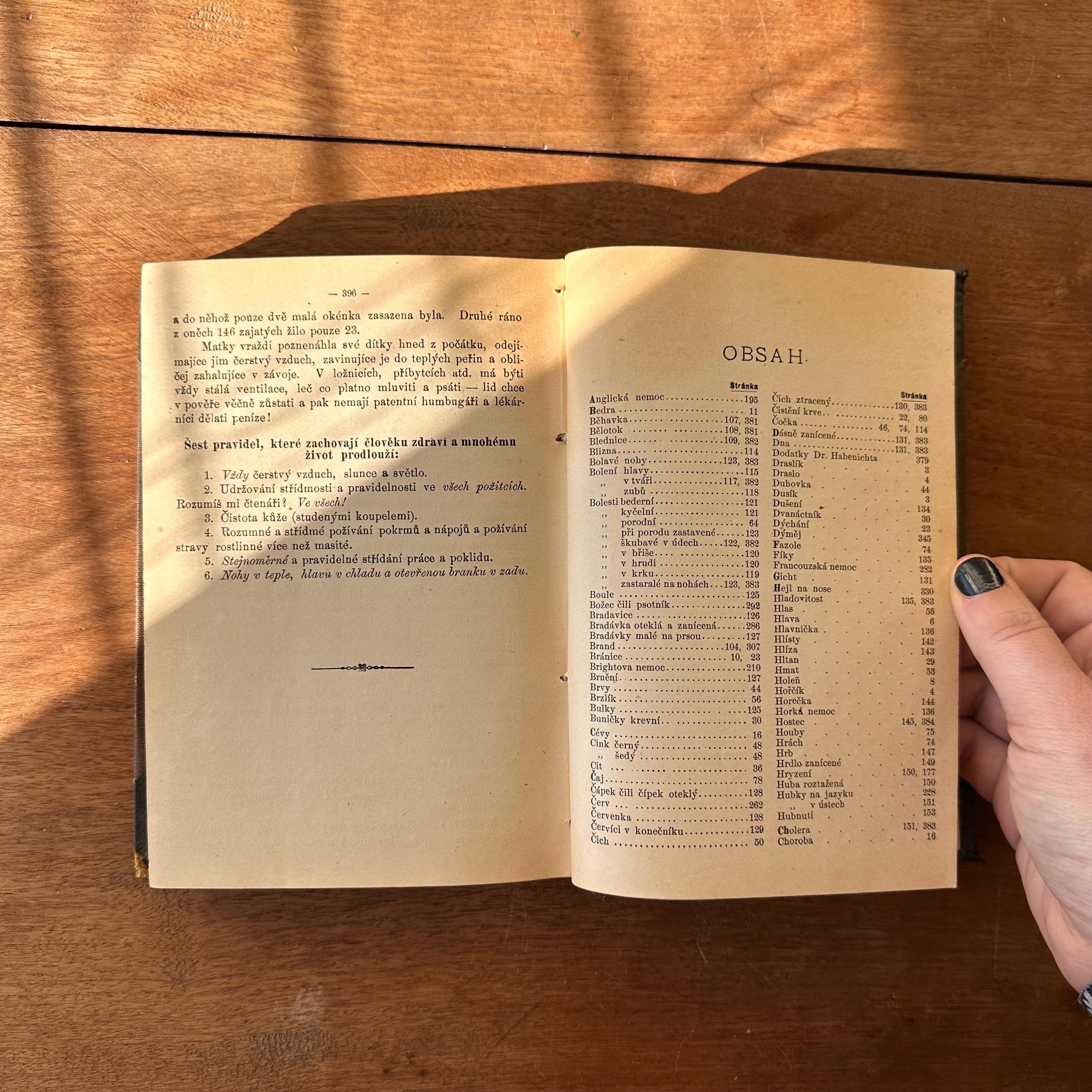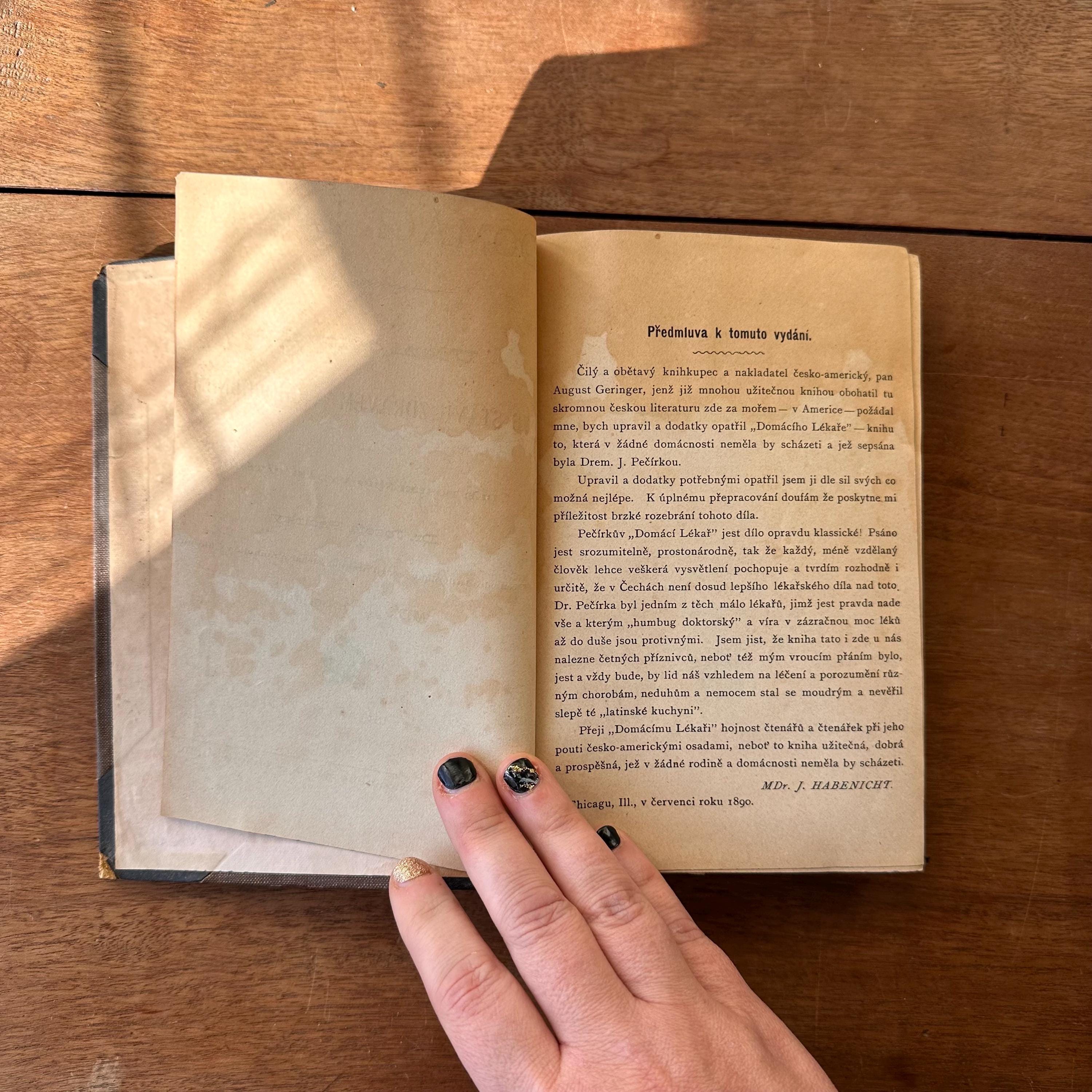 This is an antique 1890 edition of the Czech language Home Physician book by Dr. J. Pecirky titled Domaci Lekar and published by Augusta Geringera in Chicago, Illinois. It has brown linen covers with black leather corners and spine. The spine is lettered in gold. The page ends are marbled. The book is essentially a medical encyclopedia of symptoms and remedies written in Czech. There are 402 pages.