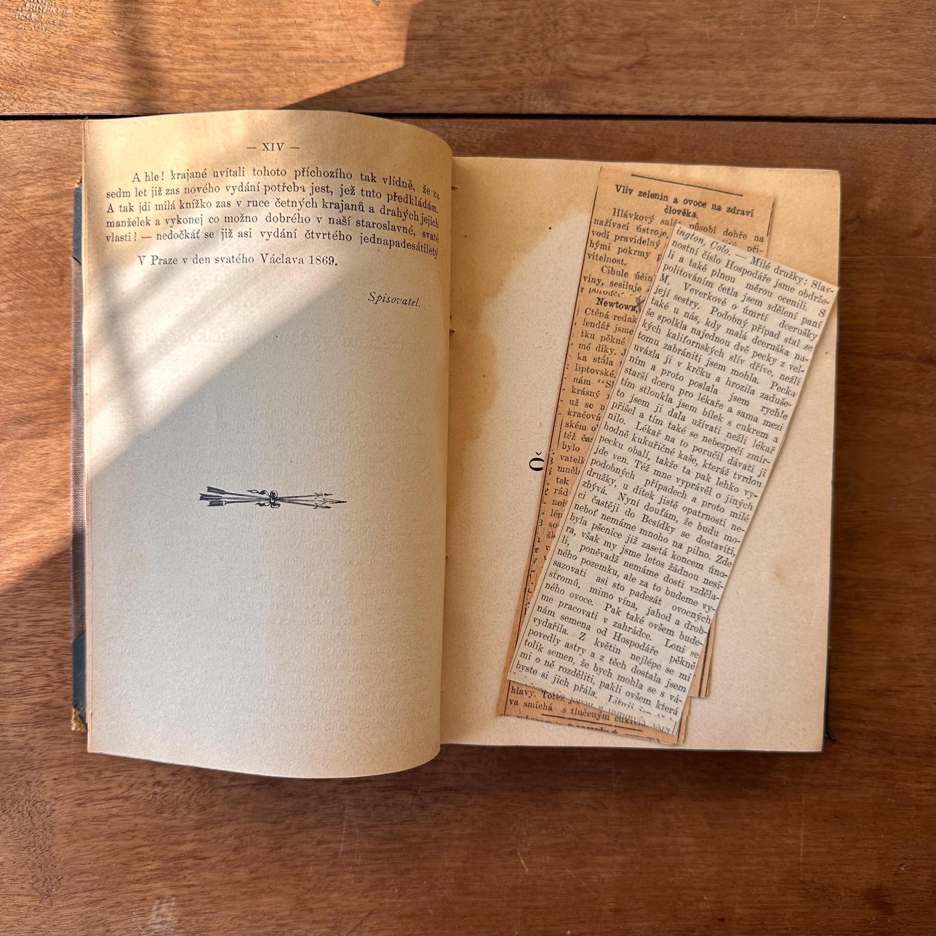 The book is in fair antique condition for its age and use. It has wear to the corners and edges of the cover with tears along the top and bottom of the spine, exposing the webbing underneath. The gold lettering is intact. The covers are cracked at the inside front and back spine. The pages are very yellowed, and the marbling is faded. The pages are starting to separate from the spine at the back. There are several Czech language newspaper clippings tucked in the pages.