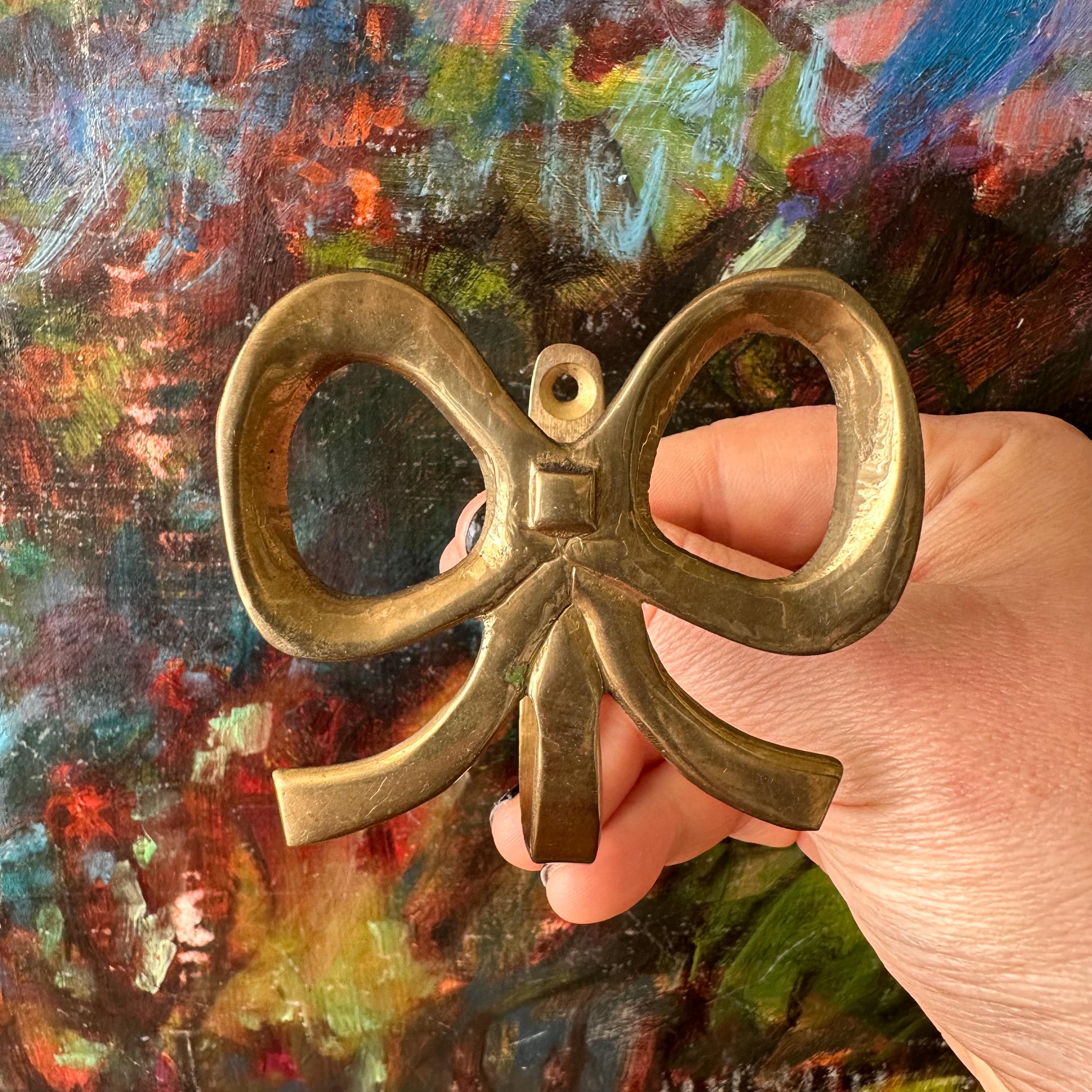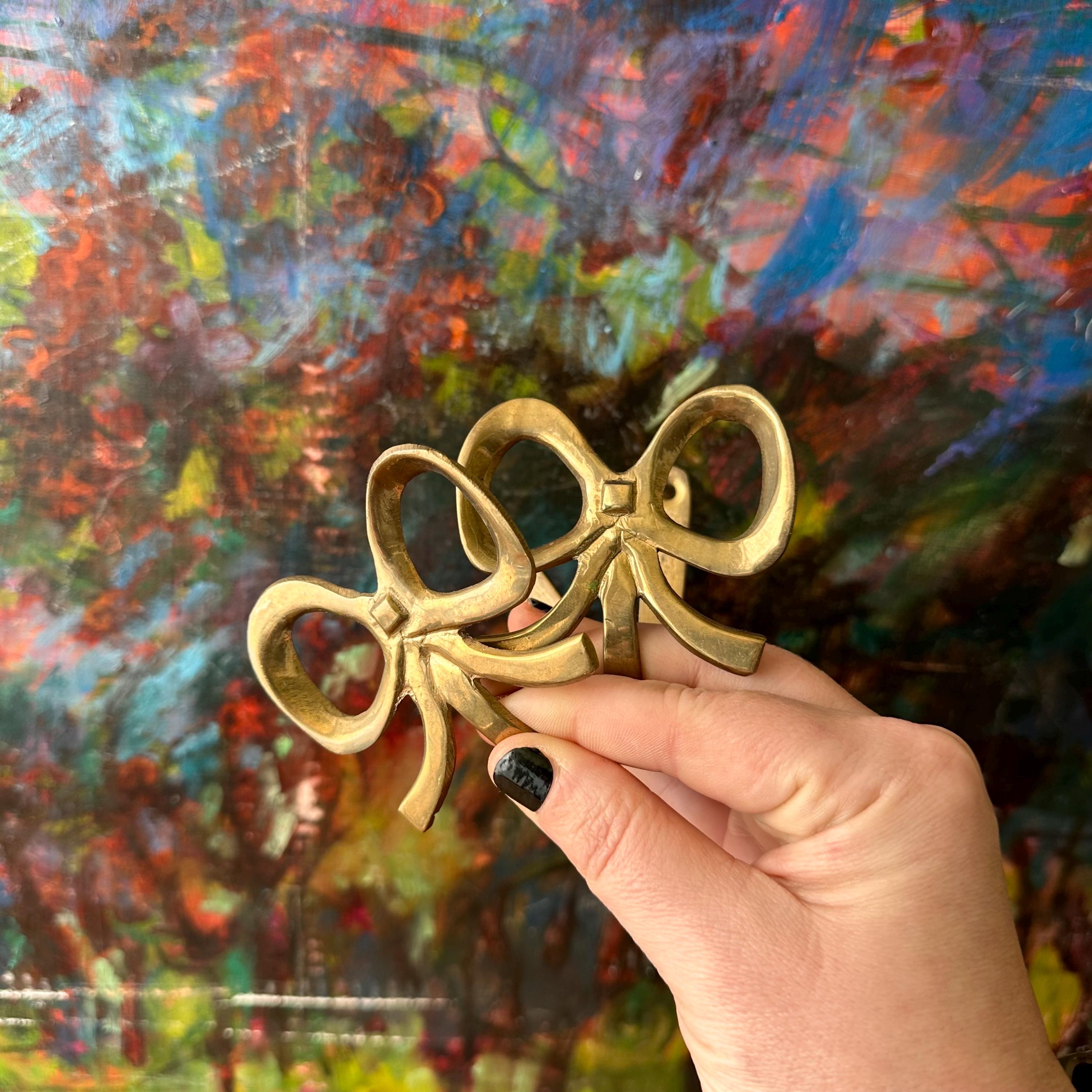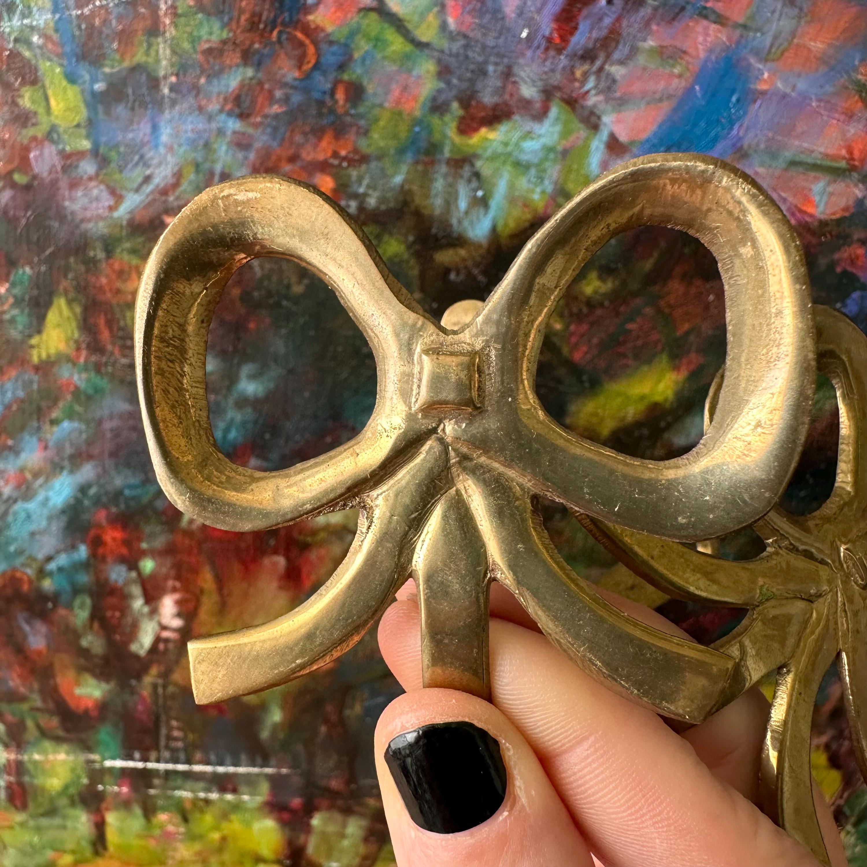This is a set of two brass bow hooks. The hooks have a simple bow pattern with the bows on the end of the hook with the rest of the hook extending behind it. There is a hole at the back of the hook to attach it to the wall. These would make great storage hooks or perfect curtain tiebacks.