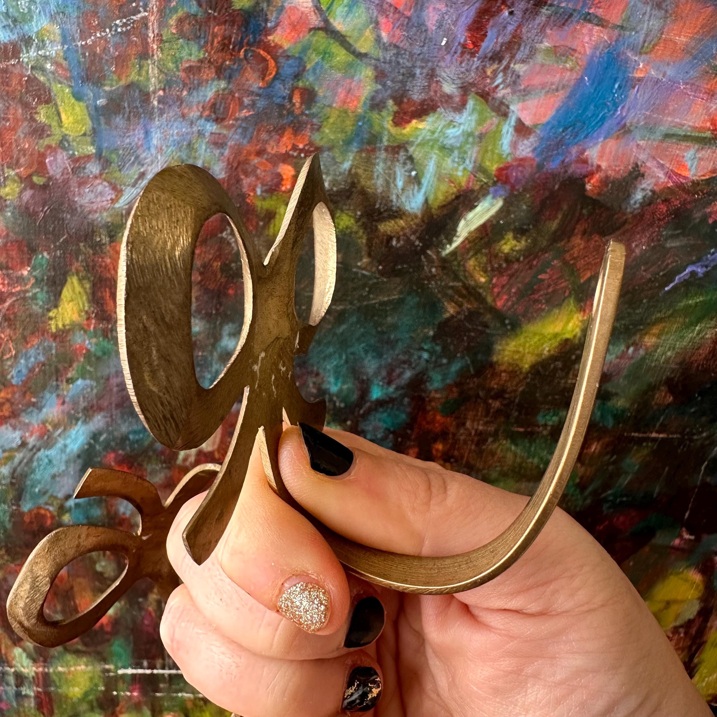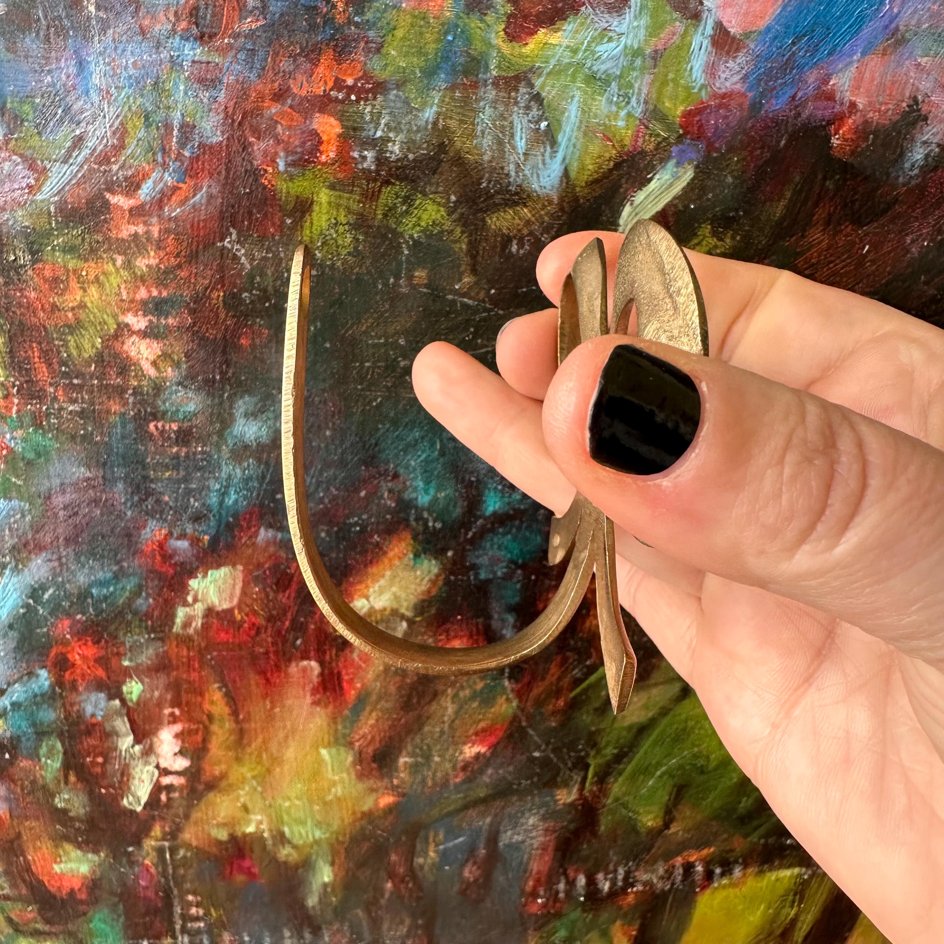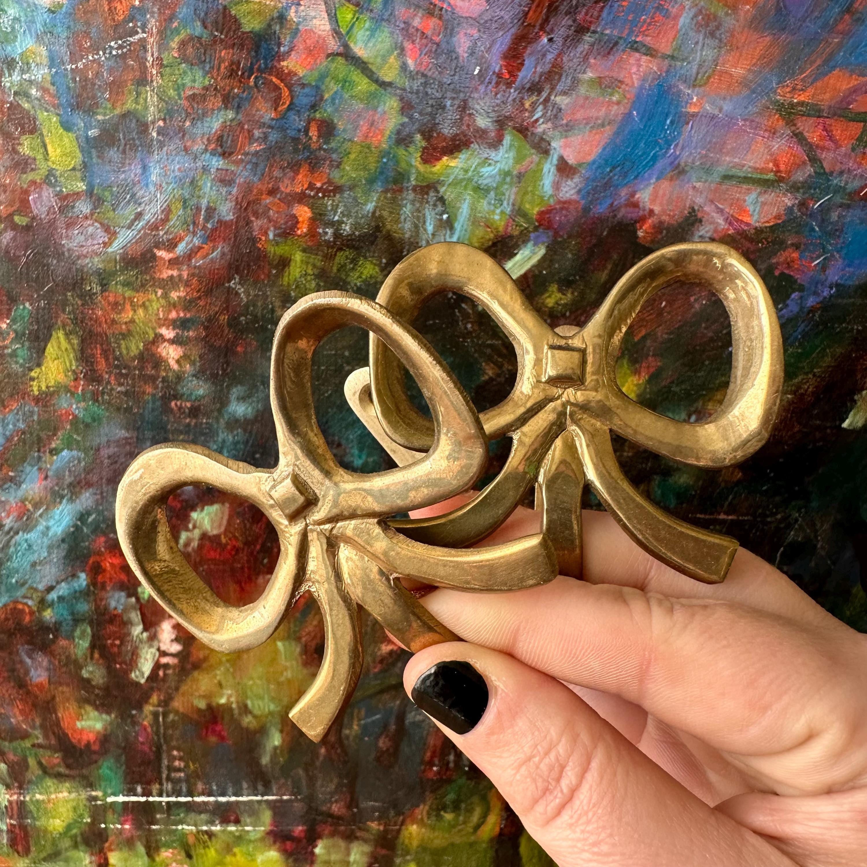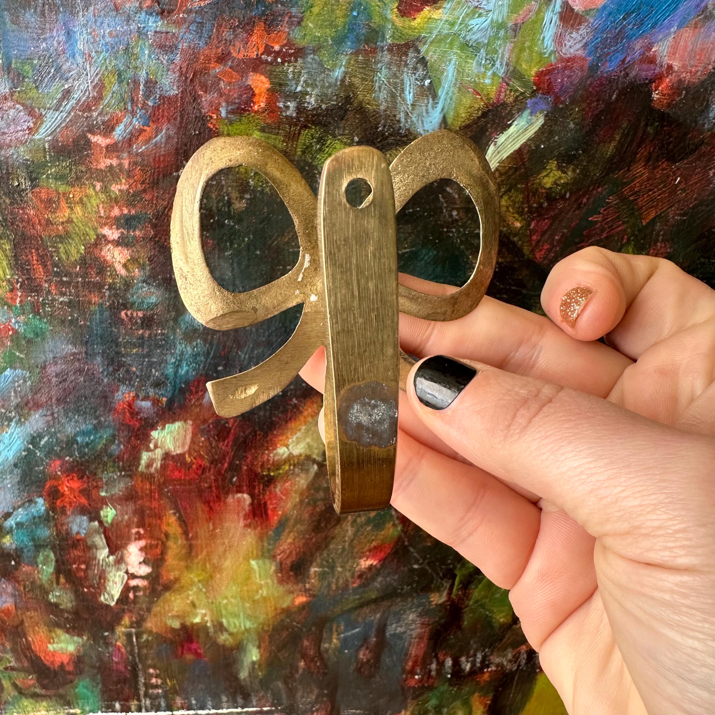 This is a set of two brass bow hooks. The hooks have a simple bow pattern with the bows on the end of the hook with the rest of the hook extending behind it. There is a hole at the back of the hook to attach it to the wall. These would make great storage hooks or perfect curtain tiebacks.