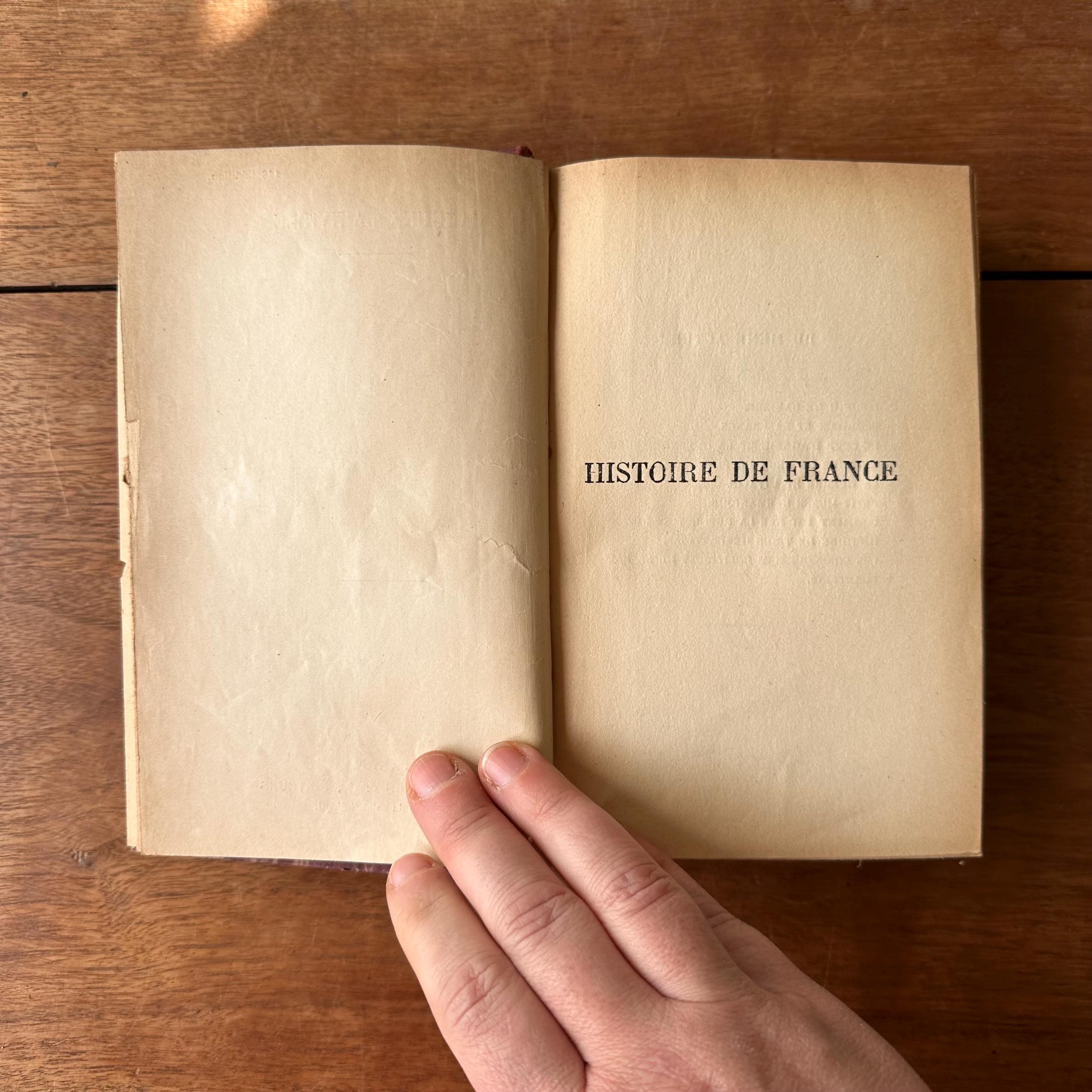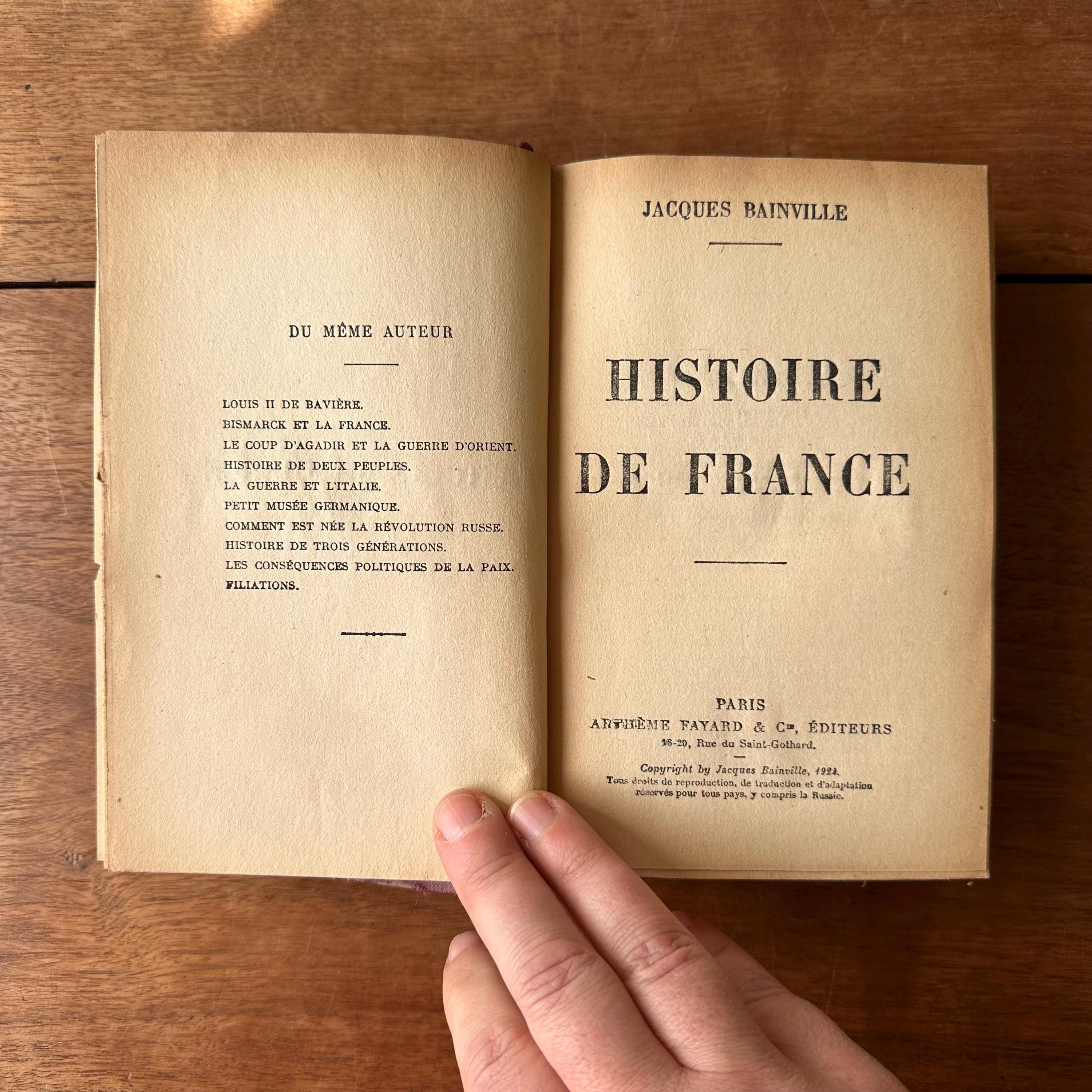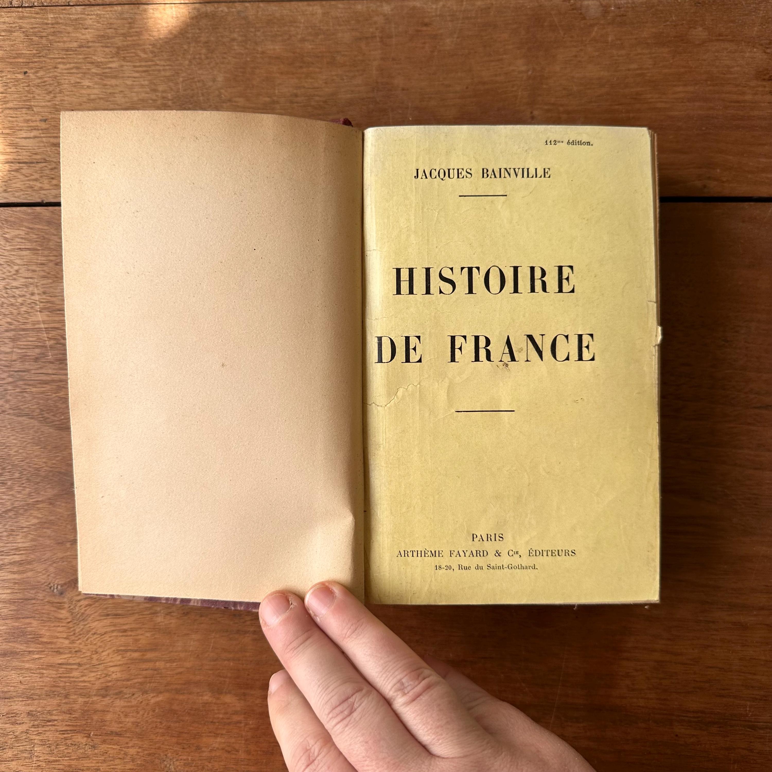 This is the antique 1924 edition of Histoire de France by Jacques Bainville, published by Artheme Fayard & Compagnie, Paris. It has red, blue, and brown marbled covers with a red linen wrapped spine. The spine is lettered in gold with a small gold flower motif. This is a French language edition of the History of France up through World War I. There are 572 pages.