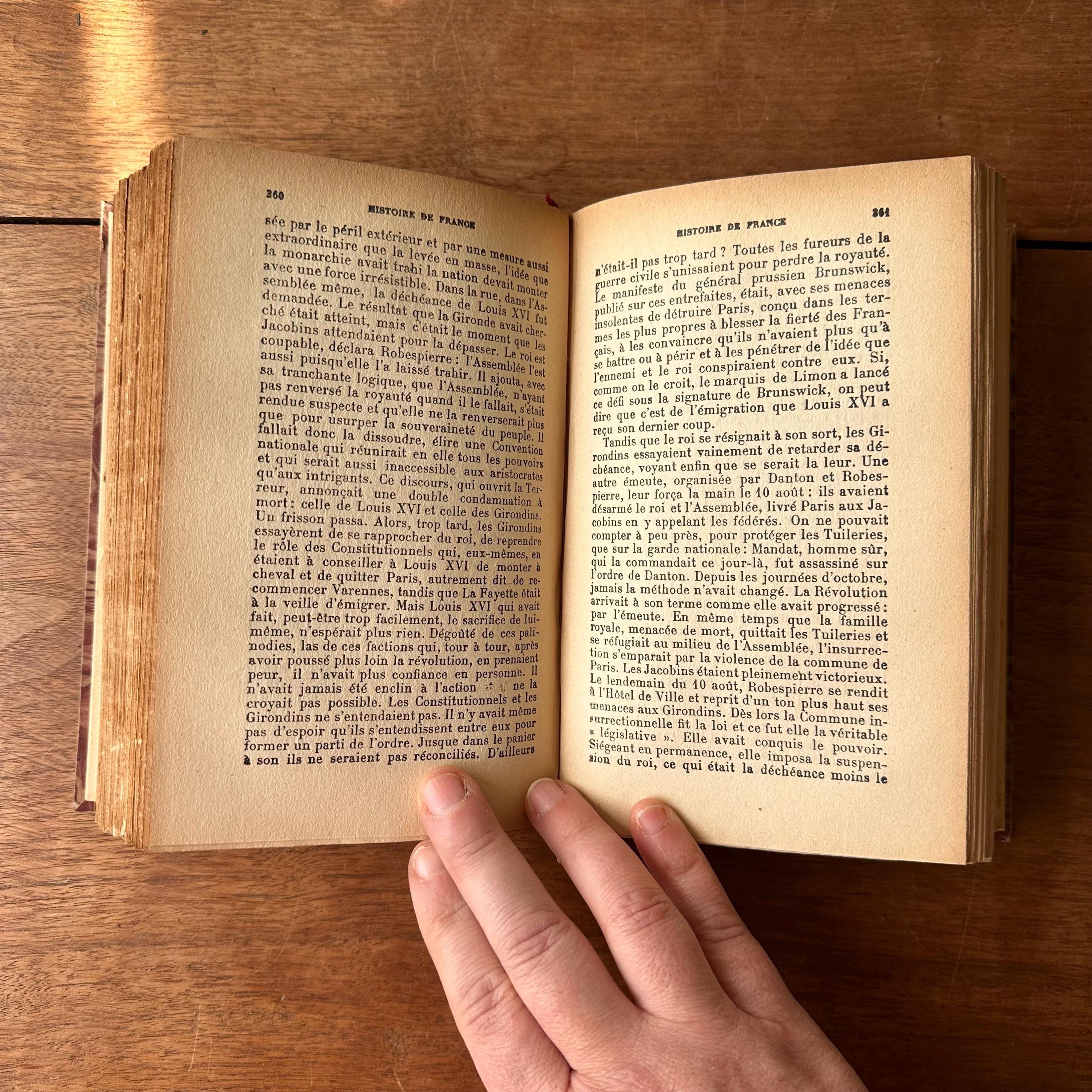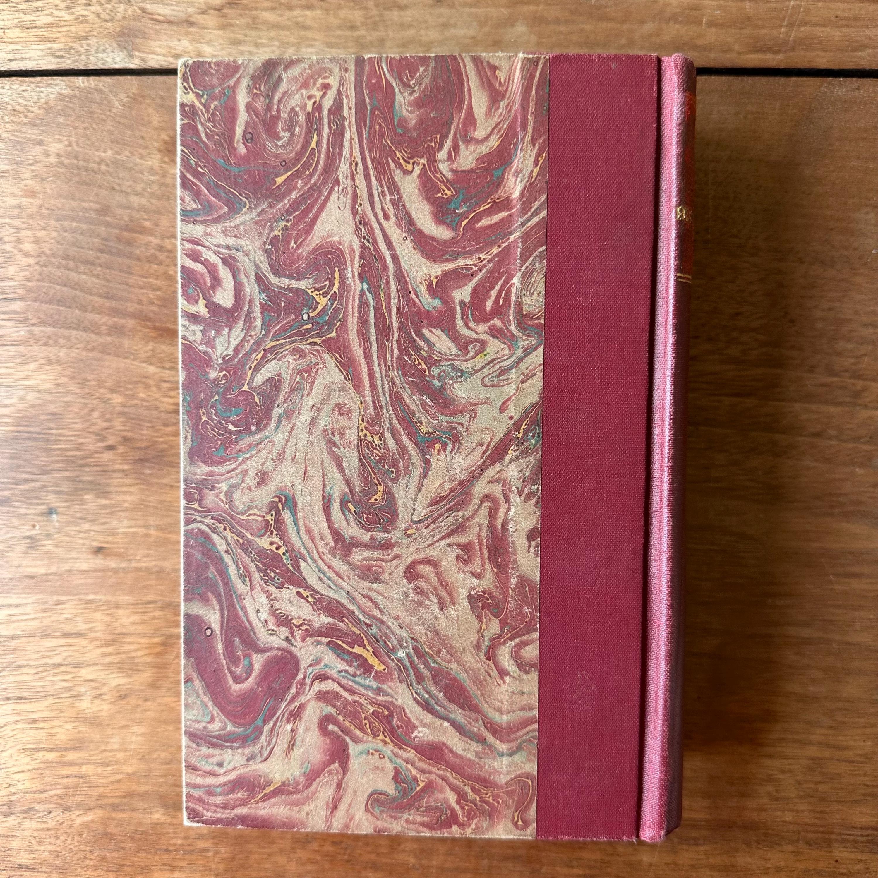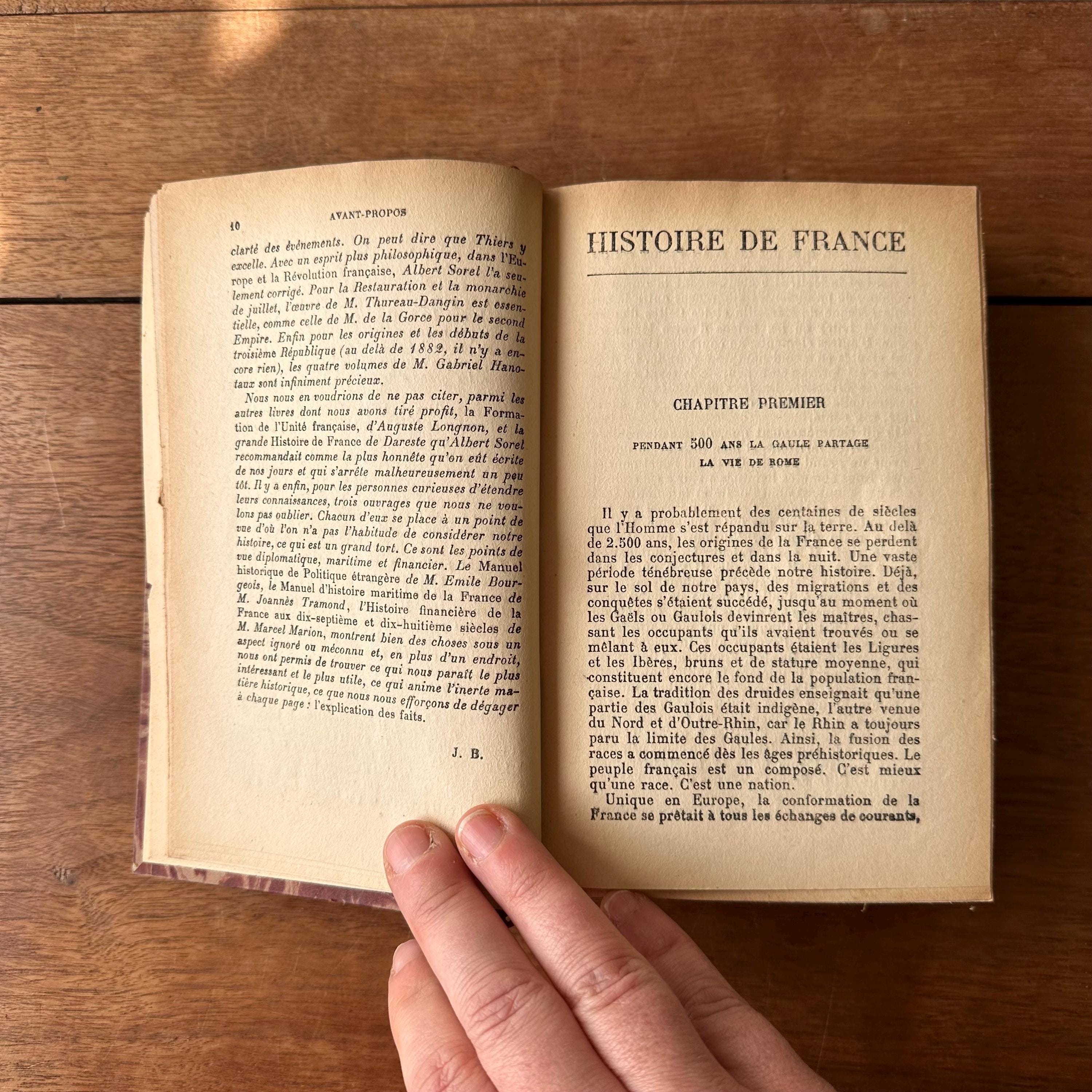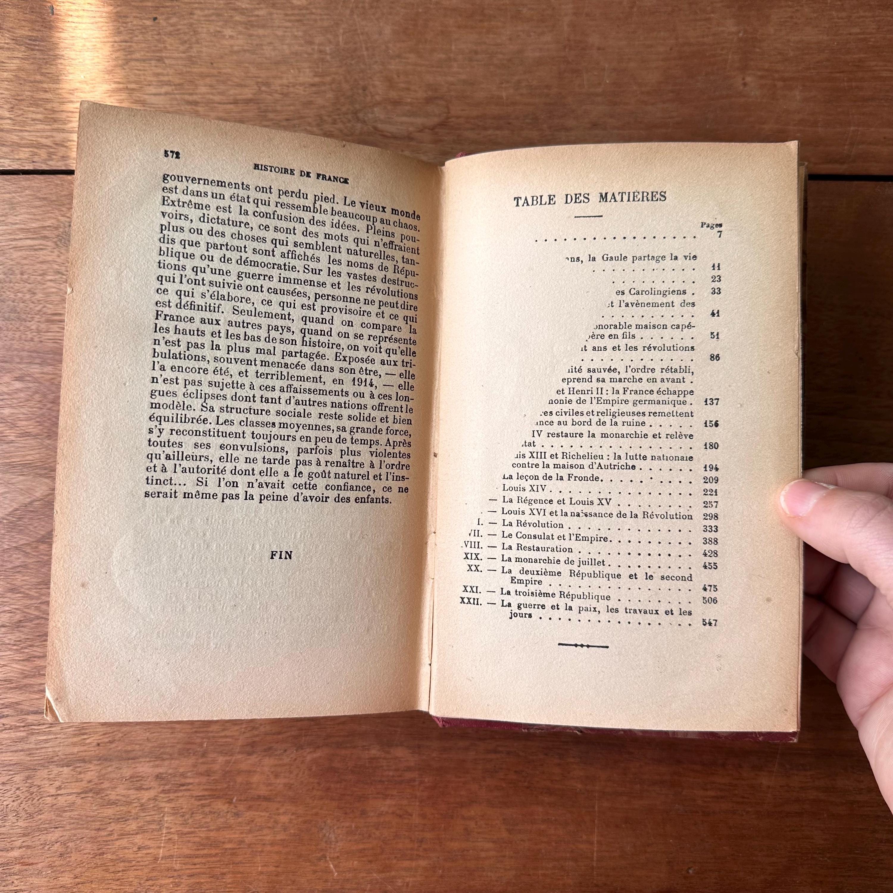 This is the antique 1924 edition of Histoire de France by Jacques Bainville, published by Artheme Fayard & Compagnie, Paris. It has red, blue, and brown marbled covers with a red linen wrapped spine. The spine is lettered in gold with a small gold flower motif. This is a French language edition of the History of France up through World War I. There are 572 pages.