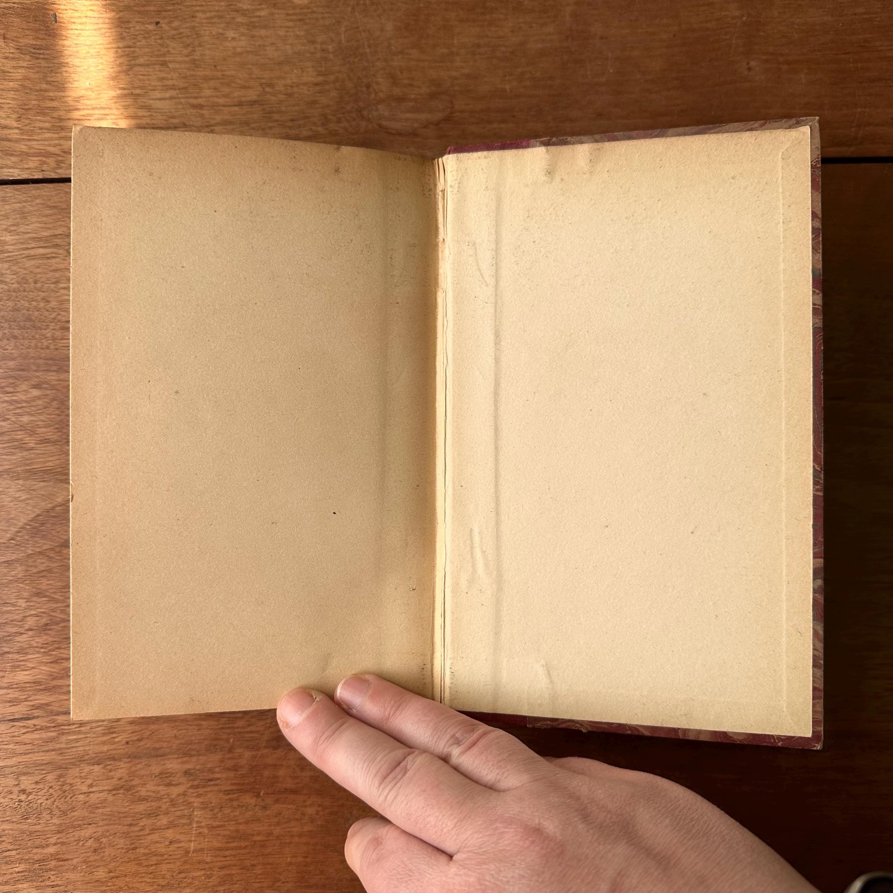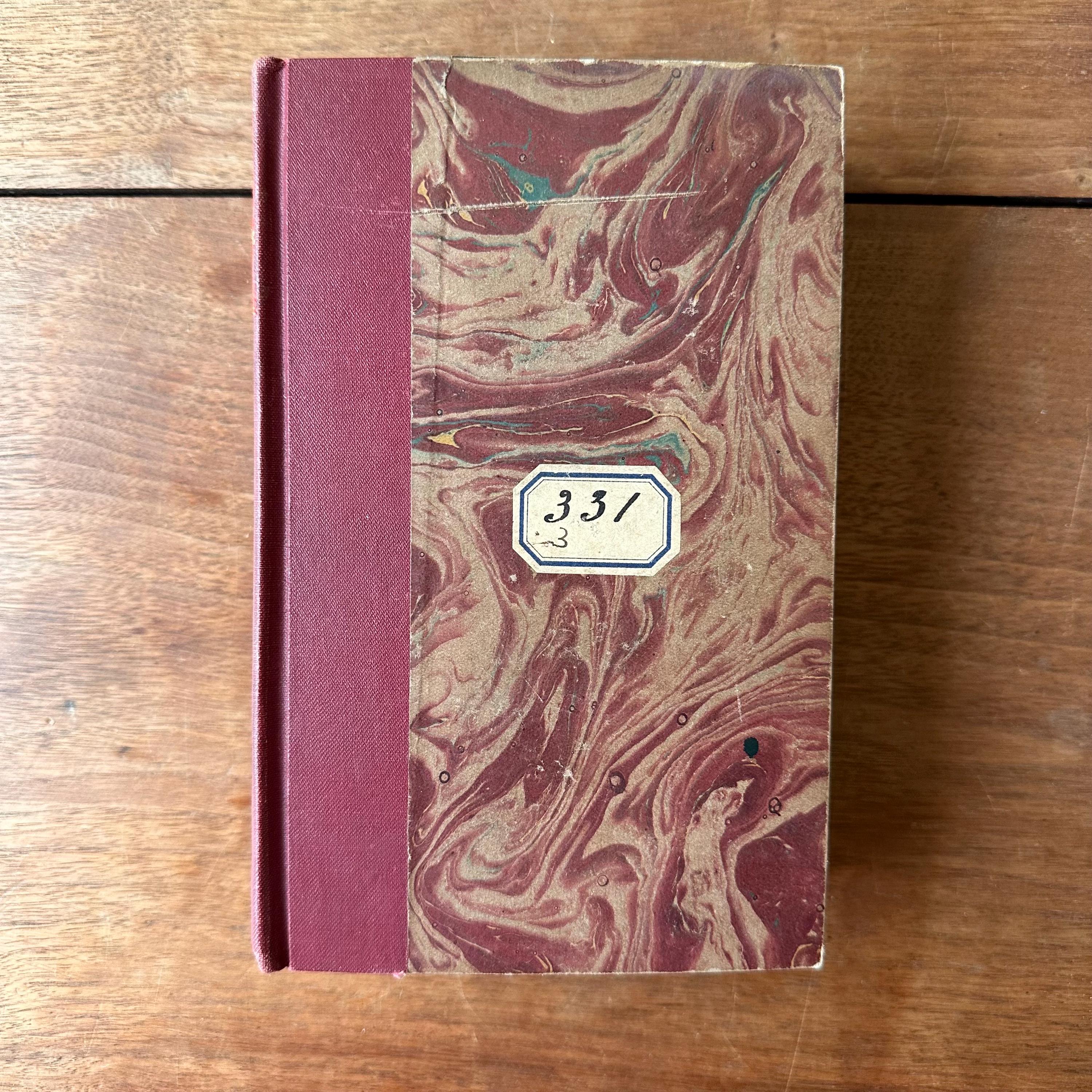 The book is in good antique condition for its age and use. The covers have general wear, including a scratch across the front cover. The front cover also has a paper label with 331 -3 written in ink. The gold lettering on the spine is intact. The covers are attached at the spine. The pages are yellowed with some foxing.
