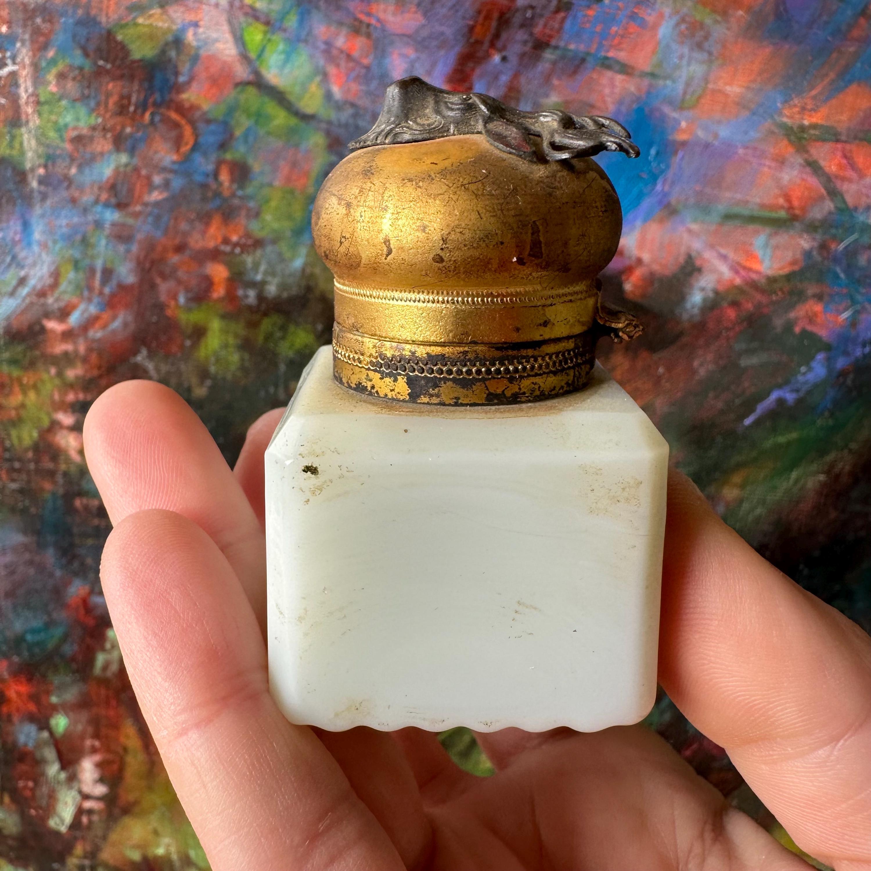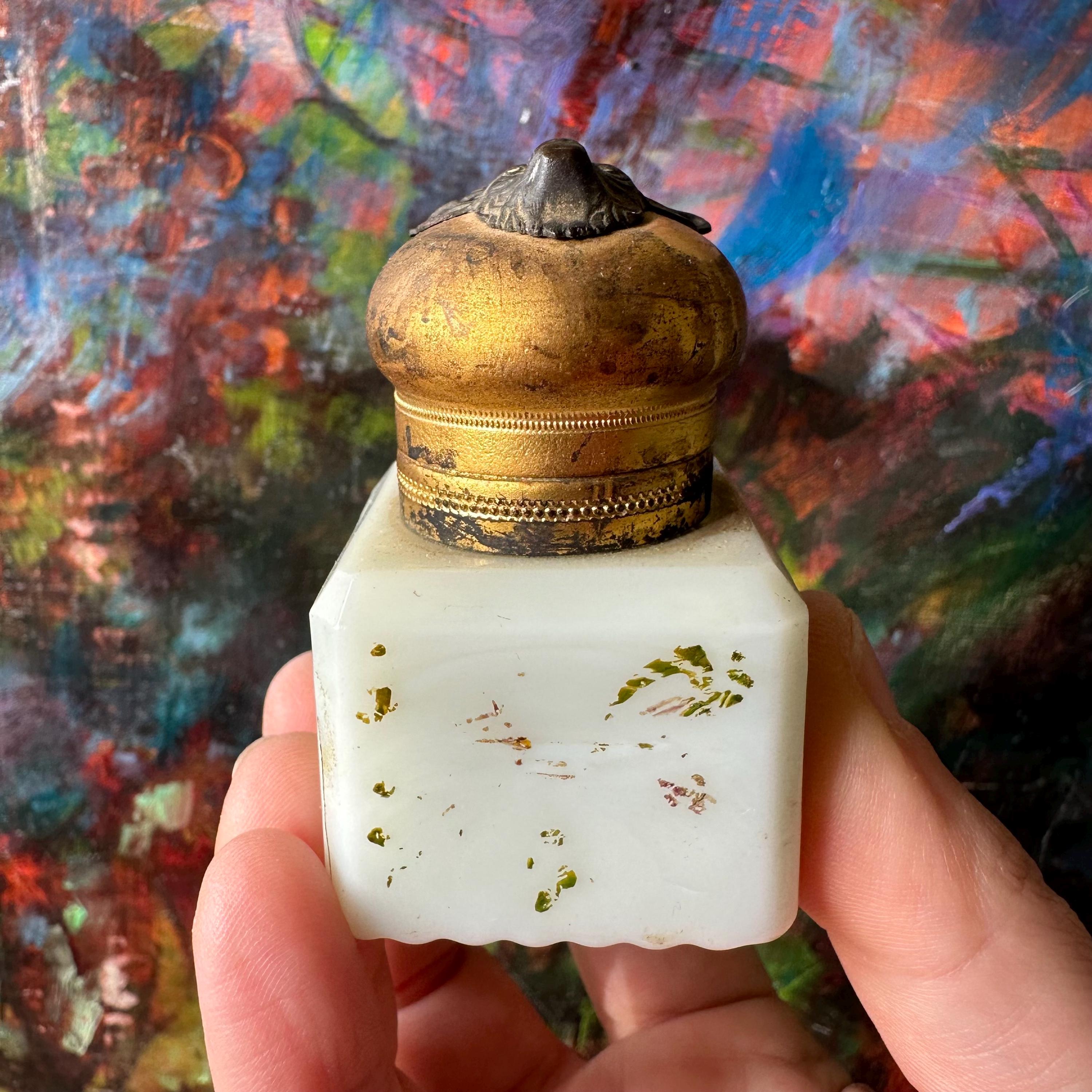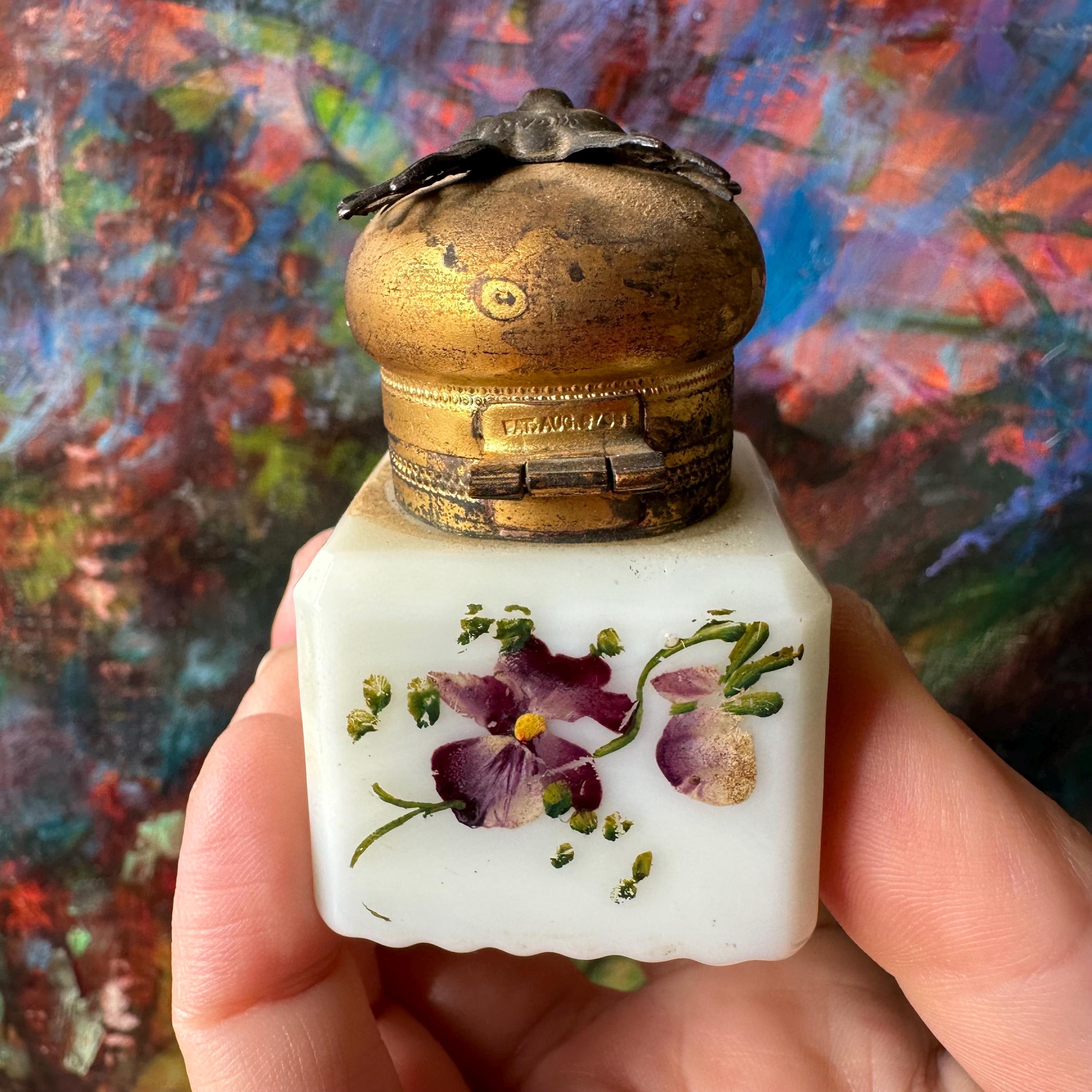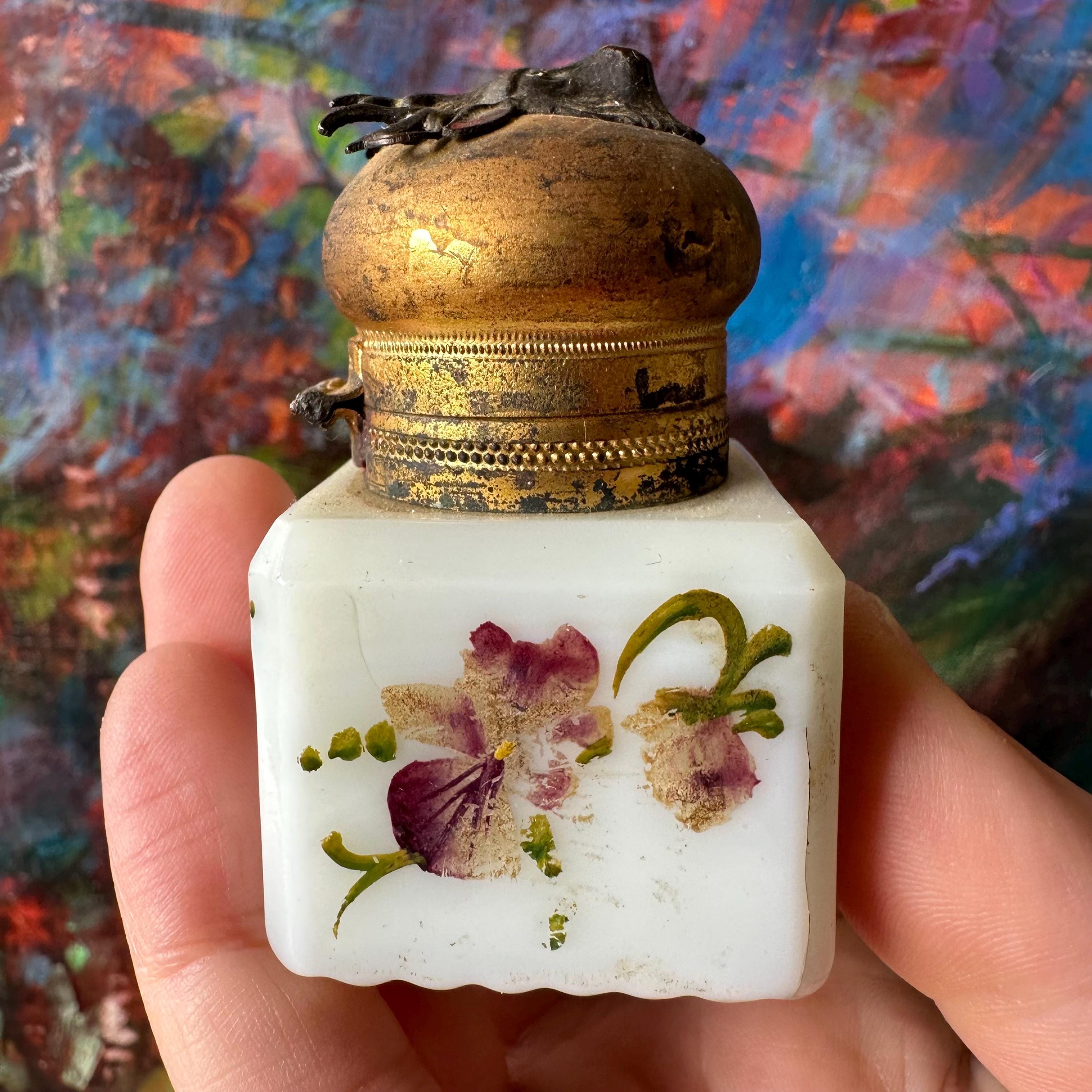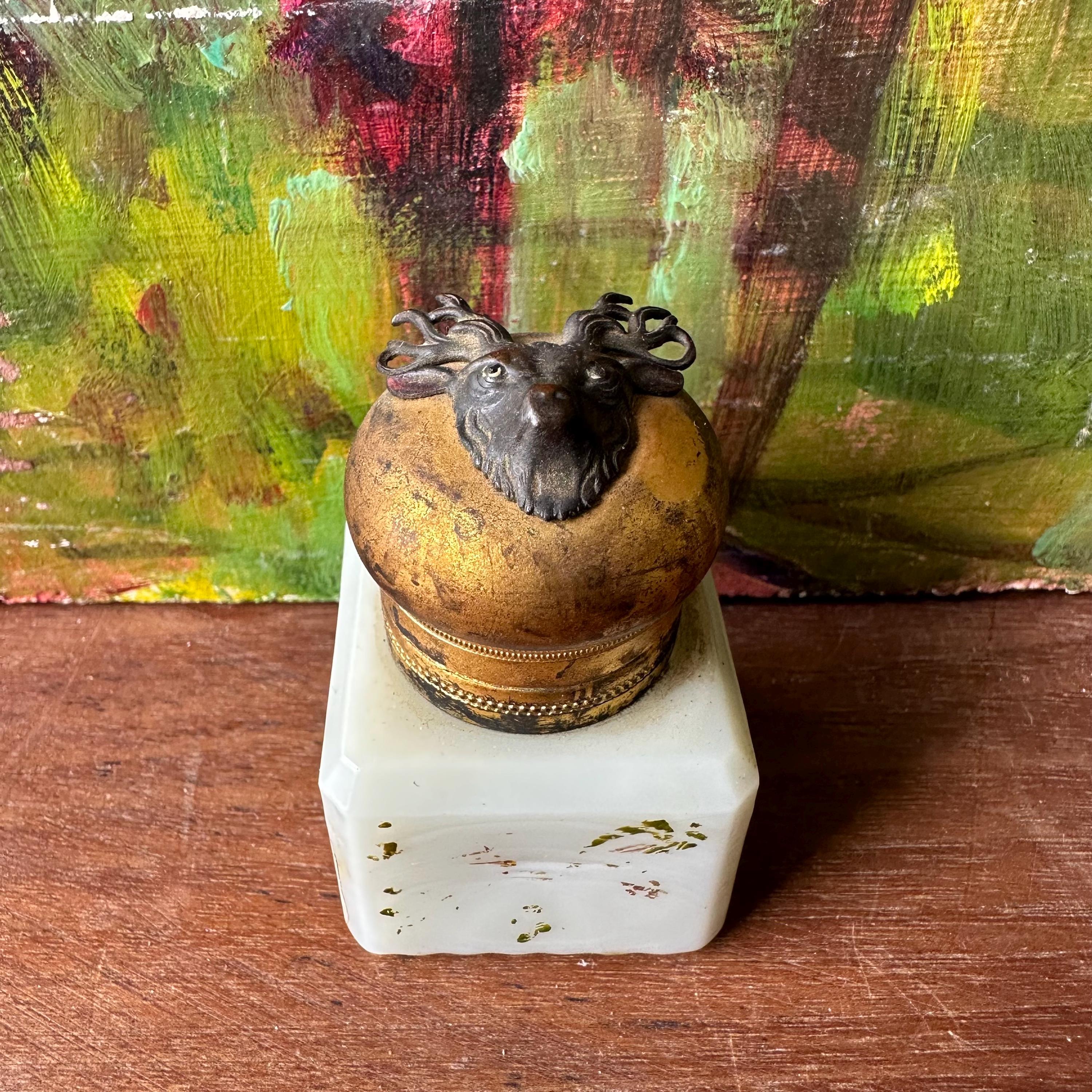 This is an antique early pattern glass style inkwell or perfume bottle. The inkwell is white like milk glass with pansies painted on three sides. The top of the bottle is a gold metal with a rounded lid and an etched rim. On the top of the lid is a bronze stag with gold painted eyes. The lid is hinged with a gold metal hinge. The bottle is a solid piece of glass with just the center hollow for the ink or perfume. The bottom is scalloped with no makers mark.