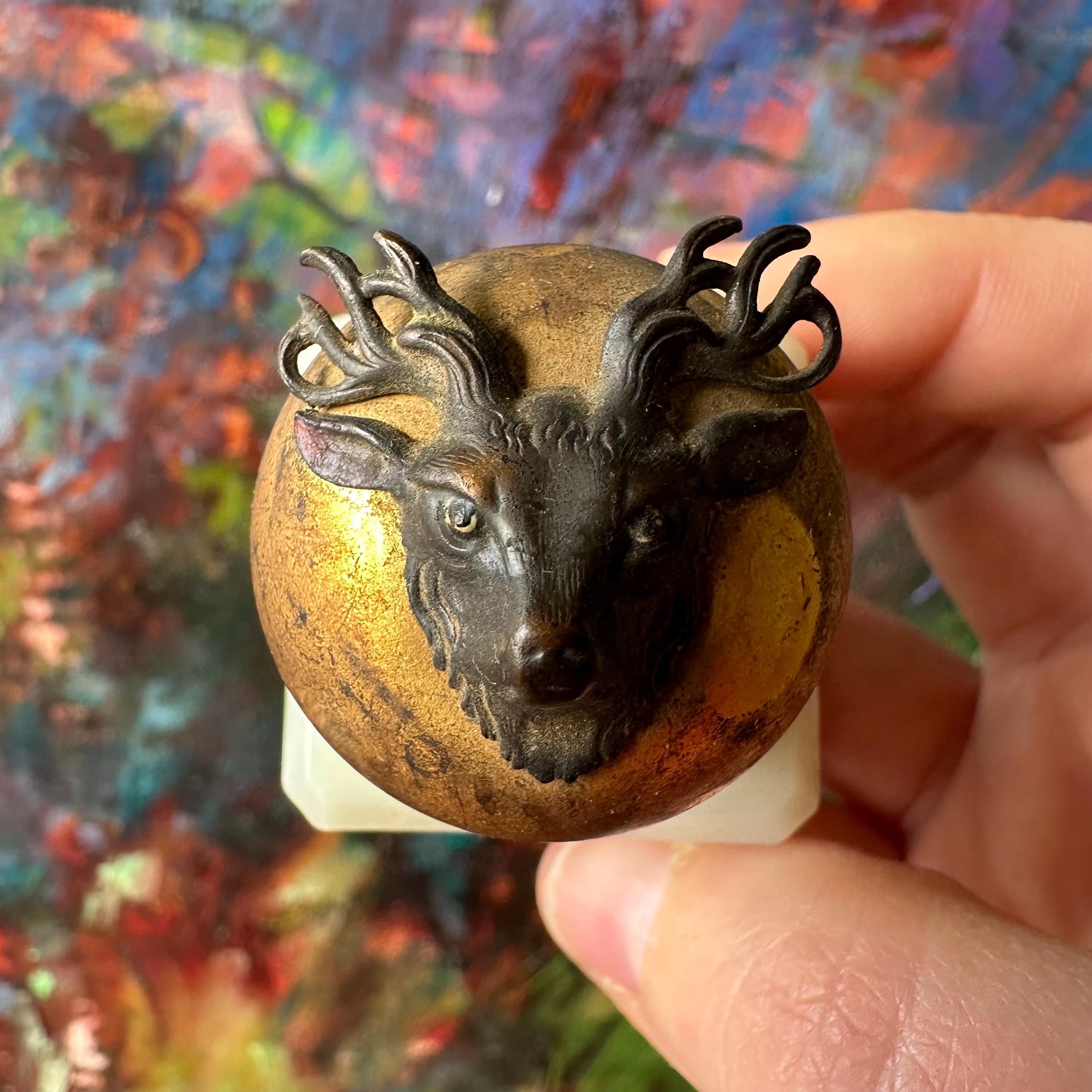 The bottle is in good antique condition for its age and use. The lid opens and closes easily and the bronze stag is intact with just fading for the eye paint. The gold metal has tarnishing all over but is still shiny. The paint has almost entirely scraped away on one side and is still mostly intact on the other two sides with some large areas of missing paint. One side has all the paint missing. The front left corner has a hairline crack along the edge.