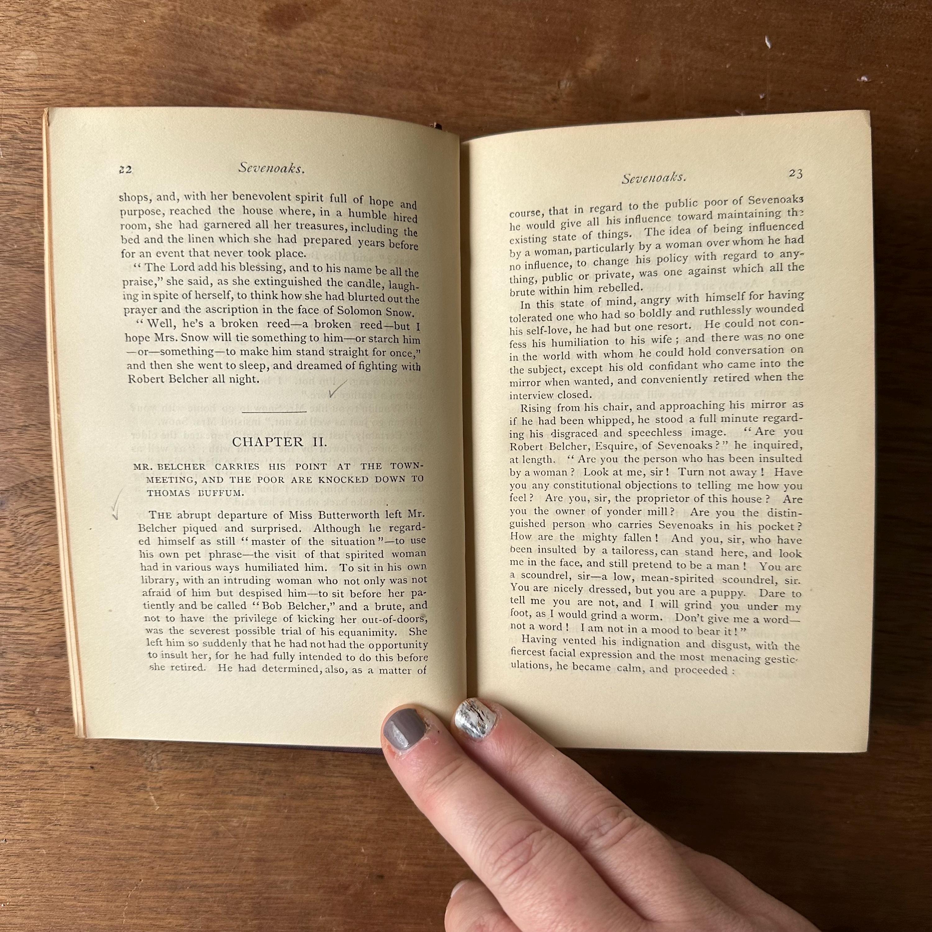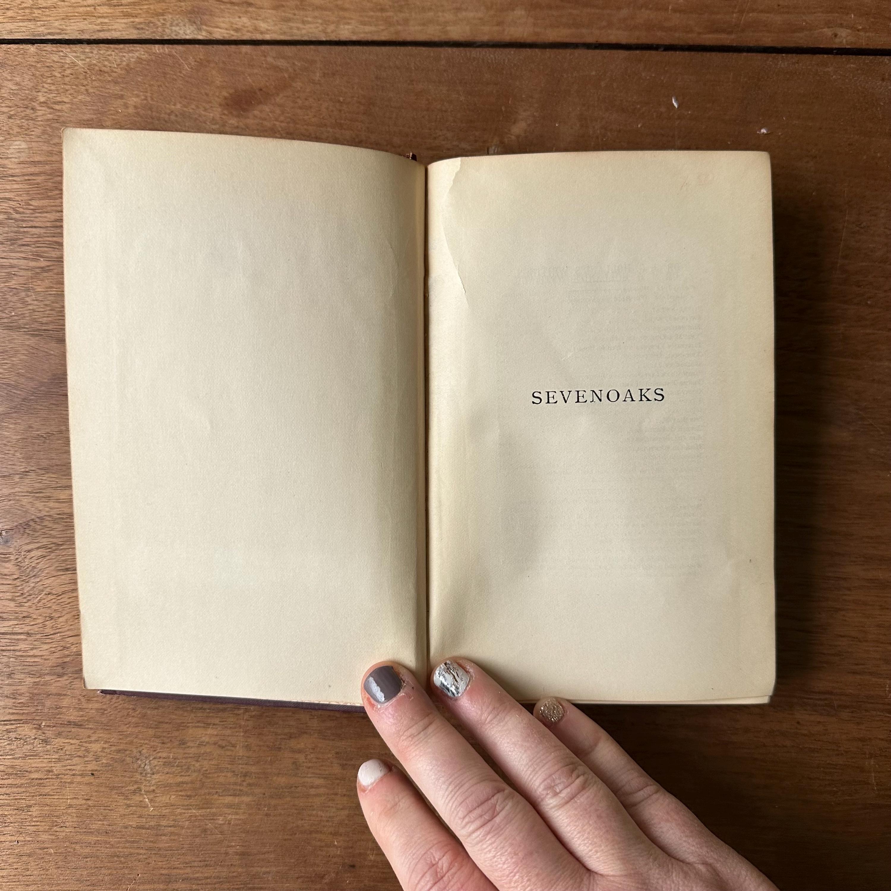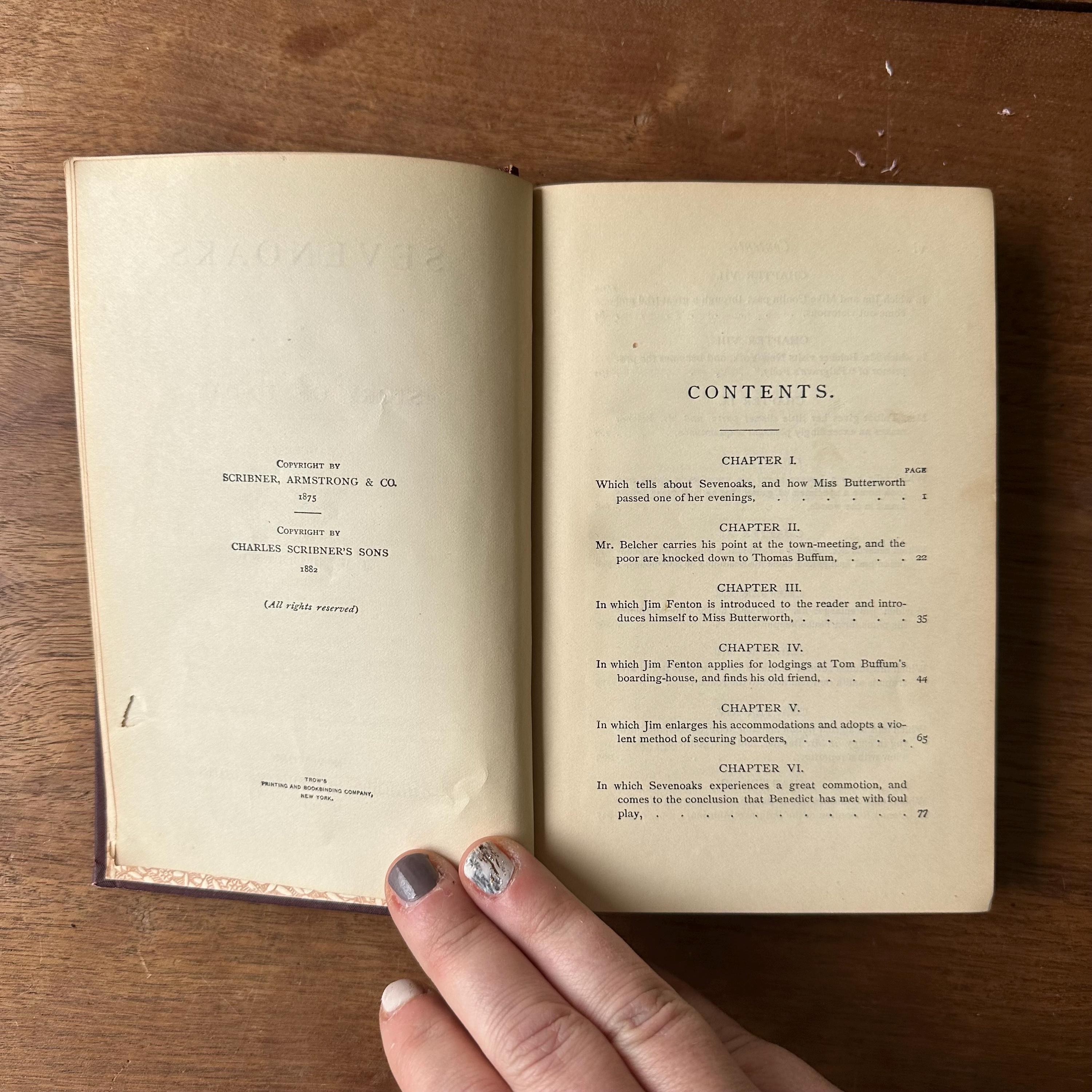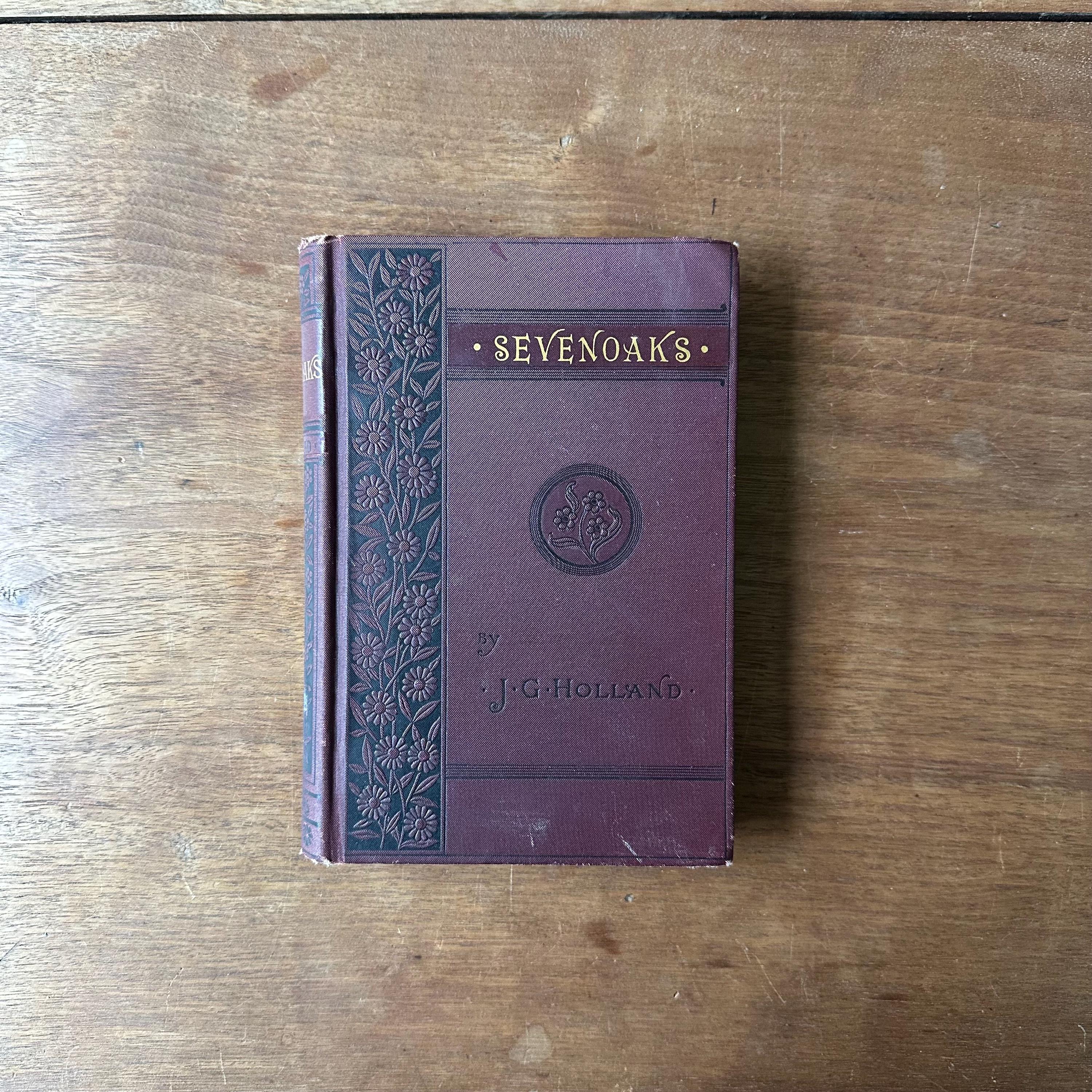 This is the antique 1894 edition of Sevenoaks by J.G. Holland. It has deep burgundy covers with gold lettering and floral embossing on a dark brown background. The spine is also lettered in gold with floral decoration. The endpapers are decorated with a white and brown repeating floral pattern. There are 463 pages with several additional pages of advertisements.