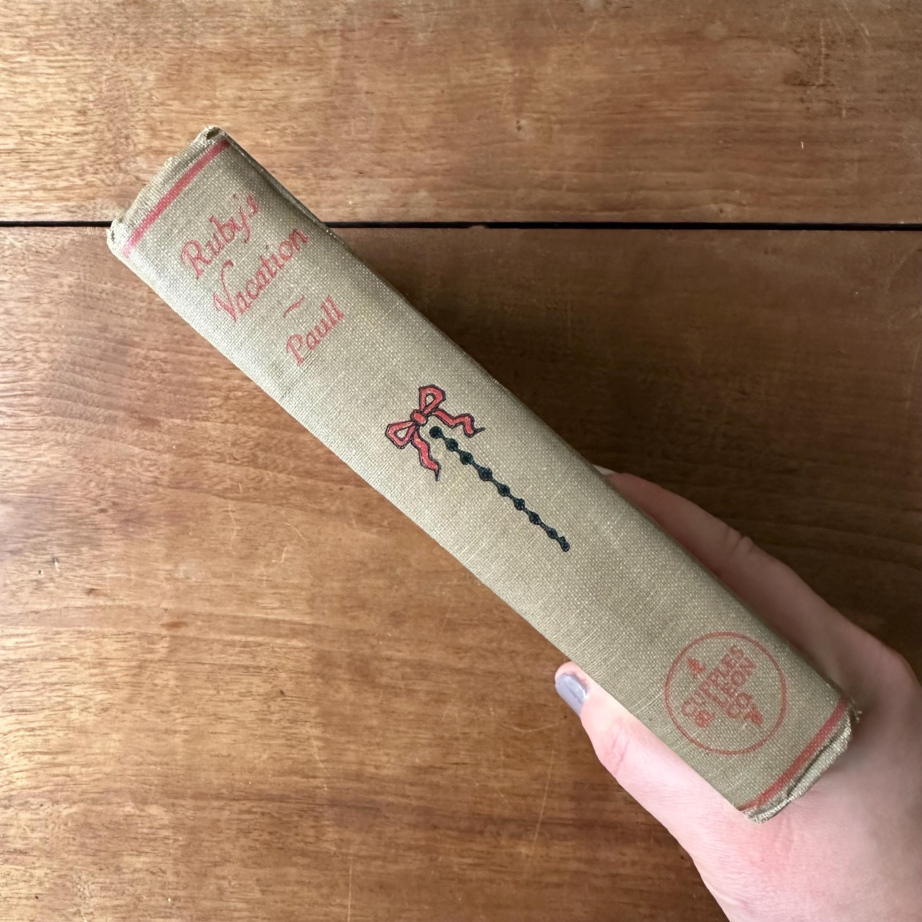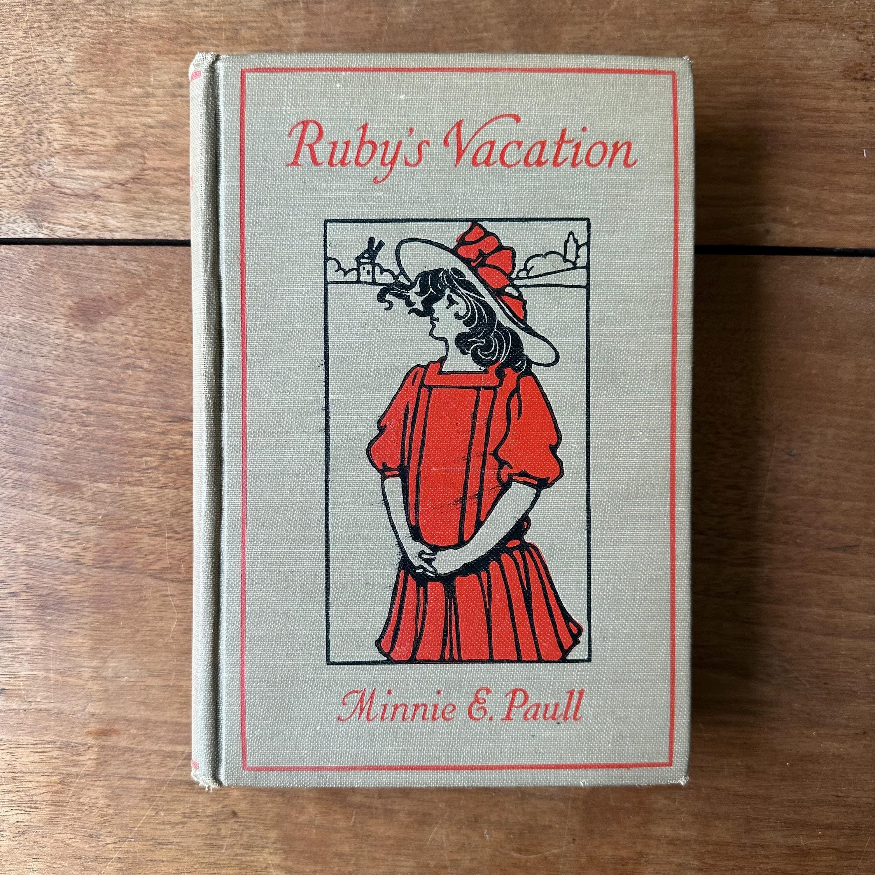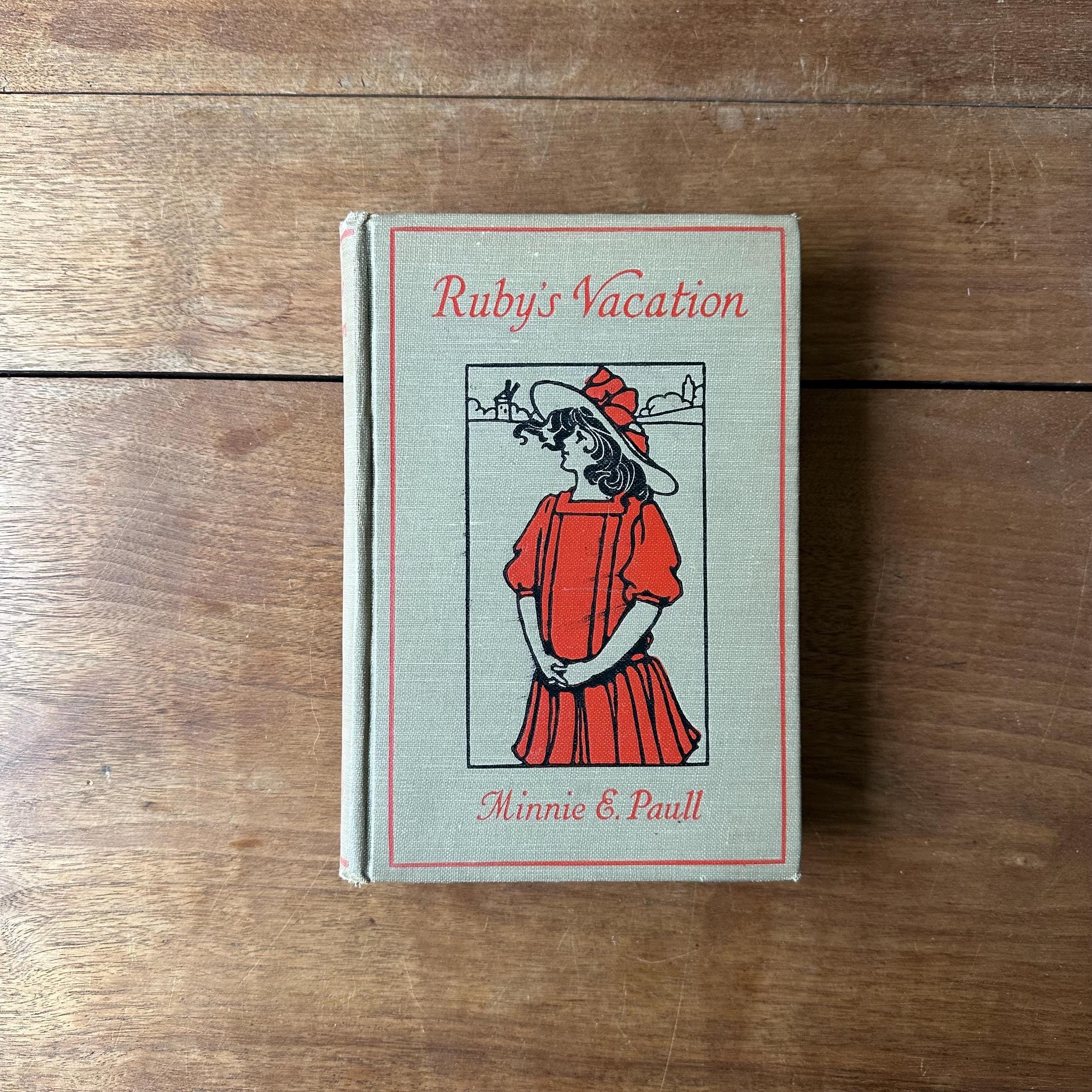 This is the antique 1917 edition of Ruby's Vacation in the Ruby and Ruthie Series by Minnie E. Paull. It has grey linen covers with red lettering and a red and black illustrated portrait of Ruby on the cover. The spine is also lettered in red with an illustration of a small bow. There is one black and white illustration plate of Ruby at the title page. There are 248 pages with several additional pages of illustrations.