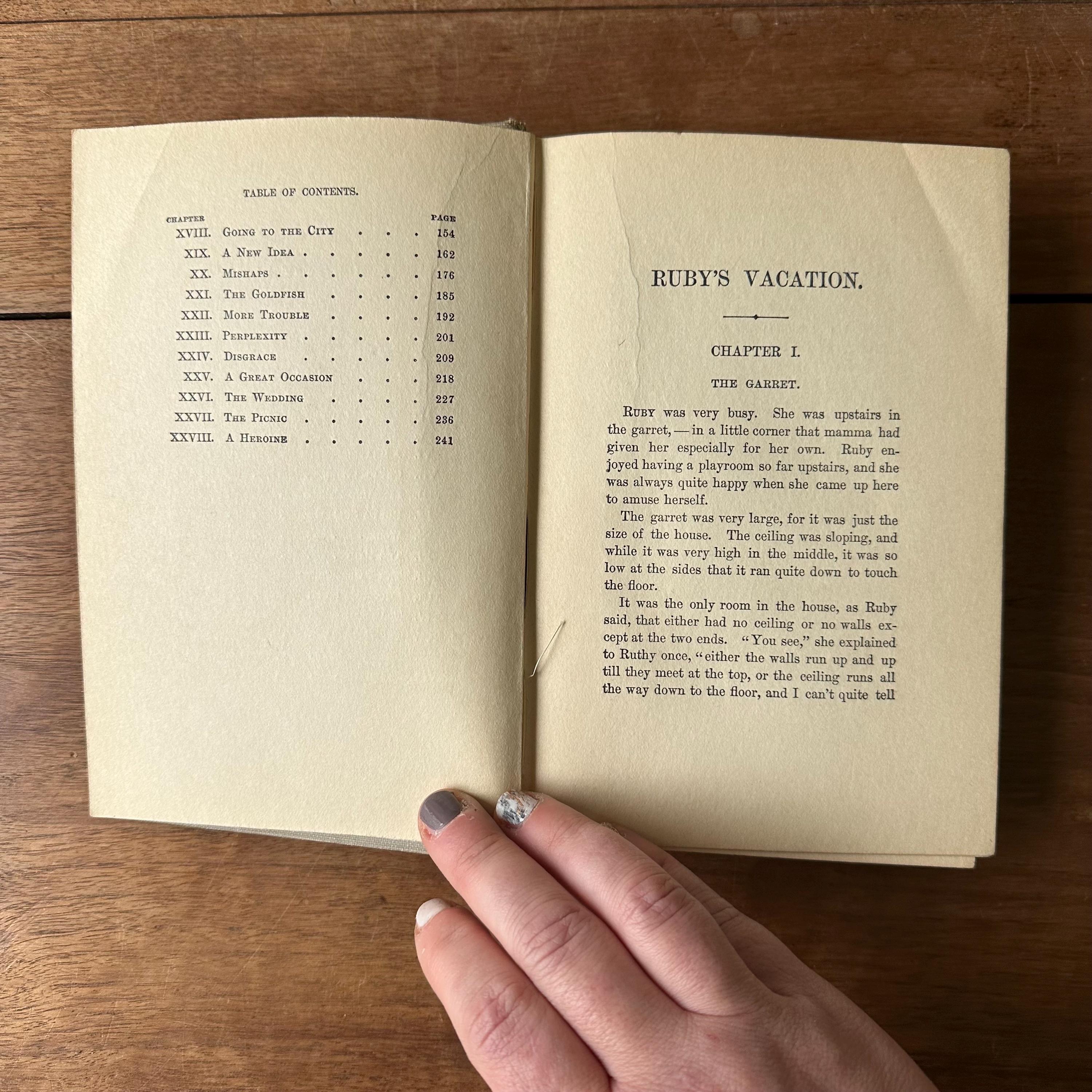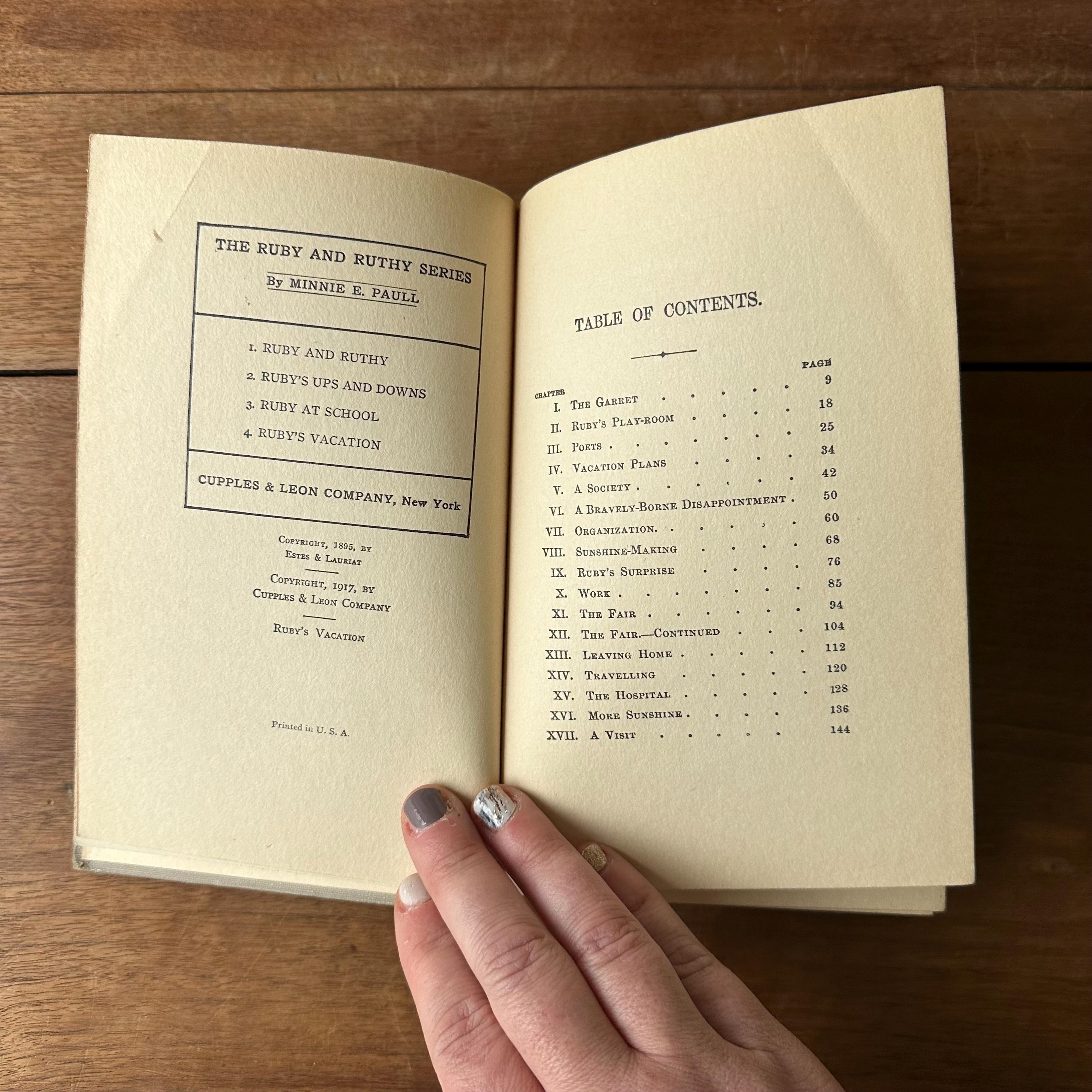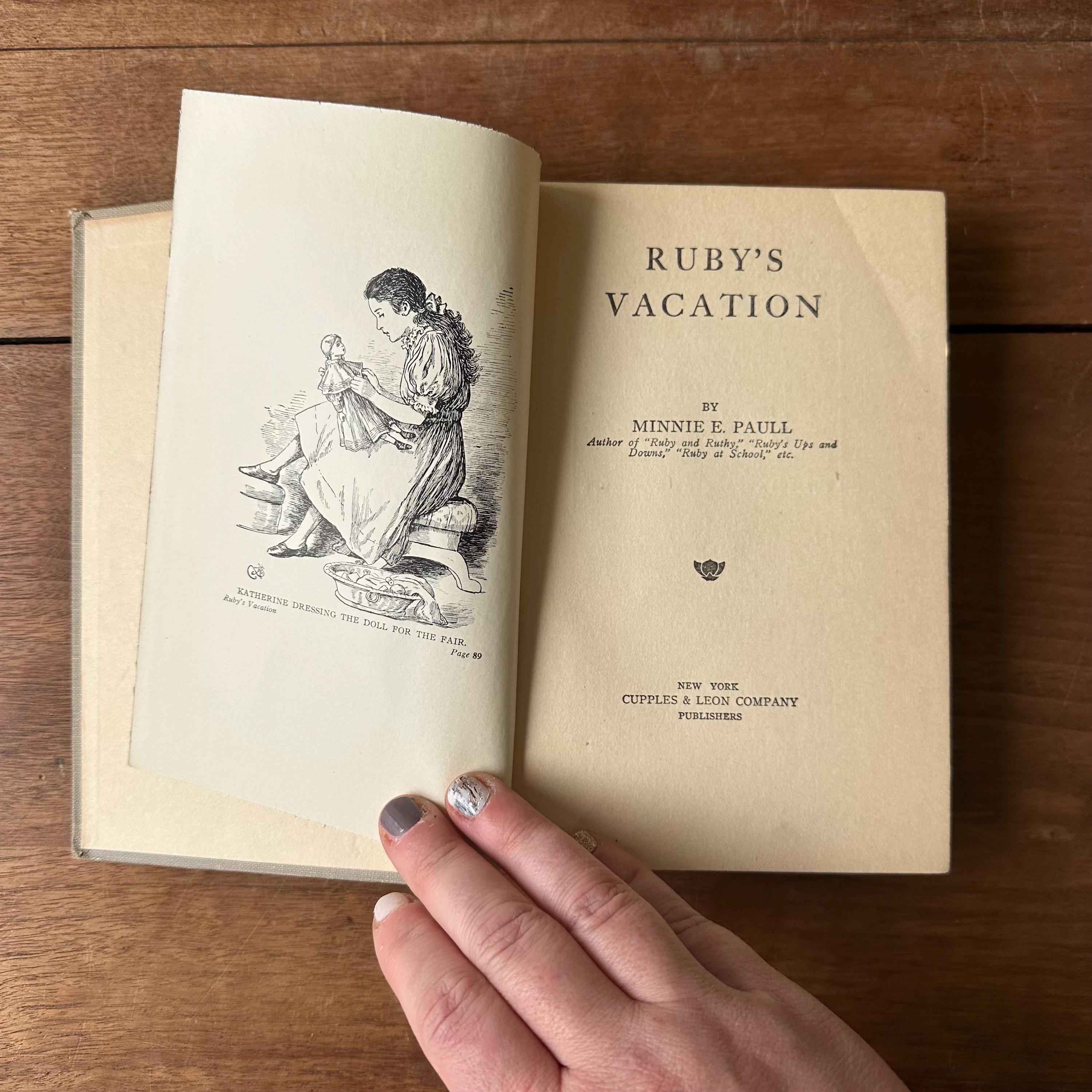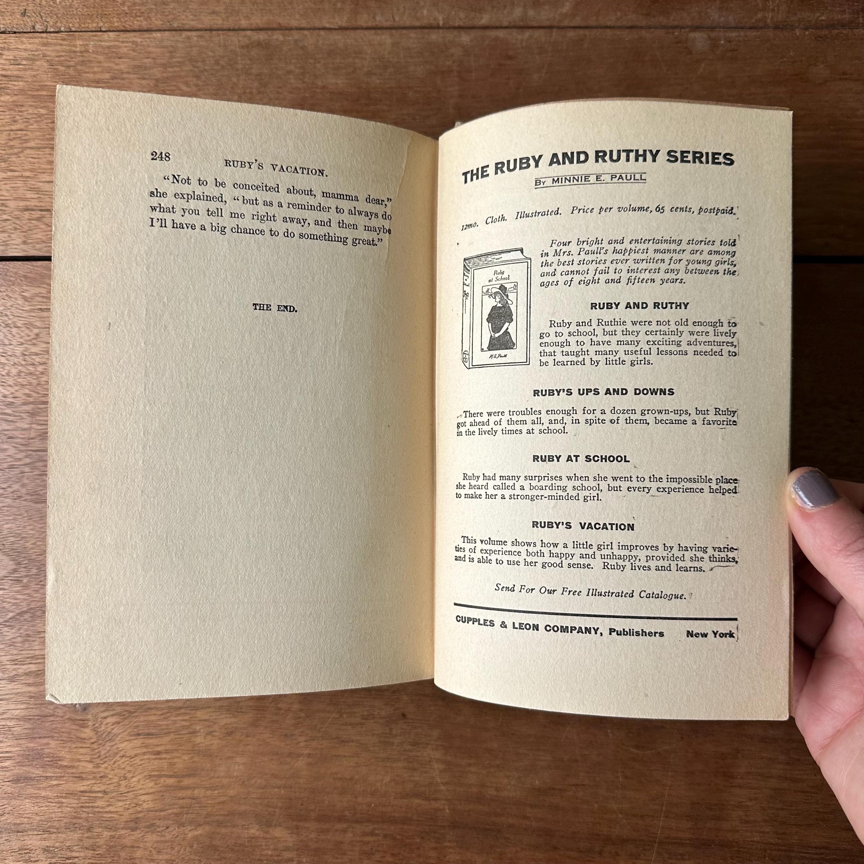 This is the antique 1917 edition of Ruby's Vacation in the Ruby and Ruthie Series by Minnie E. Paull. It has grey linen covers with red lettering and a red and black illustrated portrait of Ruby on the cover. The spine is also lettered in red with an illustration of a small bow. There is one black and white illustration plate of Ruby at the title page. There are 248 pages with several additional pages of illustrations.