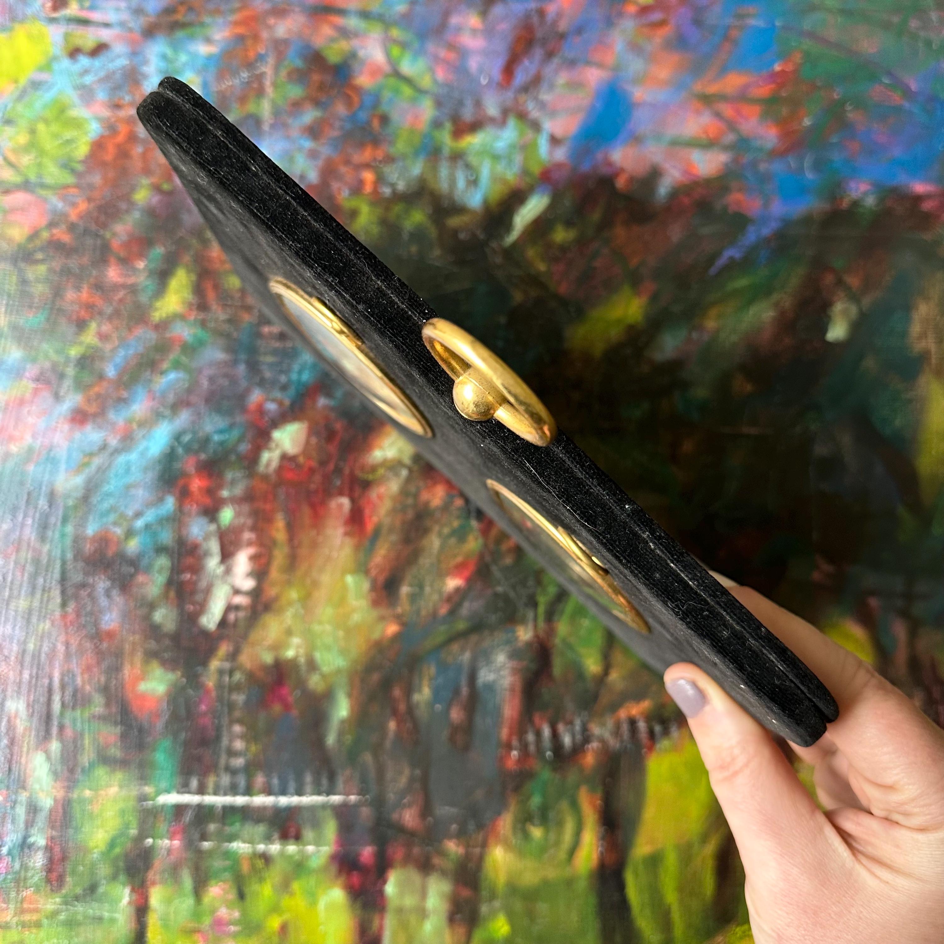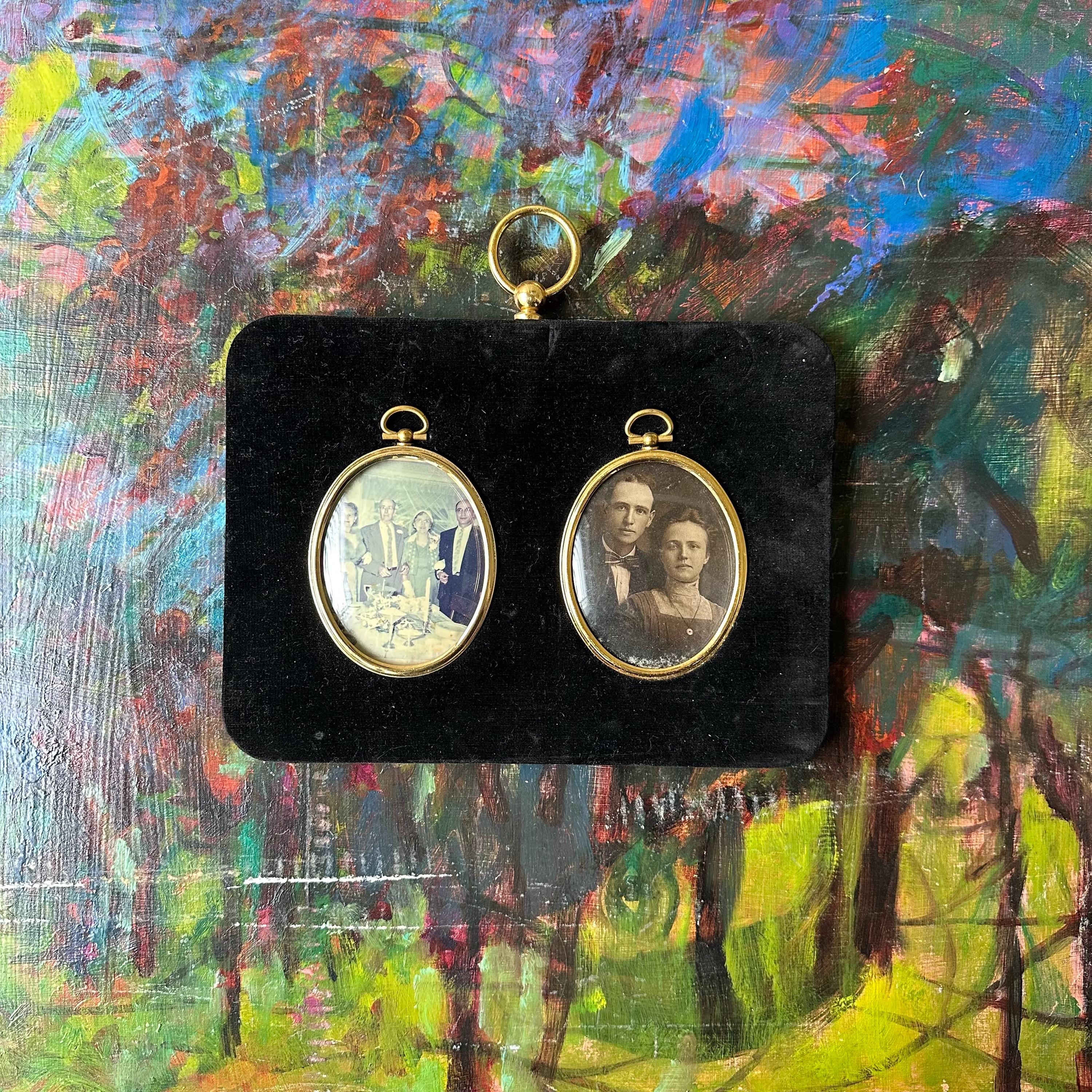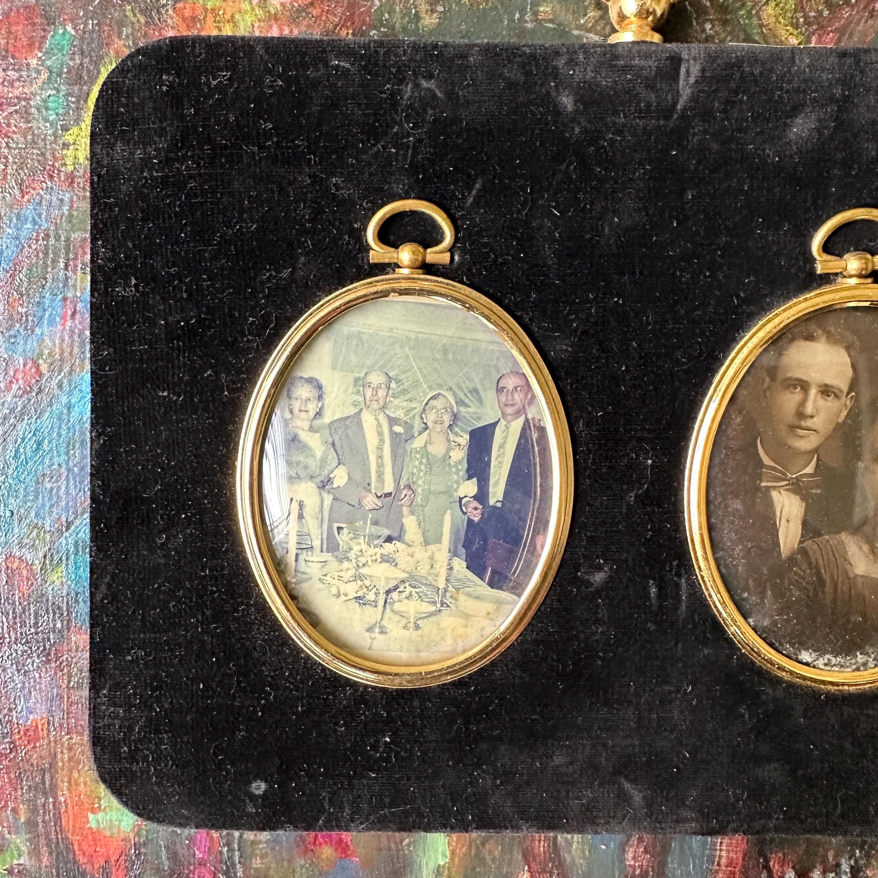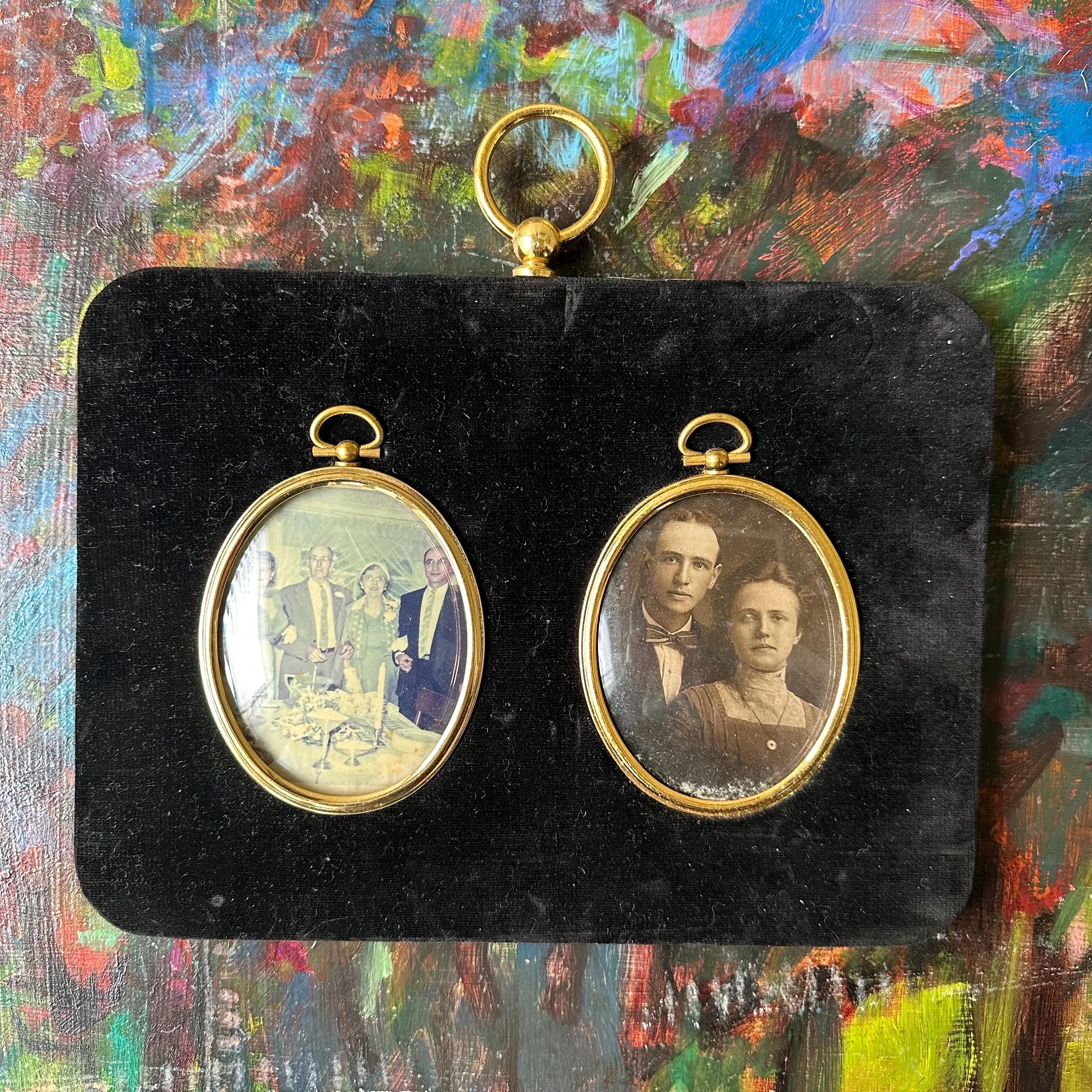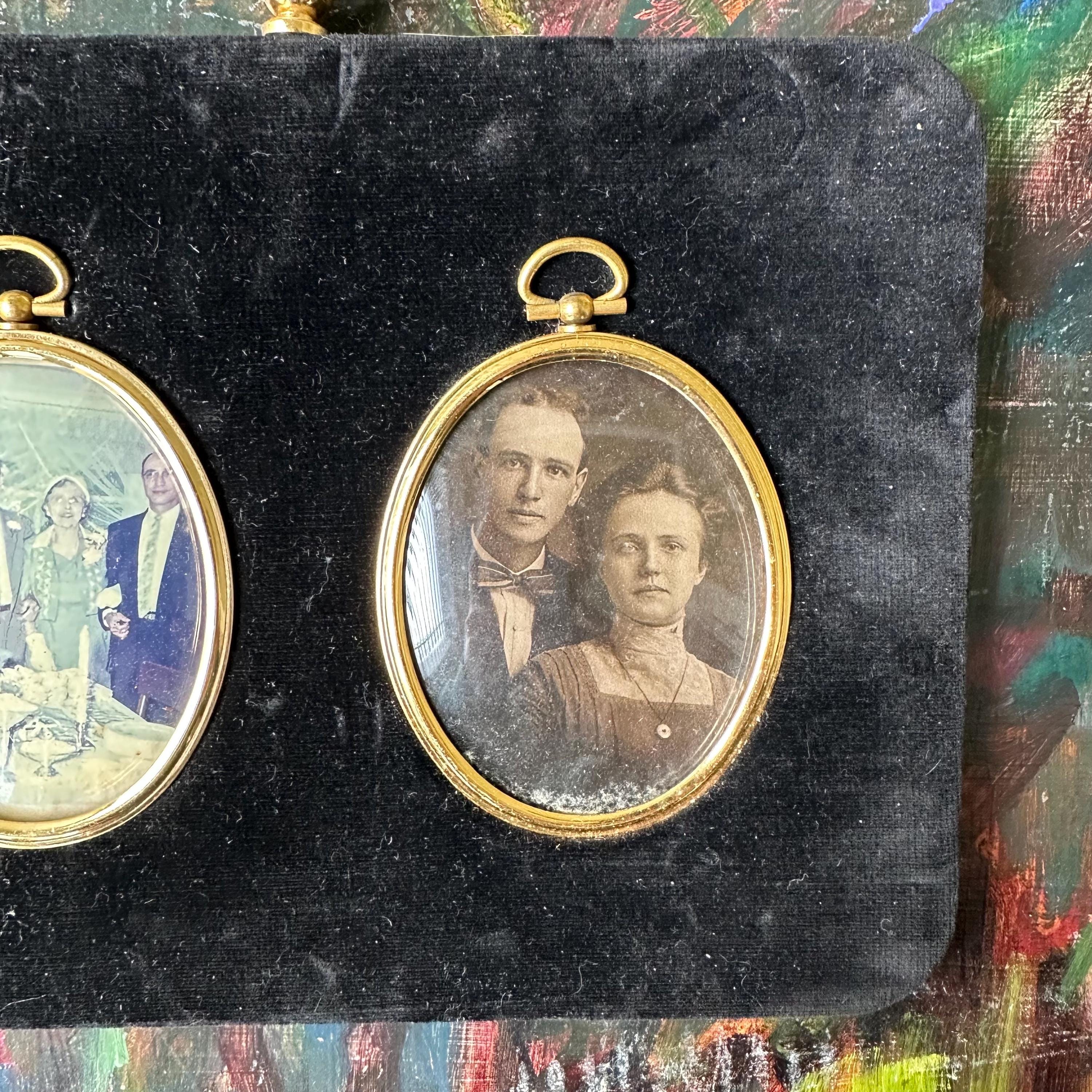 This is a black velvet, double oval photo frame. The frame is wood covered with black velvet. In the center of the frame, there are two gold metal oval frames with loops at the top and glass covers. The top of the frame has another gold decorative loop, and the actual loop to hang the frame is on the back. There are currently two vintage photographs in the frame - a full color one to the left and a black and white one to the right. It appears to be the same couple in both photos. The photos can be removed by lifting up on the loop at the top of each oval. The backing underneath is yellow textured silk.