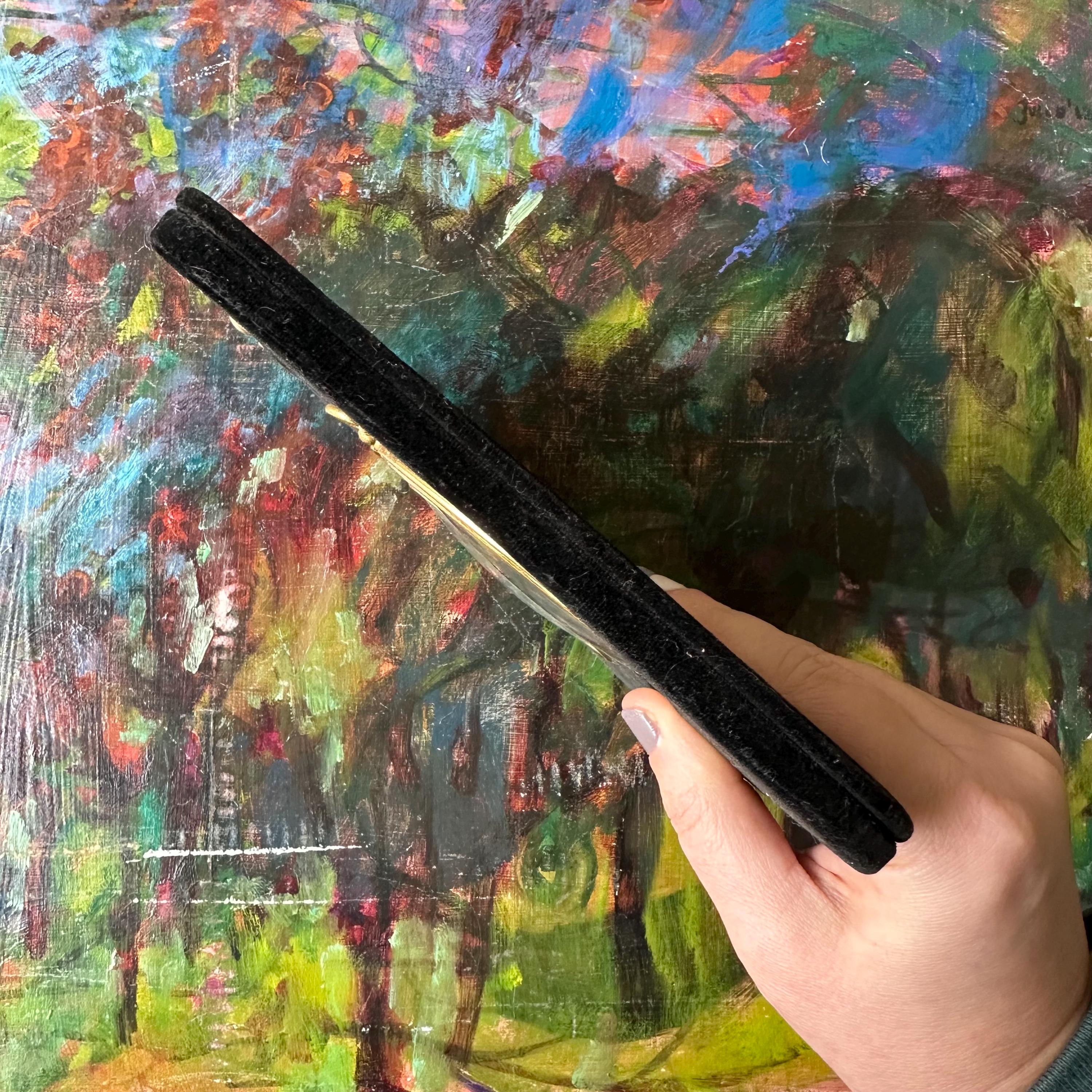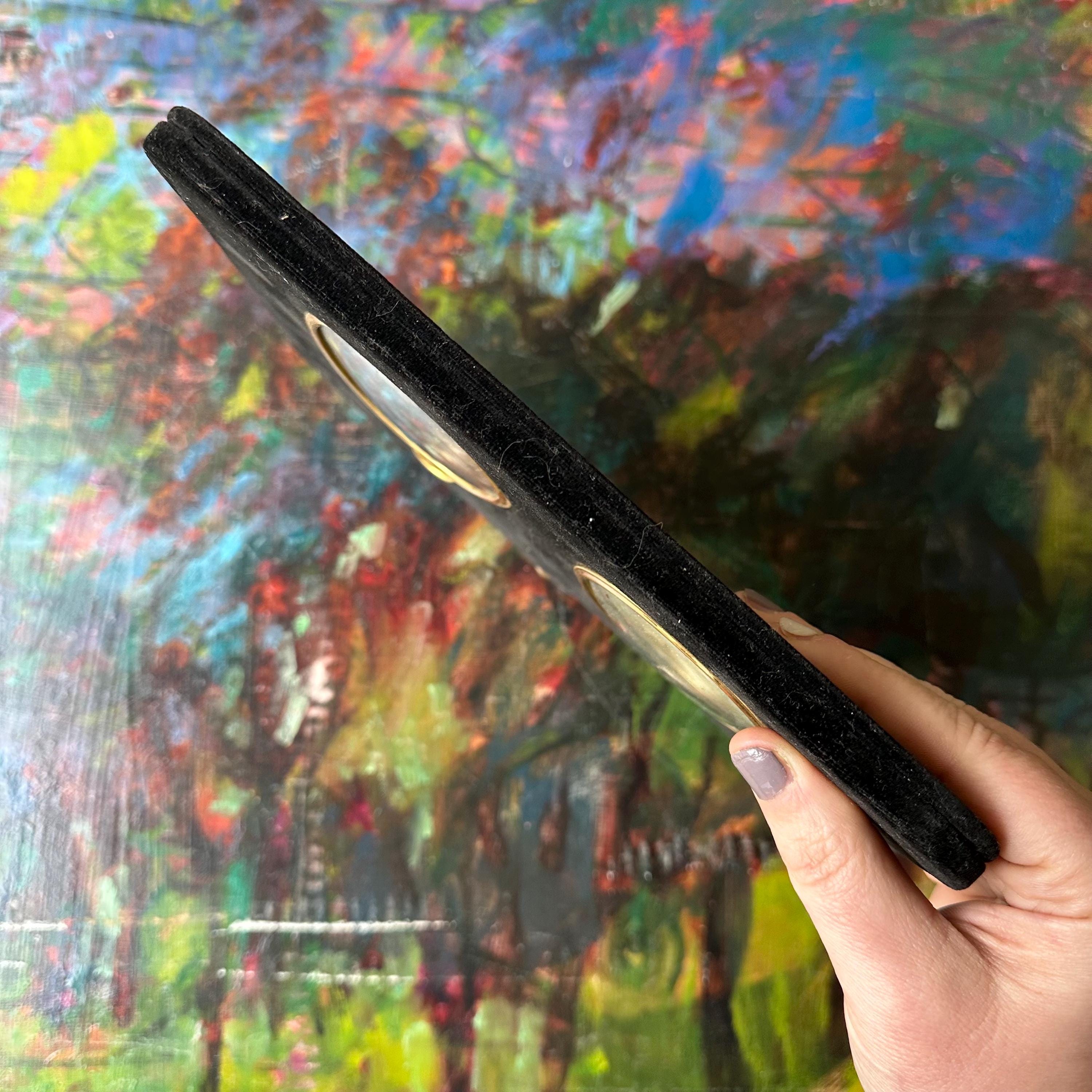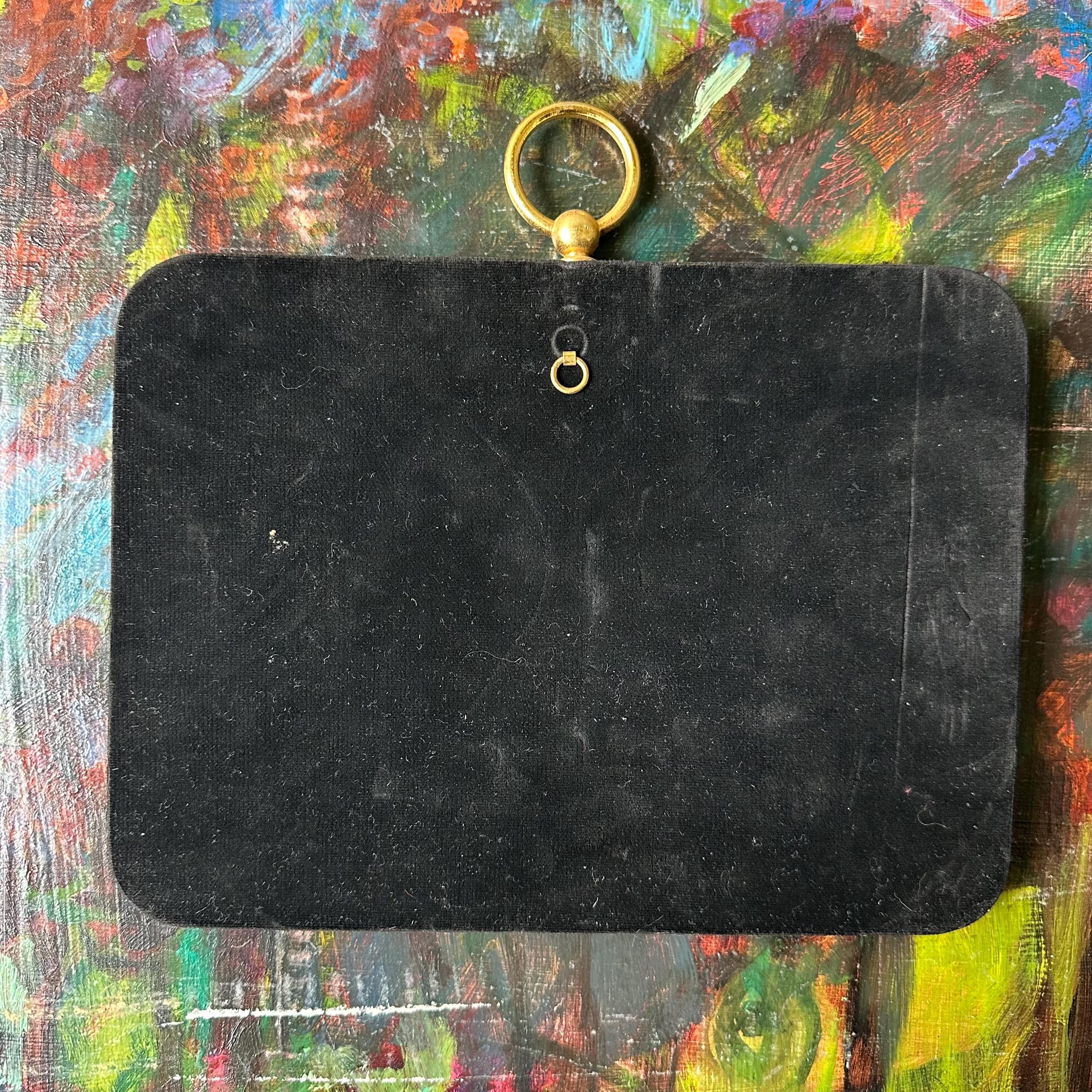The frame is in good vintage condition for its age and use. The velvet has some fading and discoloration, especially to the right side. It does attract dust like a magnet, but it brushes off easily. The frames have some slight darkening with some very small tarnish spots. The full color photo has faded. The top decorative loop is loose, so it is only recommended to hang it by the loop on the back which is still solidly attached.