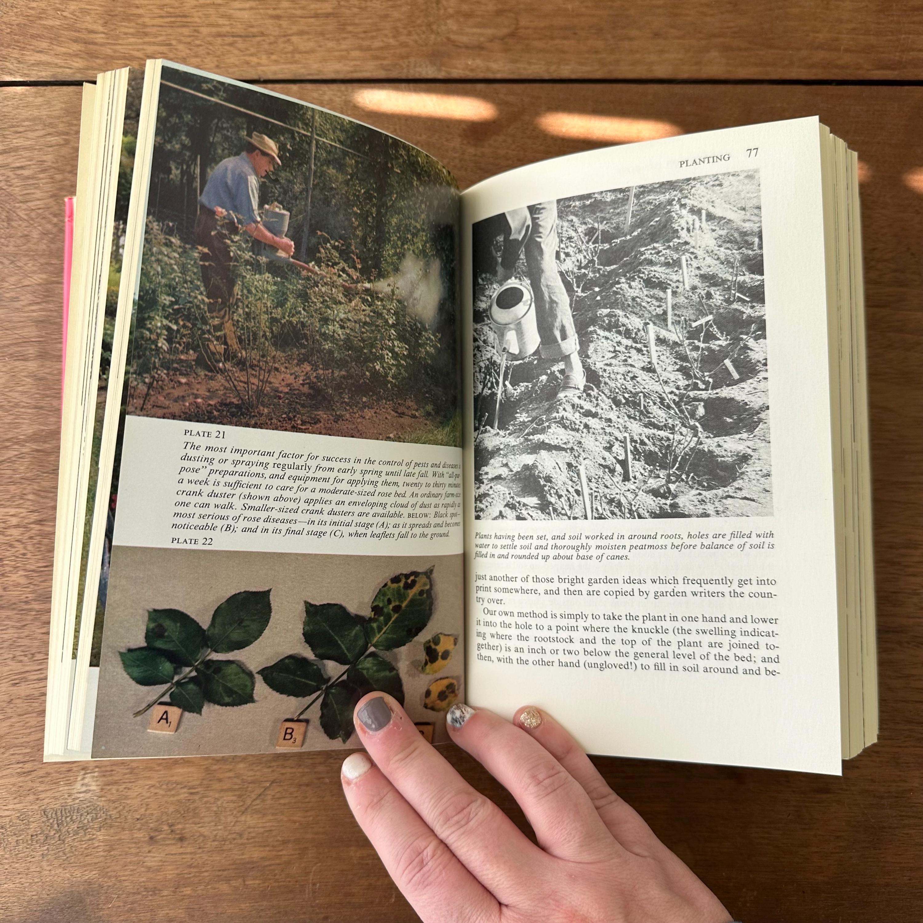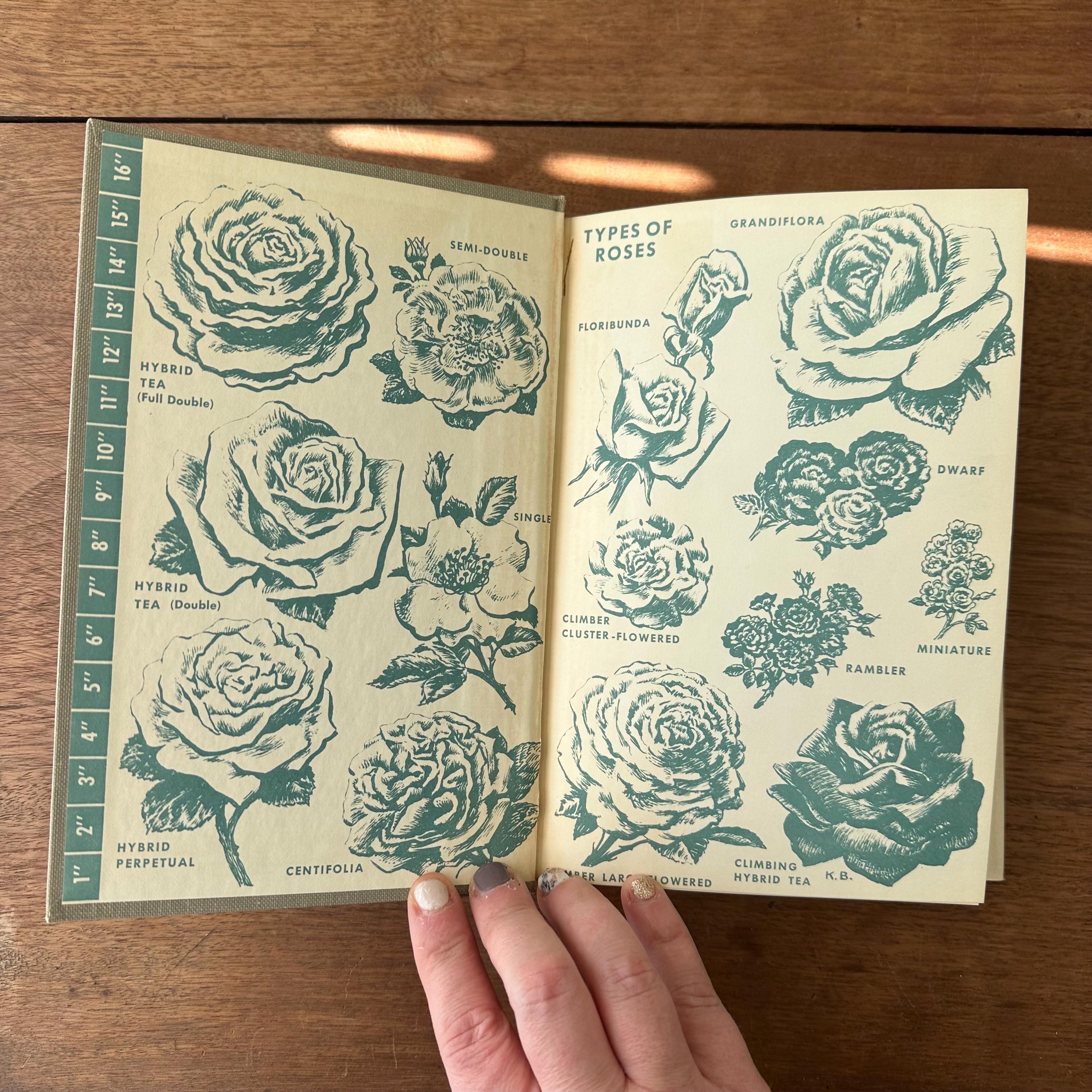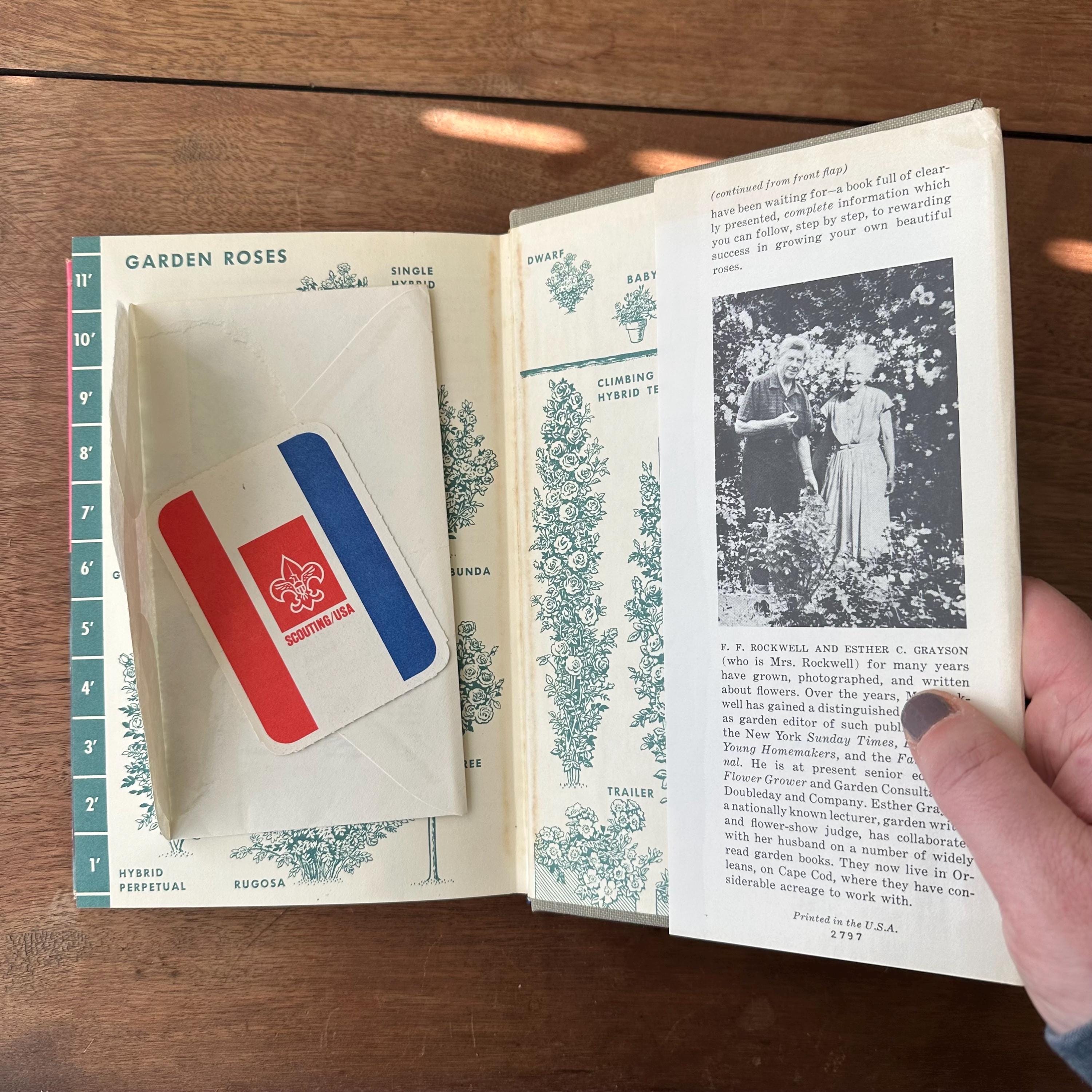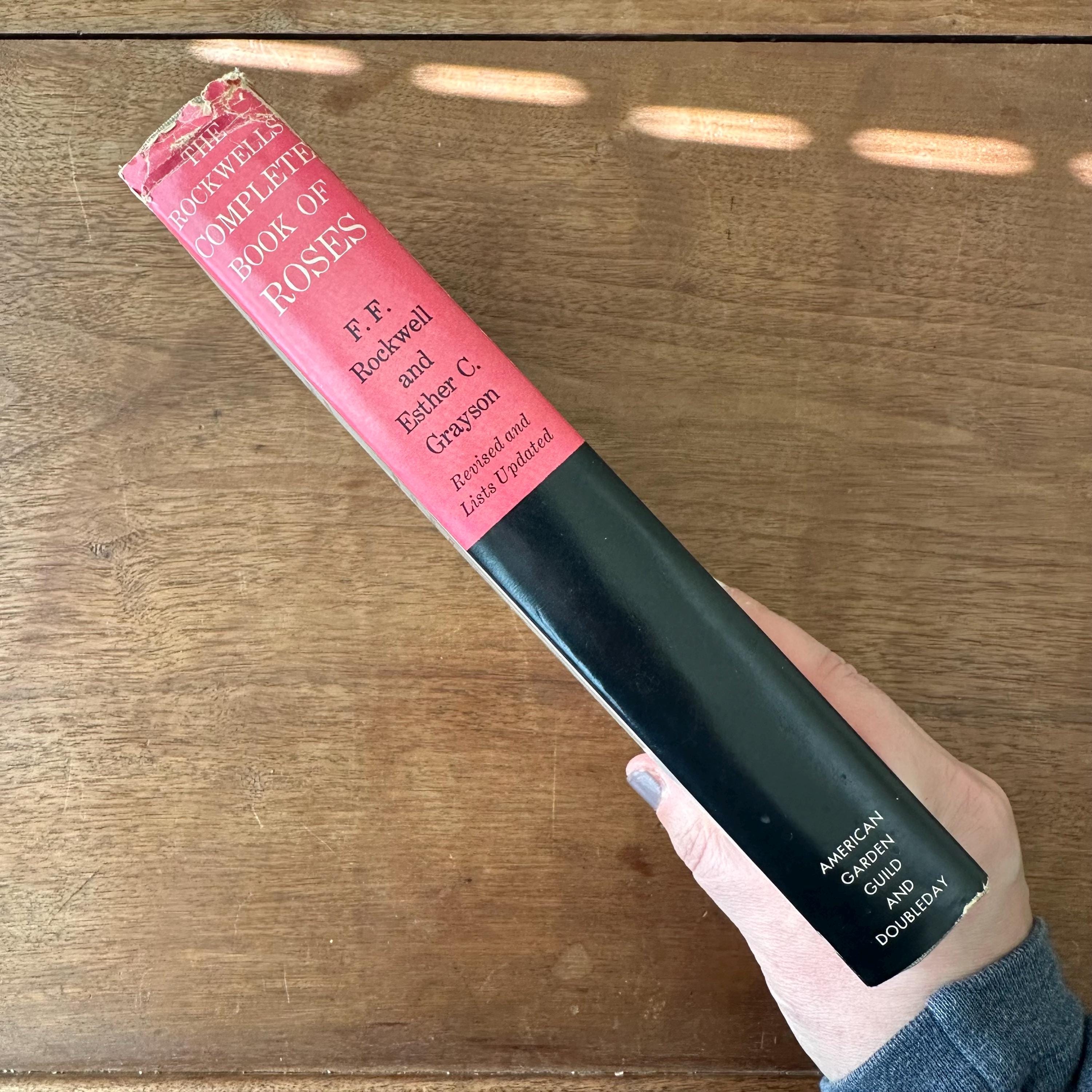 This is the 1966 revised and updated edition of The Rockwells' Complete Book of Roses by F.F. Rockwell and Esther C. Grayson, published by Doubleday & Company. The book has the original full color dust jacket in pink, blue, and black with a photo of red roses . The book cover underneath is gray with blue decorating and silver lettering and details. Both the inside front and back covers are illustrated with types of roses. There are three parts with 24 chapters, as well as numerous half-tone, line, and color illustrations. There are 332 pages.