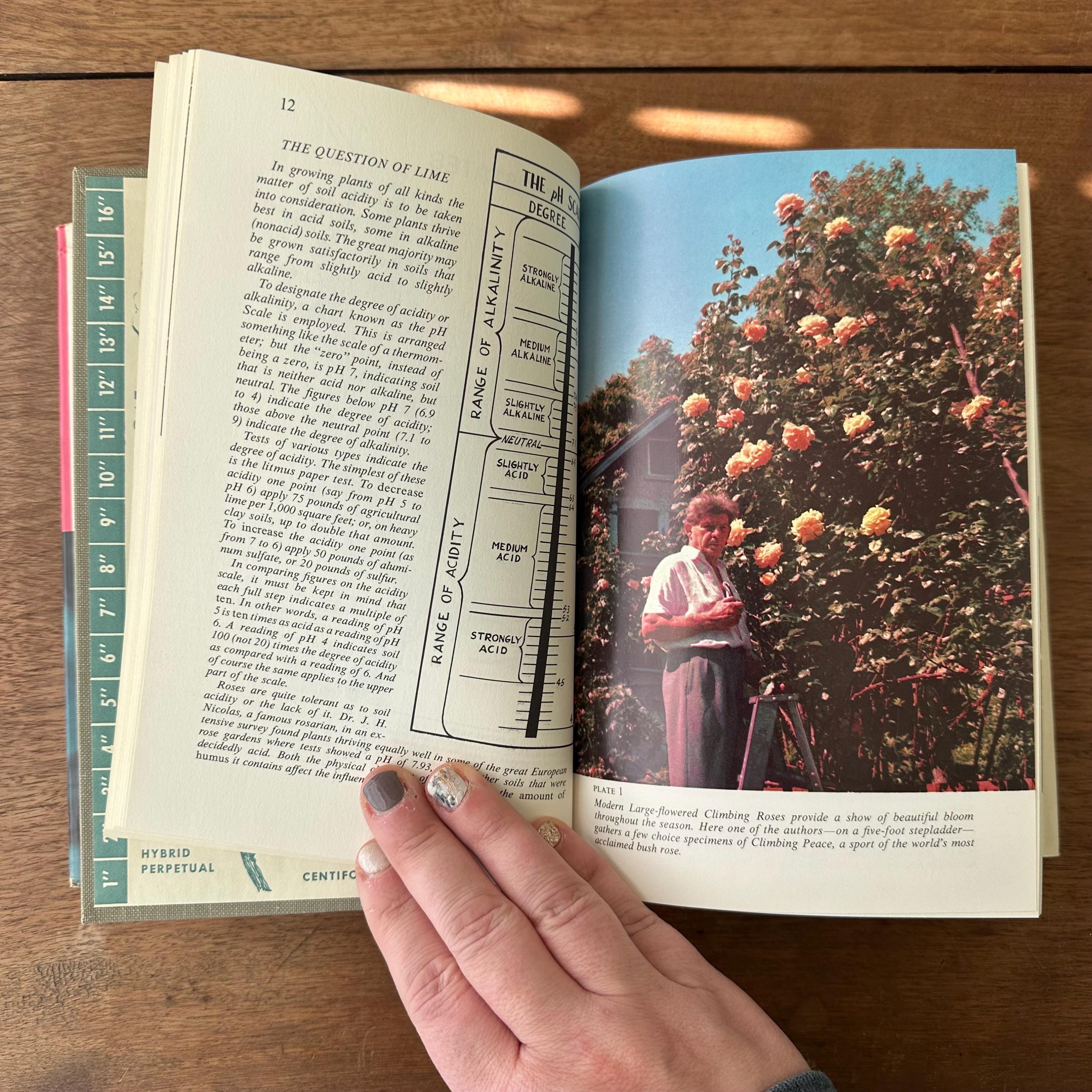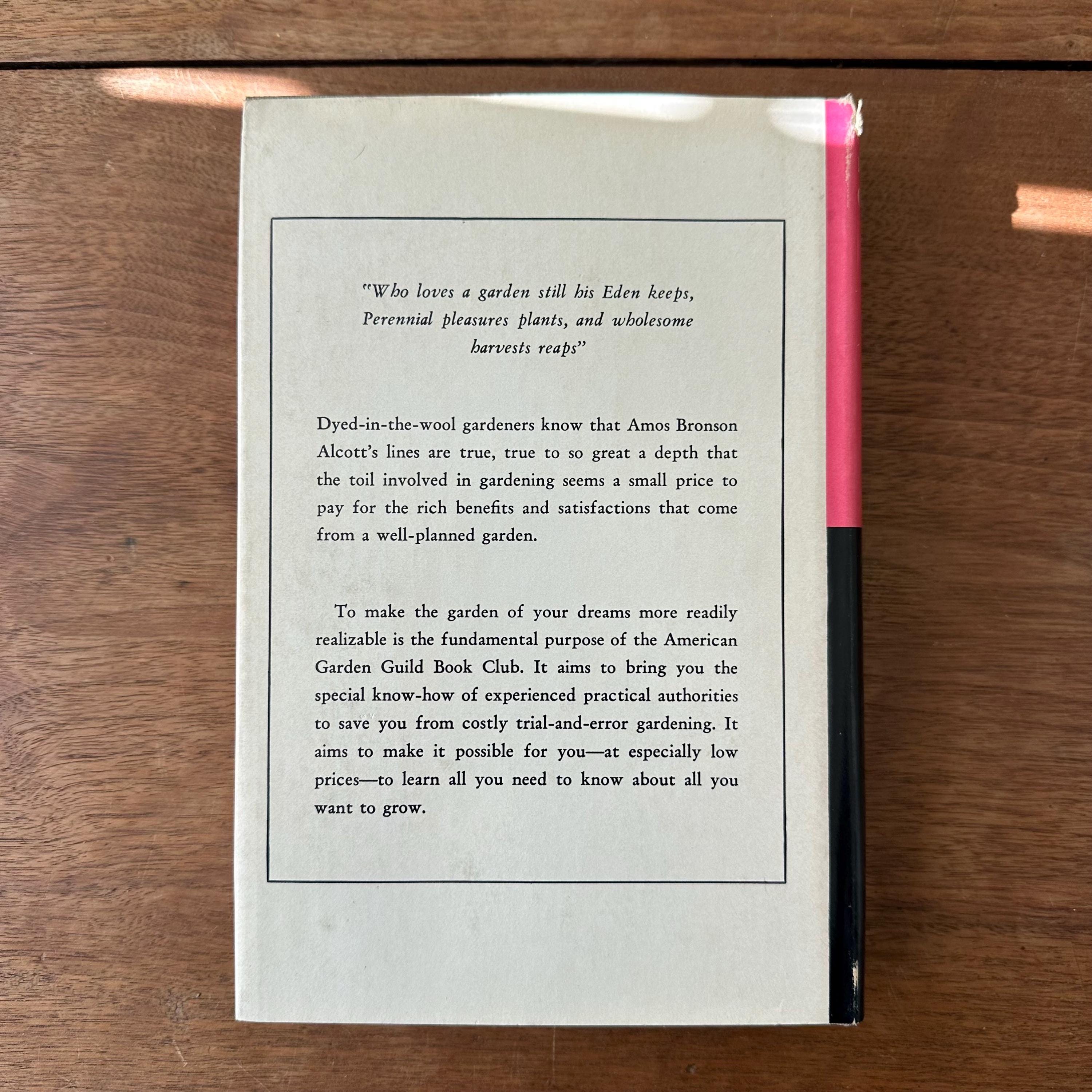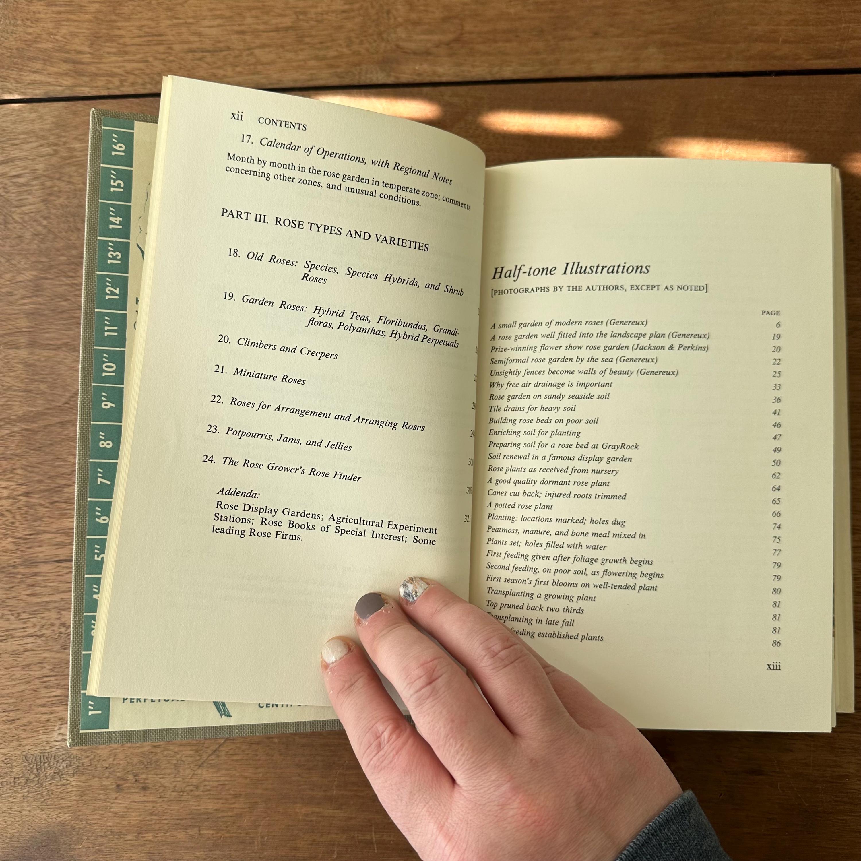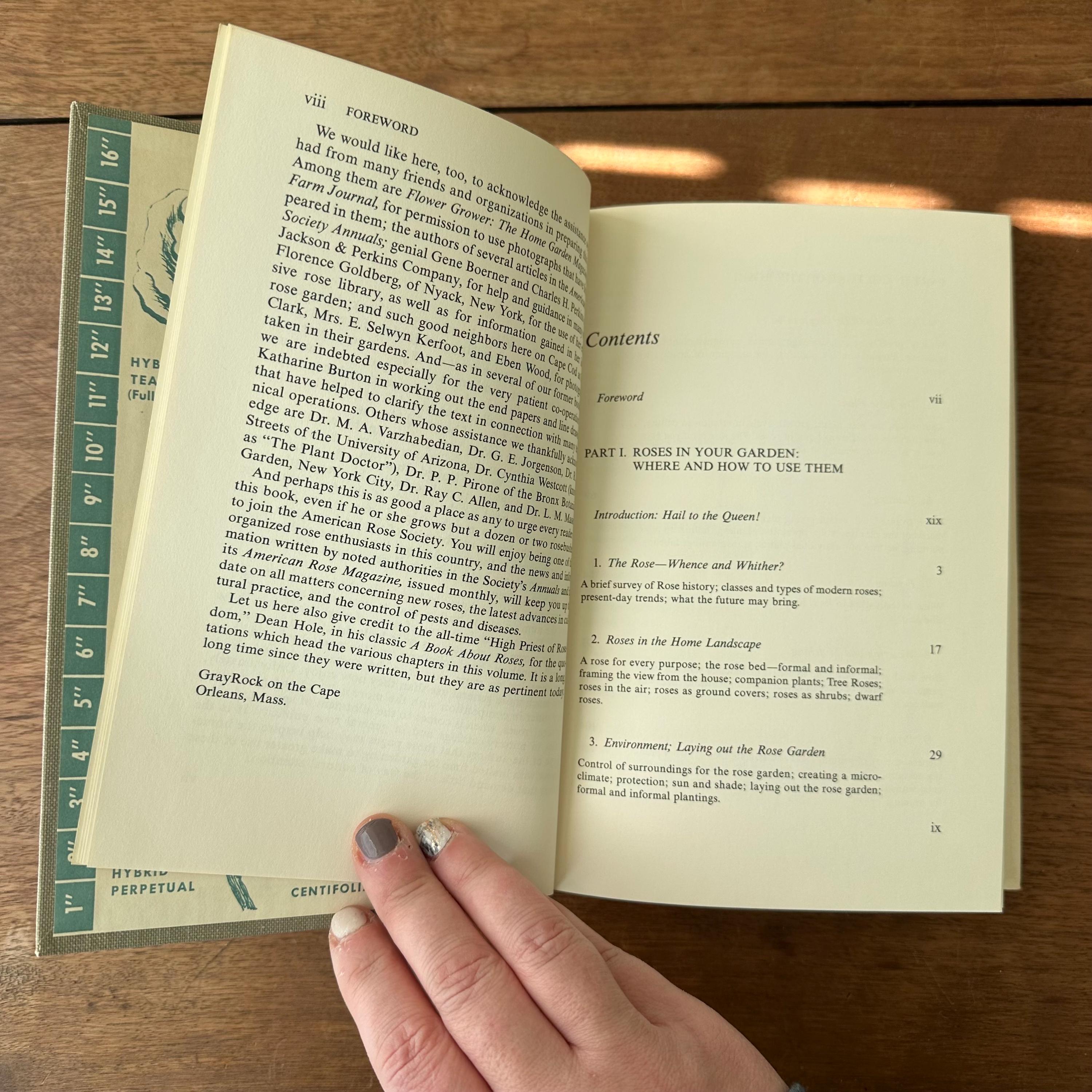 This is the 1966 revised and updated edition of The Rockwells' Complete Book of Roses by F.F. Rockwell and Esther C. Grayson, published by Doubleday & Company. The book has the original full color dust jacket in pink, blue, and black with a photo of red roses . The book cover underneath is gray with blue decorating and silver lettering and details. Both the inside front and back covers are illustrated with types of roses. There are three parts with 24 chapters, as well as numerous half-tone, line, and color illustrations. There are 332 pages.