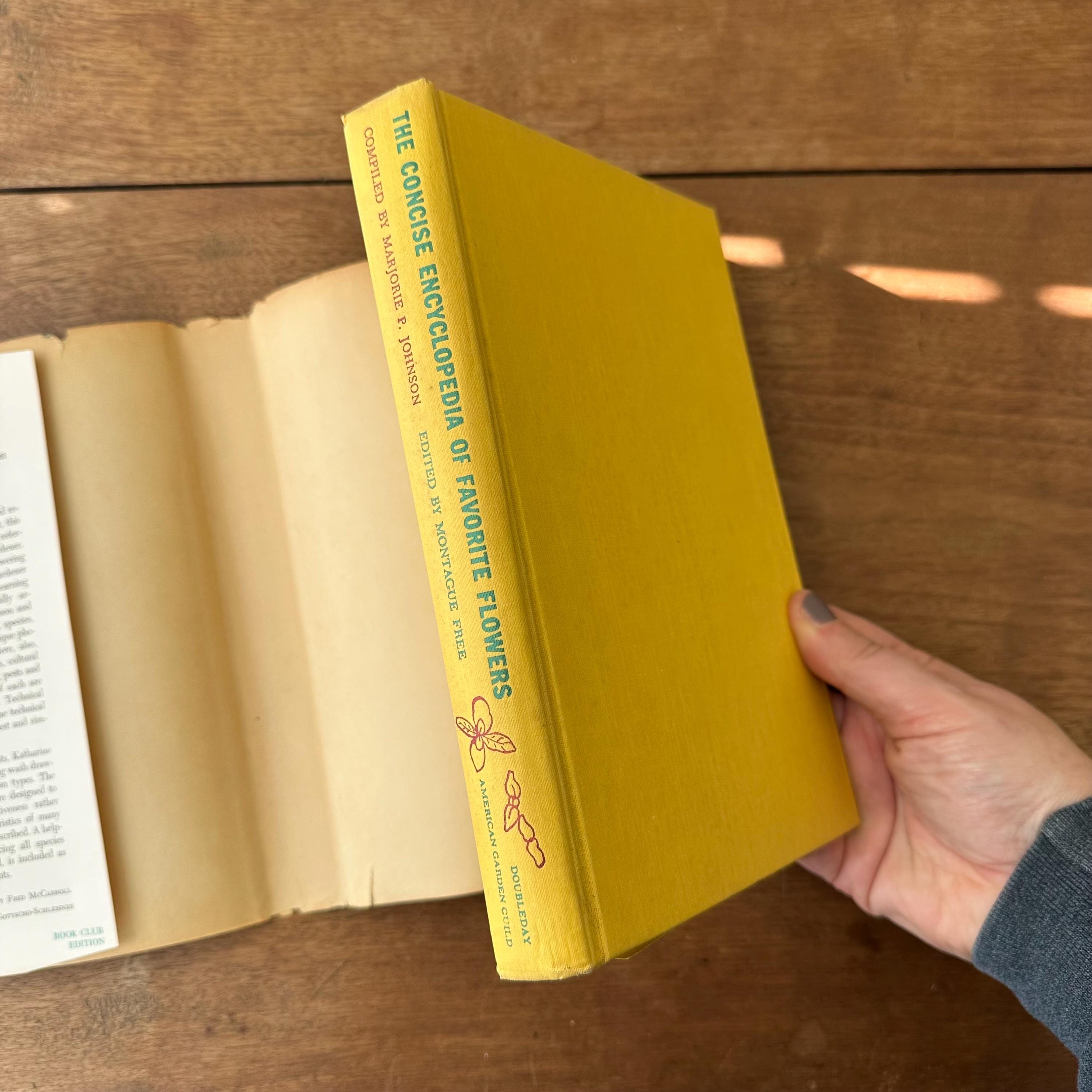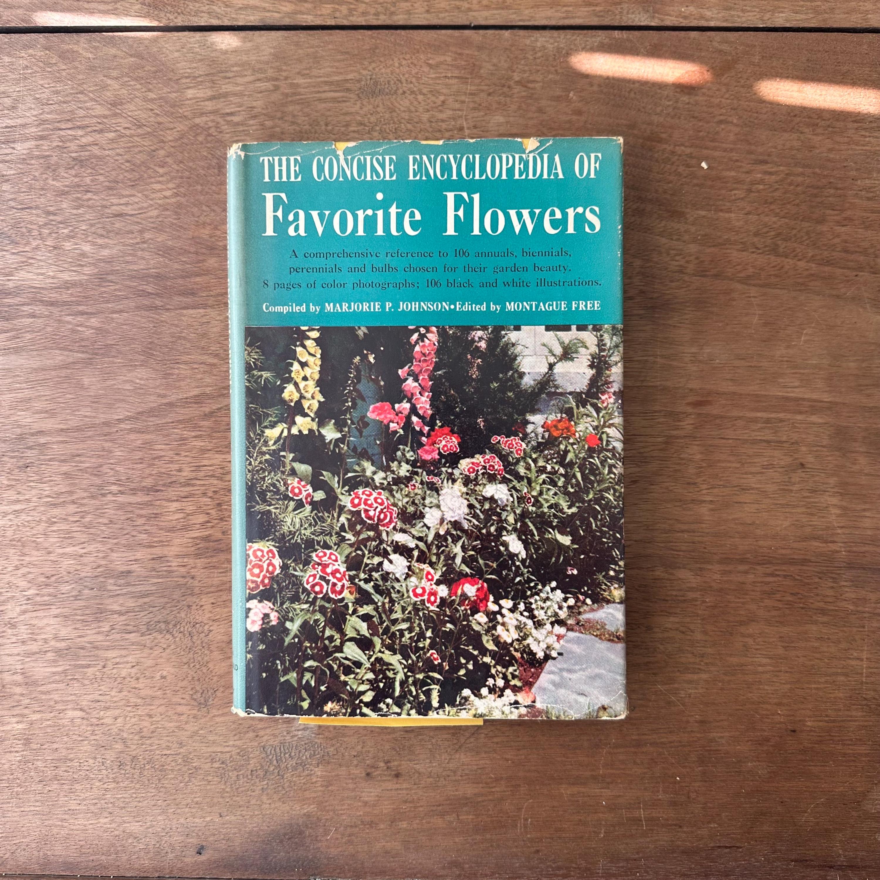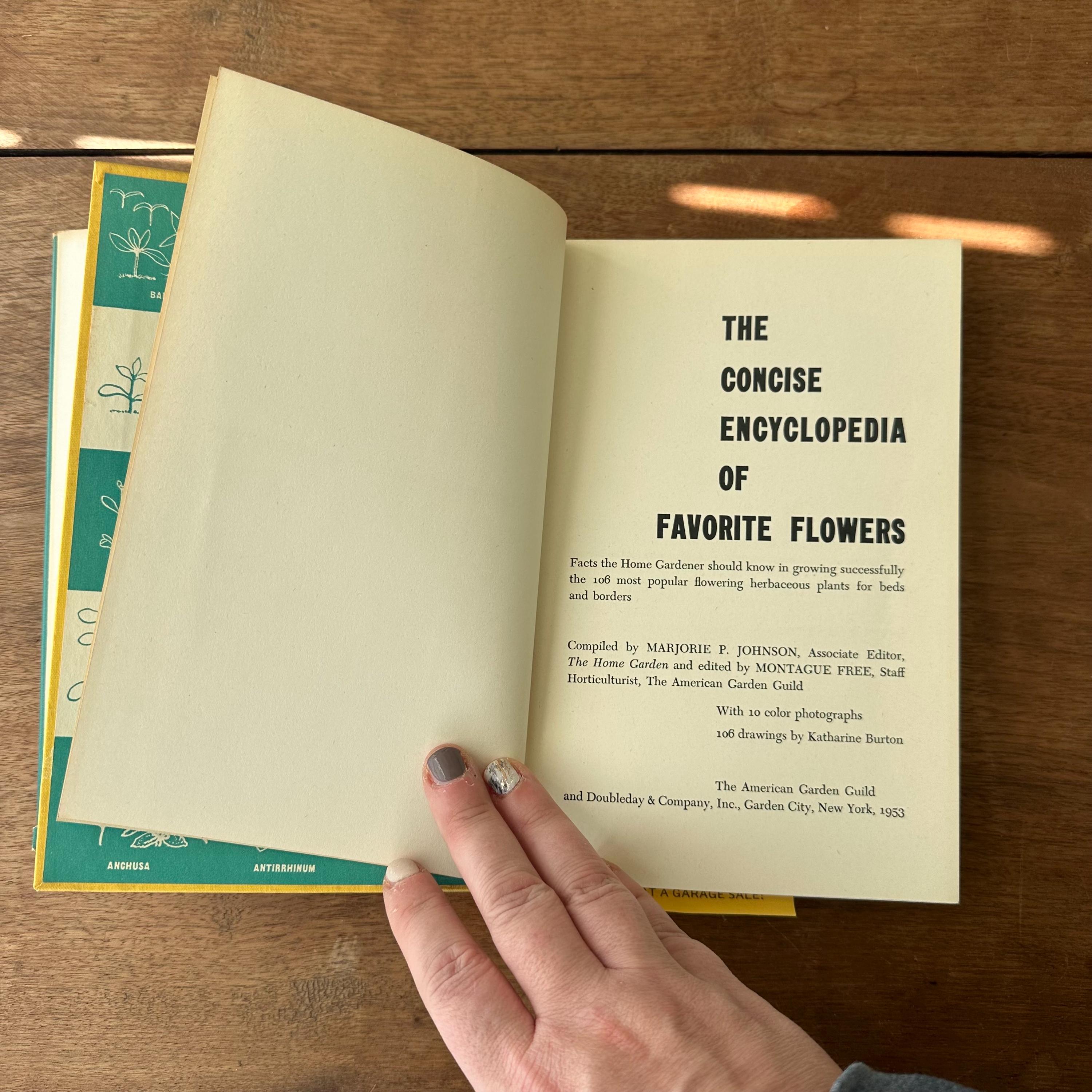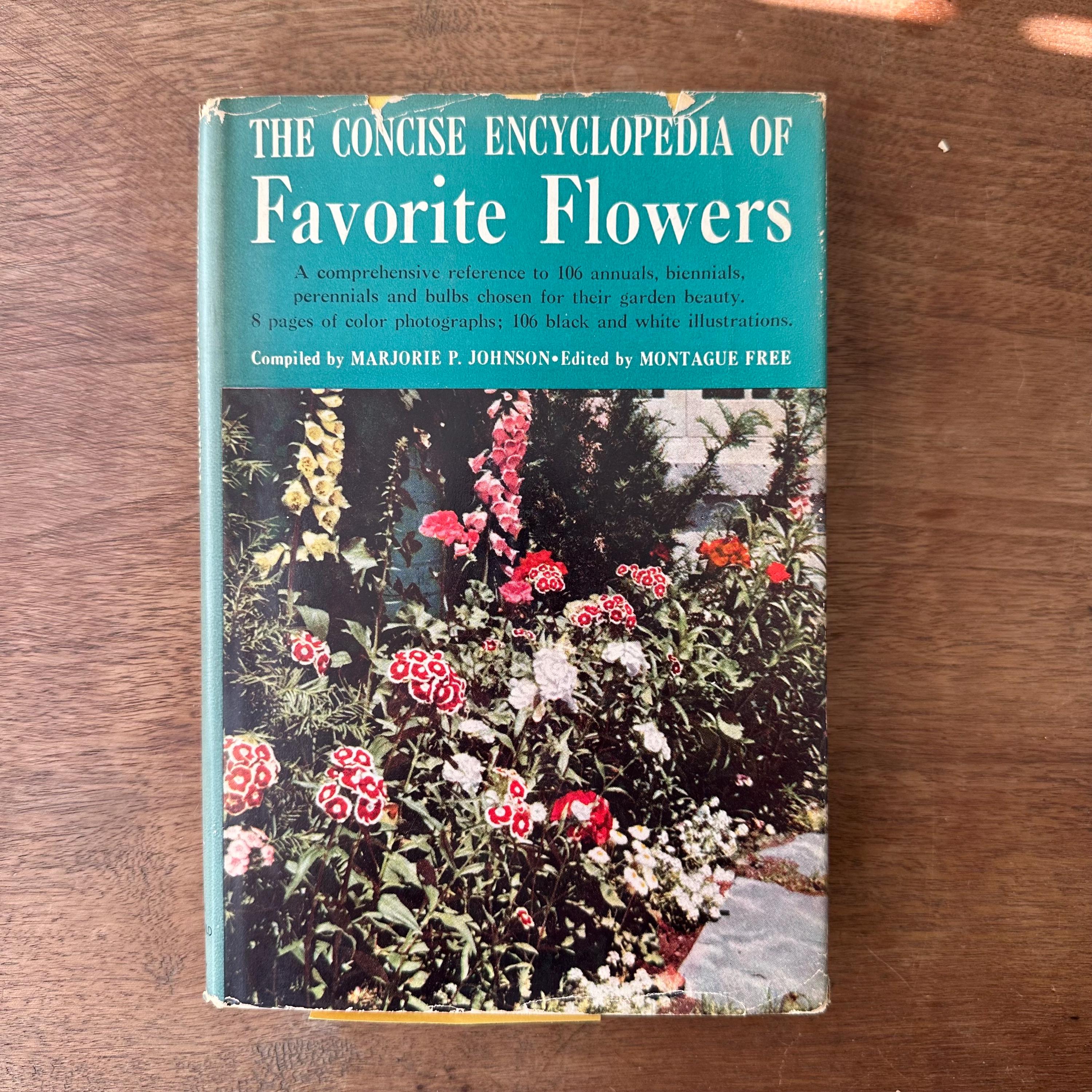 This the 1953 edition of The Concise Encylopedia of Favorite Flowers compiled by Marjorie P. Johnson, edited by Montague Free, and published by The American Garden Guild and Doubleday & Company. It has its original full color dust jacket with turquoise spine and flower photo on the front. The book covers underneath are yellow with green lettering and red-line flower illustrations. The endpapers are white and turquoise illustrated seedlings. The book is illustrated with both full-color photographs and black-line illustrations. There are 256 pages.
