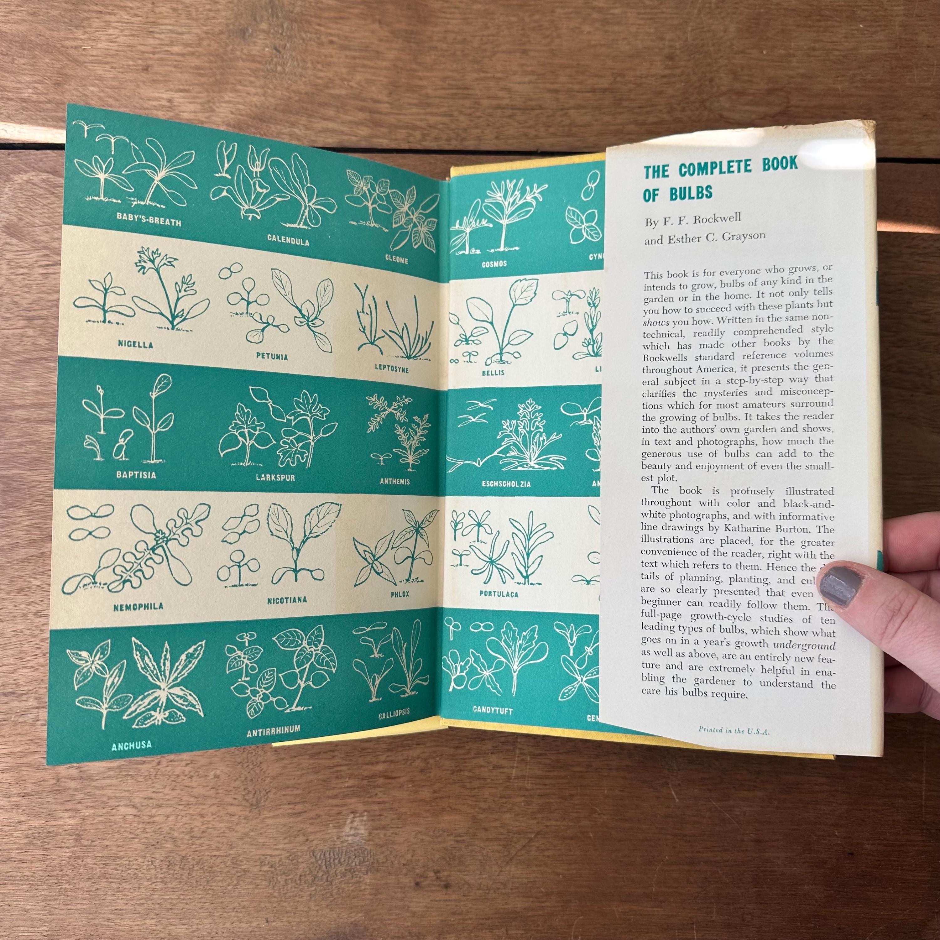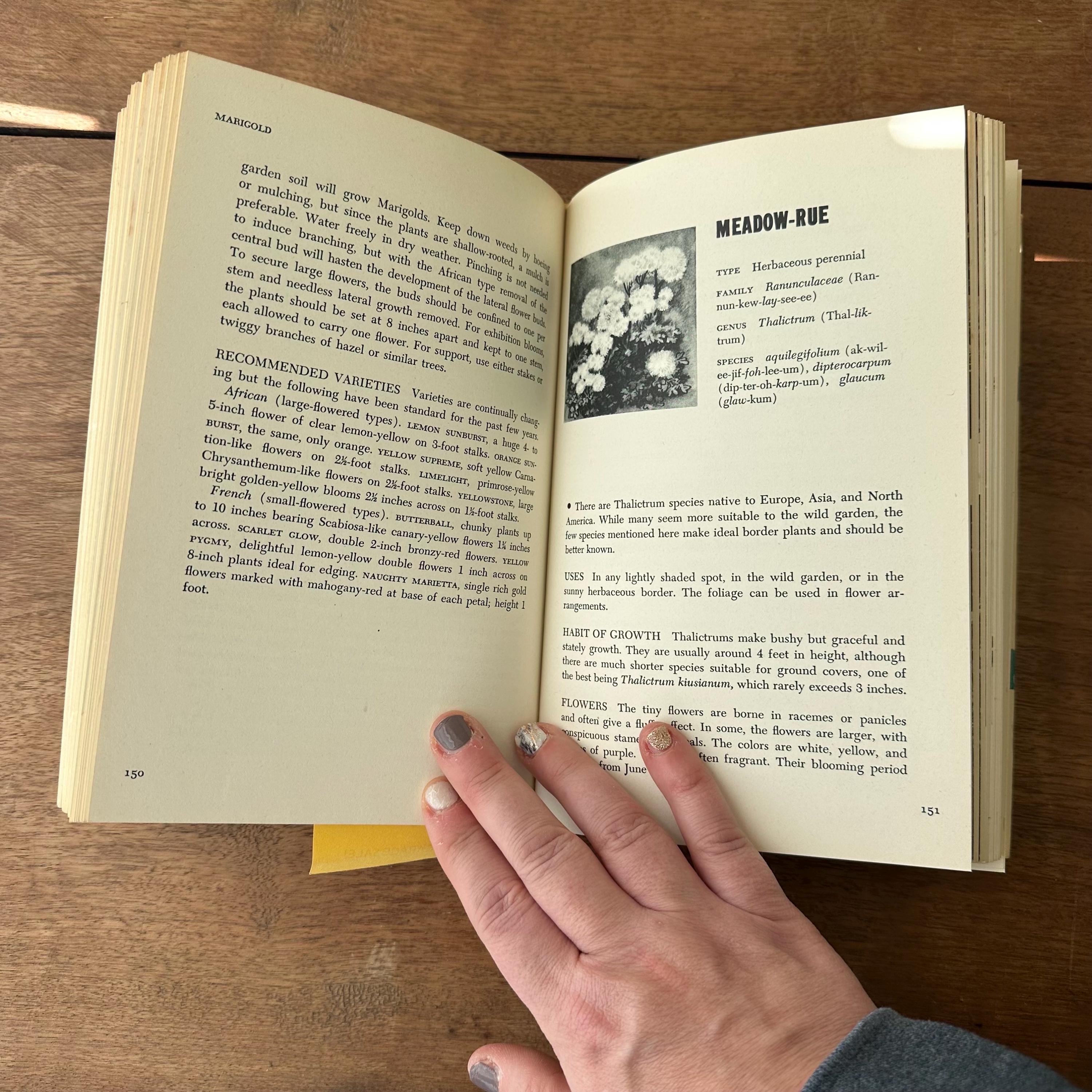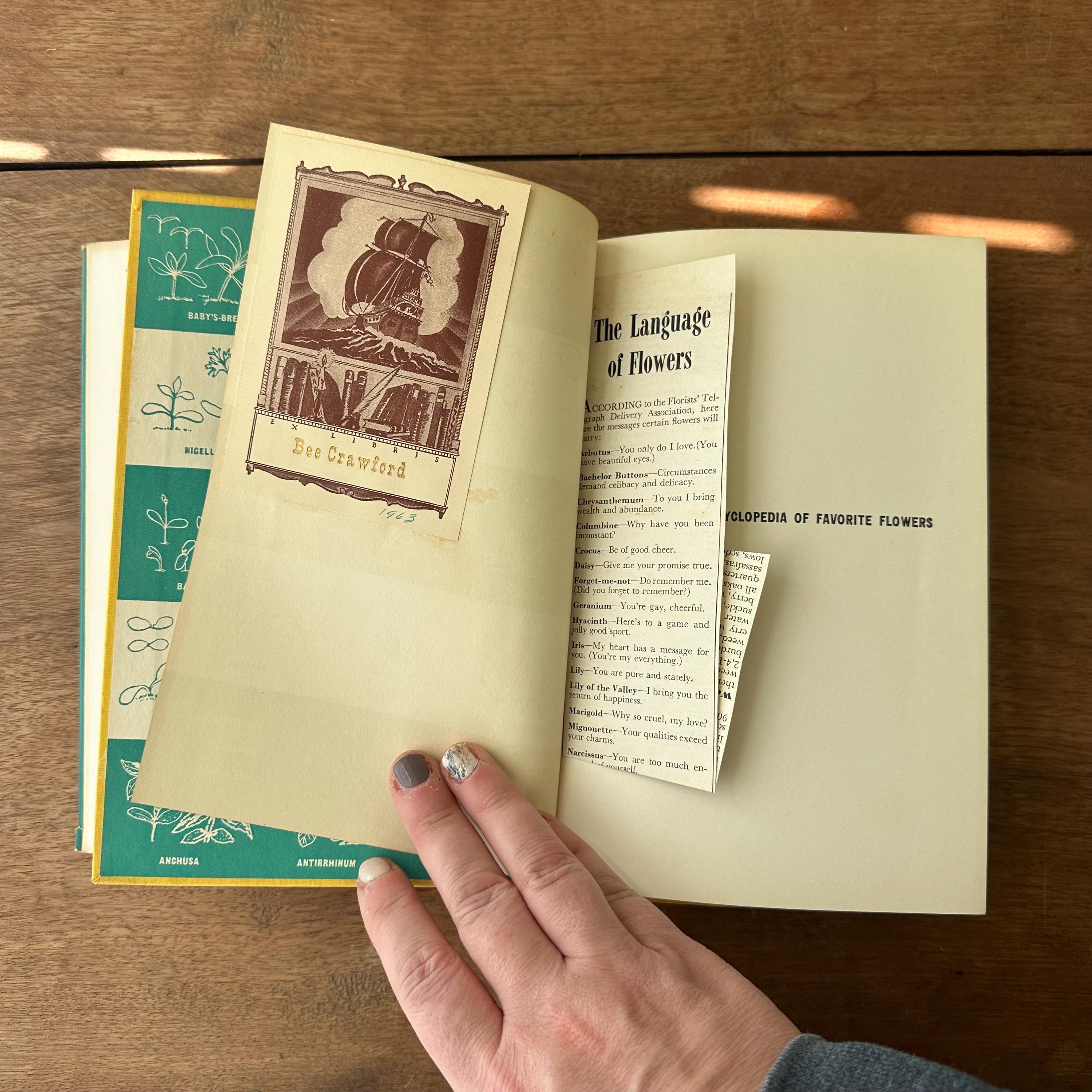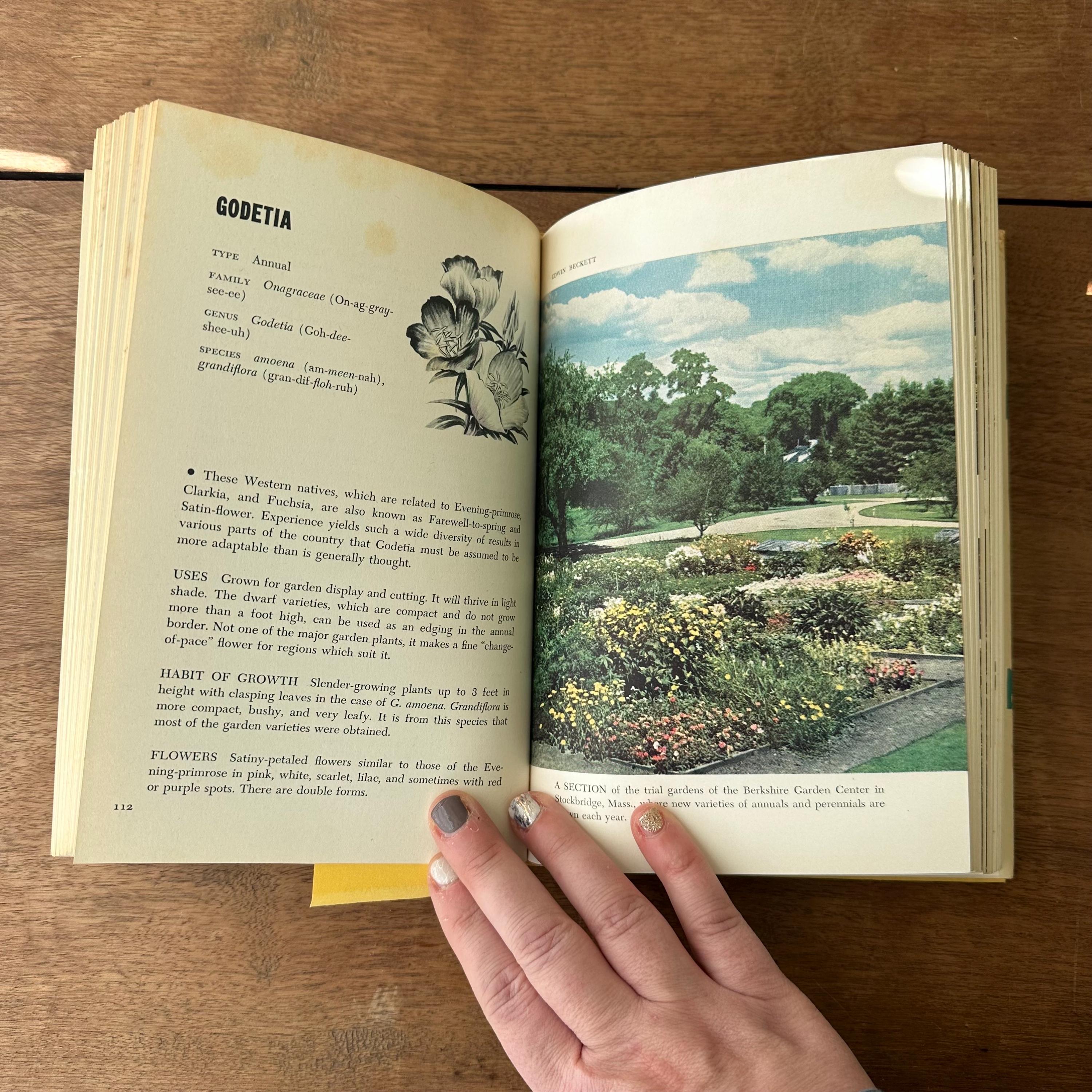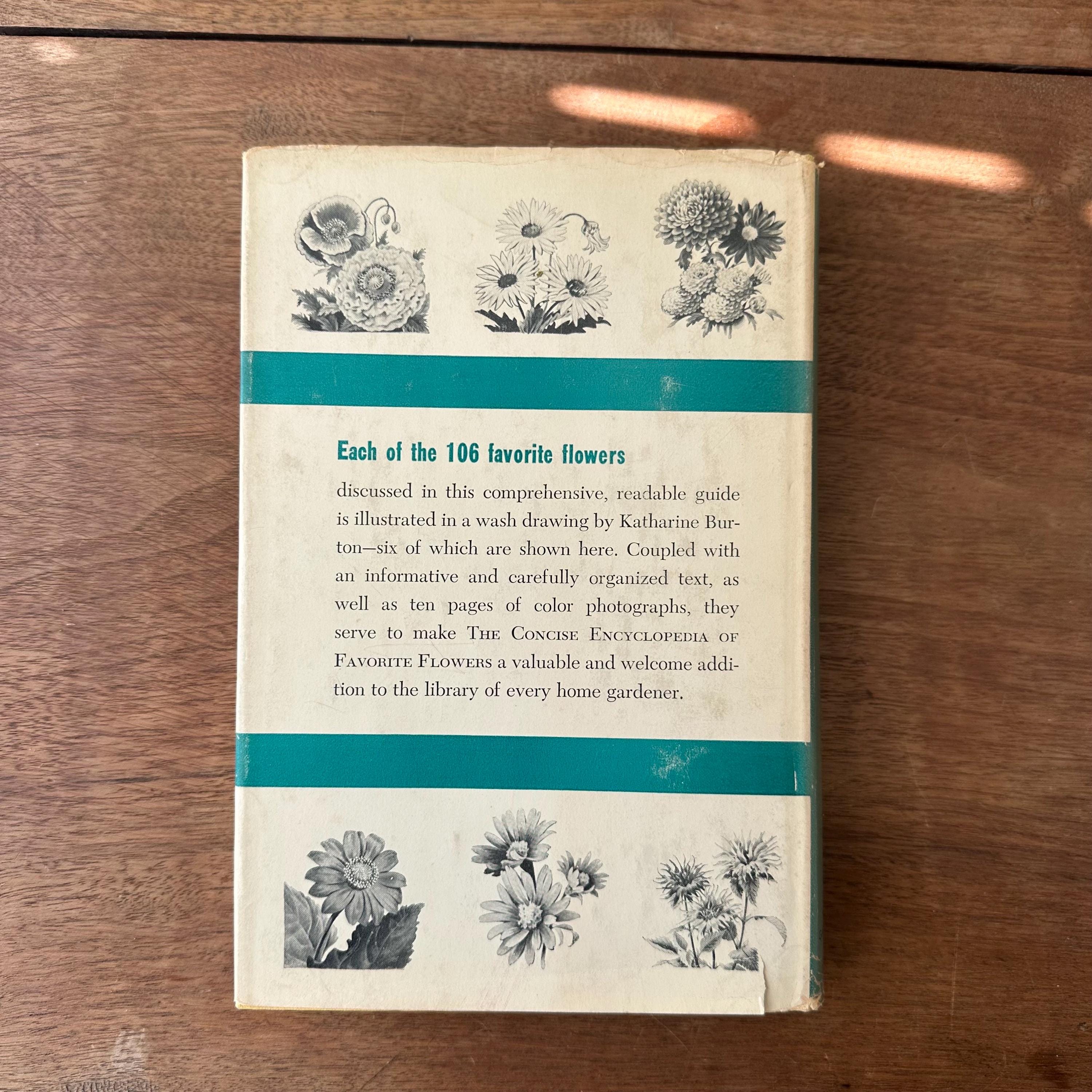 This the 1953 edition of The Concise Encylopedia of Favorite Flowers compiled by Marjorie P. Johnson, edited by Montague Free, and published by The American Garden Guild and Doubleday & Company. It has its original full color dust jacket with turquoise spine and flower photo on the front. The book covers underneath are yellow with green lettering and red-line flower illustrations. The endpapers are white and turquoise illustrated seedlings. The book is illustrated with both full-color photographs and black-line illustrations. There are 256 pages.