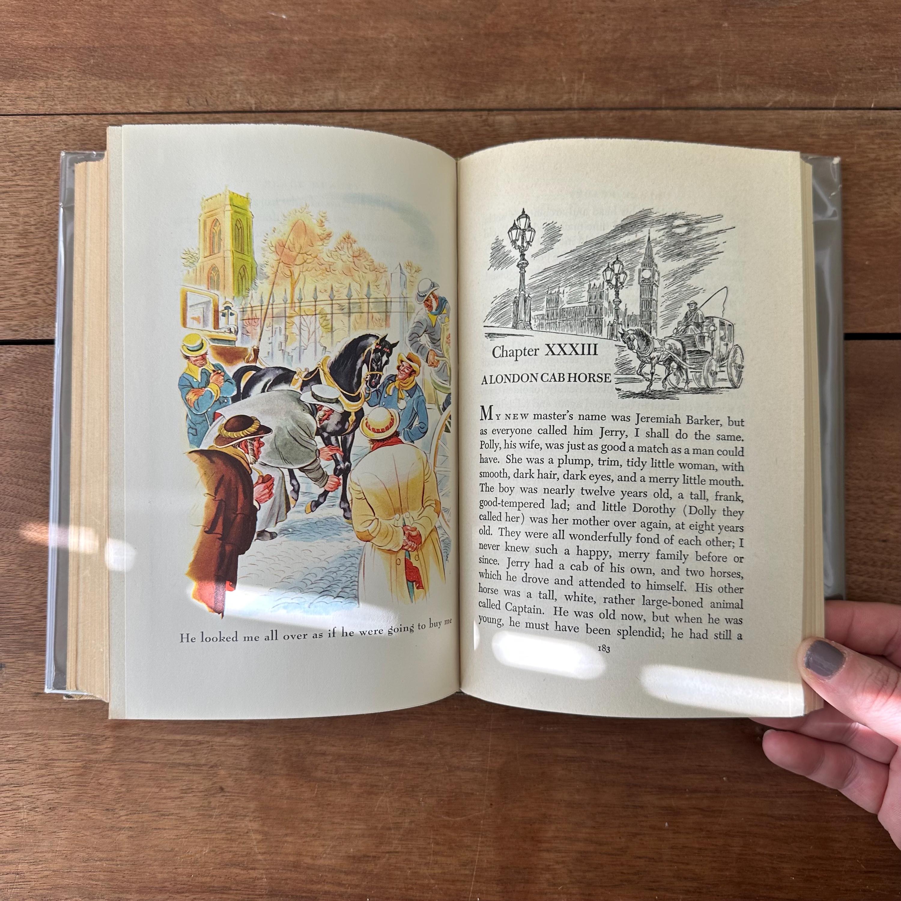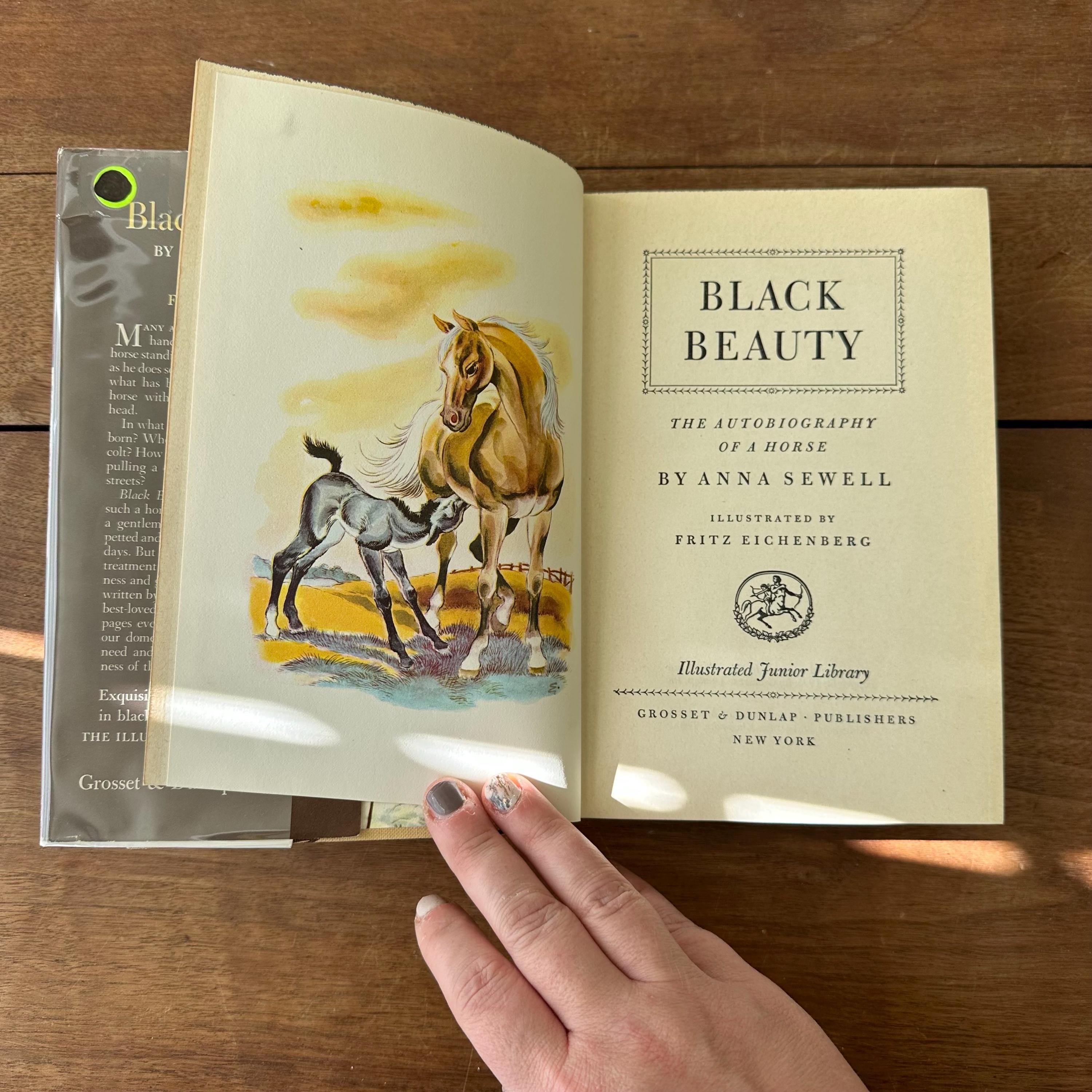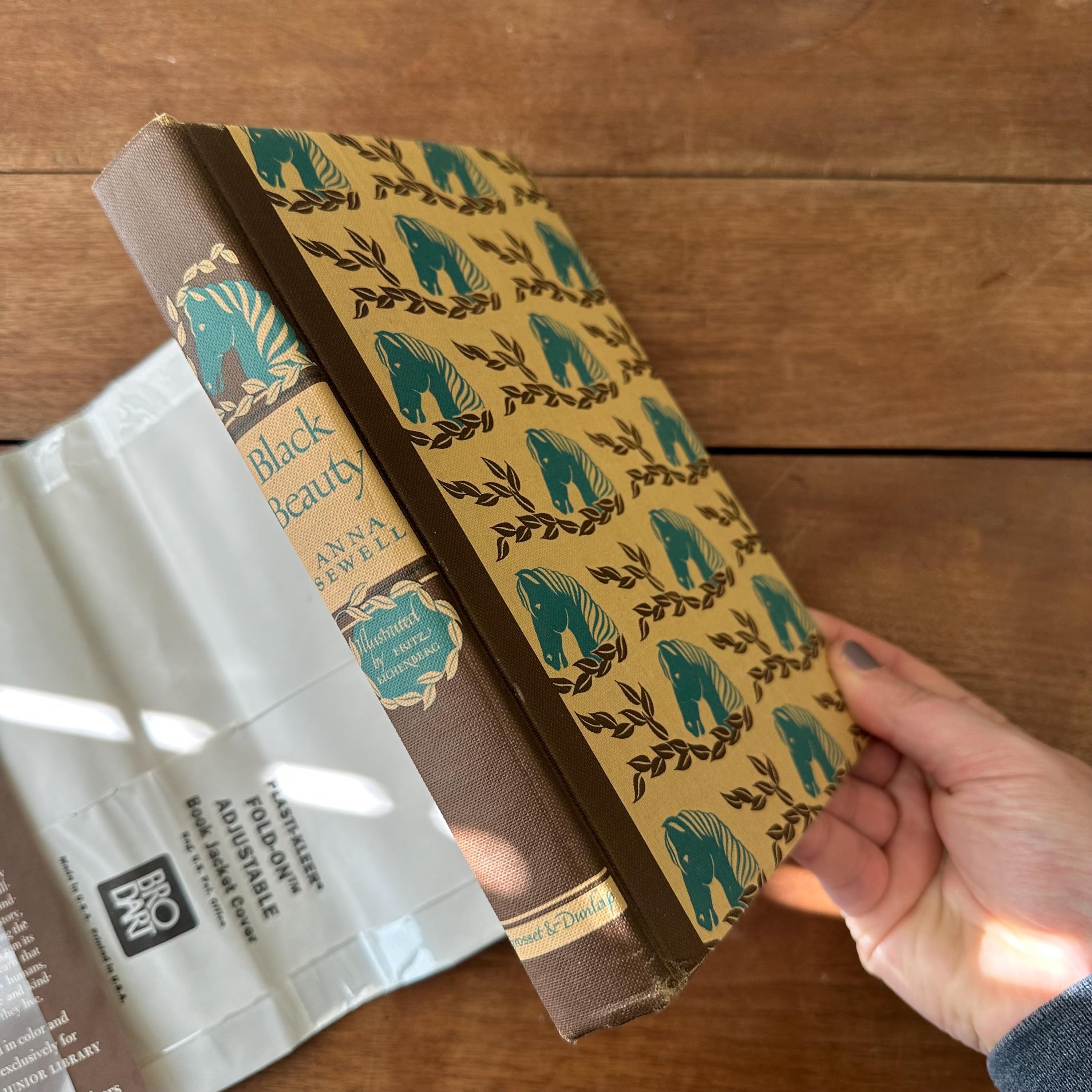 This is the 1945 Illustrated Junior Library edition of Black Beauty by Anna Sewell, published by Grosset & Dunlap. It has its original full color dust jacket featuring an illustrated scene from the book that wraps to the spine. Underneath, the book has light and dark brown covers with a repeating turquoise horse head pattern. The end pages inside the inside front and back covers are also illustrated in color. The book is illustrated with black and white illustrations as well as full color illustration plates by Fritz Eichenberg. There are 288 pages.